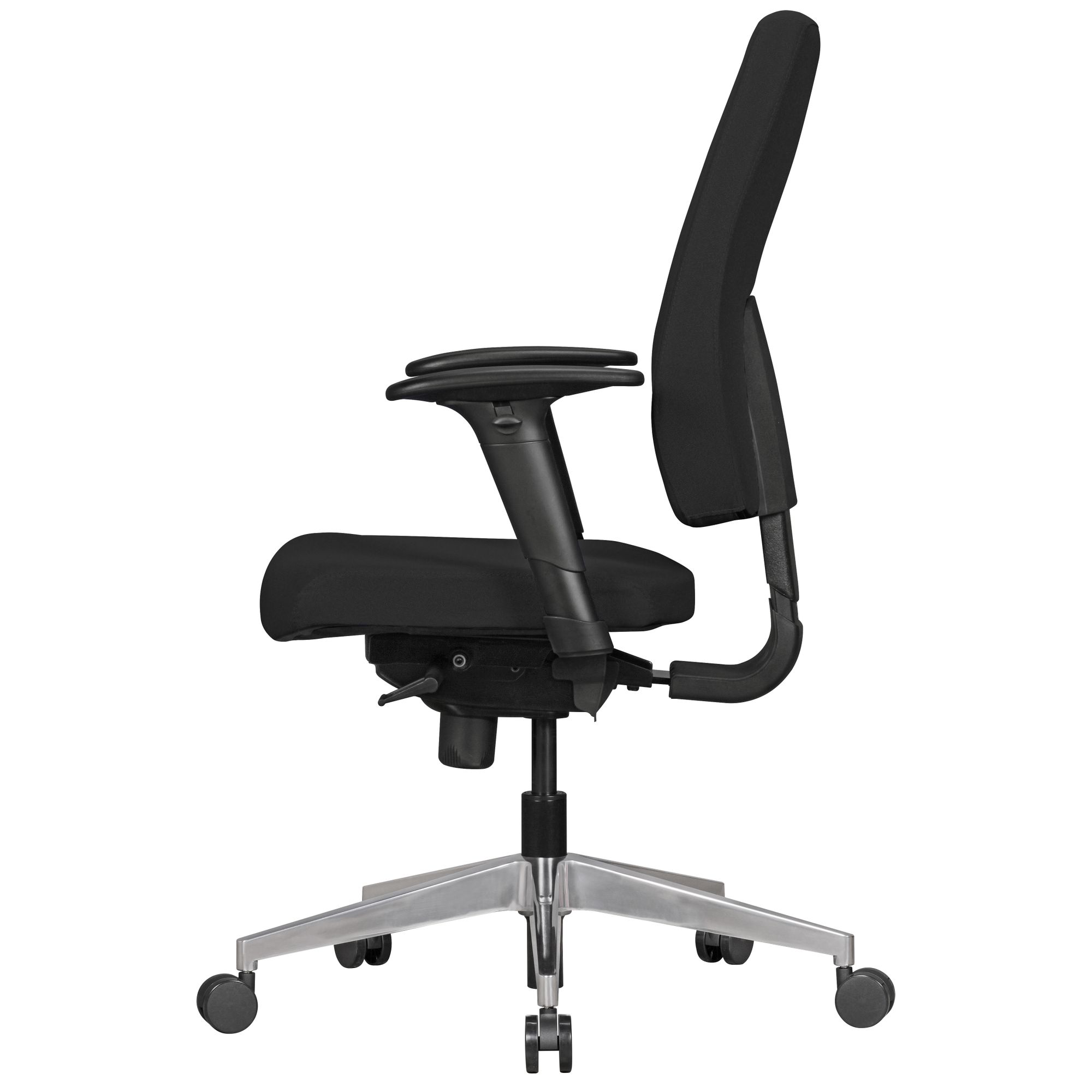 La chaise de bureau DARIUS offre un confort optimal grâce à sa forme ergonomique et son rembourrage en mousse PU haute densité (65 kg/m³). Son tissu noir est durable, résistant à l'abrasion (100 000 cycles) et adapté à un usage intensif jusqu'à 8 heures par jour. Le robuste piètement en aluminium argenté garantit une excellente stabilité avec un diamètre de 70 cm.