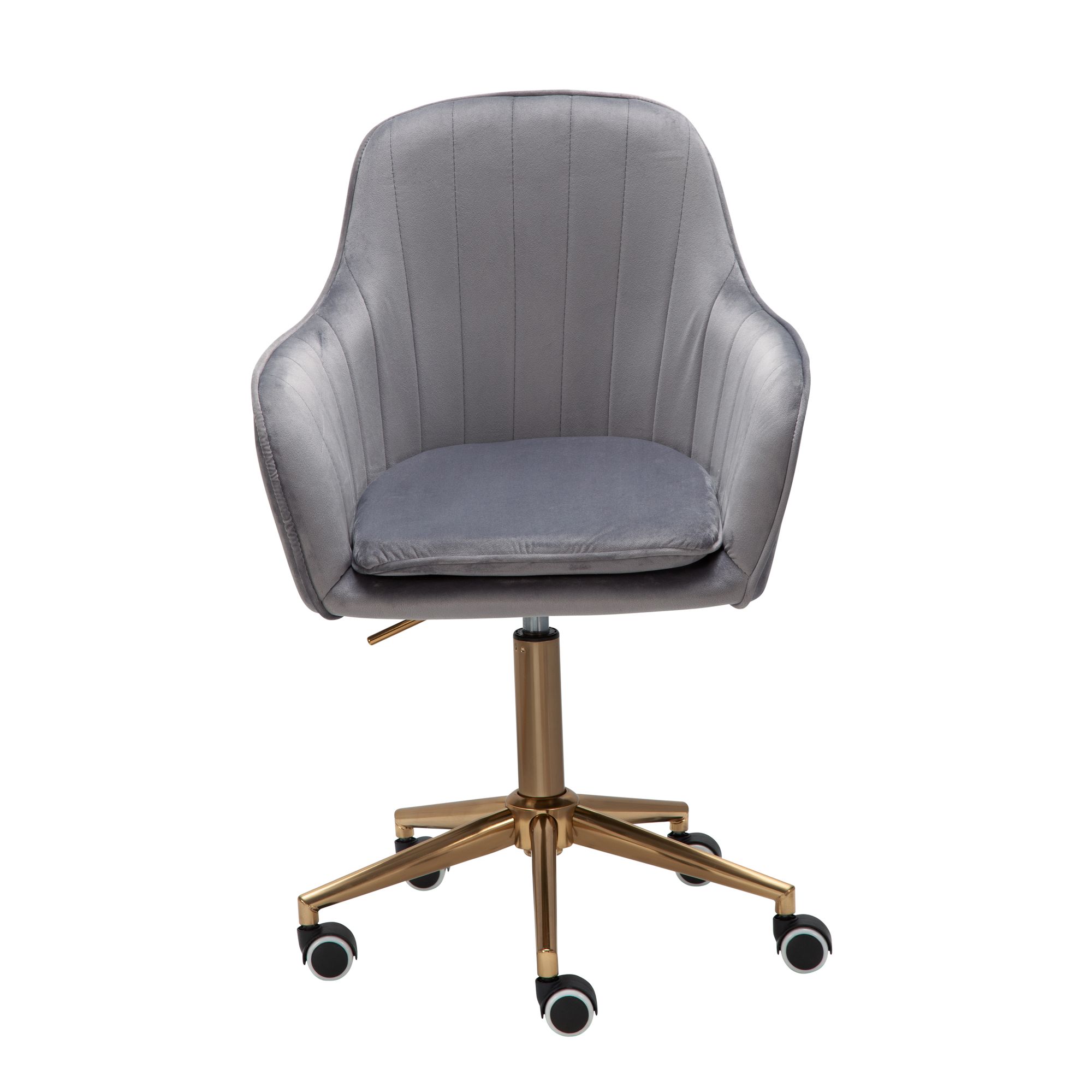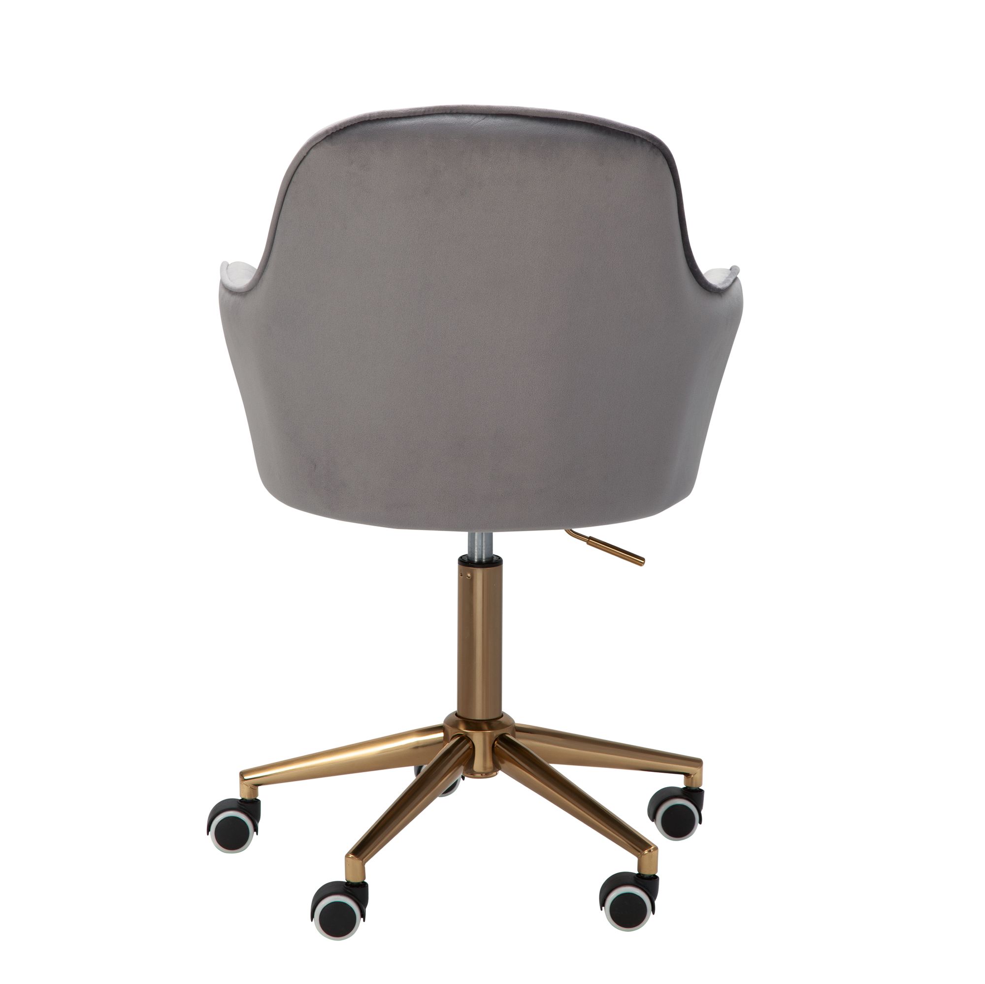 Découvrez cette chaise de bureau moderne en velours gris, alliant confort et design élégant. Sa coque agréablement moulée offre un confort d'assise optimal, tandis que le piètement métallique doré ajoute une touche sophistiquée. Idéale pour les petits espaces de travail, cette chaise dispose d'un réglage en hauteur (43-63 cm) et supporte jusqu'à 120 kg.