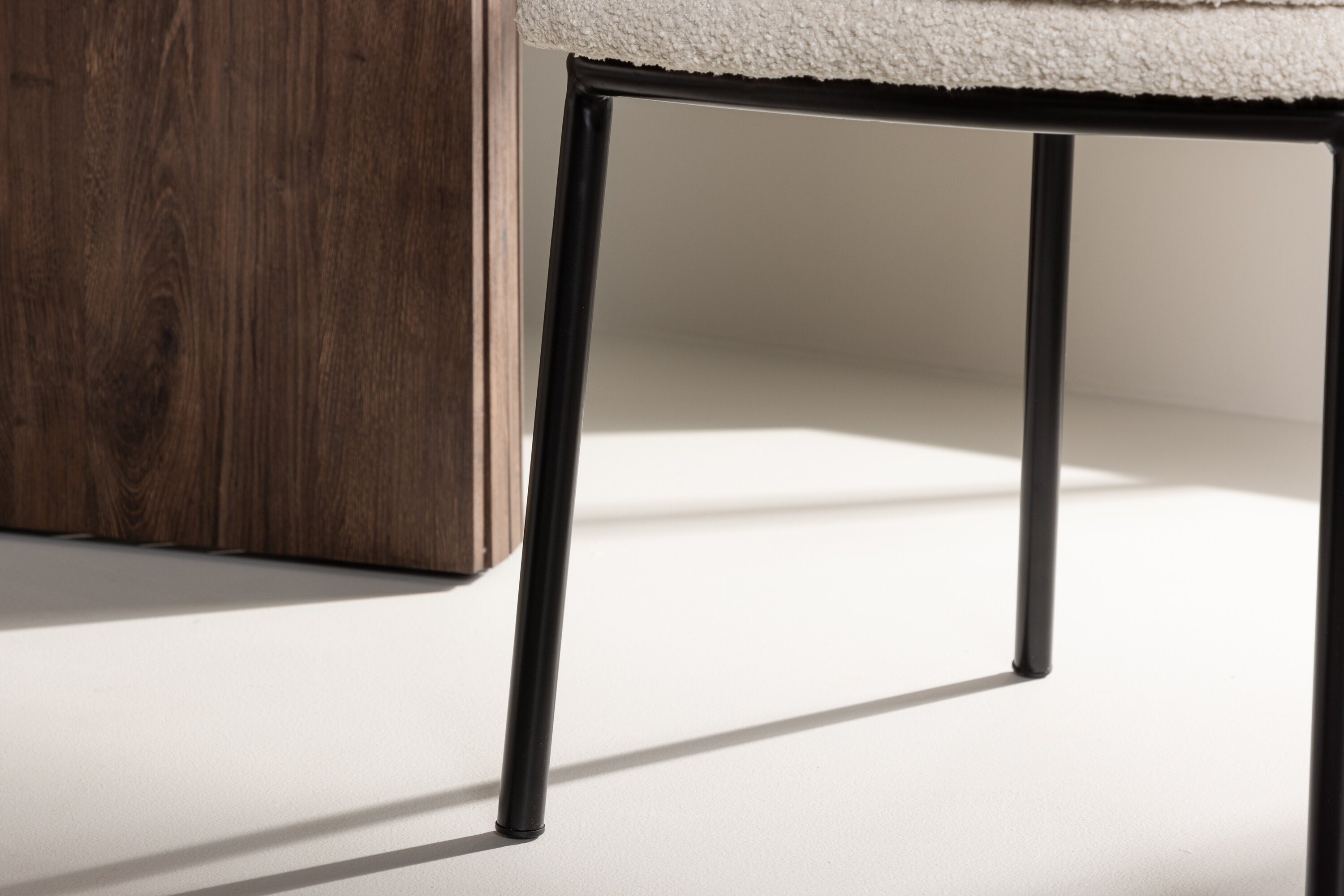 Le siège en bouclé doux et texturé procure une sensation chaleureuse et invitante, tandis que les pieds en acier noir ajoutent une touche contemporaine à la chaise. Agnes crée une atmosphère harmonieuse et offre un impact visuel impressionnant dans votre salle à manger ou votre cuisine.
