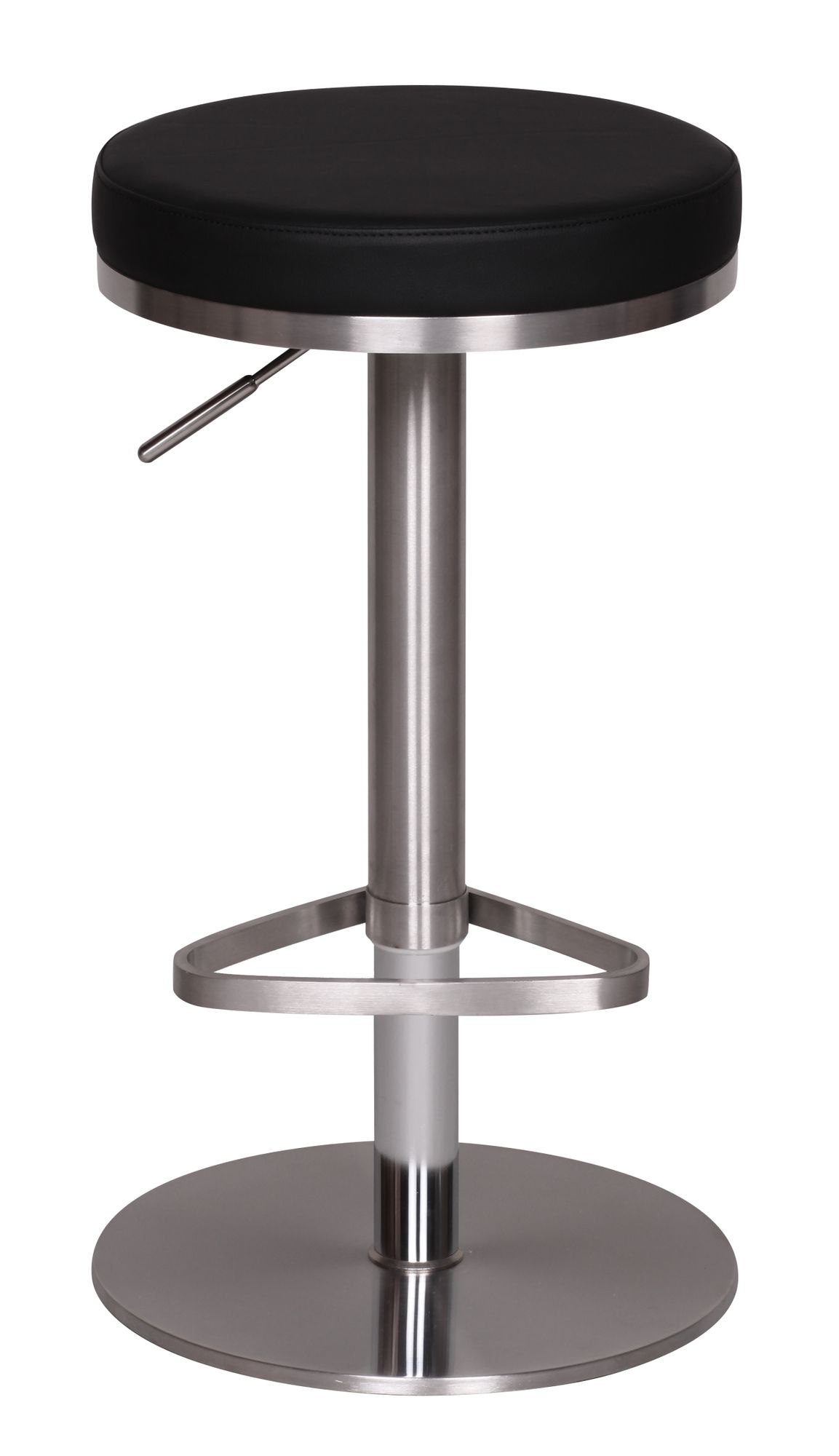 Ce tabouret de bar moderne noir est doté d’une hauteur d’assise réglable de 57 à 82 cm pour un confort personnalisé. La surface d’assise ronde et épaisse est habillée de cuir synthétique noir et encadrée par un anneau en acier inoxydable chromé.