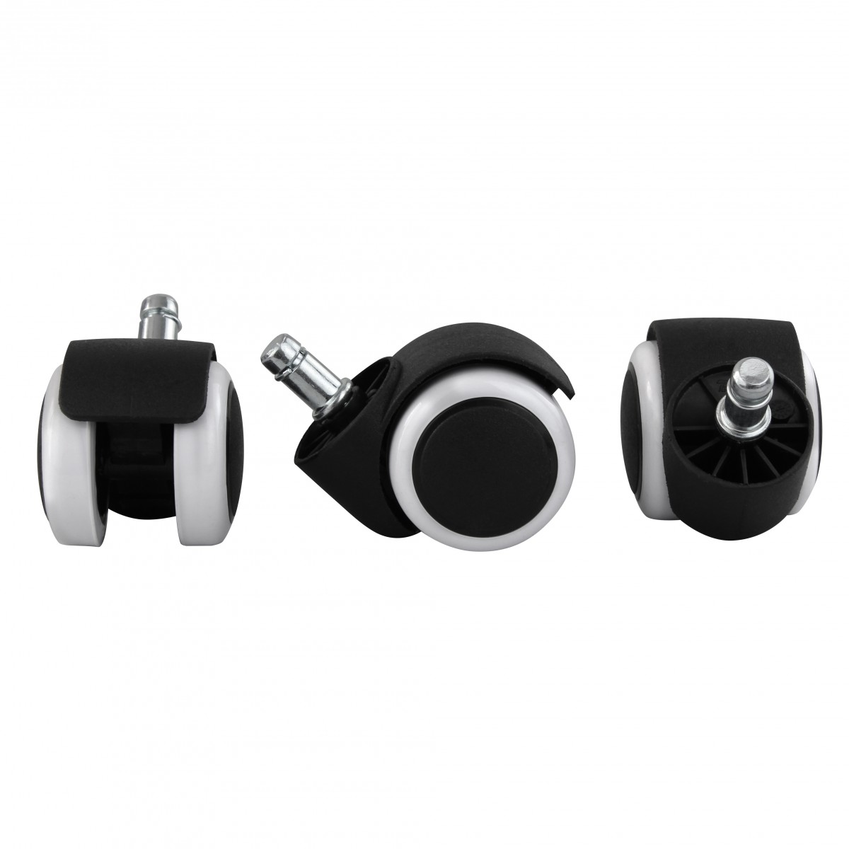 Ce set de 5 roulettes freinées pour sols durs, en polyuréthane noir et blanc, est conçu pour fauteuils de bureau avec axe de 11 mm. Les roues de 50 mm de diamètre offrent un roulement silencieux, avec freinage en fonction de la charge selon la norme DIN EN 12529:1998.