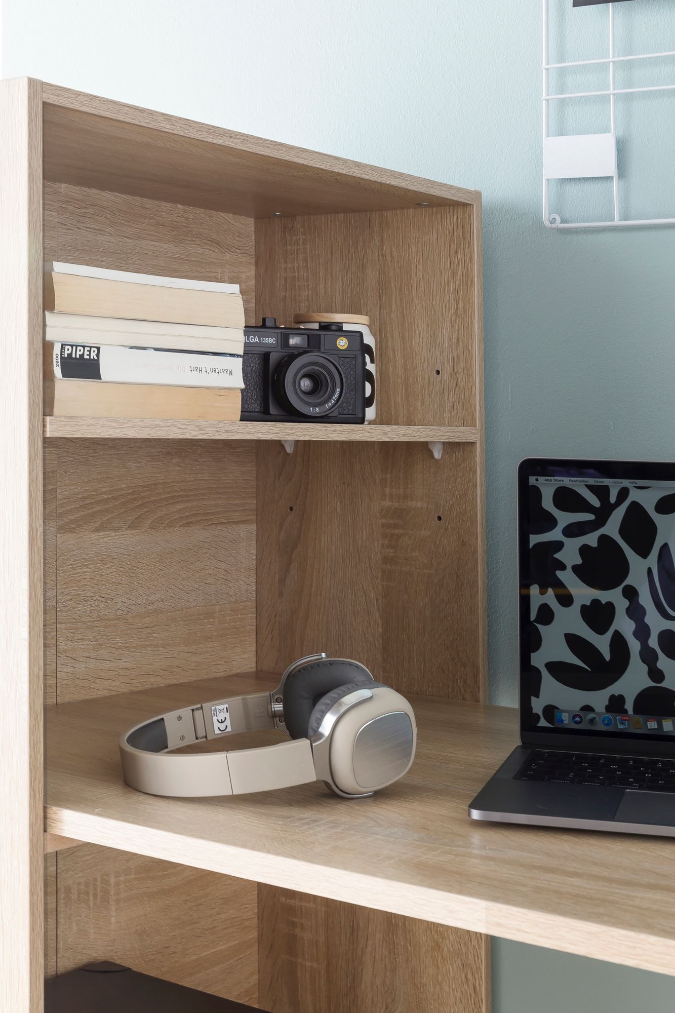 Ce bureau contemporain en panneaux de particules finition Sonoma offre une allure chaleureuse tout en conservant un design fonctionnel avec étagères intégrées pour un rangement efficace.