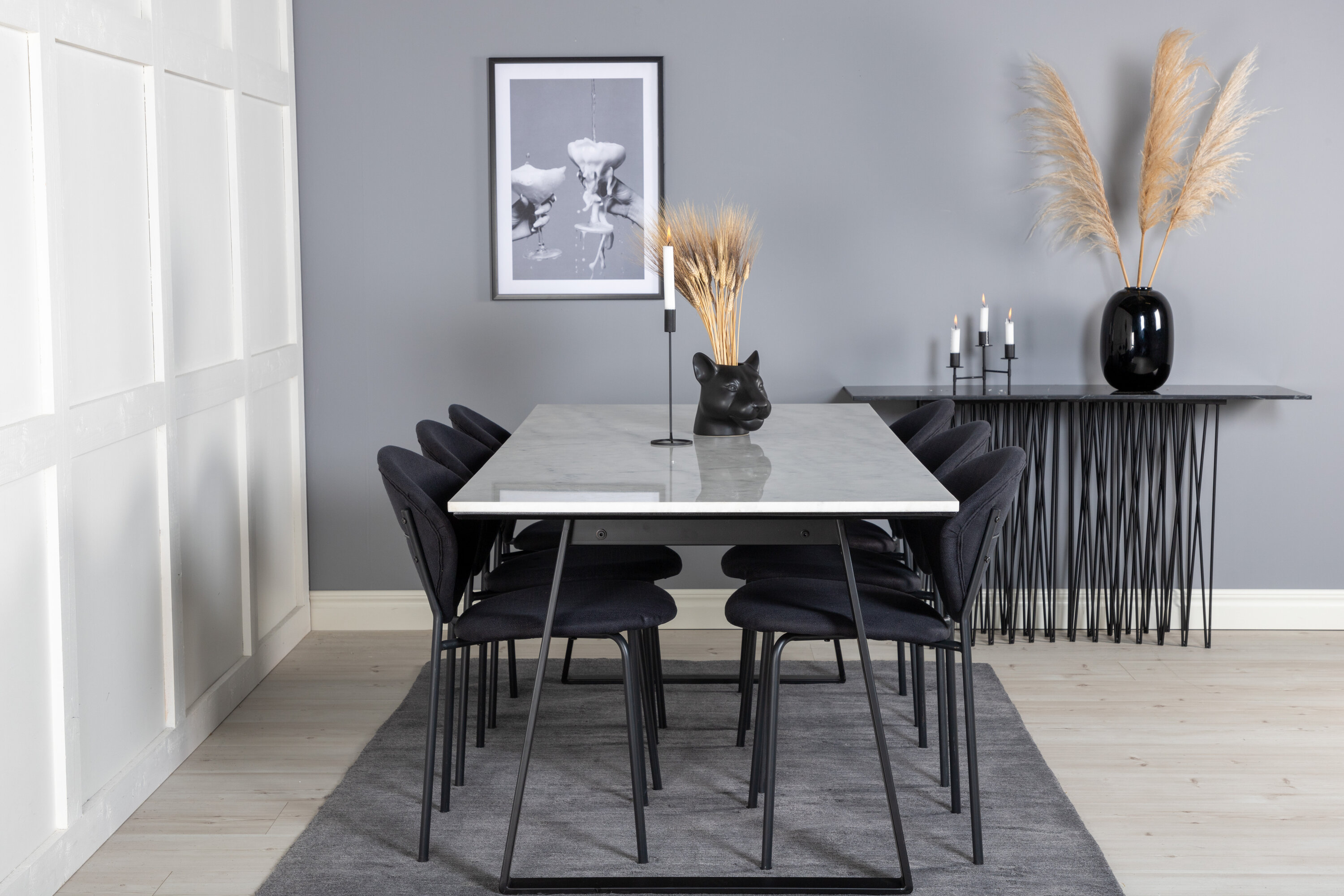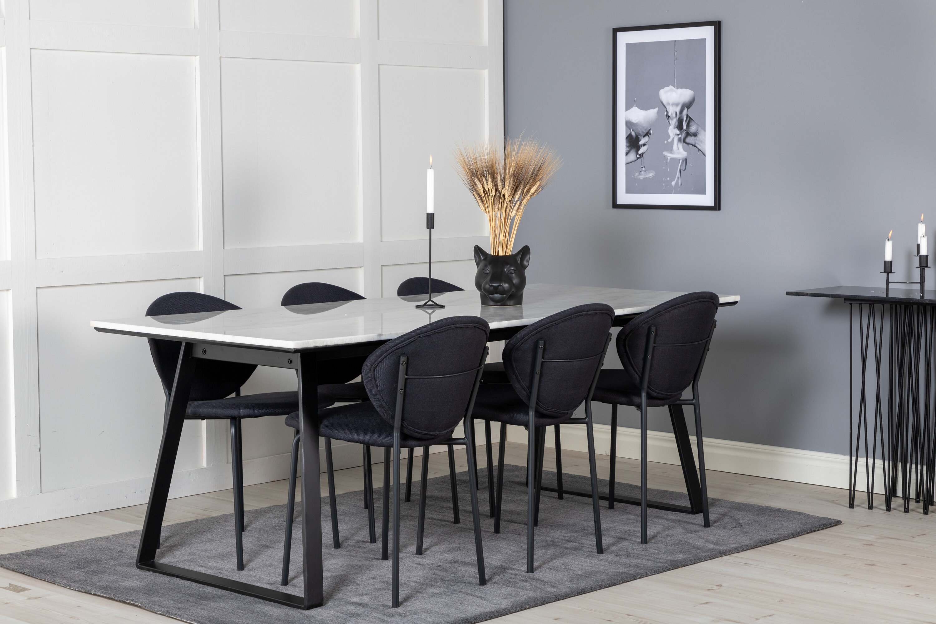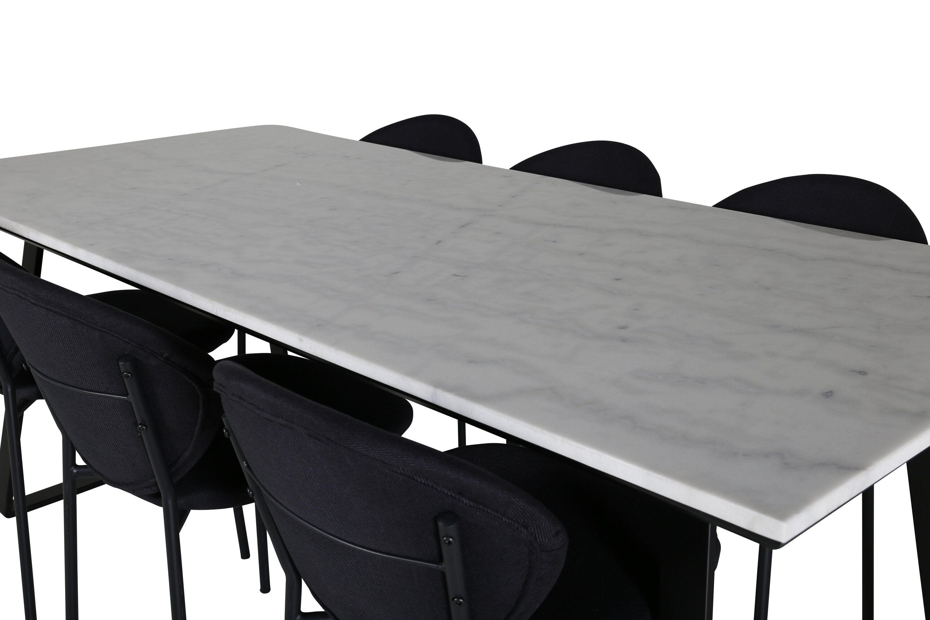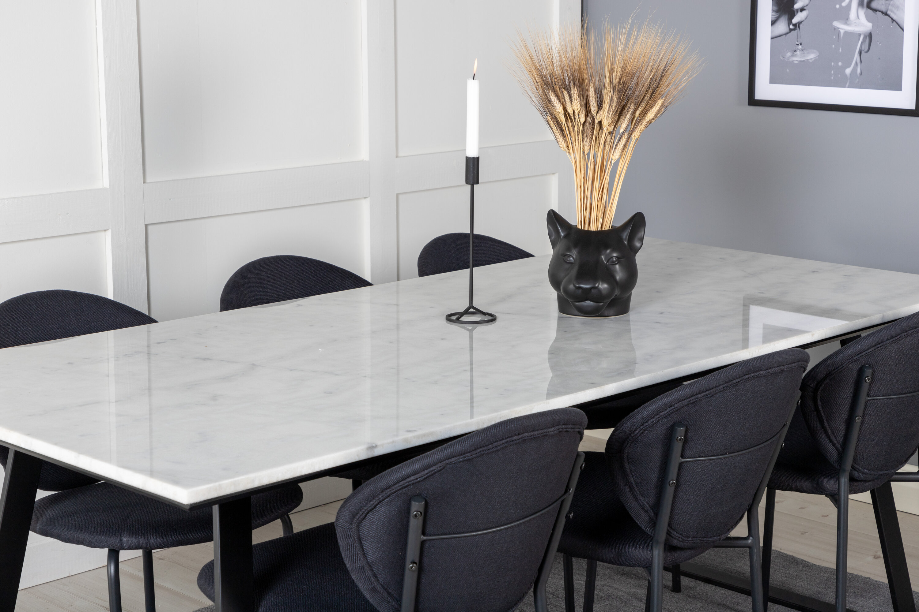 Estelle, table à manger moderne et élégante en marbre magnifique - ici avec les chaises de salle à manger Vault dans un design élégant. Créez quelque chose de soigné et de social avec de la place pour la bonne nourriture et la socialisation !