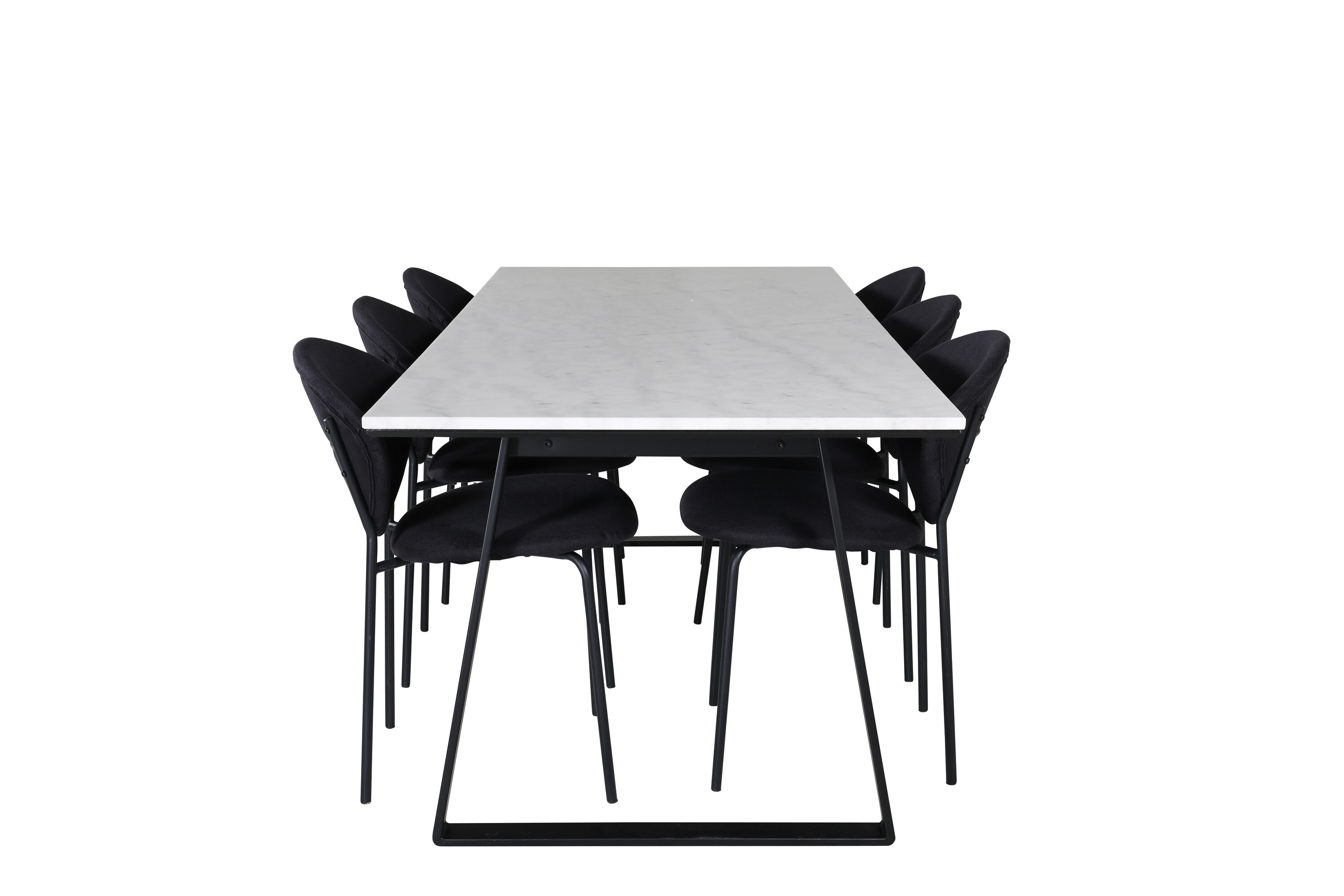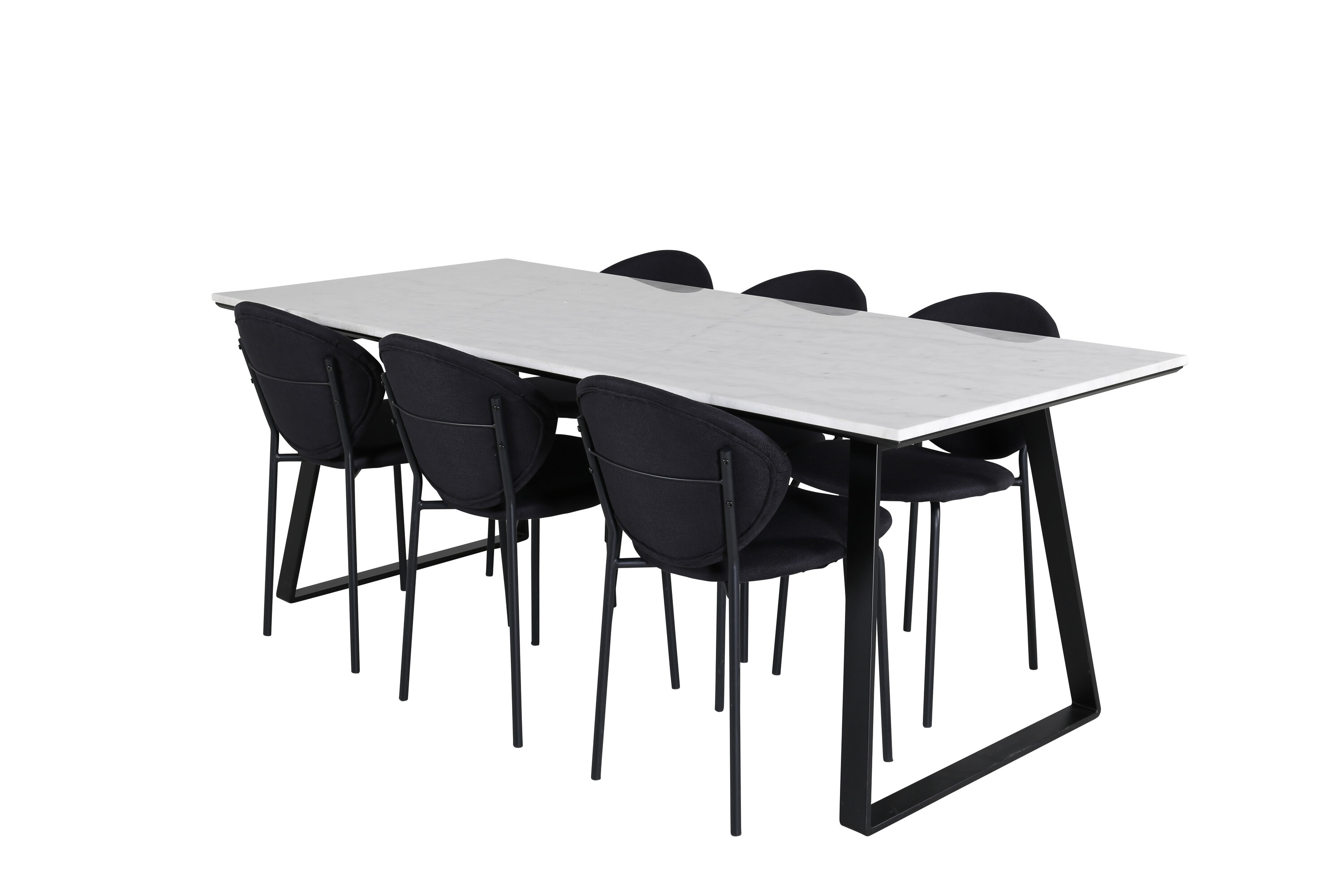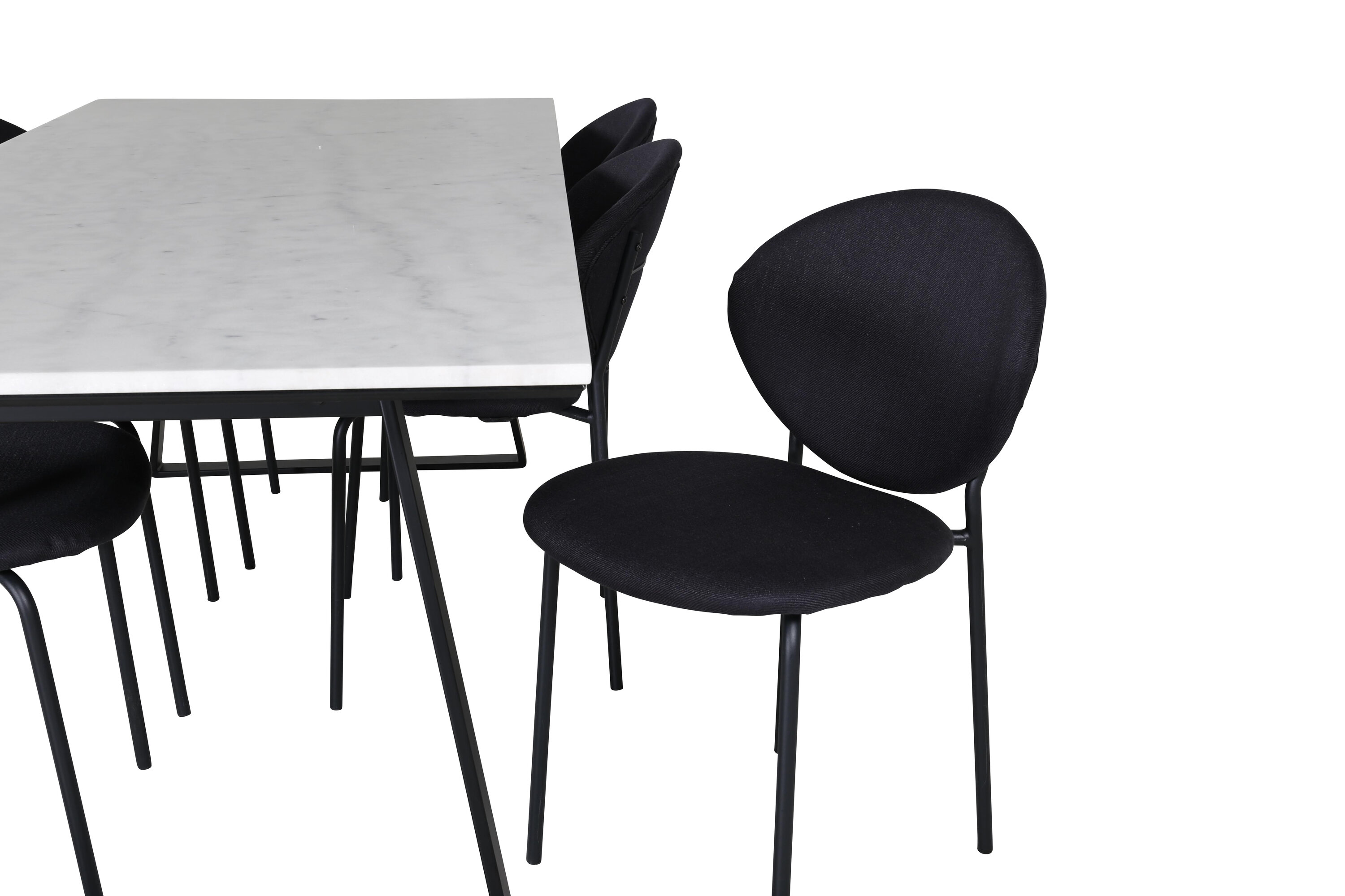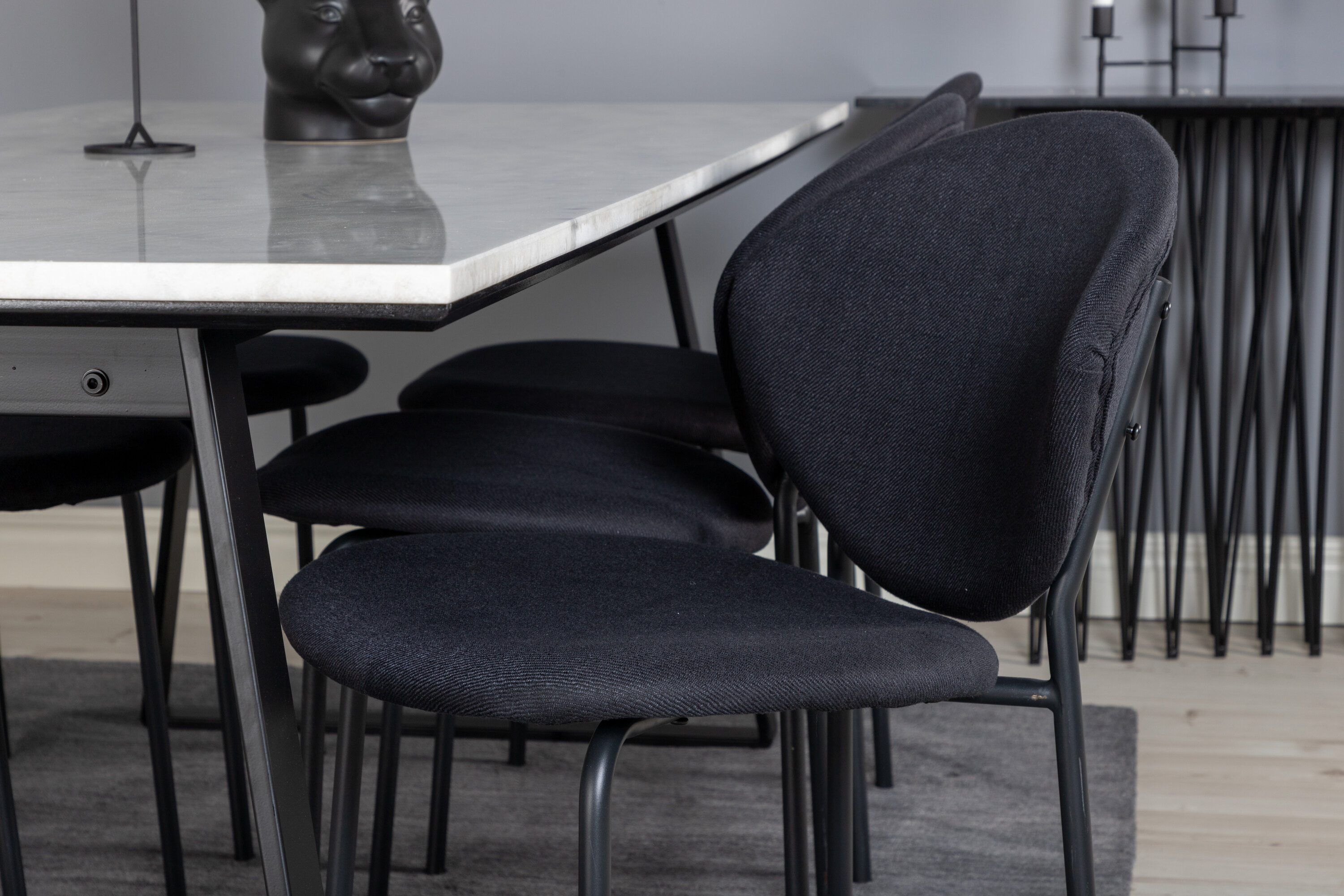 Estelle, table à manger moderne et élégante en marbre magnifique - ici avec les chaises de salle à manger Vault dans un design élégant. Créez quelque chose de soigné et de social avec de la place pour la bonne nourriture et la socialisation !