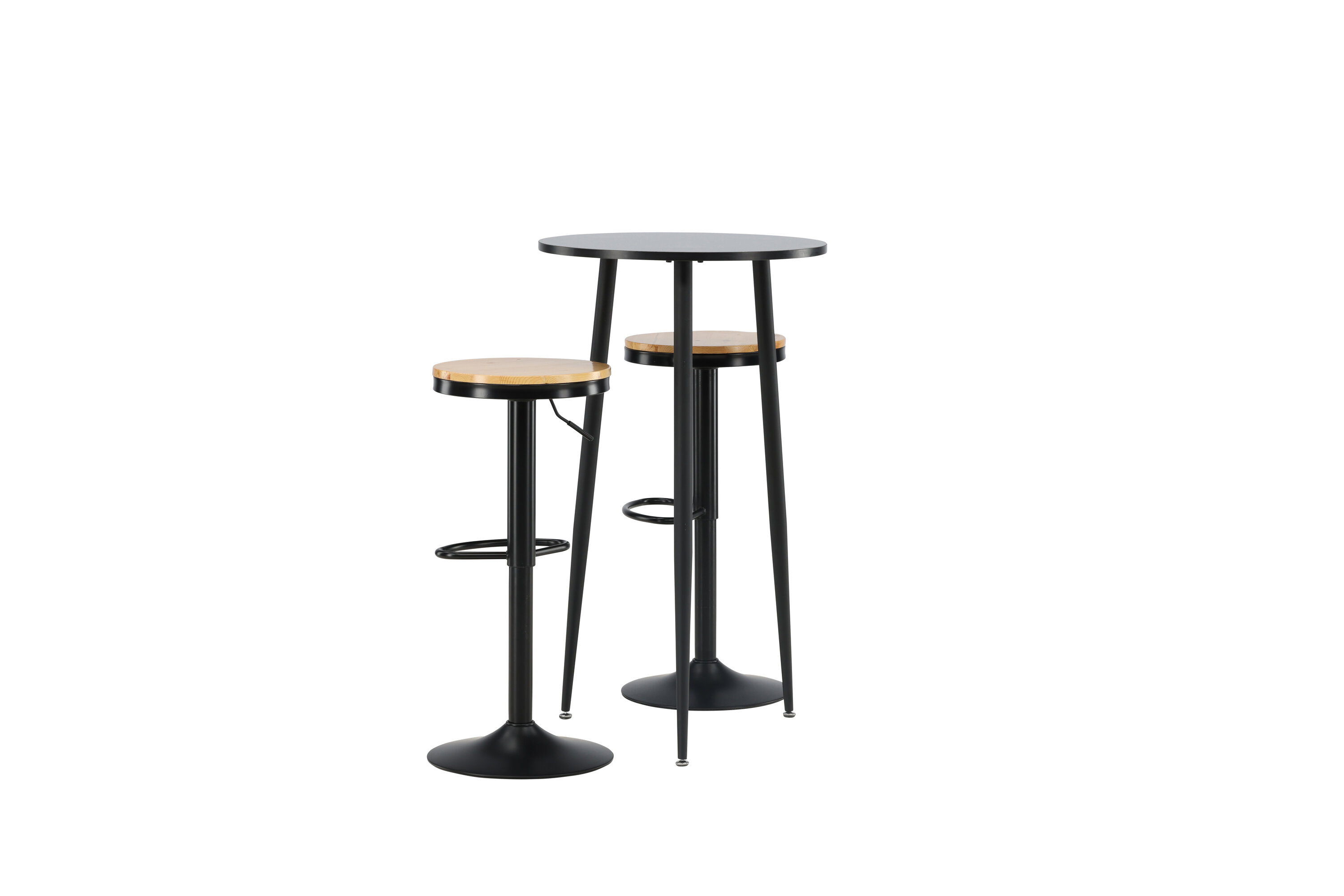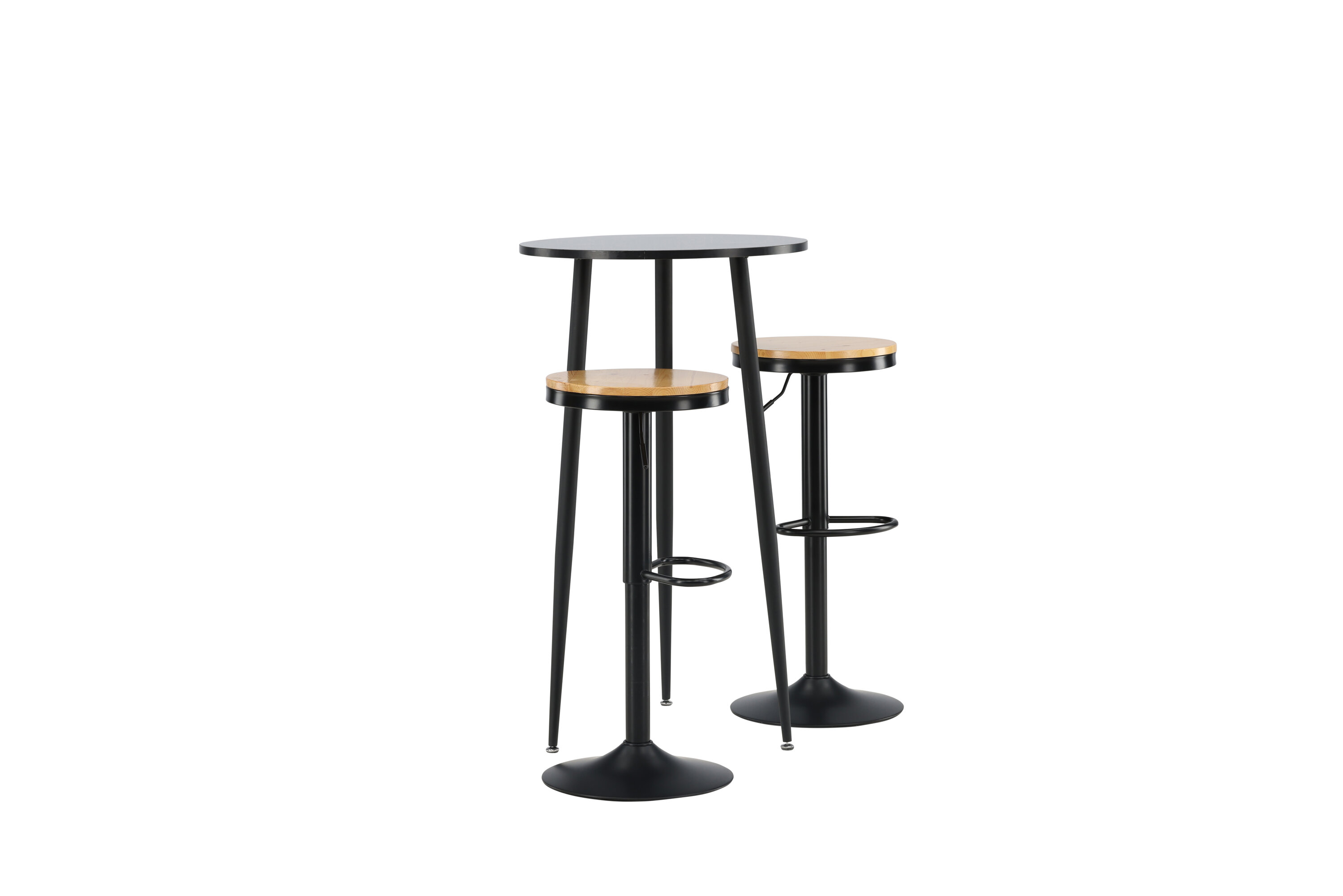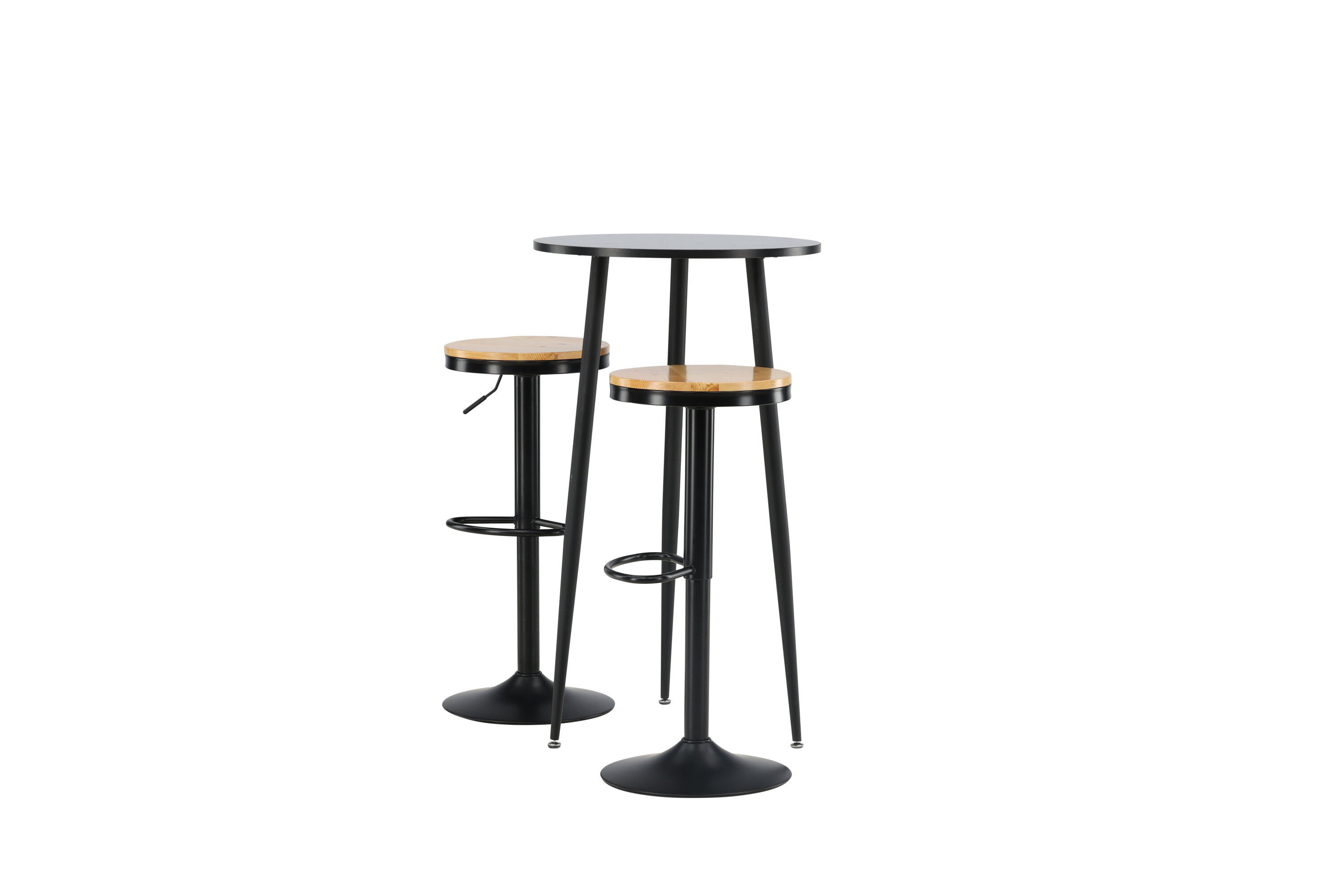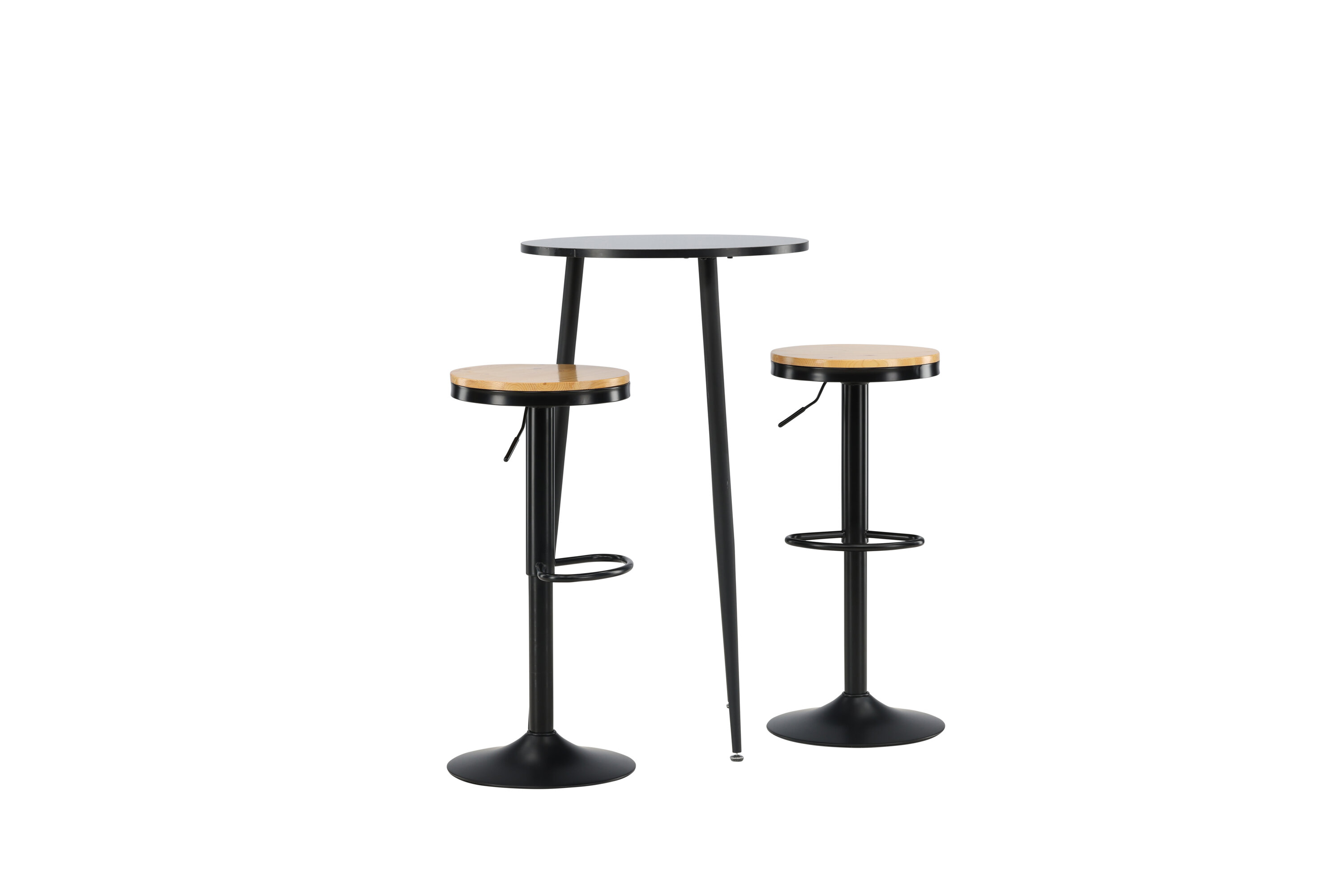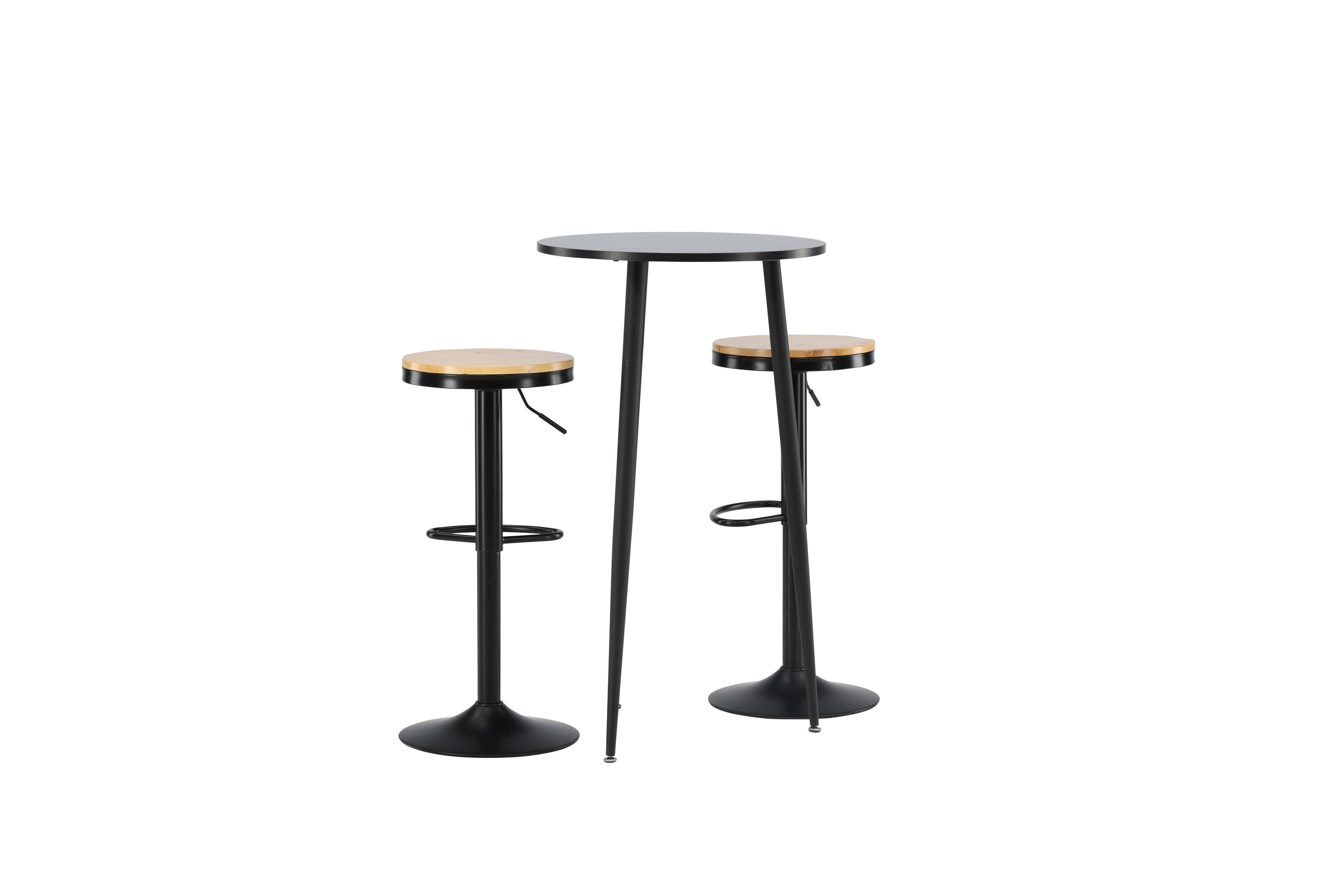 Un groupe de bar parfait pour la petite cuisine ! La magnifique table de bar Plaza a un plateau rond en MDF noir et les pieds de la table sont légèrement évasés en métal noir. Ici avec de simples tabourets de bar de la série Conway. La chaise a un design élégant avec un pied de trompette en acier noir et un siège rond simple en MDF de couleur chêne. Ce tabouret de bar est doté d'un repose-pieds intégré et peut être relevé et abaissé pour plus de confort. Aussi élégant qu'élégant ! Dimensions de la table : 60 cm.
