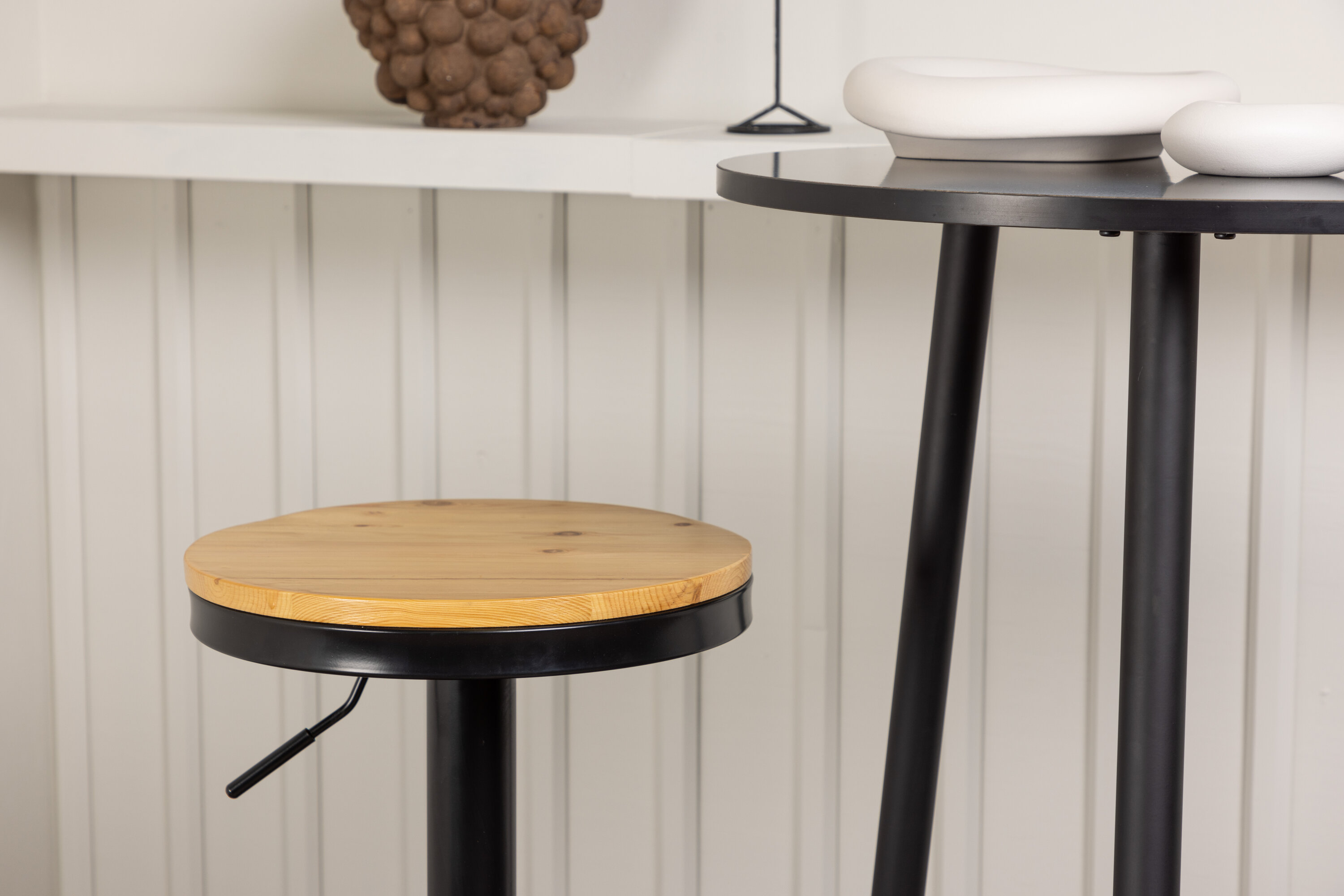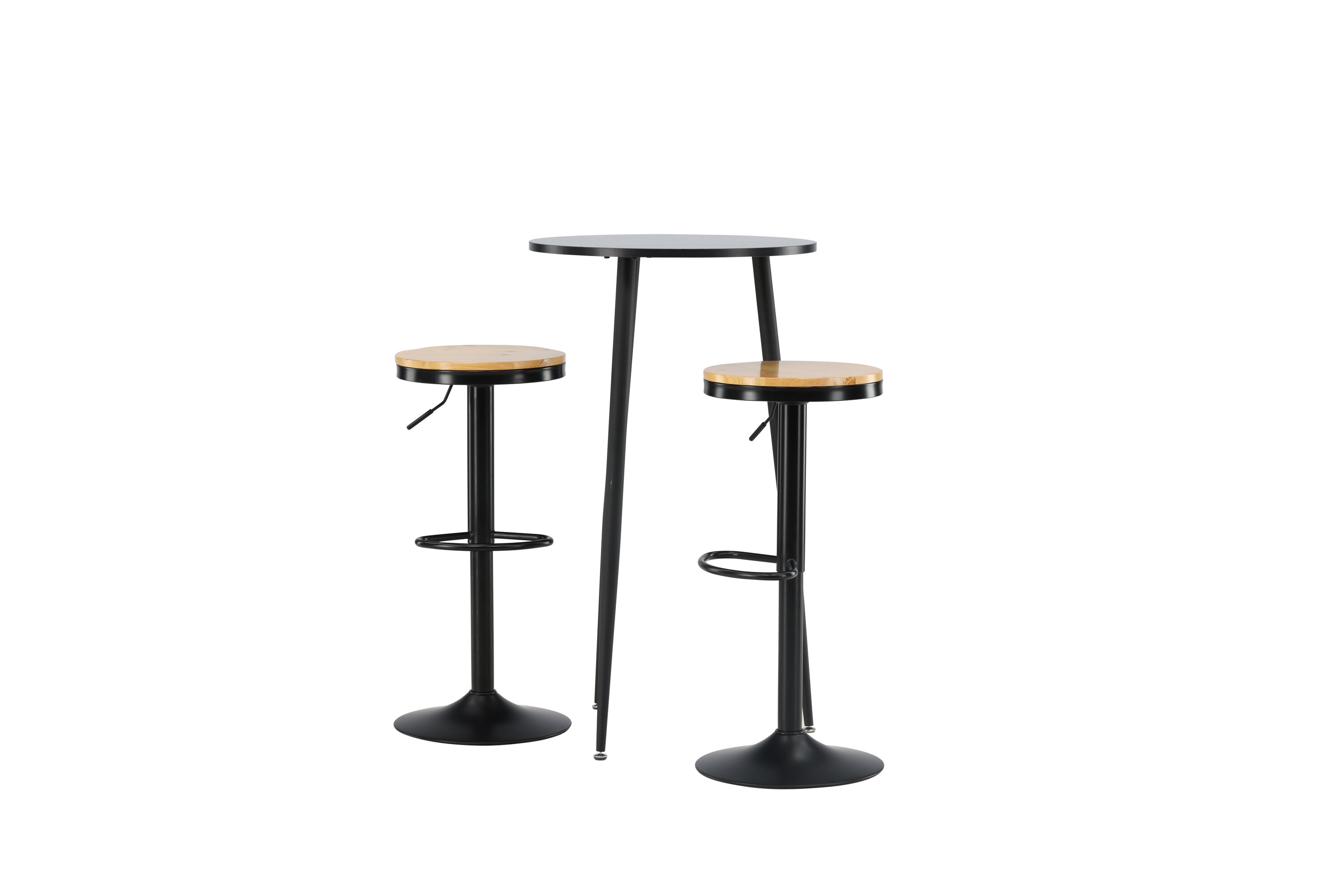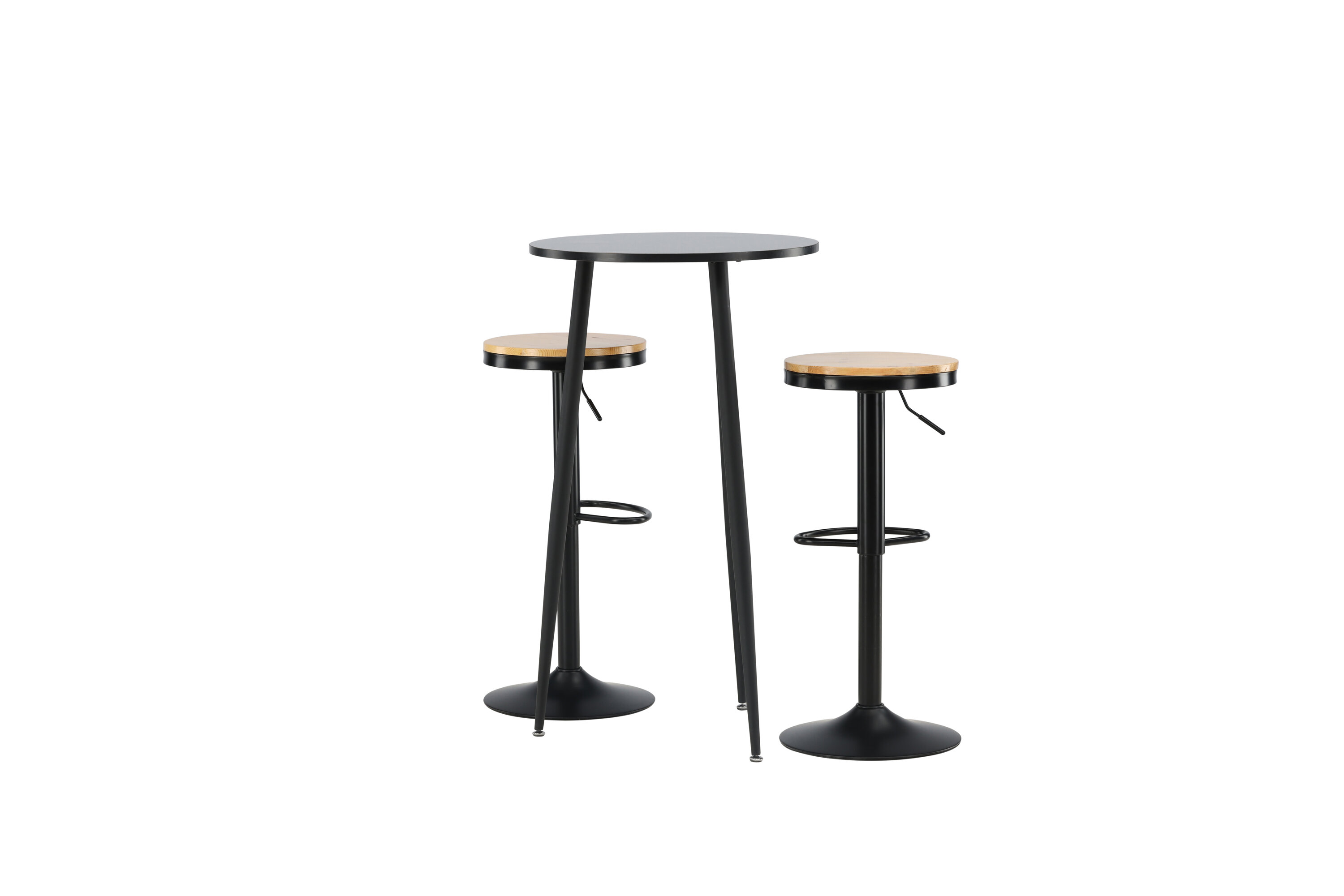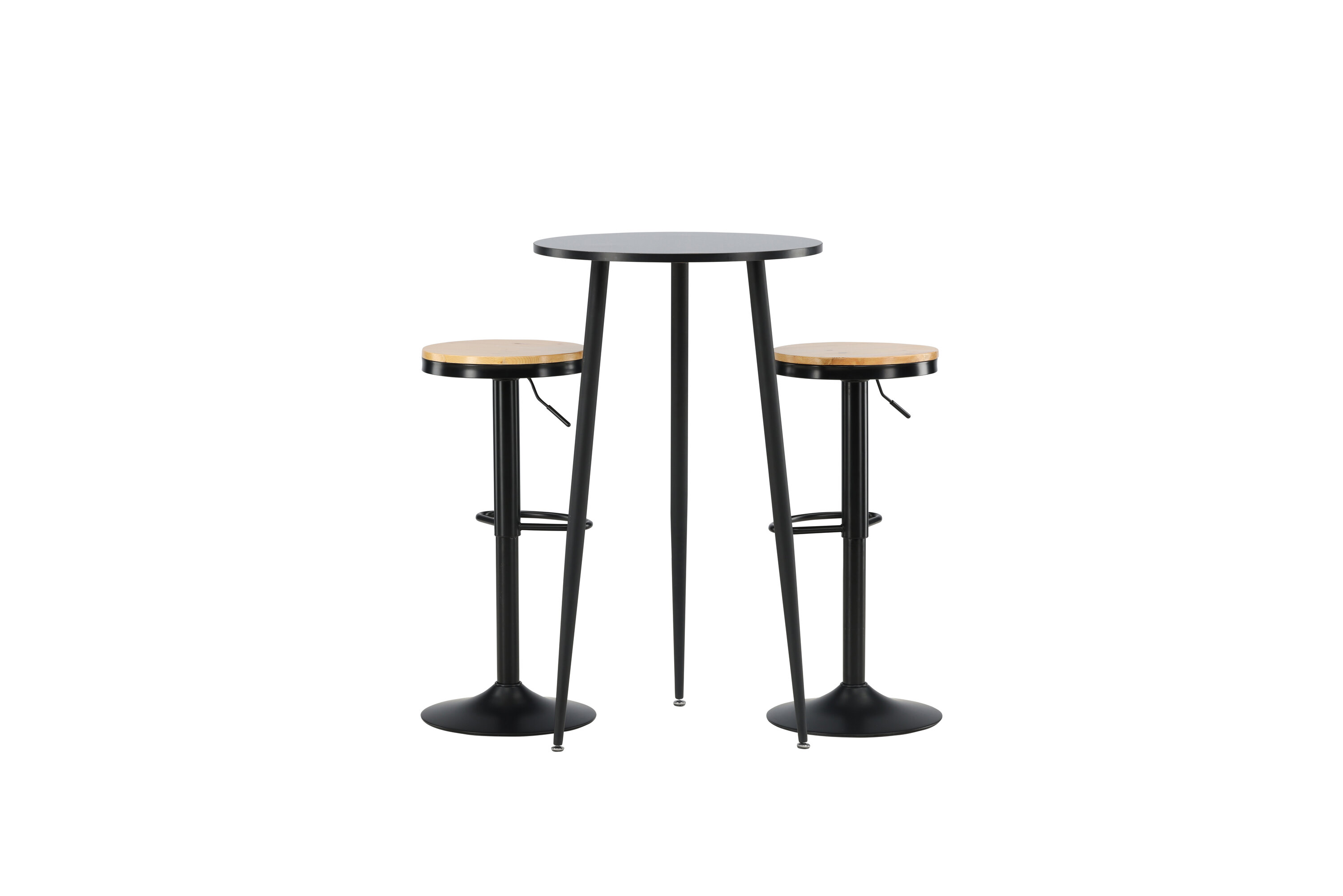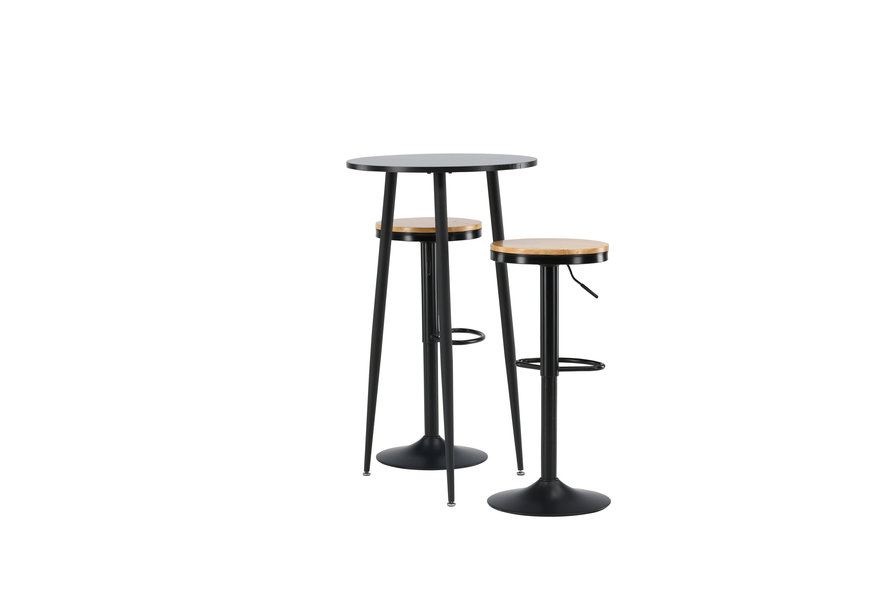 Un groupe de bar parfait pour la petite cuisine ! La magnifique table de bar Plaza a un plateau rond en MDF noir et les pieds de la table sont légèrement évasés en métal noir. Ici avec de simples tabourets de bar de la série Conway. La chaise a un design élégant avec un pied de trompette en acier noir et un siège rond simple en MDF de couleur chêne. Ce tabouret de bar est doté d'un repose-pieds intégré et peut être relevé et abaissé pour plus de confort. Aussi élégant qu'élégant ! Dimensions de la table : 60 cm.