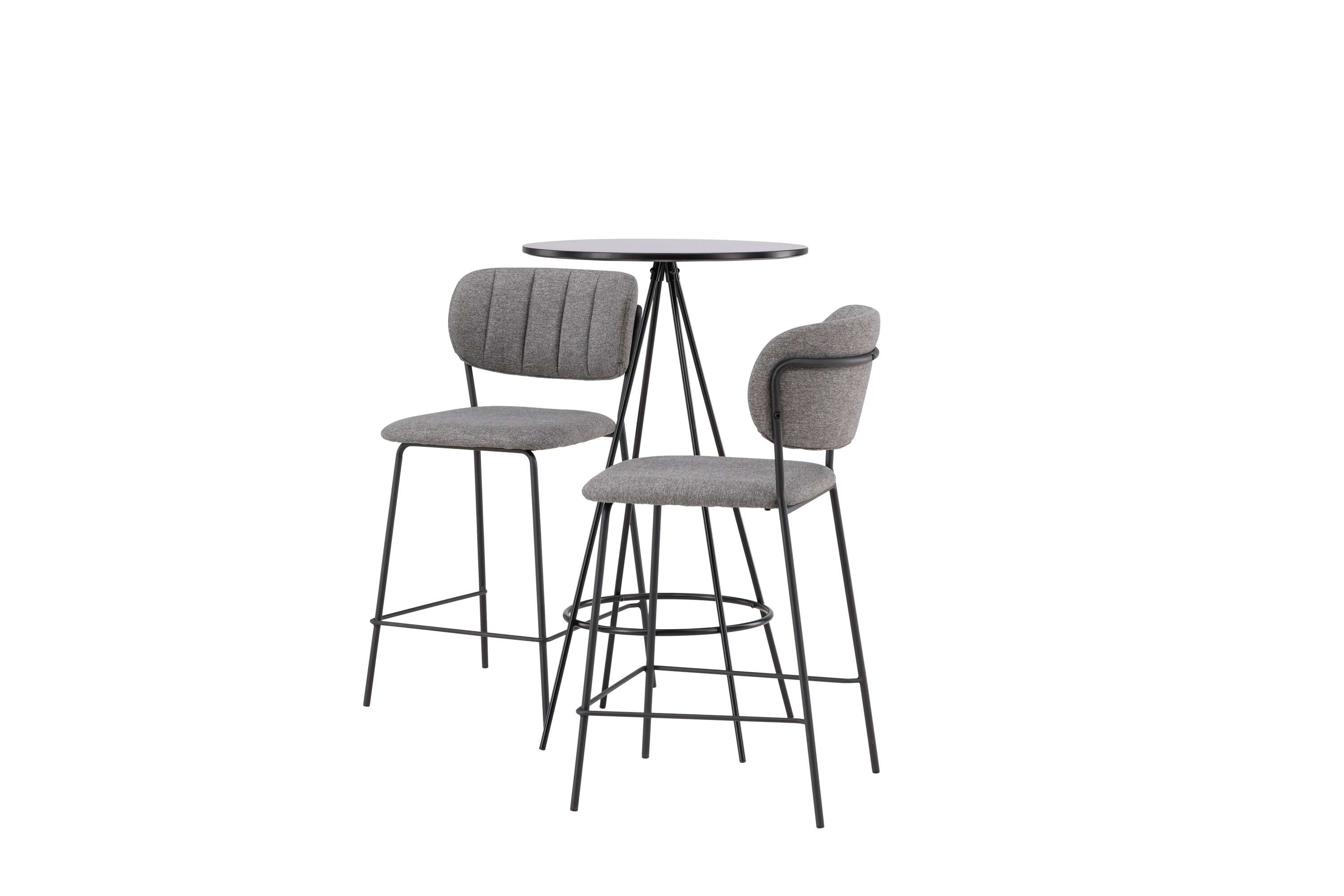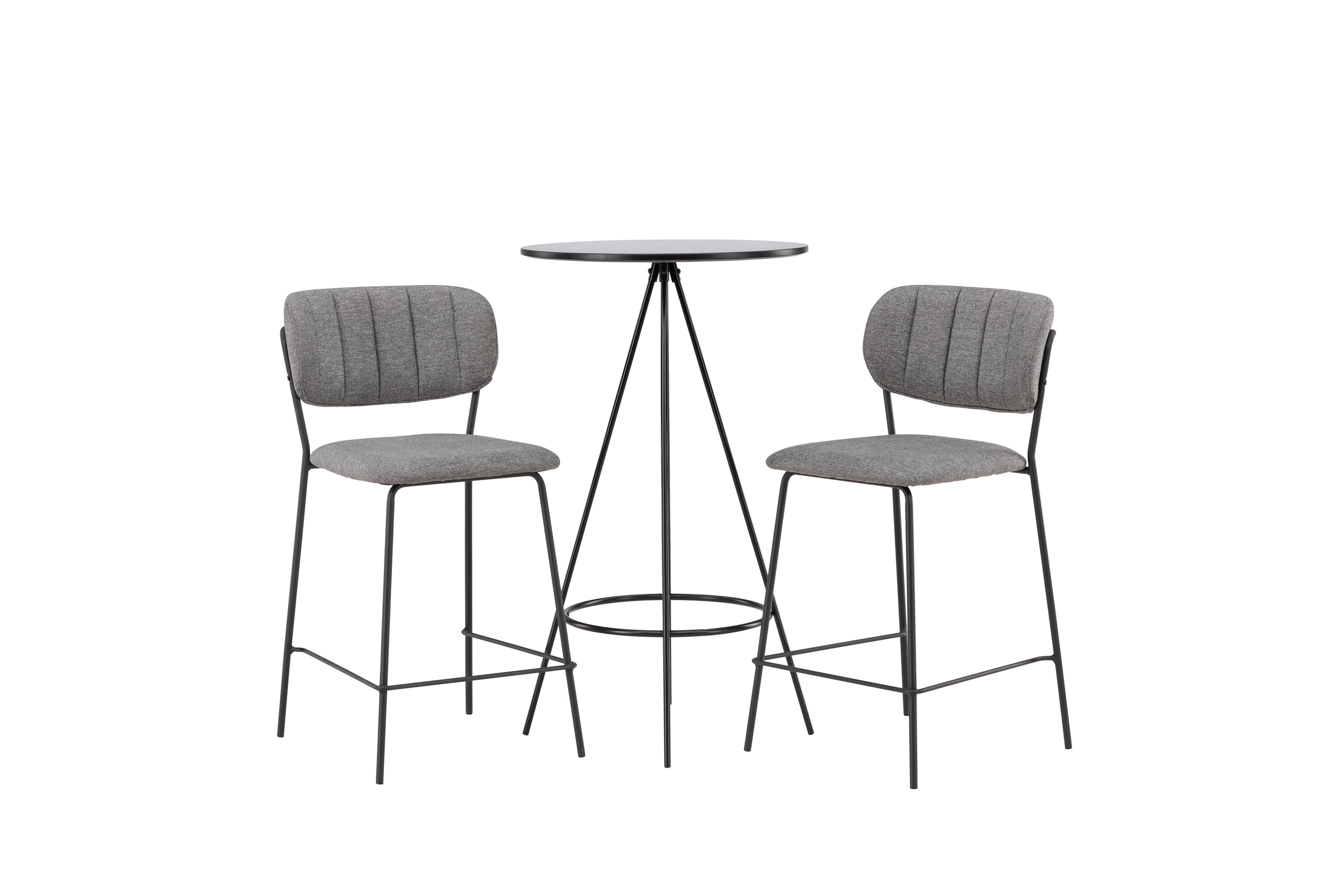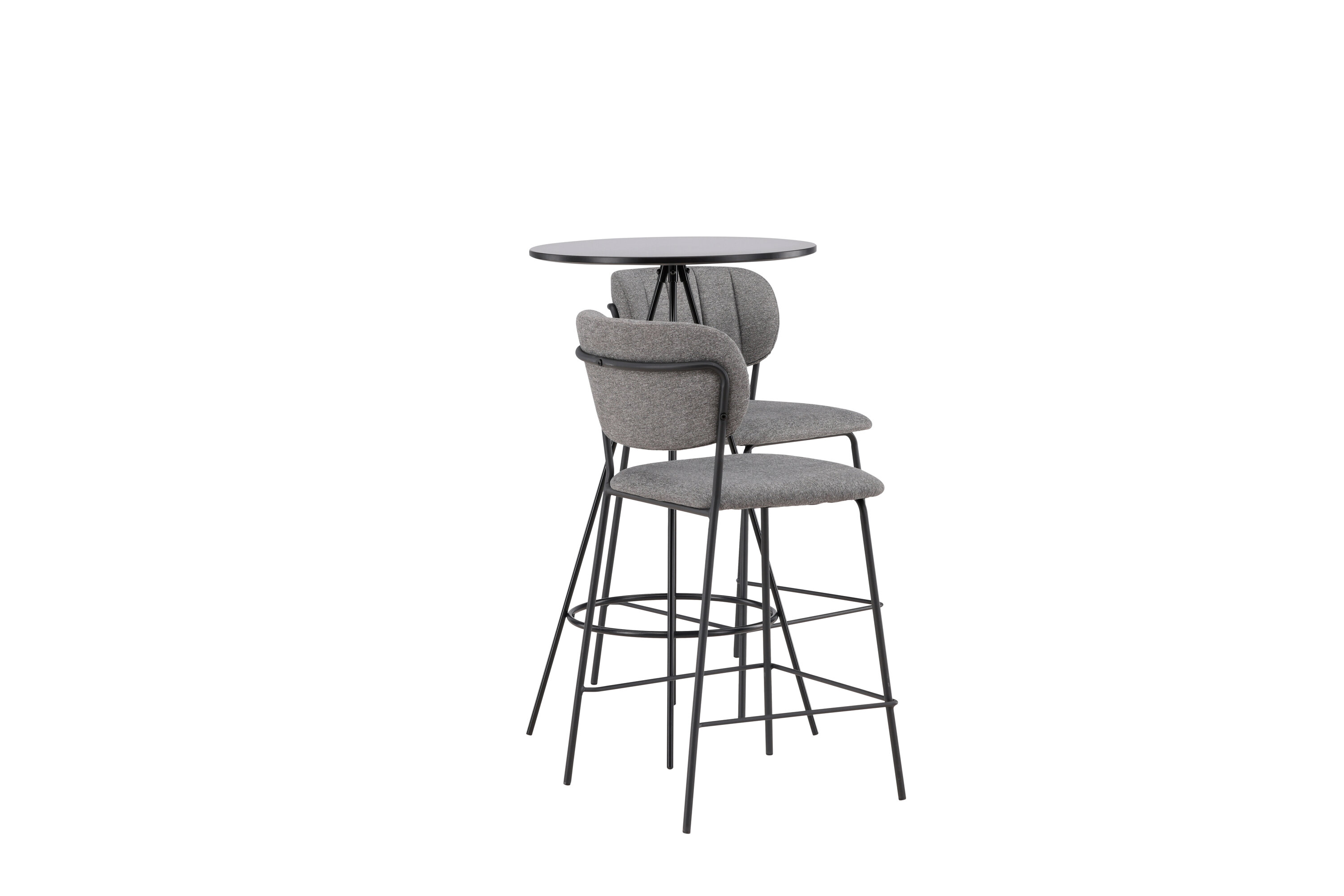 Un charmant groupe de bars aux couleurs agréables ! La table de bar Bistro a un design minimaliste et scandinave avec un plateau de table rond en MDF noir avec placage. Les pieds de table aérés en forme de cône sont légèrement évasés en métal noir et ont un cadre intégré pour le repose-pieds. Ici avec des tabourets de bar gris de la série Bell. La chaise a un design entièrement rembourré avec un dossier et un siège légèrement arrondis en tissu polyester gris avec des coutures décoratives élégantes et les pieds de la chaise sont étroits en acier noir avec repose-pieds intégré. Le design mince donne une impression aérée ! Dimensions de la table : 60 cm.