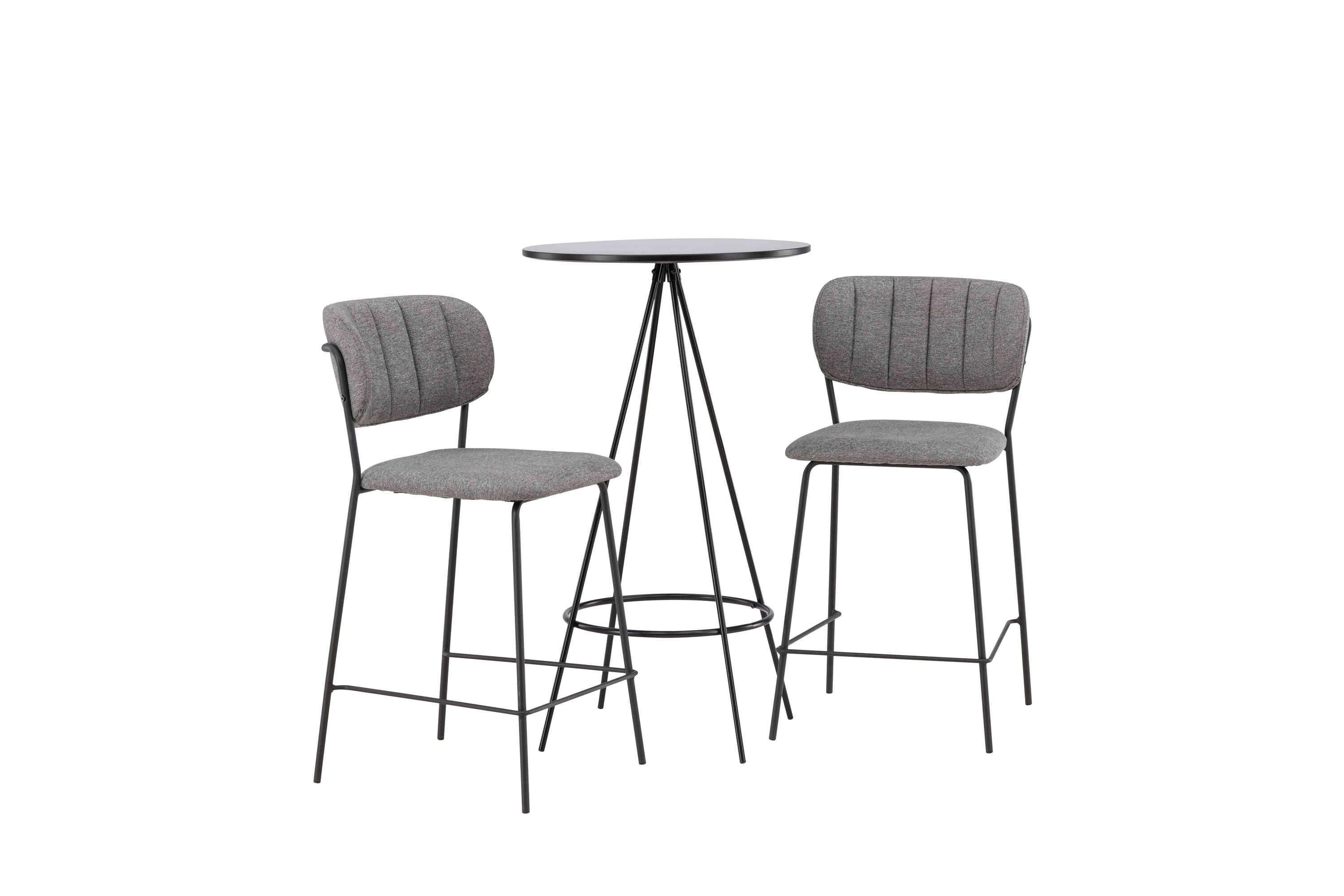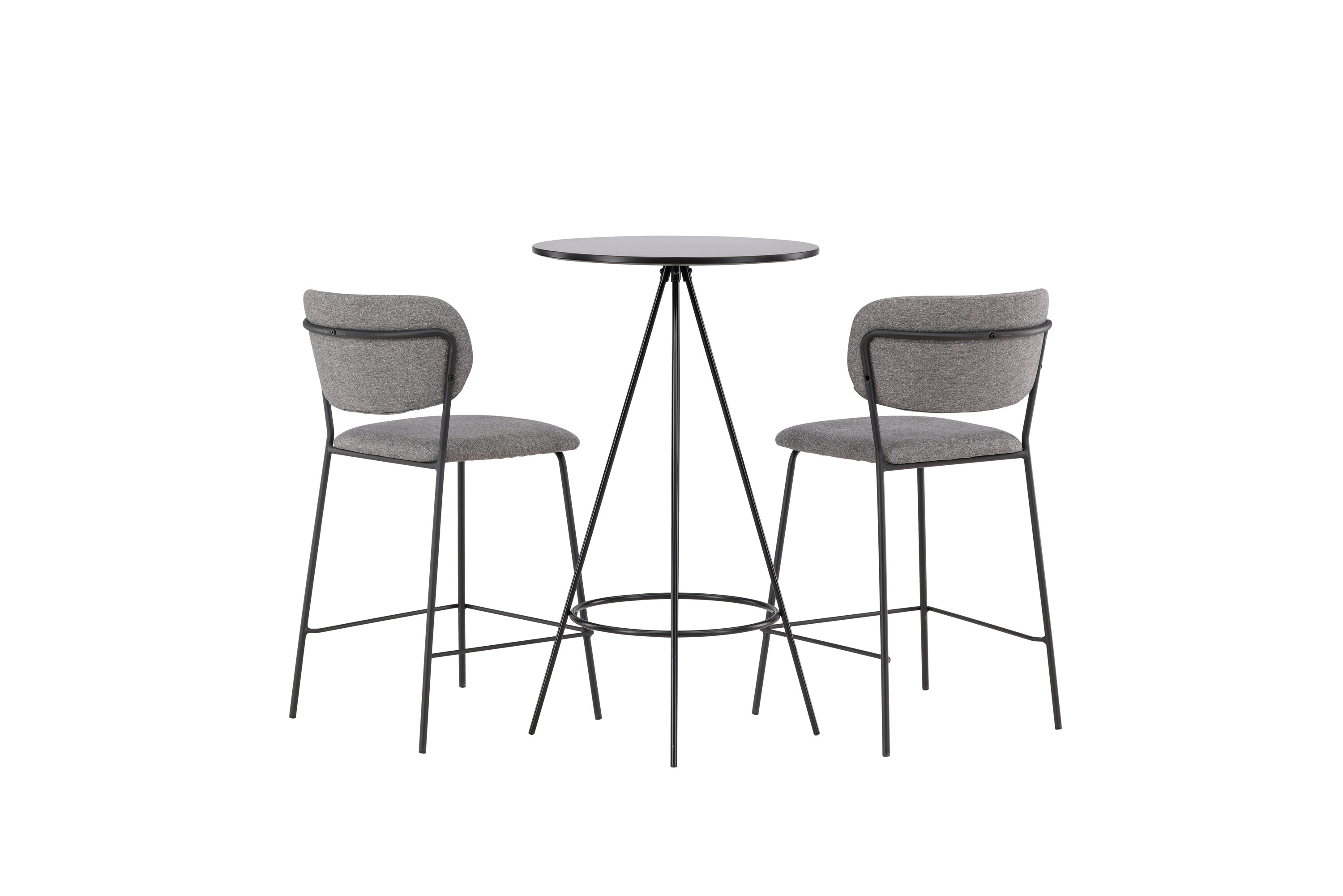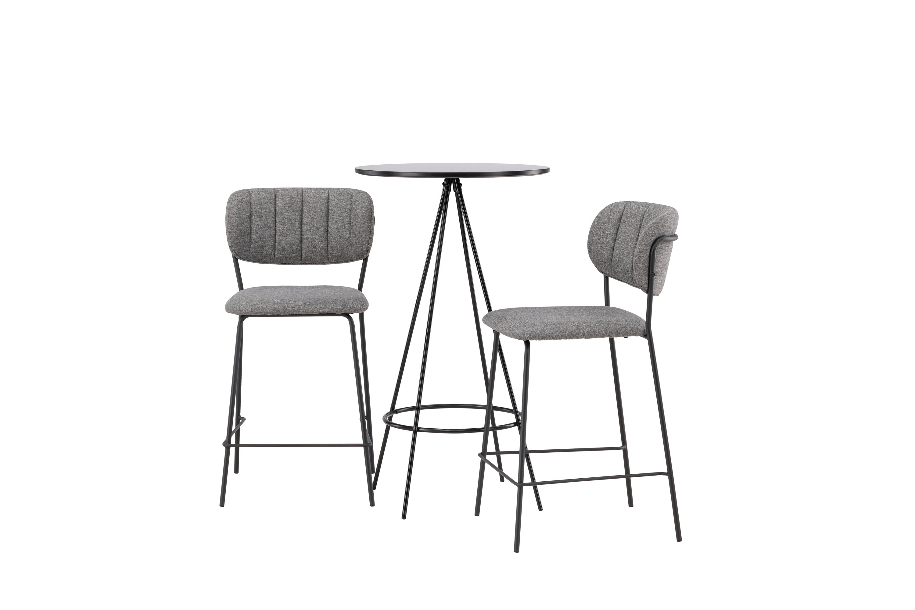 Un charmant groupe de bars aux couleurs agréables ! La table de bar Bistro a un design minimaliste et scandinave avec un plateau de table rond en MDF noir avec placage. Les pieds de table aérés en forme de cône sont légèrement évasés en métal noir et ont un cadre intégré pour le repose-pieds. Ici avec des tabourets de bar gris de la série Bell. La chaise a un design entièrement rembourré avec un dossier et un siège légèrement arrondis en tissu polyester gris avec des coutures décoratives élégantes et les pieds de la chaise sont étroits en acier noir avec repose-pieds intégré. Le design mince donne une impression aérée ! Dimensions de la table : 60 cm.