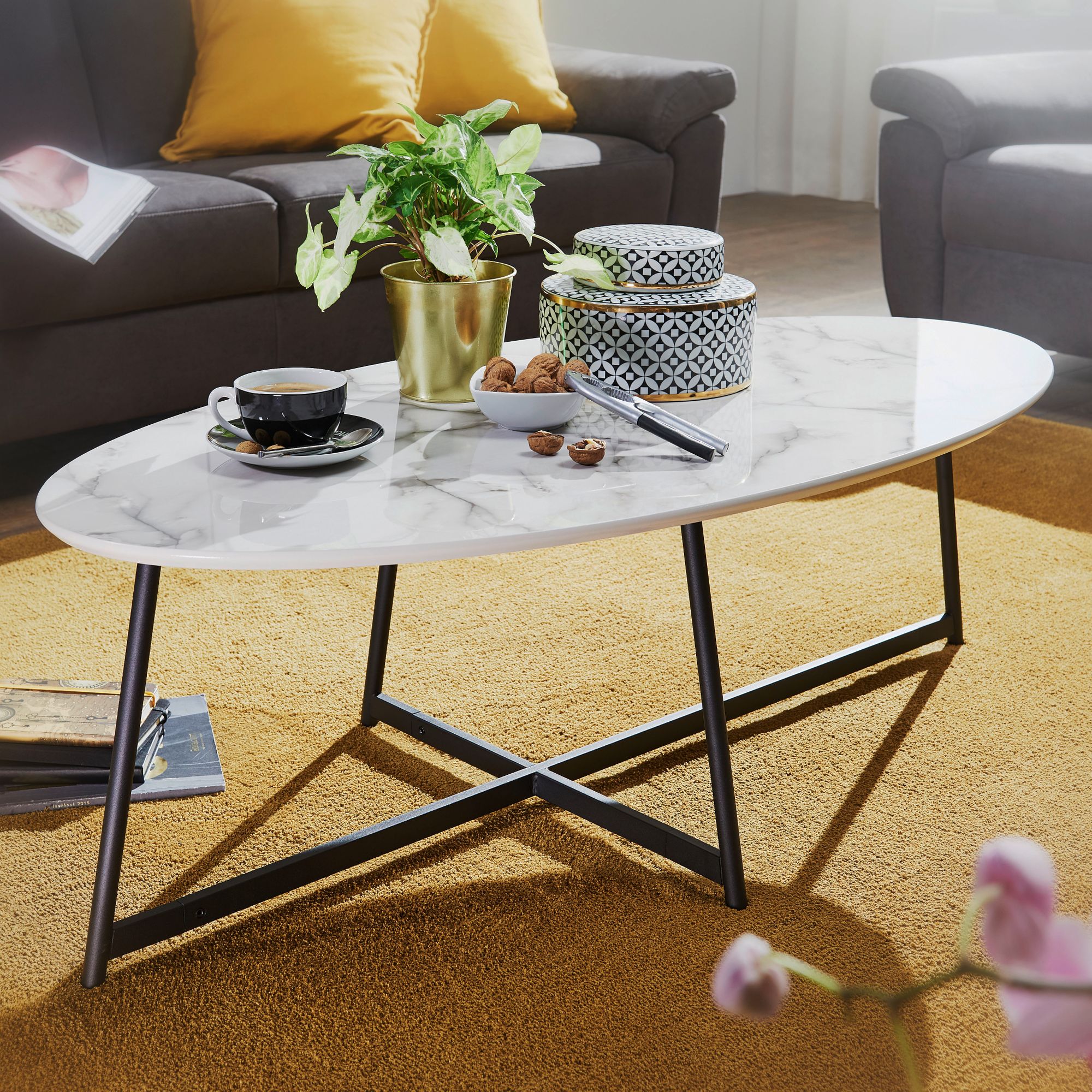 Design table basse ovale 120x60 cm aspect marbre blanc, avec pieds en métal noir
