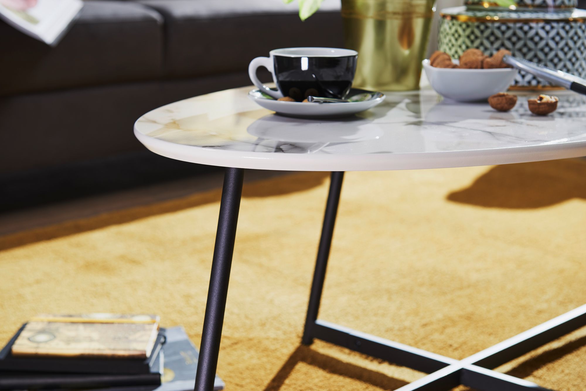 Design table basse ovale 120x60 cm aspect marbre blanc, avec pieds en métal noirconception