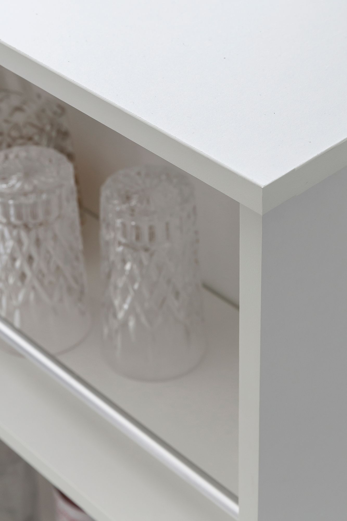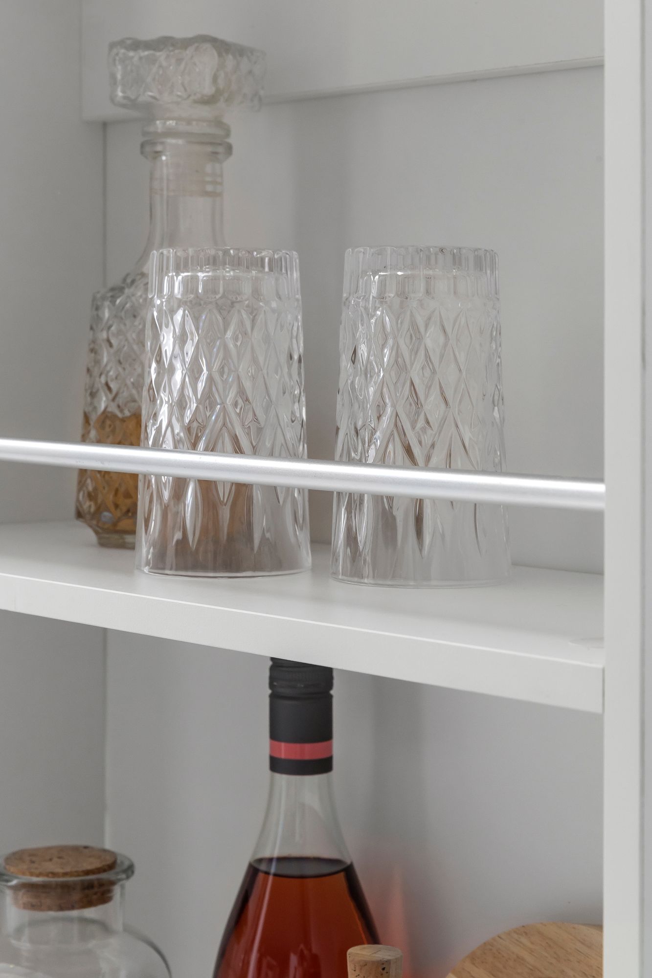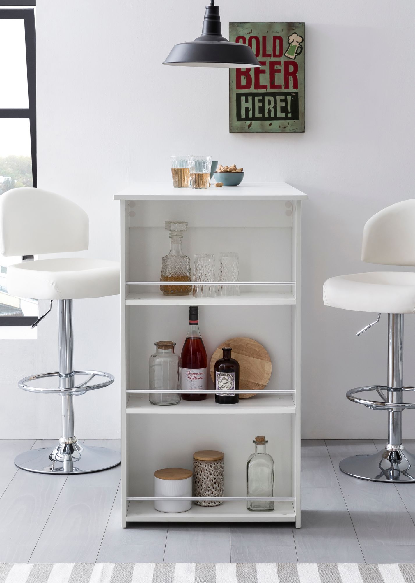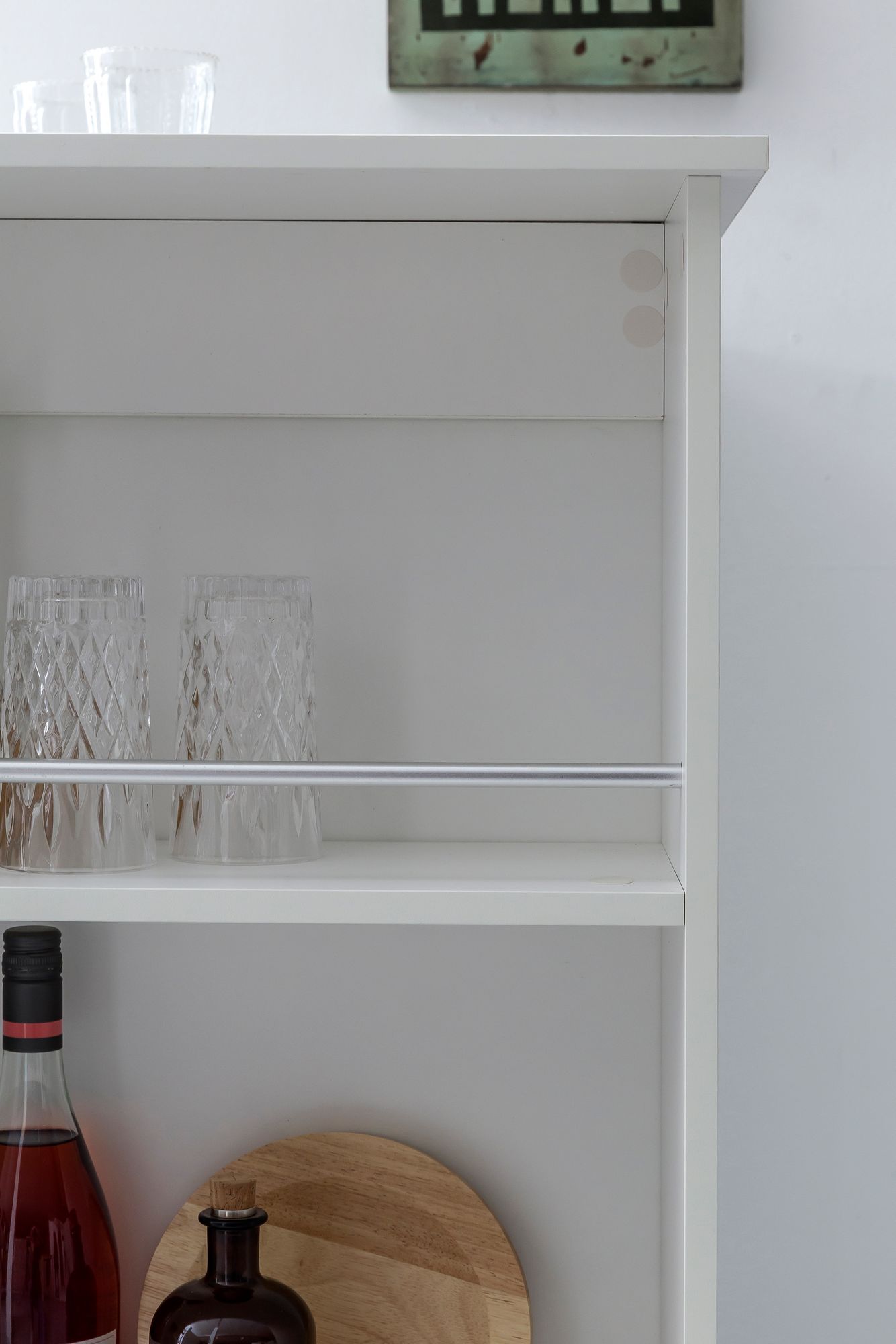 Cette table de bar blanche allie un design moderne épuré à une grande surface de rangement grâce à ses trois niches intégrées, parfaites pour bouteilles, verres et ustensiles de cuisine. Les barrières en aluminium argenté assurent la sécurité des objets placés.