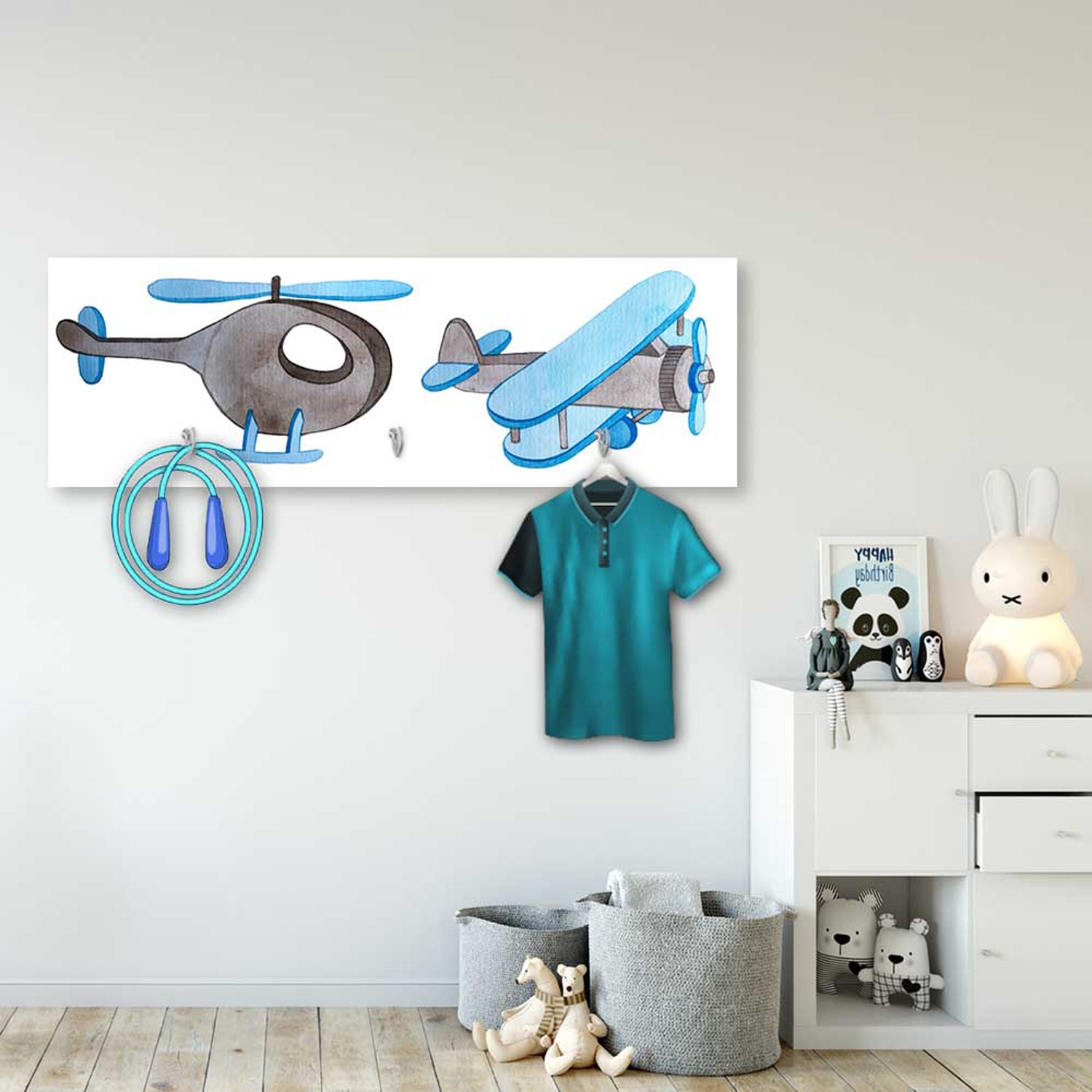 Kapstok in hdf-paneel en satijnpapier met vliegtuig- en helikoptertekening voor kinderen