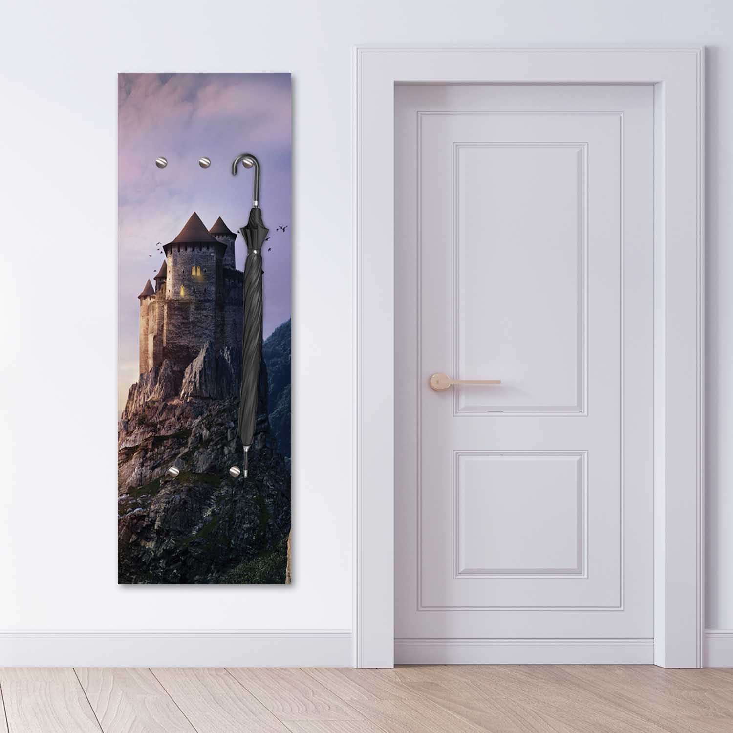 Productinformatie "Kapstok van hardboard en satijnpapier met een tekening van een kasteel op een rots"