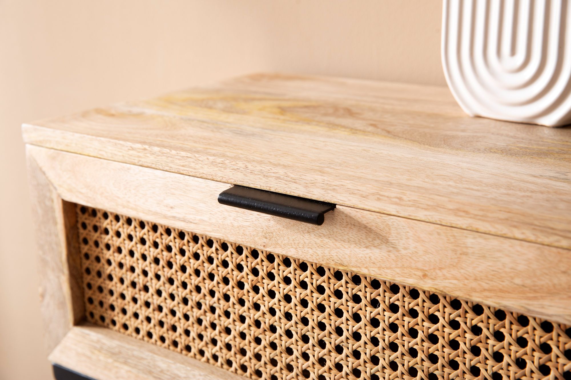 Deze nachtkastje combineert de warmte van massief mangohout en rotan met de stevigheid van een zwart metalen frame, en brengt zo een perfecte balans tussen natuurlijke elementen en modern design.