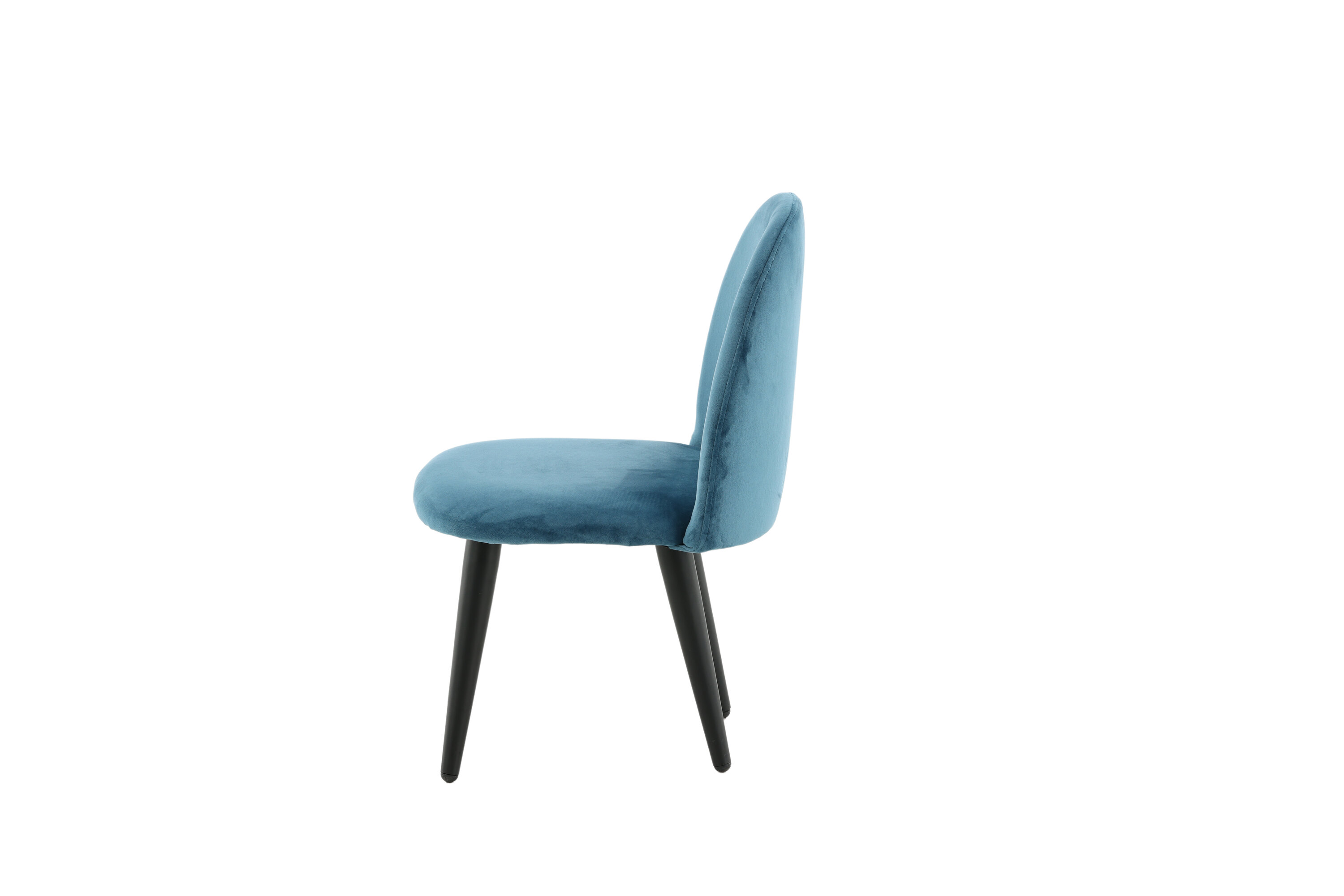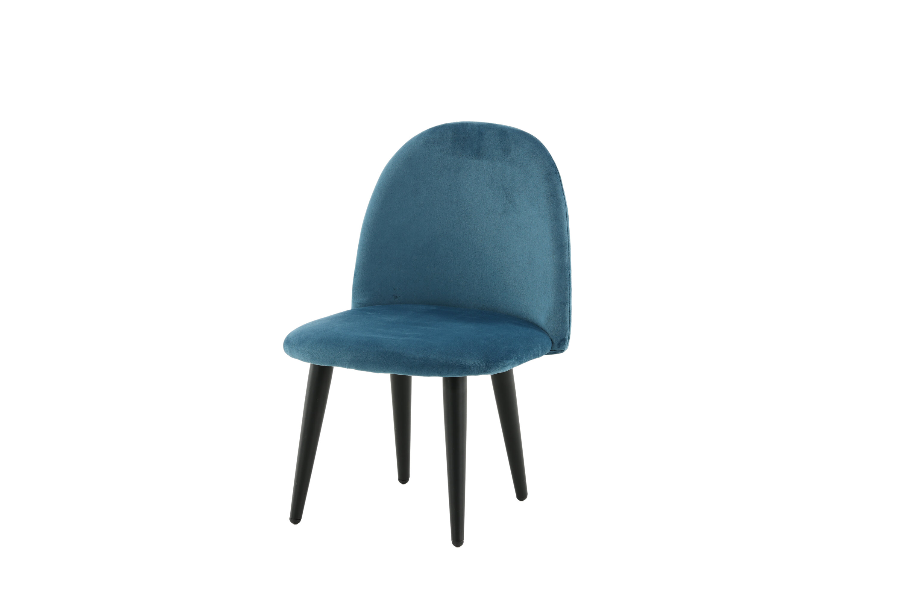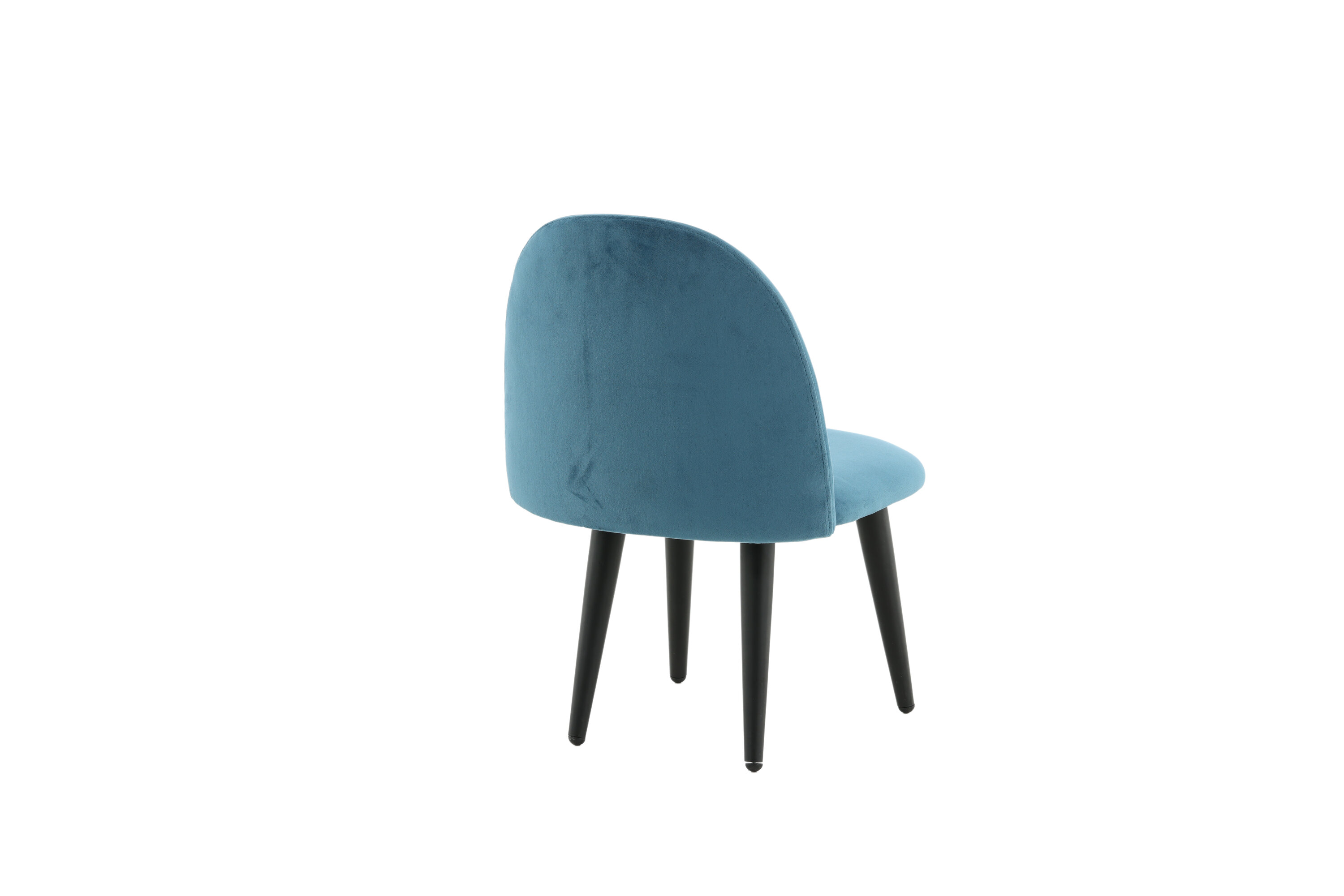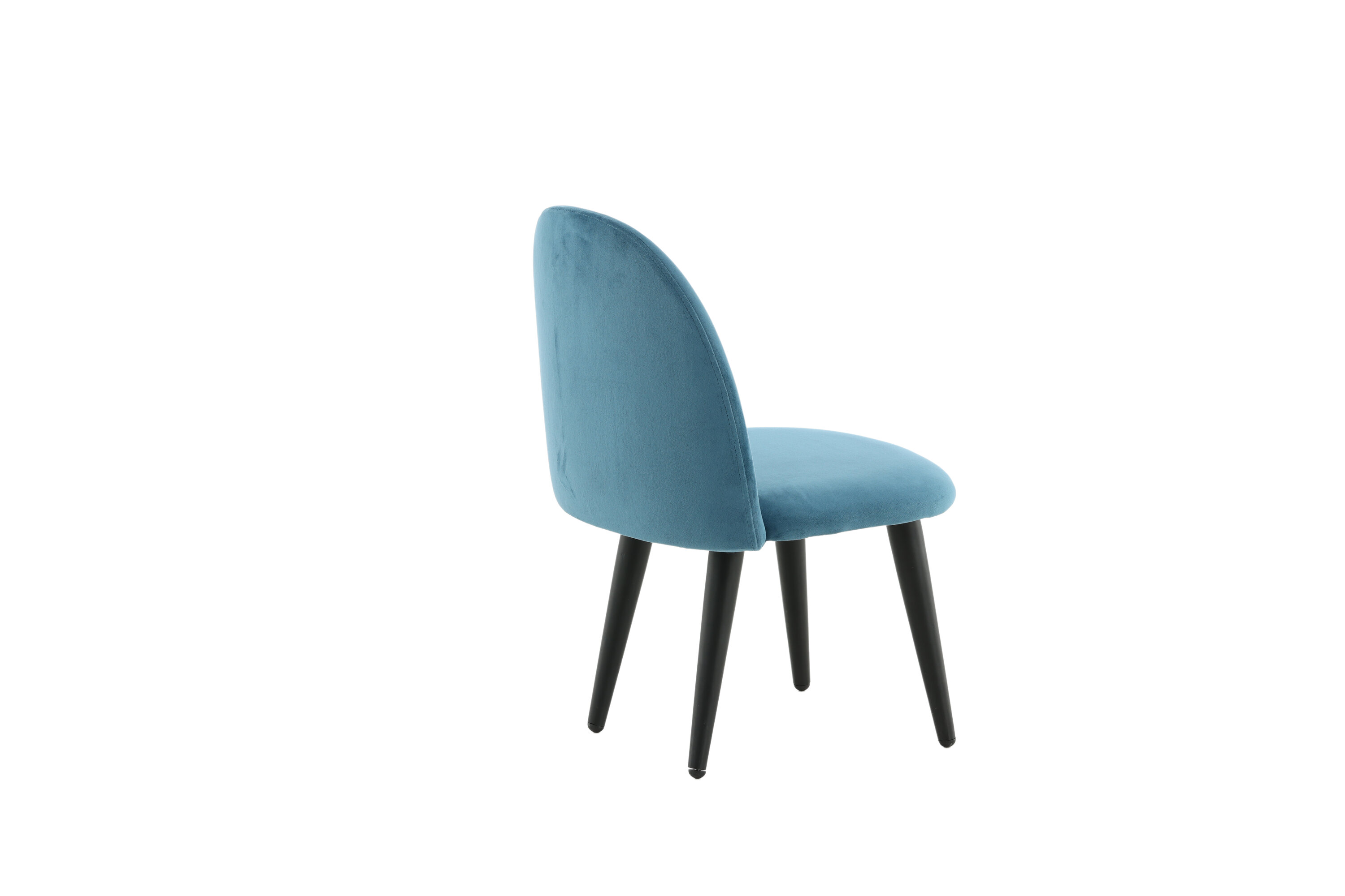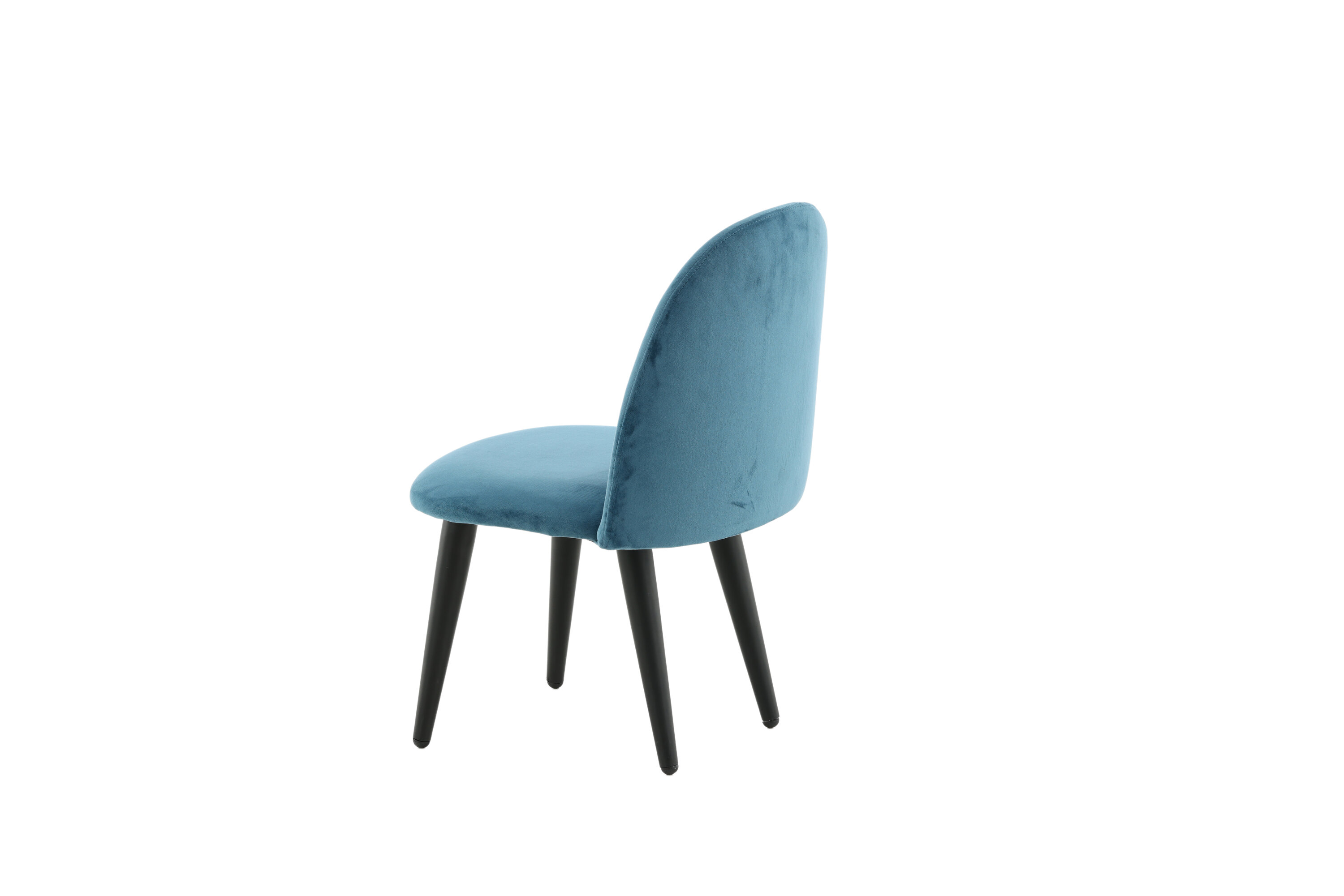 Stoel voor kinderen in een volledig gestoffeerd ontwerp met poten in zwart gepoedercoat metaal en met een licht afgeronde rug en zitting in gewatteerde blauwe fluwelen stof. Enige montage vereist.