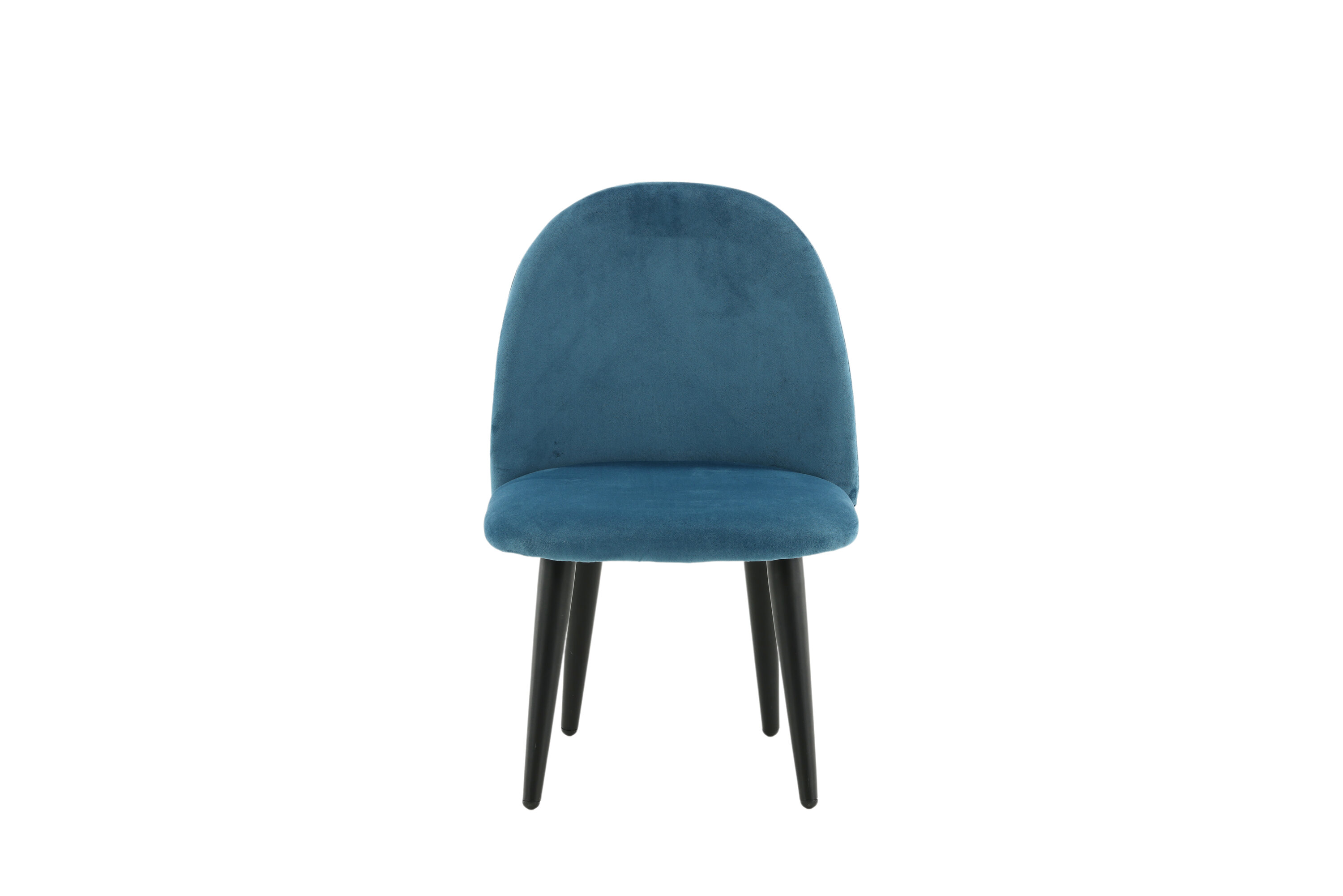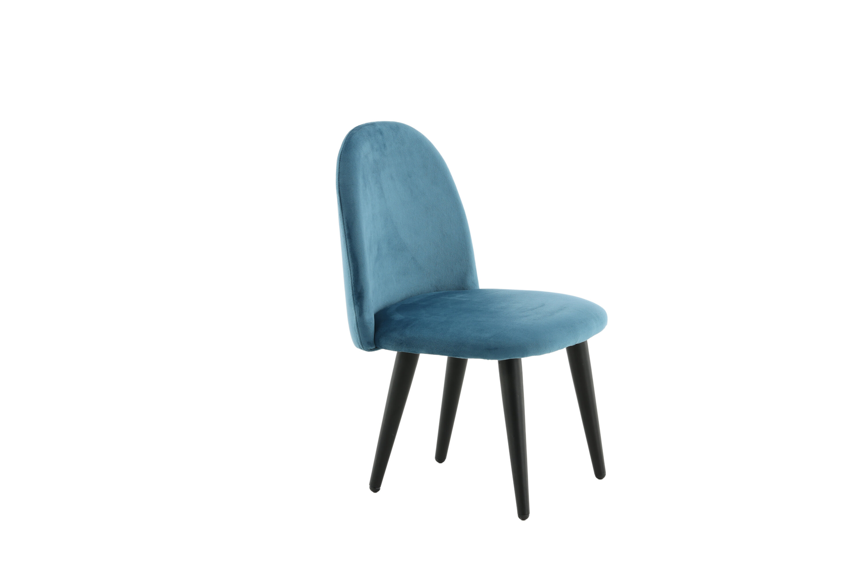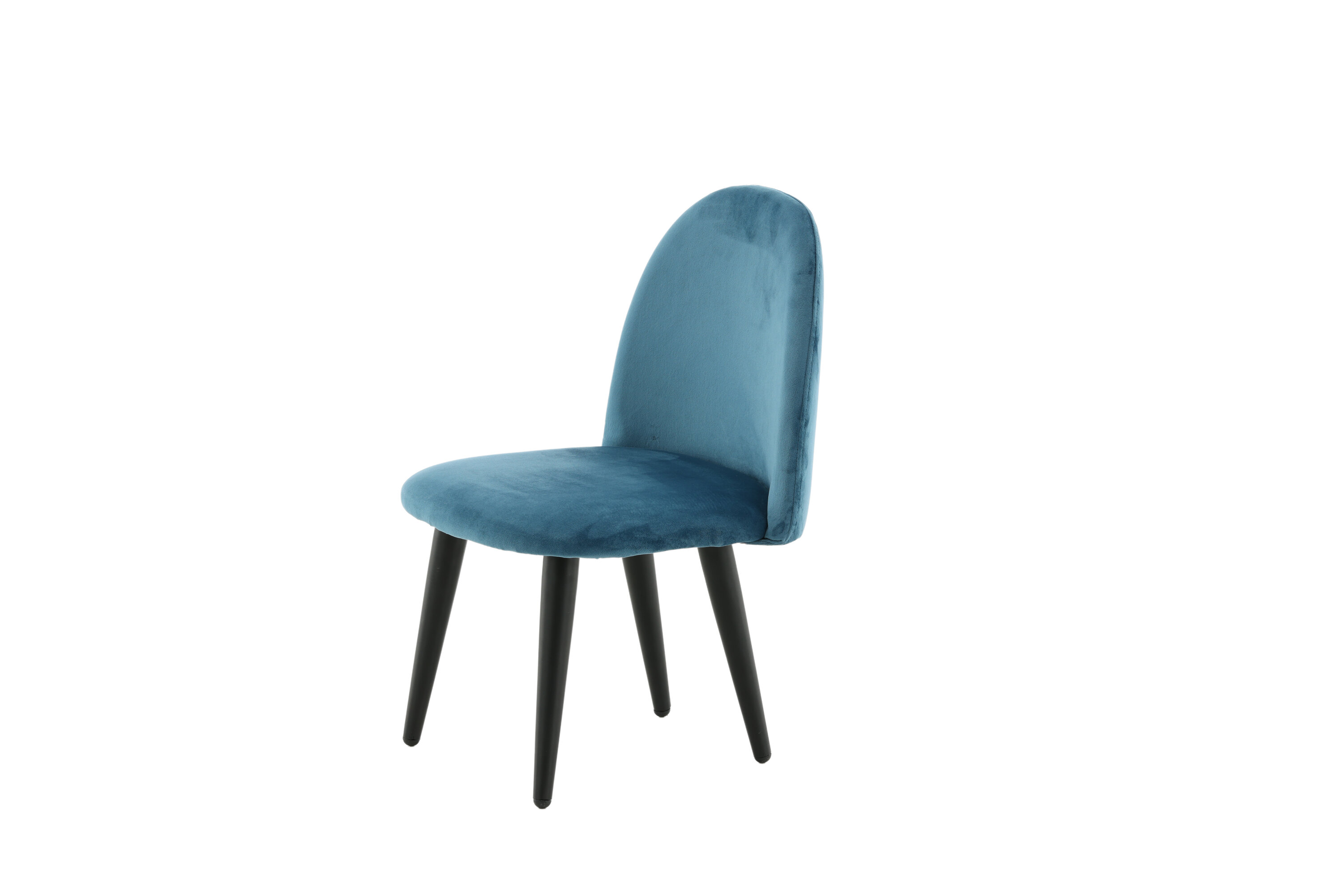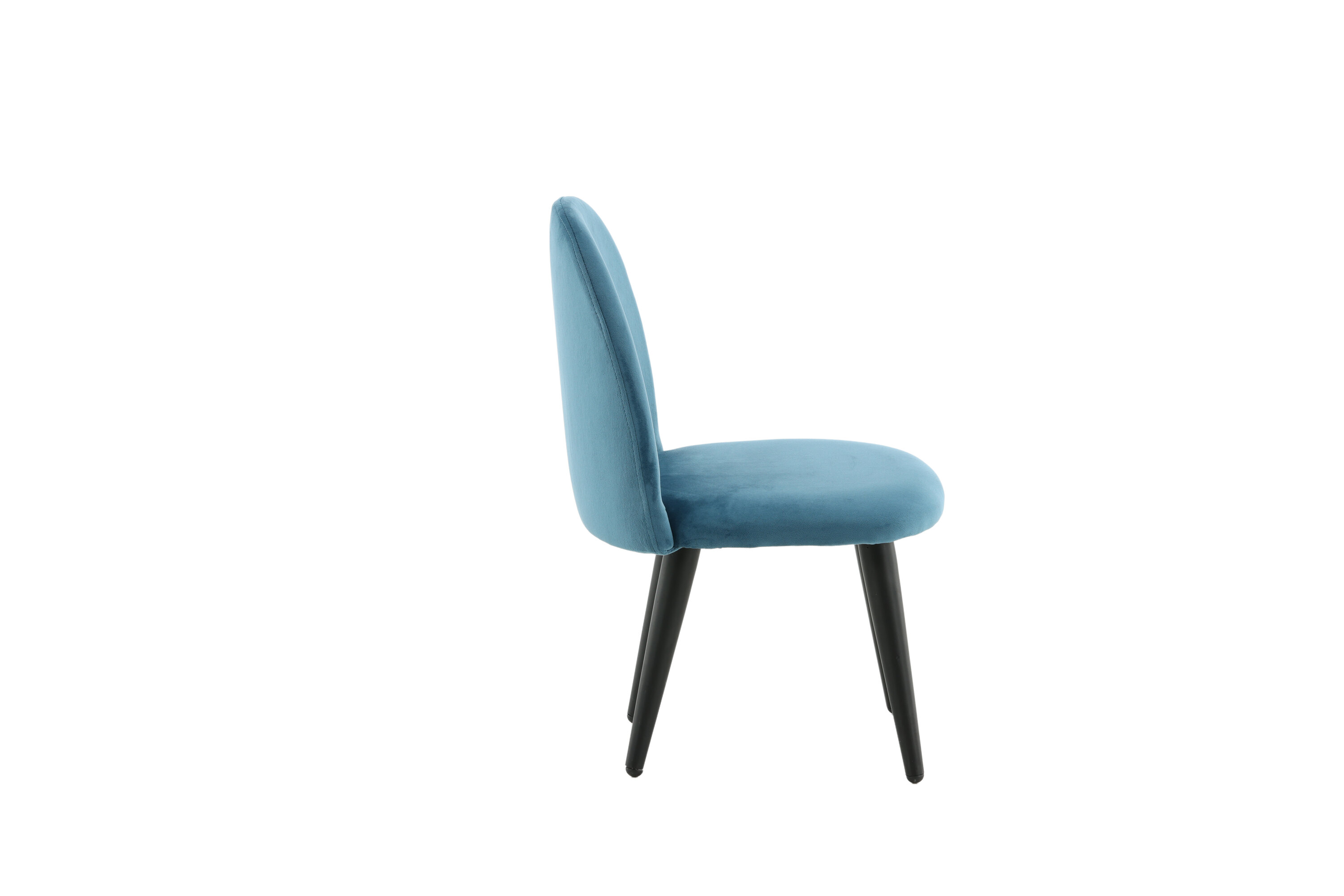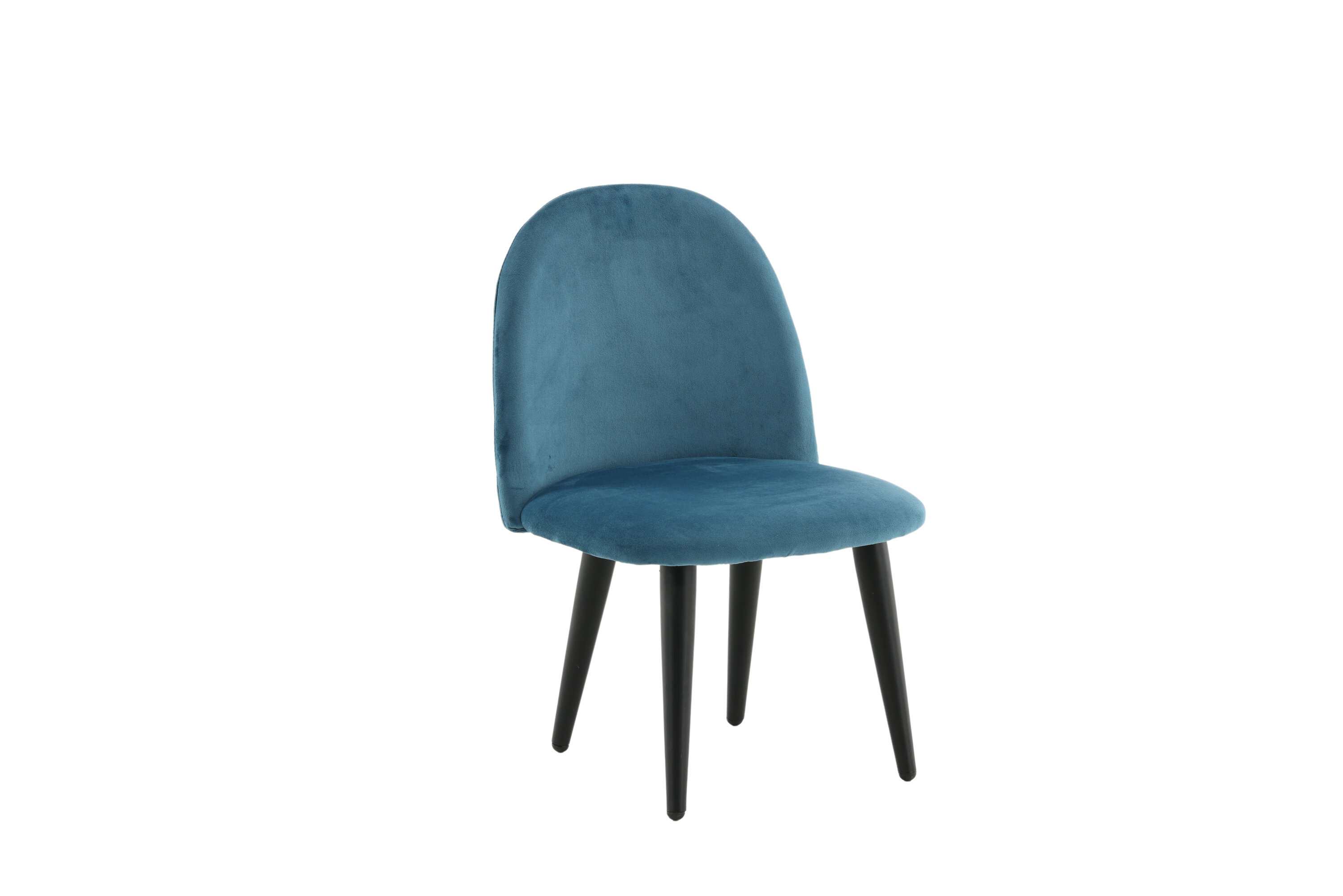 Stoel voor kinderen in een volledig gestoffeerd ontwerp met poten in zwart gepoedercoat metaal en met een licht afgeronde rug en zitting in gewatteerde blauwe fluwelen stof. Enige montage vereist.