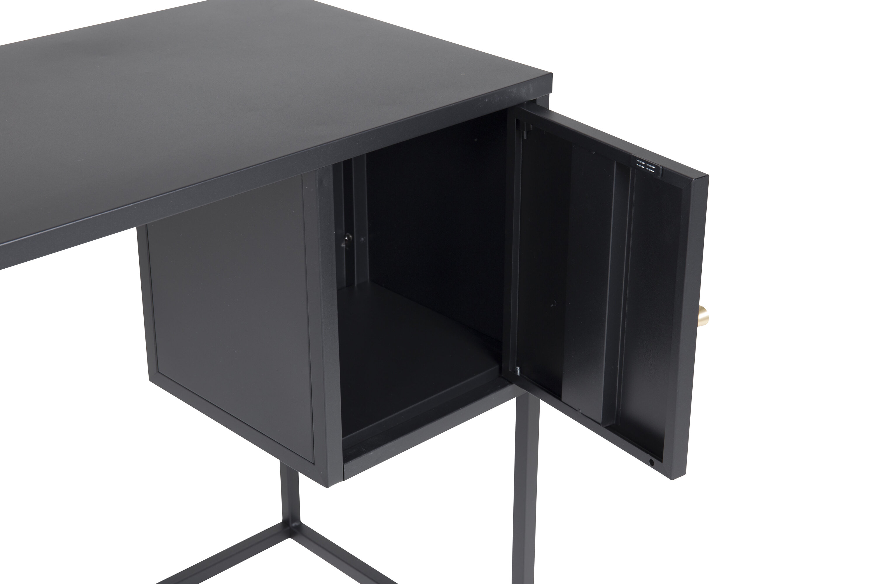 Baktal, een mooi bureau in modern industrieel design, geïntegreerd frame en een vierkante kleinere kast. Een kleinere deur met verborgen opbergruimte en een reliëfoppervlak in de rechterhoek van zwart gepoedercoat staal. De deur heeft een koperkleurige knop. Afmetingen: Lengte: 95 cm, breedte: 45 cm, hoogte: 50 cm. Lichtere montage is vereist.