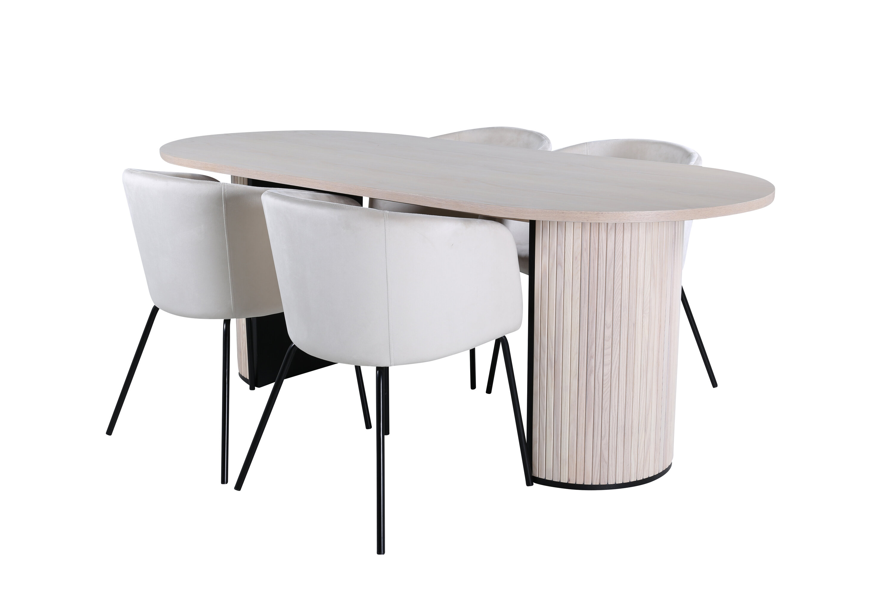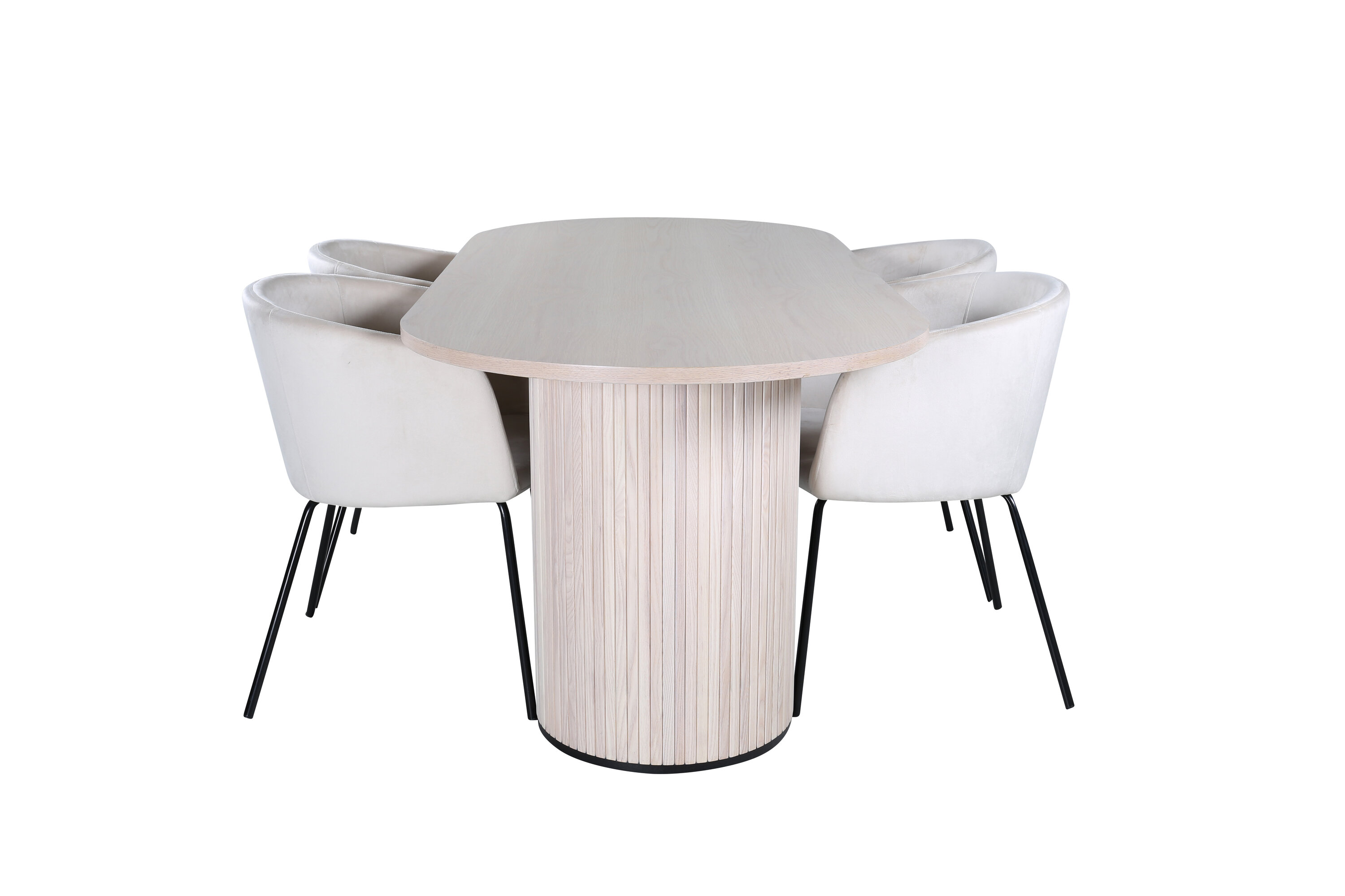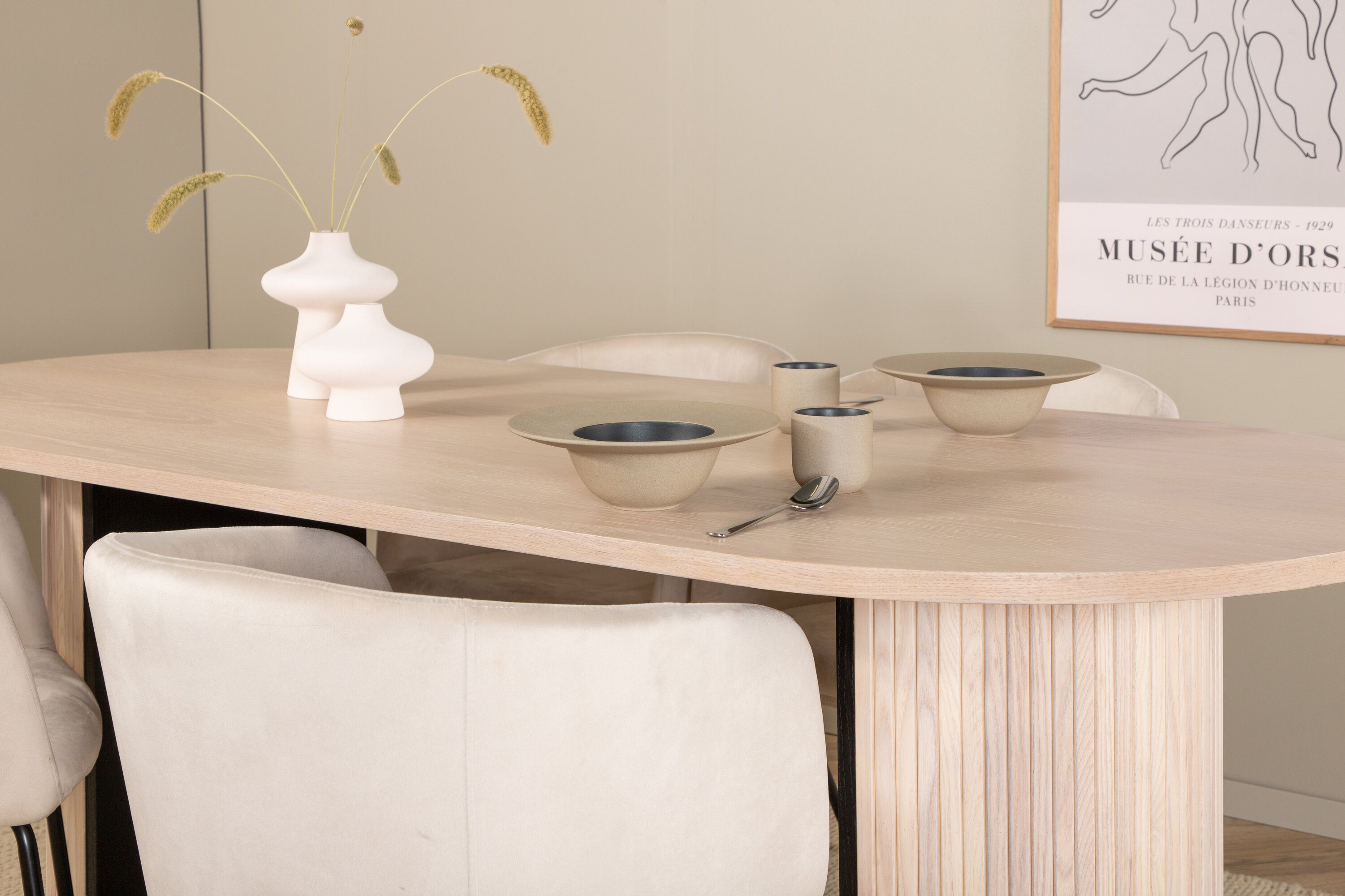 Bianca creëert een stijlvolle blikvanger die indruk maakt! Deze ovale eettafel in een gepleisterde witte kleur heeft een modern design met een tafelblad in beenwit MDF met fineer en een robuust frame in hout en MDF in een geribbeld design dat een stabiele indruk geeft. Tafelafmetingen: lengte: 200 cm, breedte: 90 cm, hoogte: 75 cm. Hier gecombineerd met 4 van onze stijlvolle eetkamerstoelen Berit in uitnodigend design. De stoelen richten zich op comfort met een zachte zitting in beige fluwelen stof en stijlvolle smalle stoelpoten in zwart ijzer. Afmetingen stoel: hoogte: 78 cm, zithoogte: 49 cm, breedte: 55 cm, diepte: 55 cm