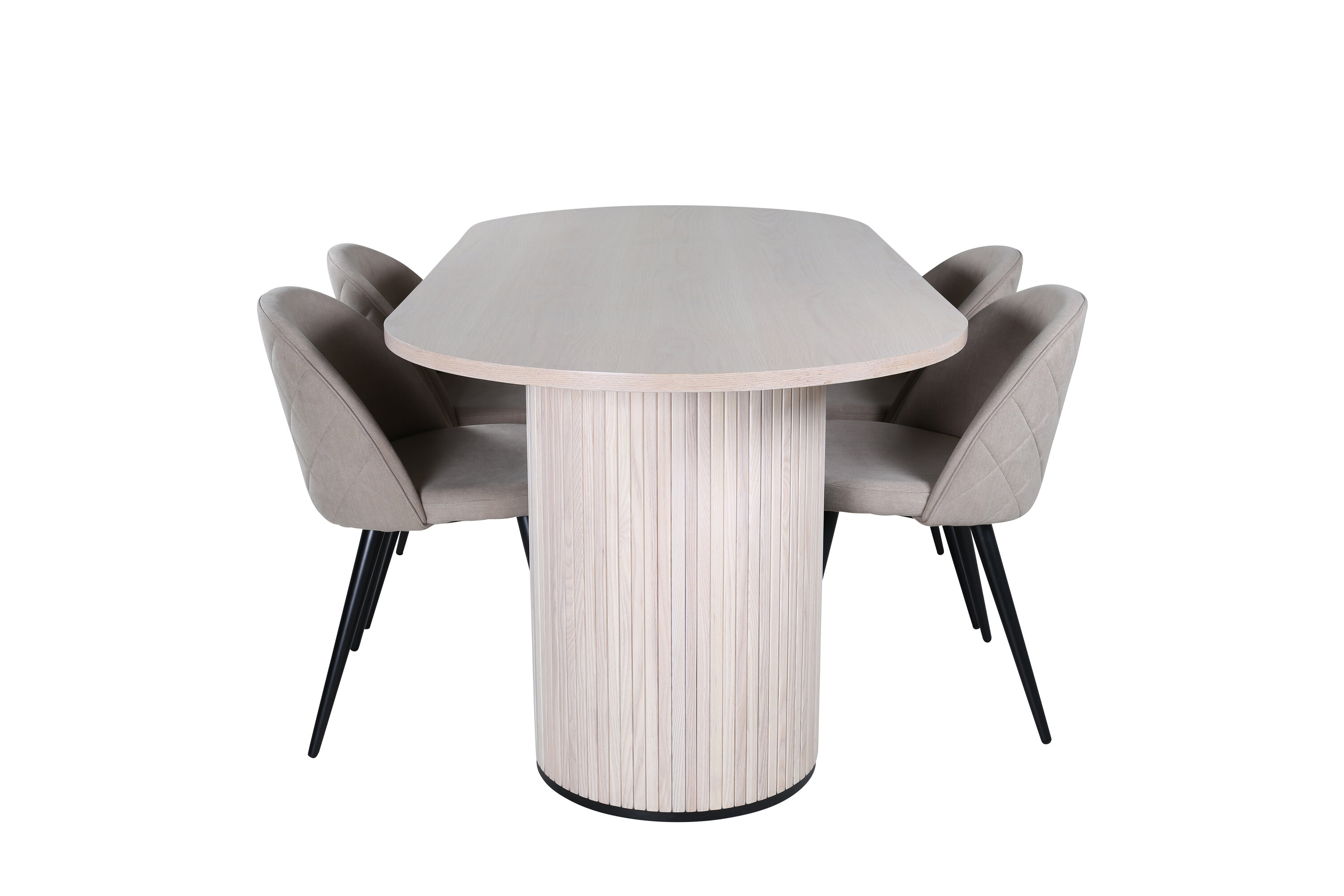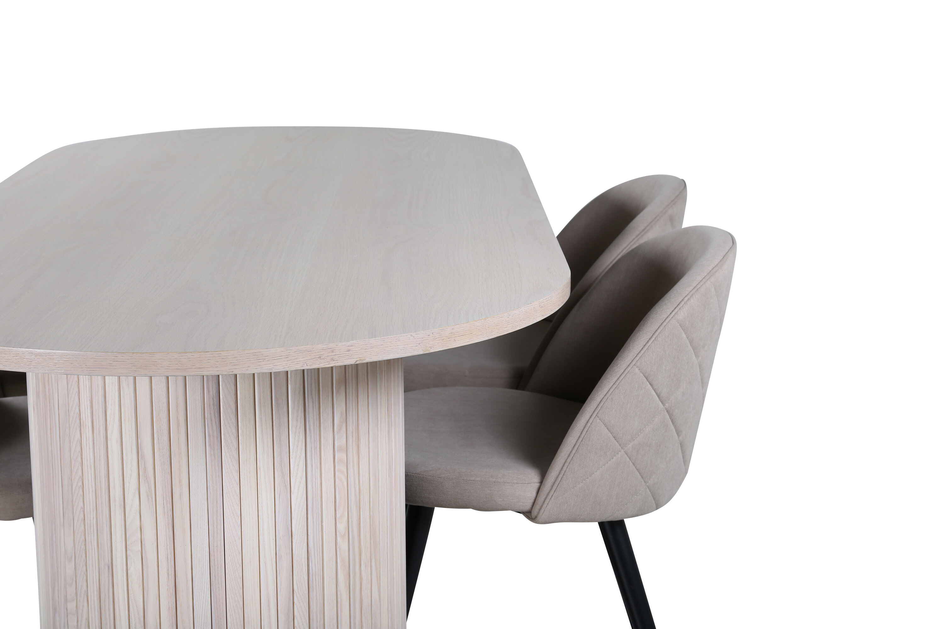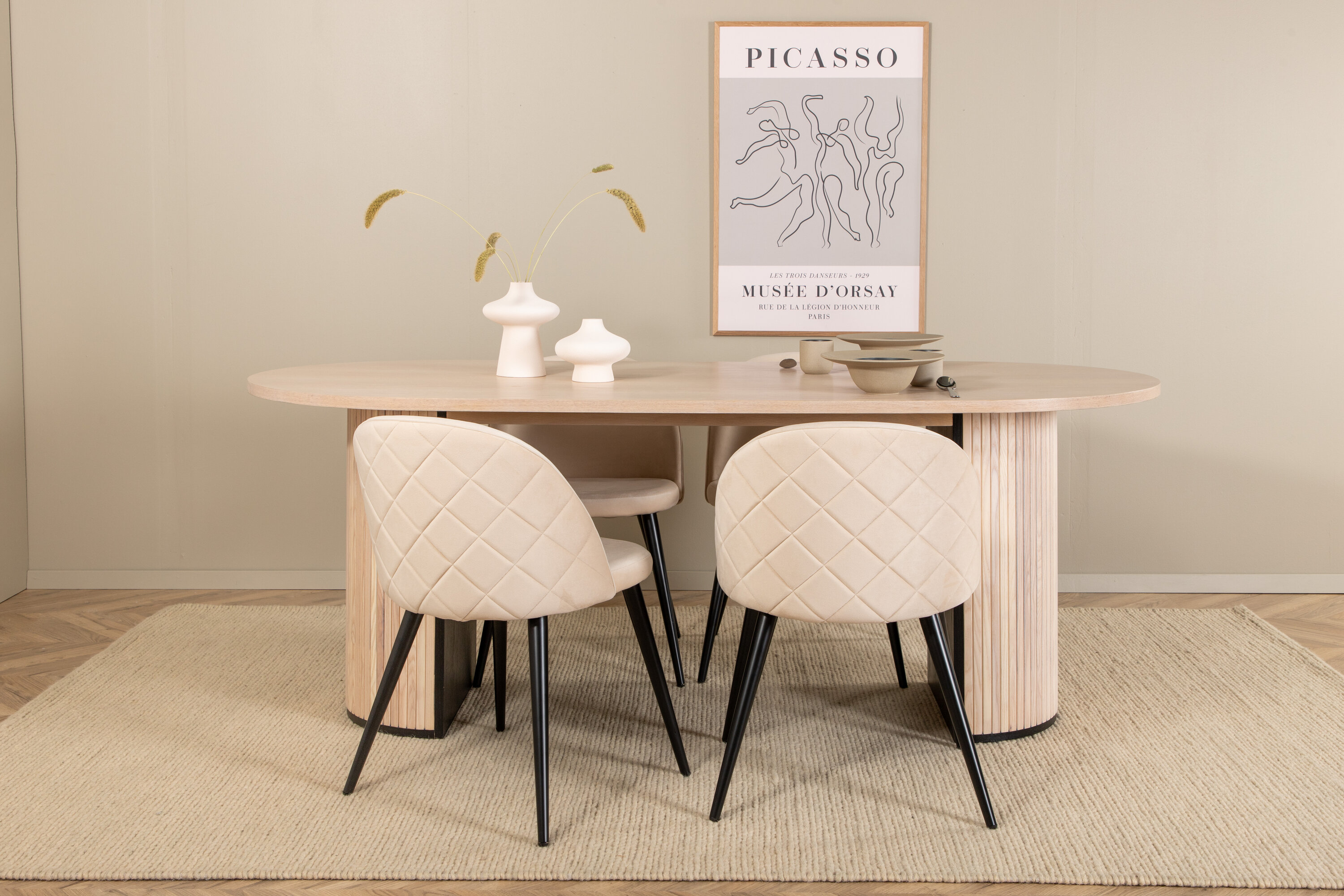 Een moderne voedingsgroep die de aandacht trekt! De ovale eettafel Bianca in een gepleisterde witte kleur heeft een heerlijk design met een tafelblad in beenwit MDF met fineer en een robuust frame in hout en MDF in een geribbeld design dat een stabiele indruk geeft. Tafelafmetingen: lengte: 200 cm, breedte: 90 cm, hoogte: 75 cm. Hier in perfecte combinatie met 4 van onze populaire eetkamerstoelen Velvet. De stoelen richten zich op stijl en comfort met een comfortabele zitting in beige polyester linnen en uitlopende stoelpoten in ijzer. Afmetingen stoel: hoogte: 76,5 cm, zithoogte: 46,5 cm, breedte: 50 cm, diepte: 57 cm. Laat de tijd aan de eettafel een van de hoogtepunten van vandaag worden!