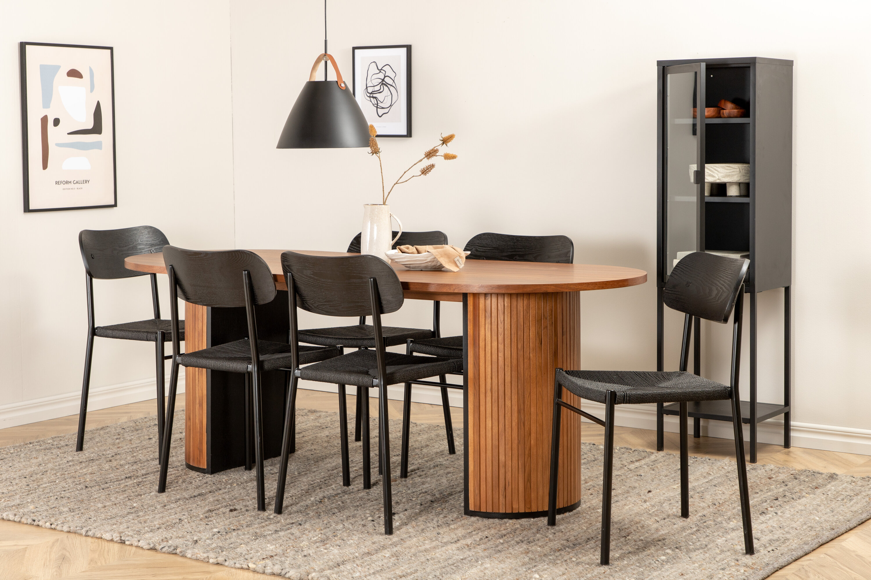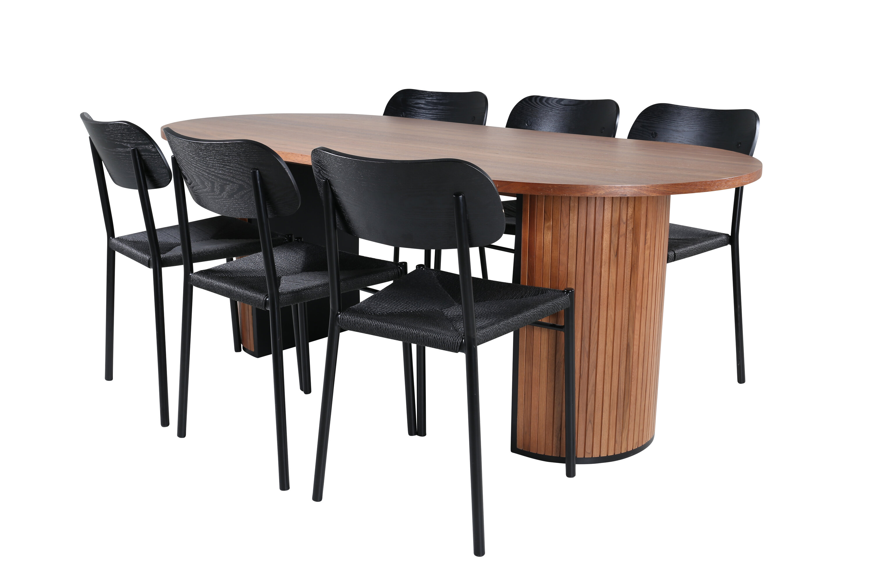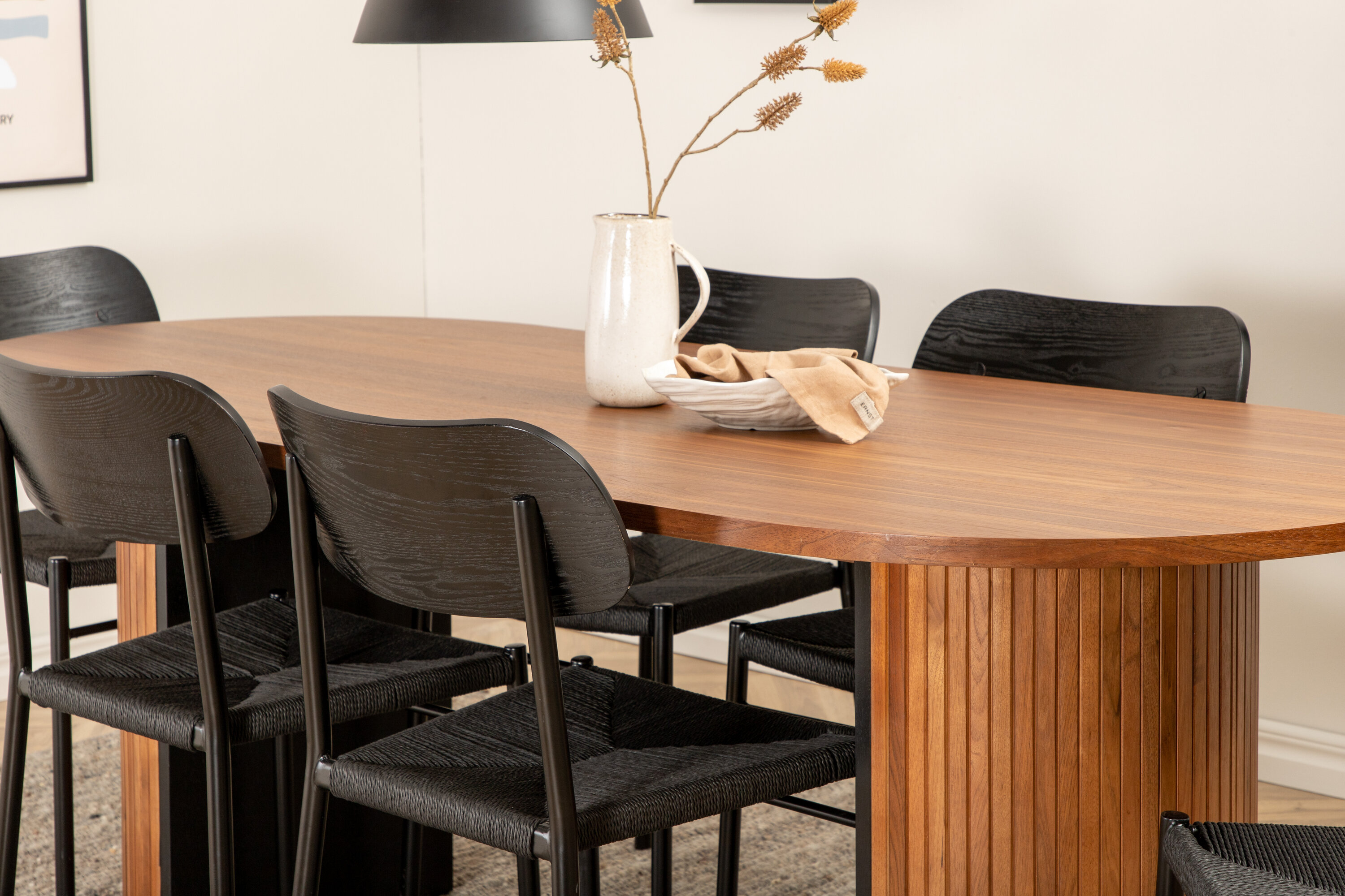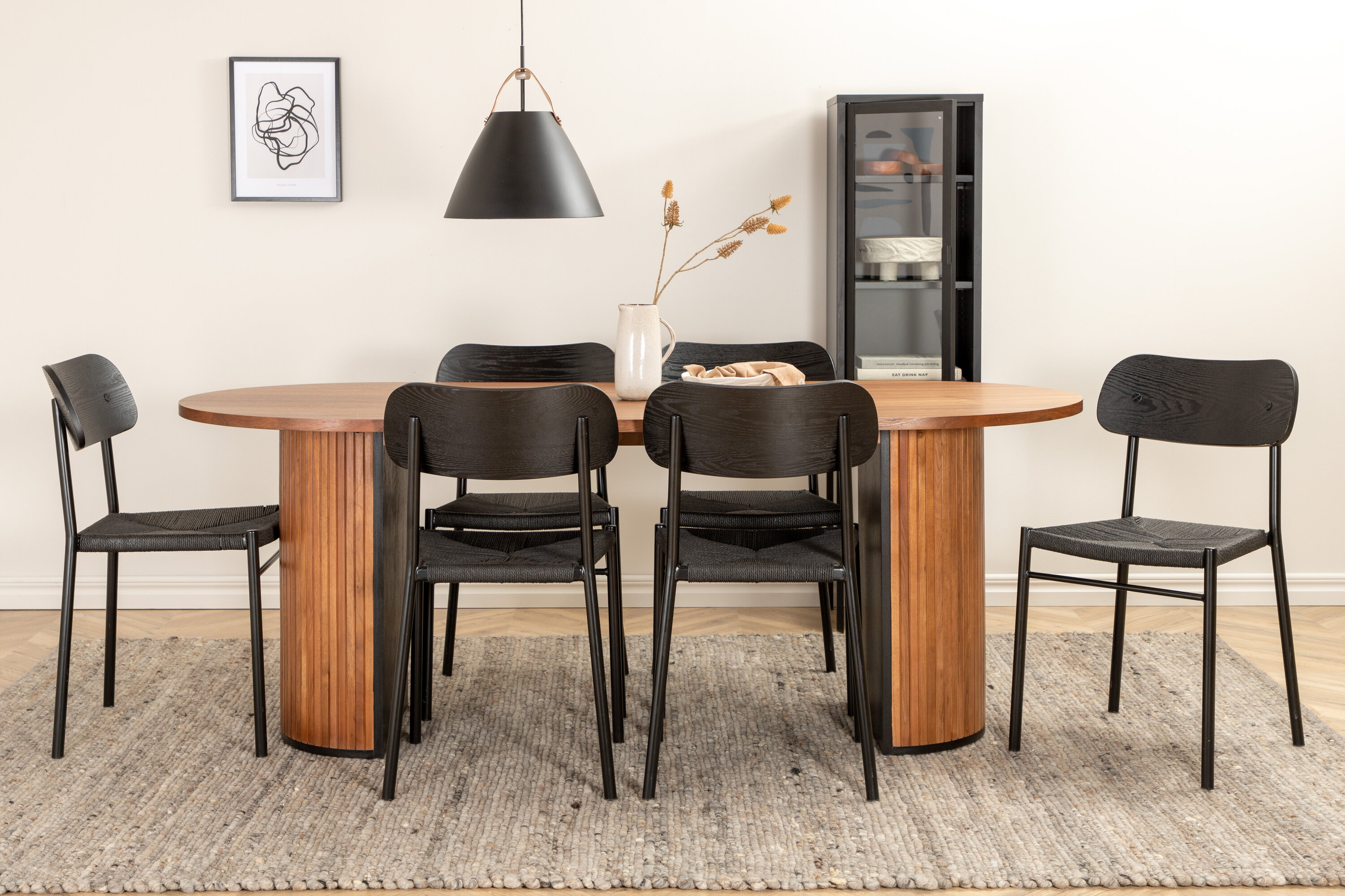 Laat de eenvoudige de robuuste ontmoeten in deze heerlijke voedselgroep! Onze ovale eettafel Bianca in trendy walnootkleuren past perfect in zowel de woonkamer als de ruime keuken. Het tafelblad is walnootkleurig MDF met fineer en de behuizing is stevig in walnoot, evenals de zwarte kleur van hout en MDF in een geribbeld ontwerp dat een stabiele indruk geeft. Tafelafmetingen: lengte: 200 cm, breedte: 90 cm, hoogte: 75 cm. Gematcht met 6 Polly eetkamerstoelen in discreet design. De stoelpoten zijn recht in zwart metaal en de zitting is gemaakt van duurzaam touw. Afmetingen stoel: hoogte: 88 cm, zithoogte: 47 cm, breedte: 42 cm, diepte: 55 cm.