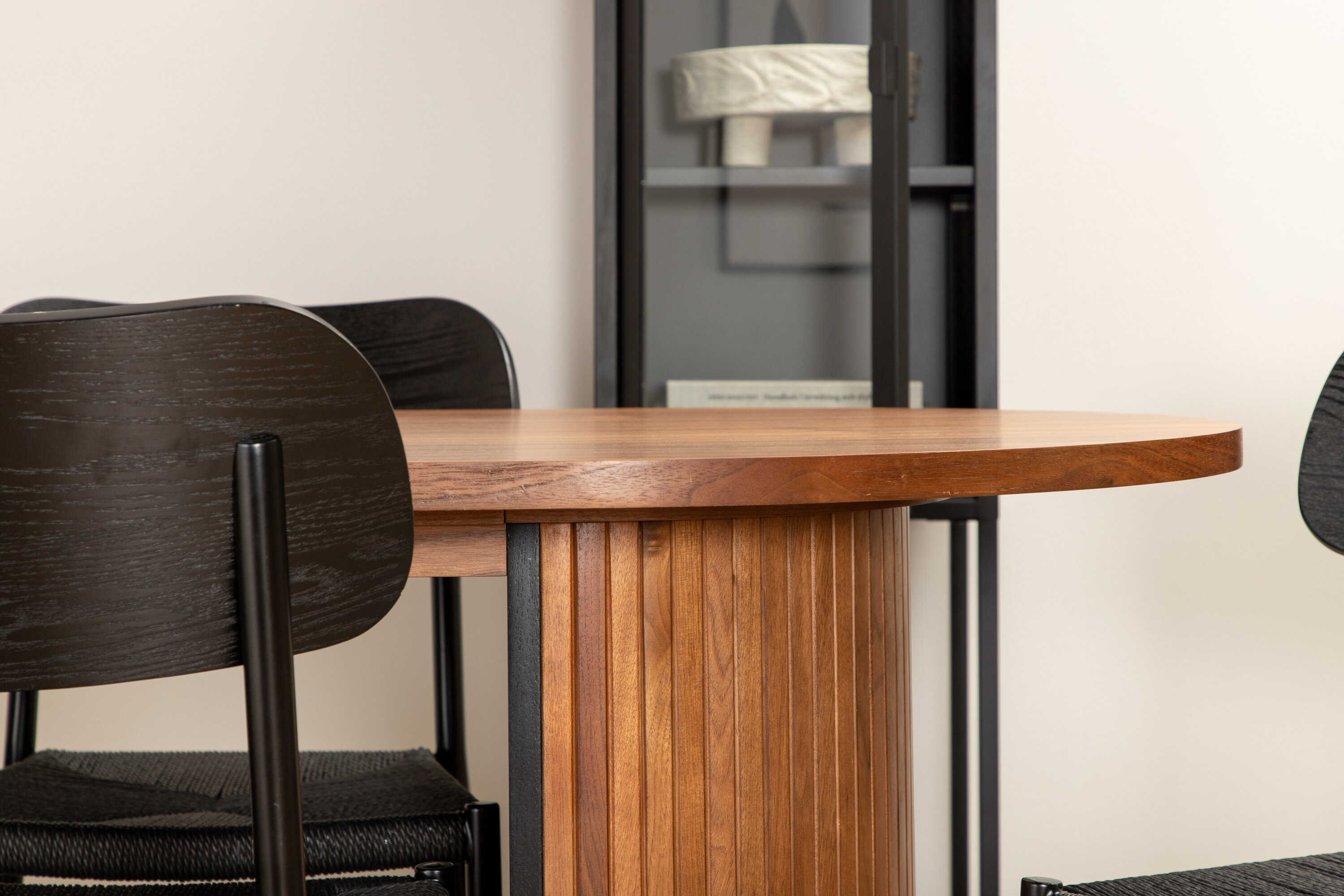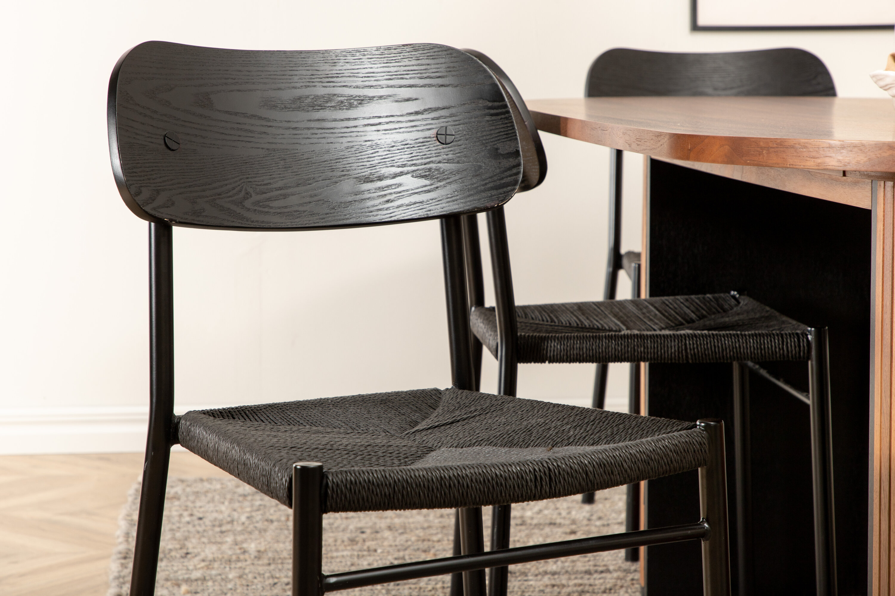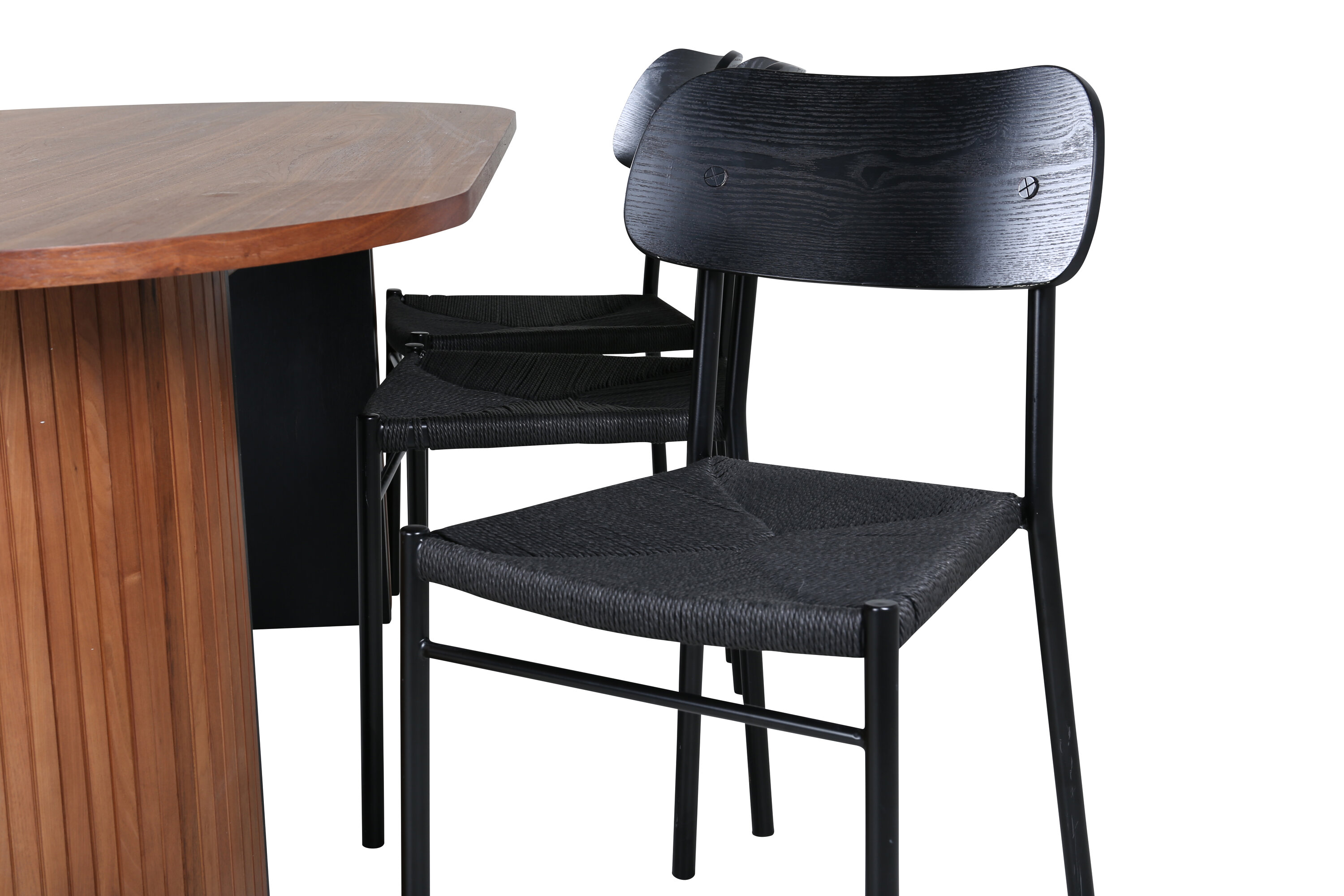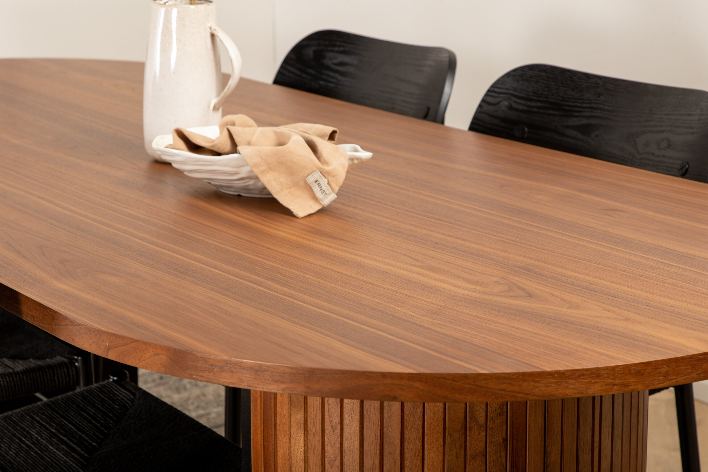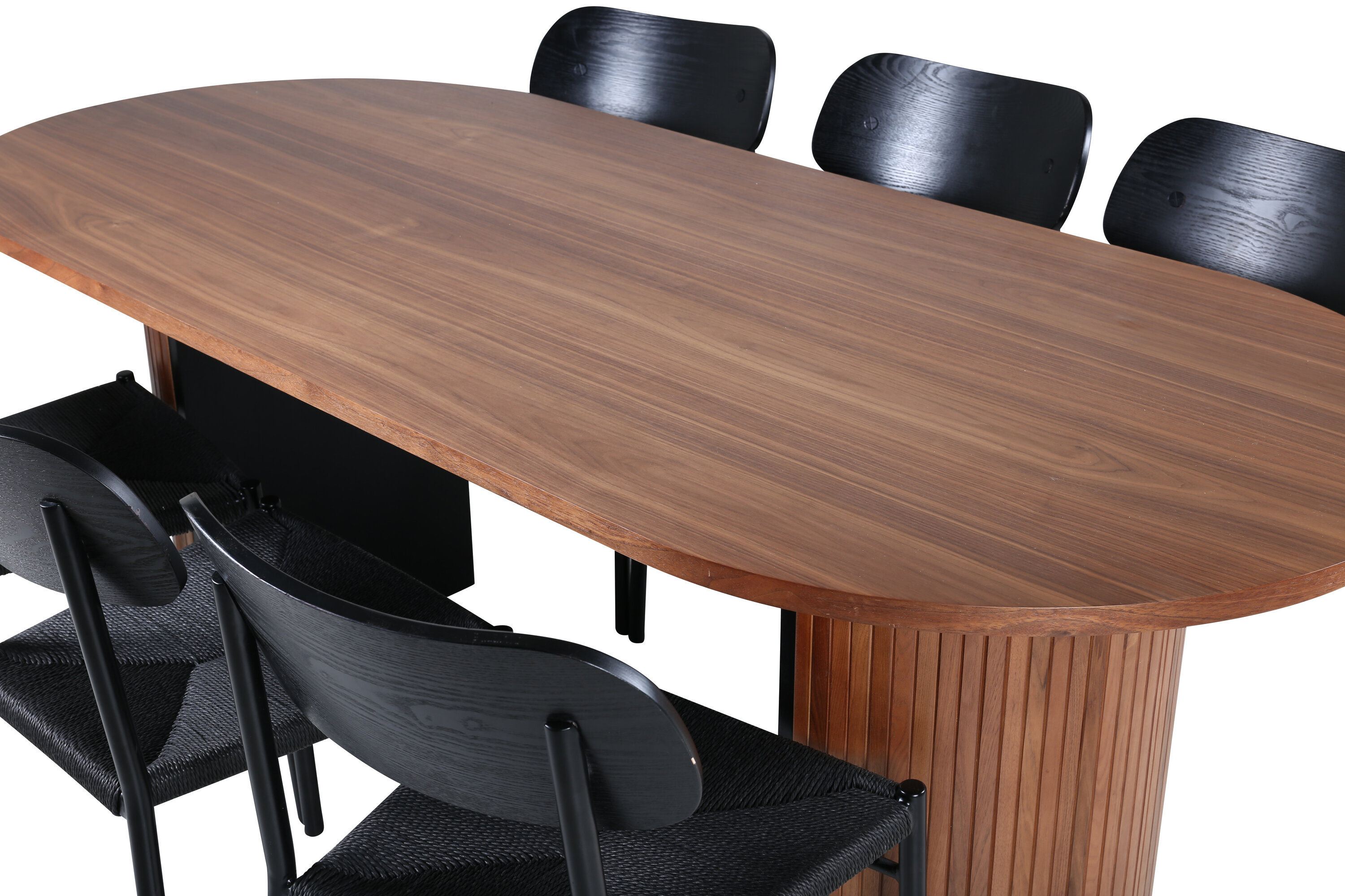 Laat de eenvoudige de robuuste ontmoeten in deze heerlijke voedselgroep! Onze ovale eettafel Bianca in trendy walnootkleuren past perfect in zowel de woonkamer als de ruime keuken. Het tafelblad is walnootkleurig MDF met fineer en de behuizing is stevig in walnoot, evenals de zwarte kleur van hout en MDF in een geribbeld ontwerp dat een stabiele indruk geeft. Tafelafmetingen: lengte: 200 cm, breedte: 90 cm, hoogte: 75 cm. Gematcht met 6 Polly eetkamerstoelen in discreet design. De stoelpoten zijn recht in zwart metaal en de zitting is gemaakt van duurzaam touw. Afmetingen stoel: hoogte: 88 cm, zithoogte: 47 cm, breedte: 42 cm, diepte: 55 cm.