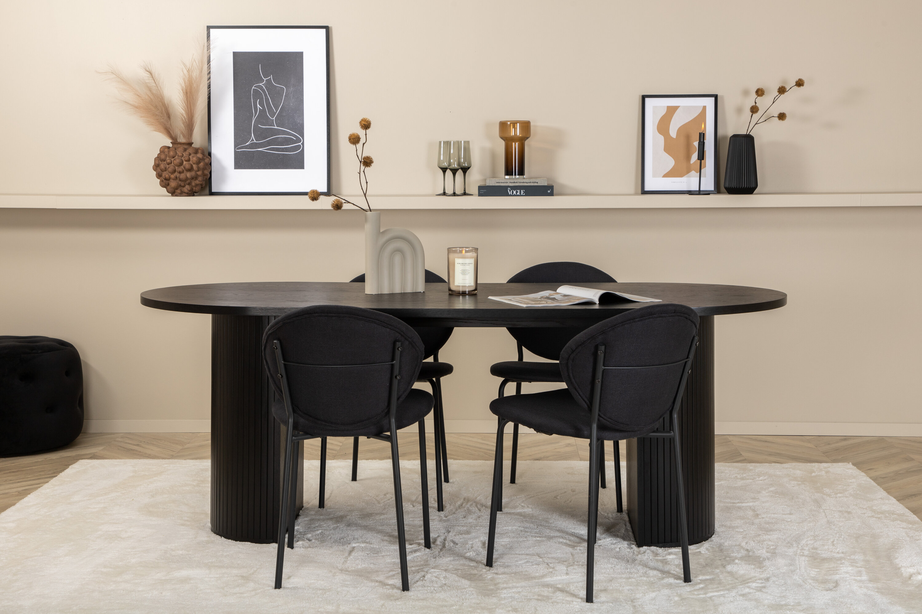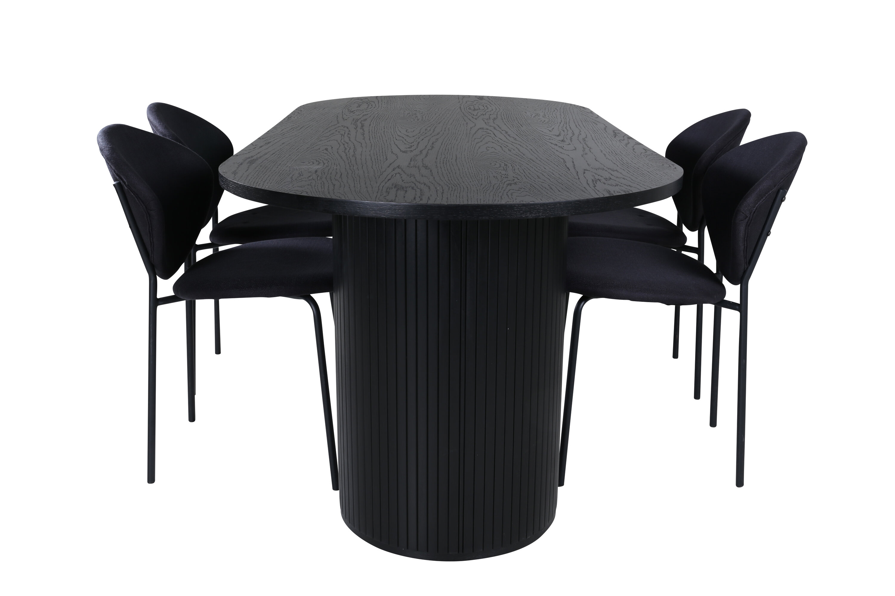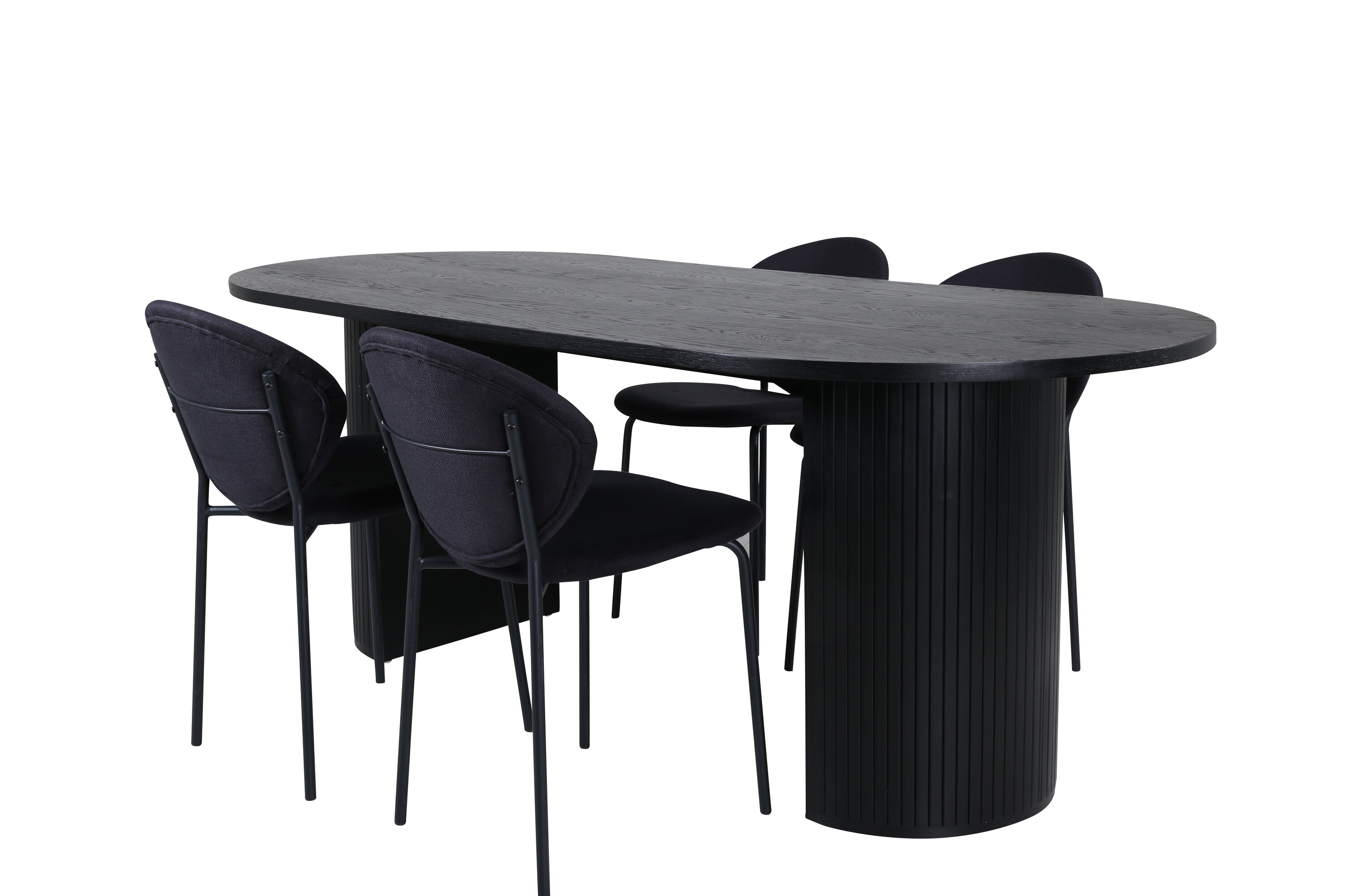 Een volledige zwarte voedselgroep raakt nooit uit de tijd! Onze ovale eettafel Bianca in consequent zwarte kleur heeft een trendy design met een MDF tafelblad en een robuust frame in geribbeld design dat een stabiele indruk geeft. Tafelafmetingen: lengte: 200 cm, breedte: 90 cm, hoogte: 75 cm. Hier gecombineerd met 4 Vault eetkamerstoelen in ovaal design. De stoelpoten zijn smal in zwart metaal en de zwarte polyester zitting. Afmetingen stoel: hoogte: 80 cm, zithoogte: 49 cm, breedte: 46 cm, diepte: 61,5 cm. Laat de tijd aan de eettafel een van de hoogtepunten van vandaag worden!