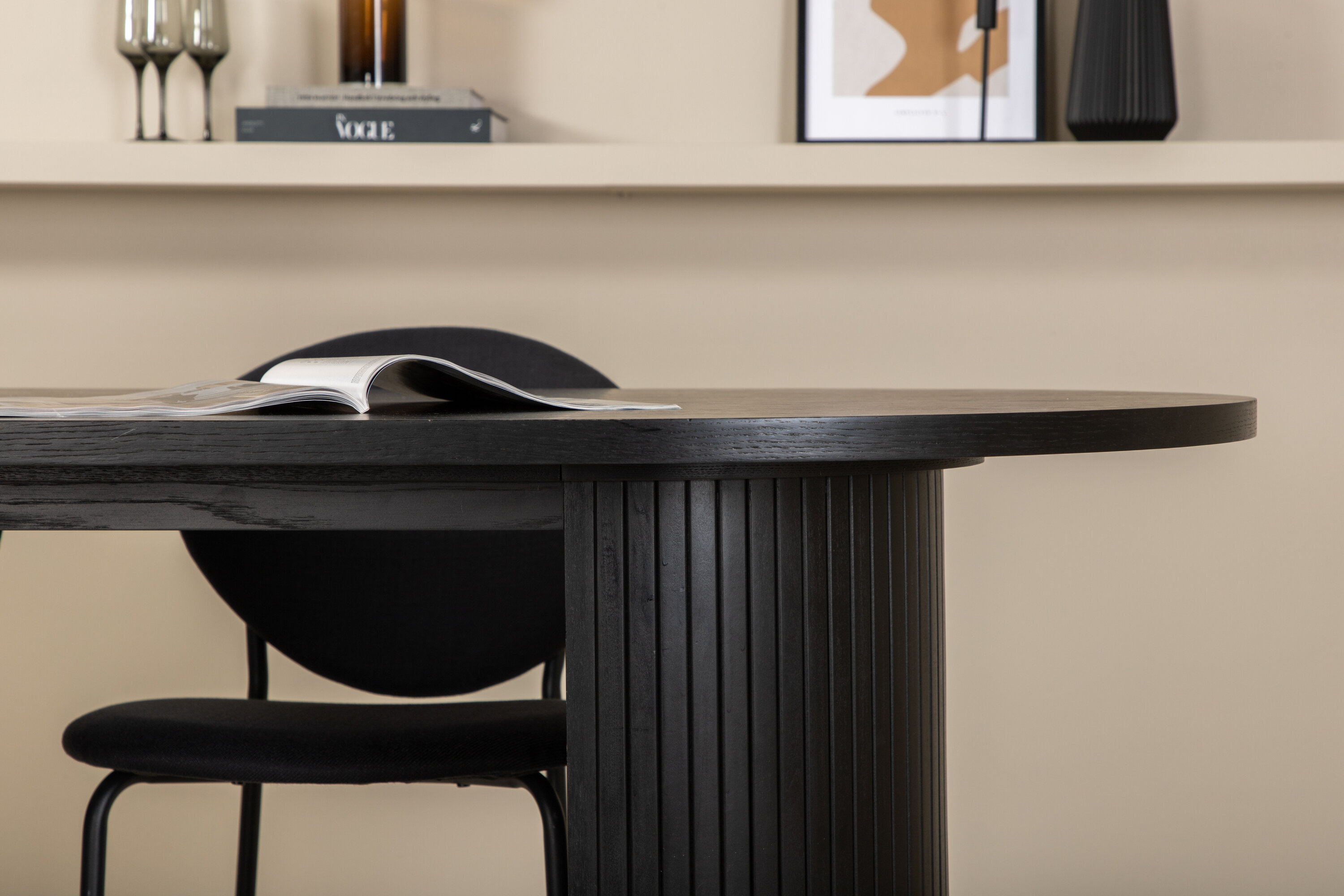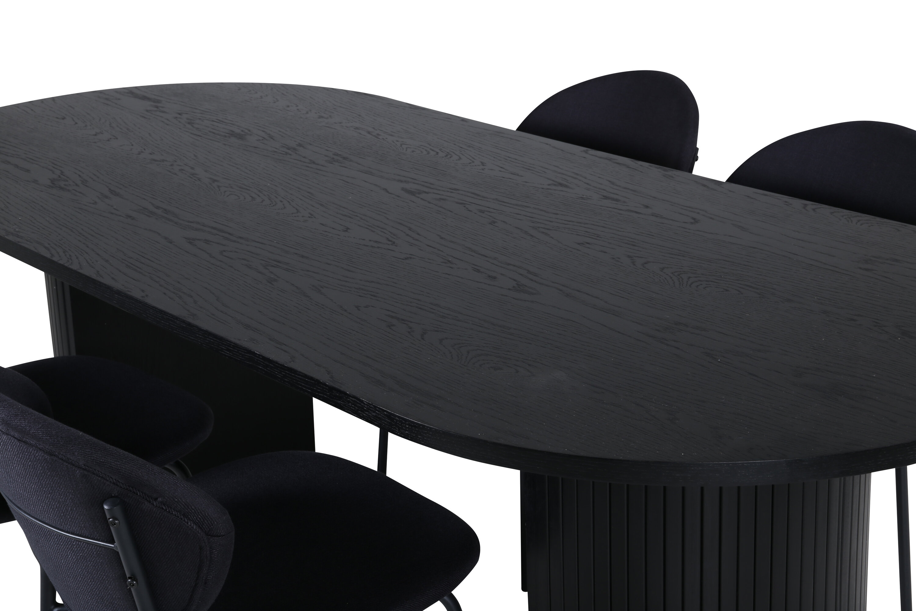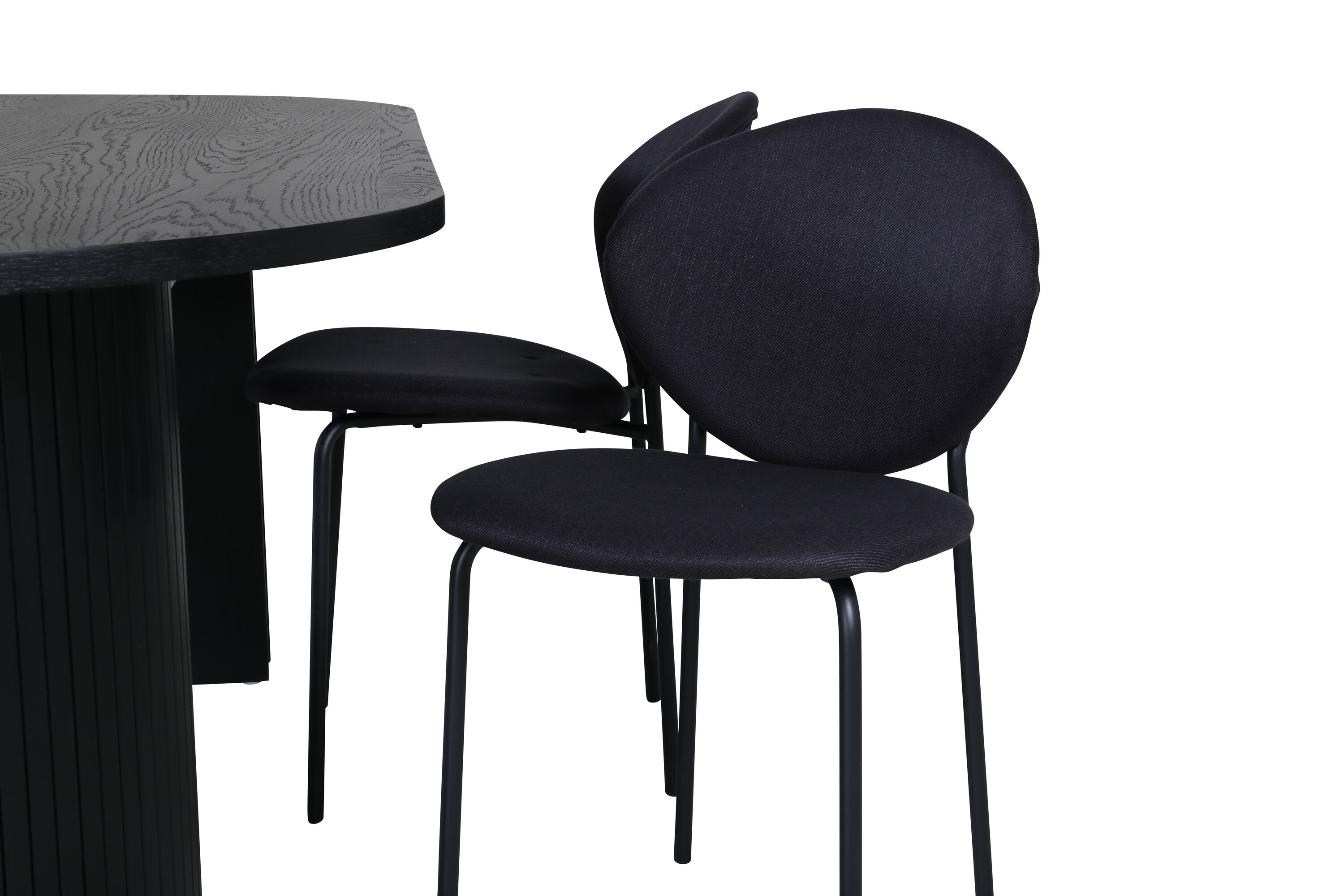 Een volledige zwarte voedselgroep raakt nooit uit de tijd! Onze ovale eettafel Bianca in consequent zwarte kleur heeft een trendy design met een MDF tafelblad en een robuust frame in geribbeld design dat een stabiele indruk geeft. Tafelafmetingen: lengte: 200 cm, breedte: 90 cm, hoogte: 75 cm. Hier gecombineerd met 4 Vault eetkamerstoelen in ovaal design. De stoelpoten zijn smal in zwart metaal en de zwarte polyester zitting. Afmetingen stoel: hoogte: 80 cm, zithoogte: 49 cm, breedte: 46 cm, diepte: 61,5 cm. Laat de tijd aan de eettafel een van de hoogtepunten van vandaag worden!