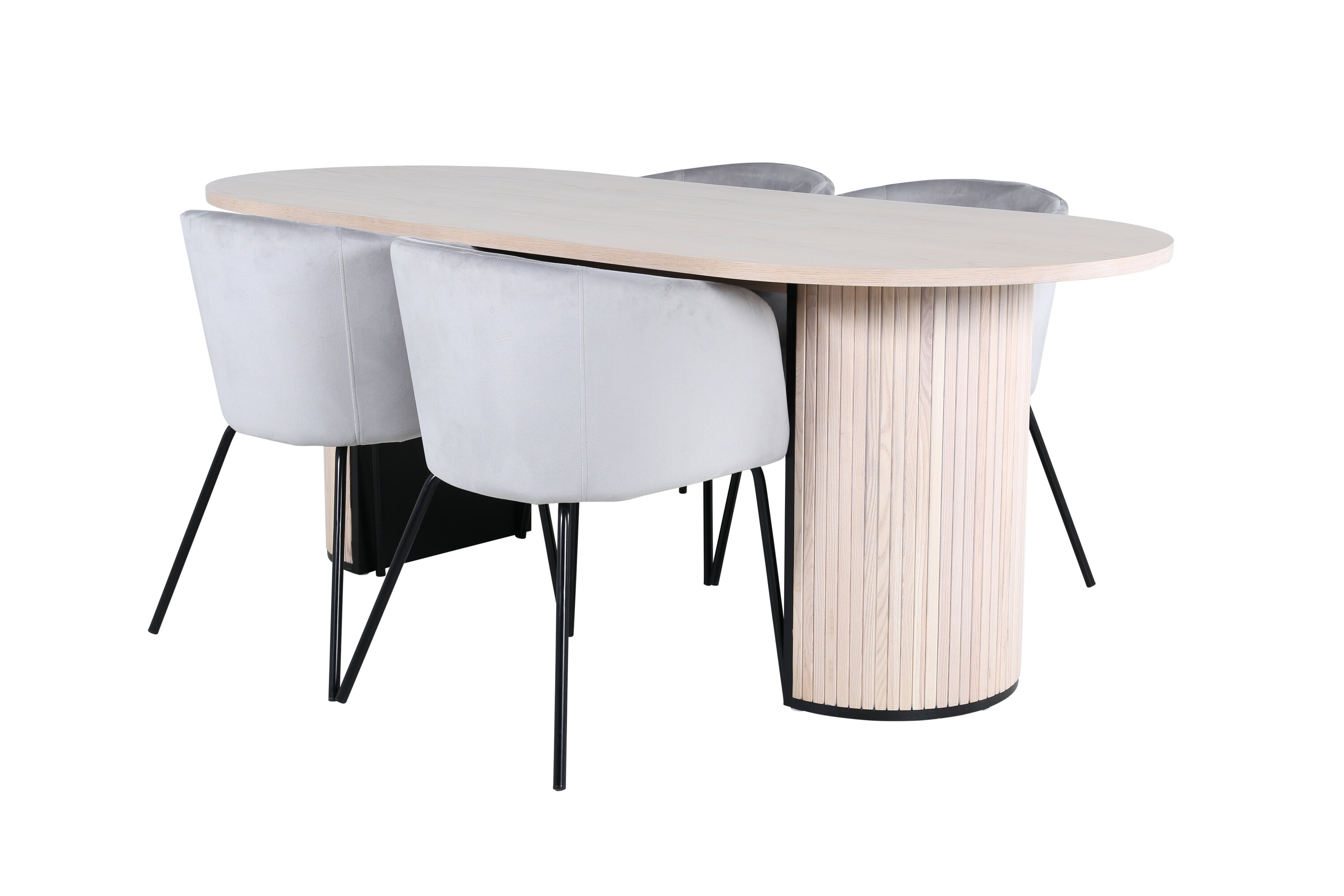 Bianca creëert een stijlvolle blikvanger die indruk maakt! Deze ovale eettafel in een gepleisterde witte kleur heeft een modern design met een tafelblad in beenwit MDF met fineer en een robuust frame in wit en zwart hout en MDF in een geribbeld design dat een stabiele indruk geeft. Tafelafmetingen: lengte: 200 cm, breedte: 90 cm, hoogte: 75 cm. Hier gecombineerd met 4 van onze stijlvolle eetkamerstoelen Berit in uitnodigend design. De stoelen richten zich op comfort met een zachte zitting in lichtgrijze fluwelen stof en stijlvolle smalle stoelpoten in zwart ijzer. Afmetingen stoel: hoogte: 78 cm, zithoogte: 49 cm, breedte: 55 cm, diepte: 55 cm