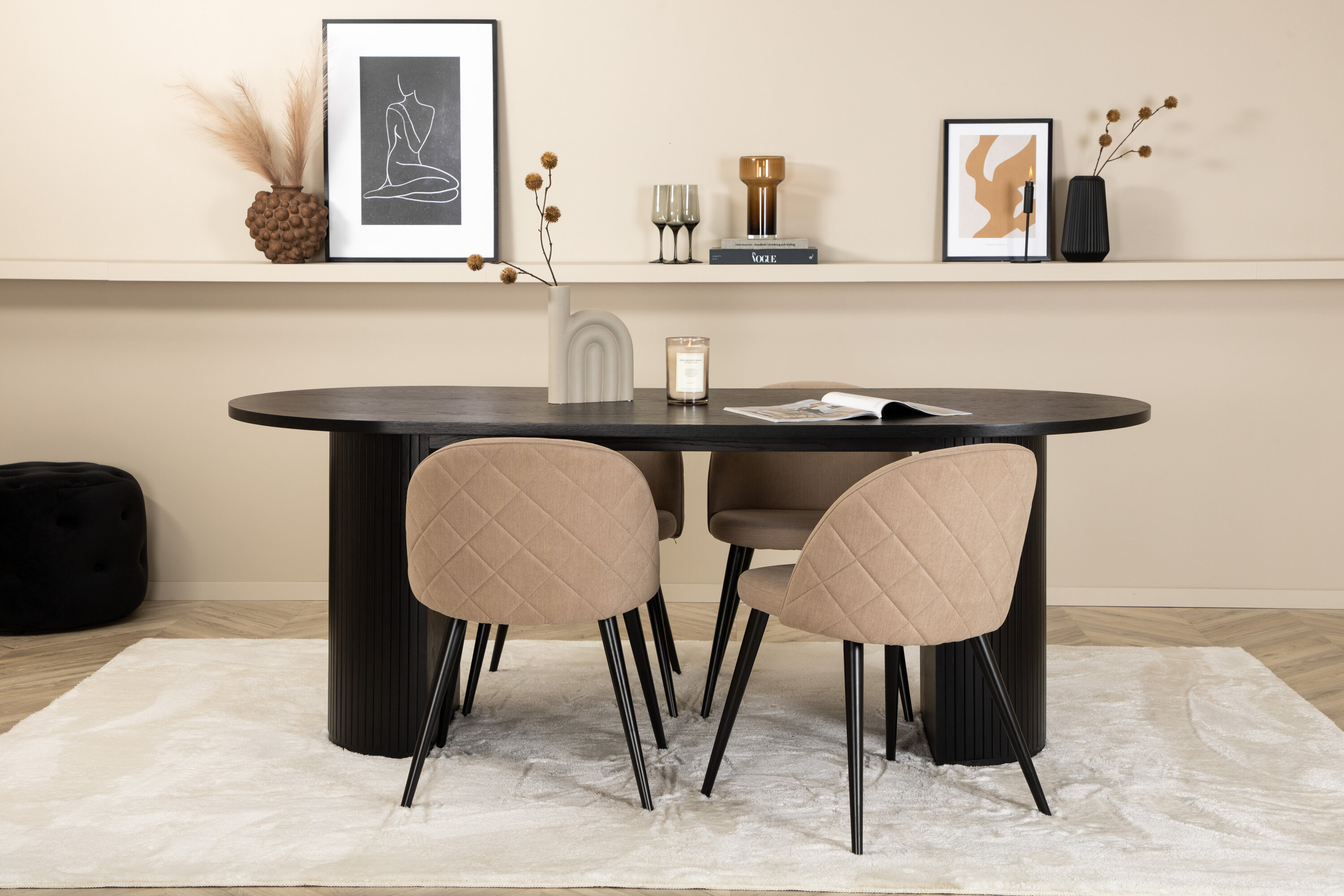 Bianca creëert een stijlvolle blikvanger die indruk maakt! Deze ovale eettafel in consequent zwarte kleur heeft een modern design met een MDF tafelblad en een robuust frame in geribbeld design dat een stabiele indruk geeft. Tafelafmetingen: lengte: 200 cm, breedte: 90 cm, hoogte: 75 cm. Matched with 4 Velvet dining chairs with decorative stitch in the beige seat of polyester linen and flared chair legs in iron. Afmetingen stoel: hoogte: 76,5 cm, zithoogte: 46,5 cm, breedte: 50 cm, diepte: 57 cm. Het hoge zitcomfort van de stoelen nodigt je uit voor lange en prachtige momenten om te socializen!