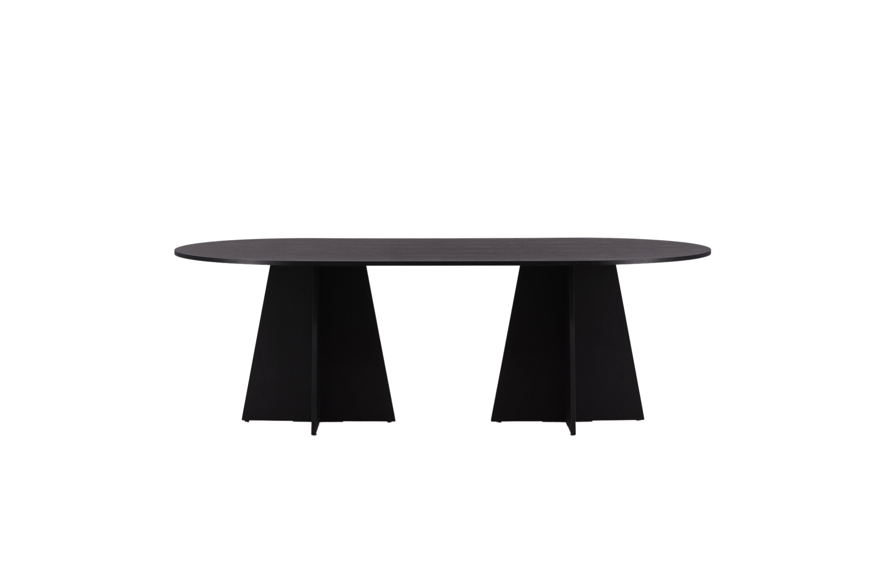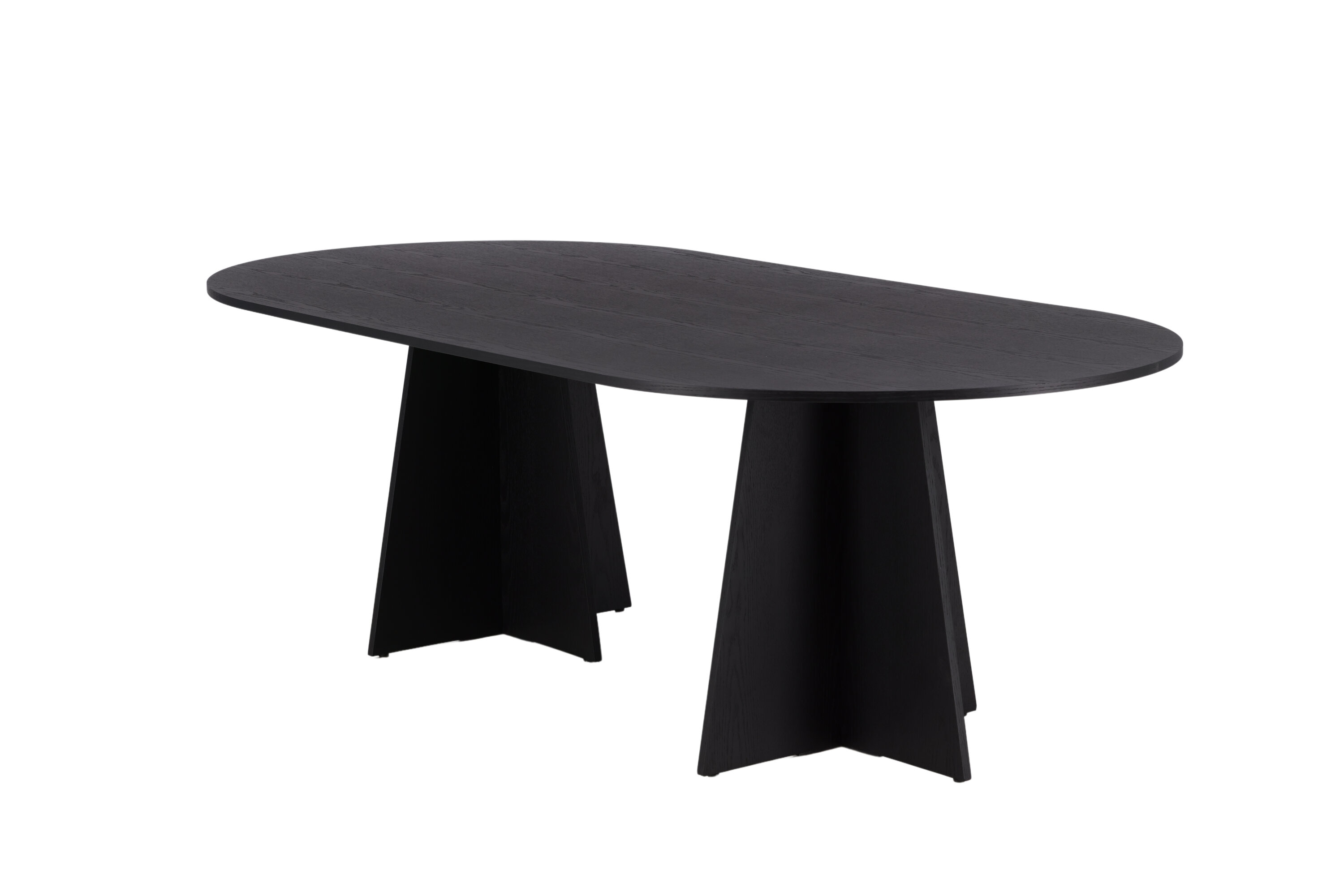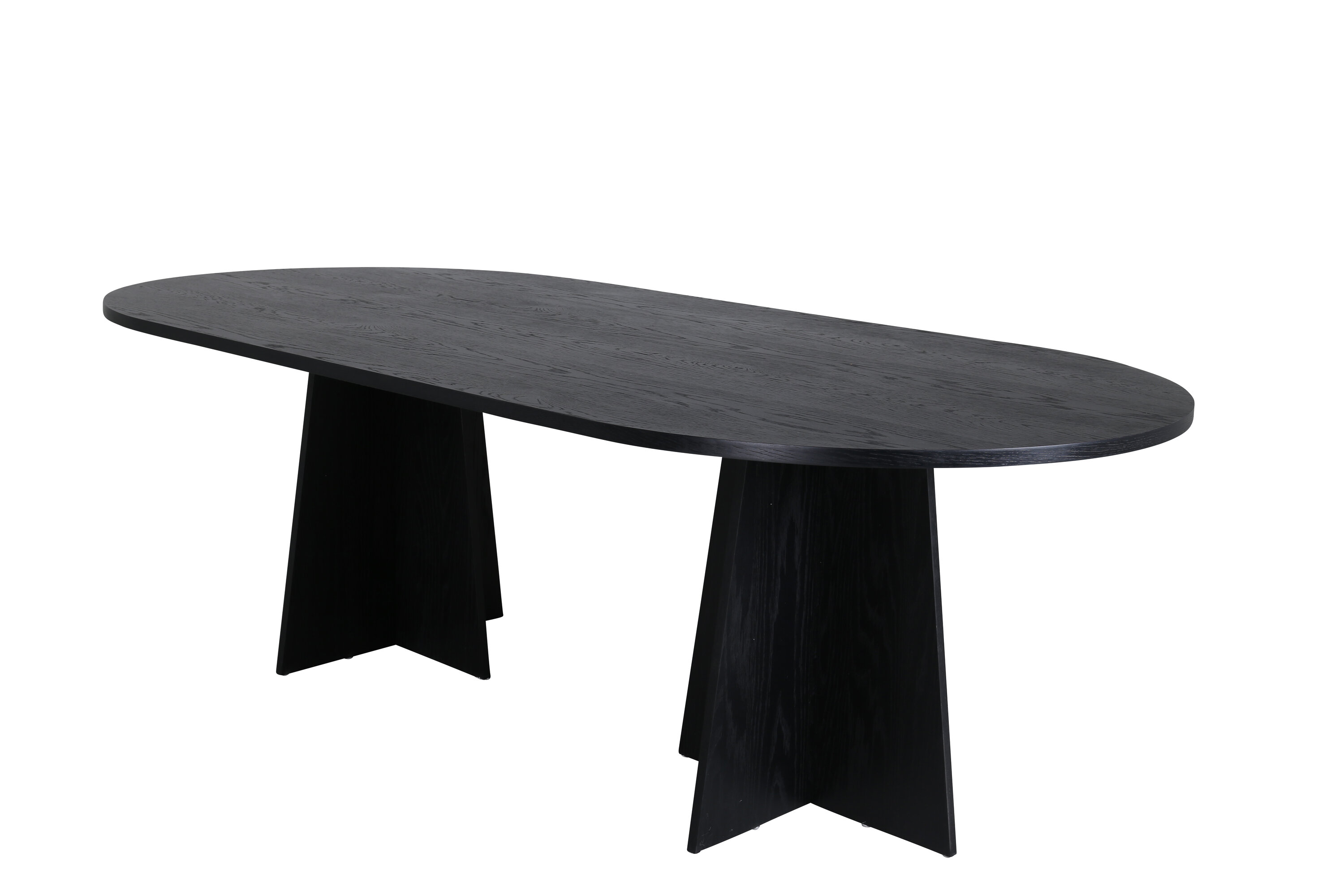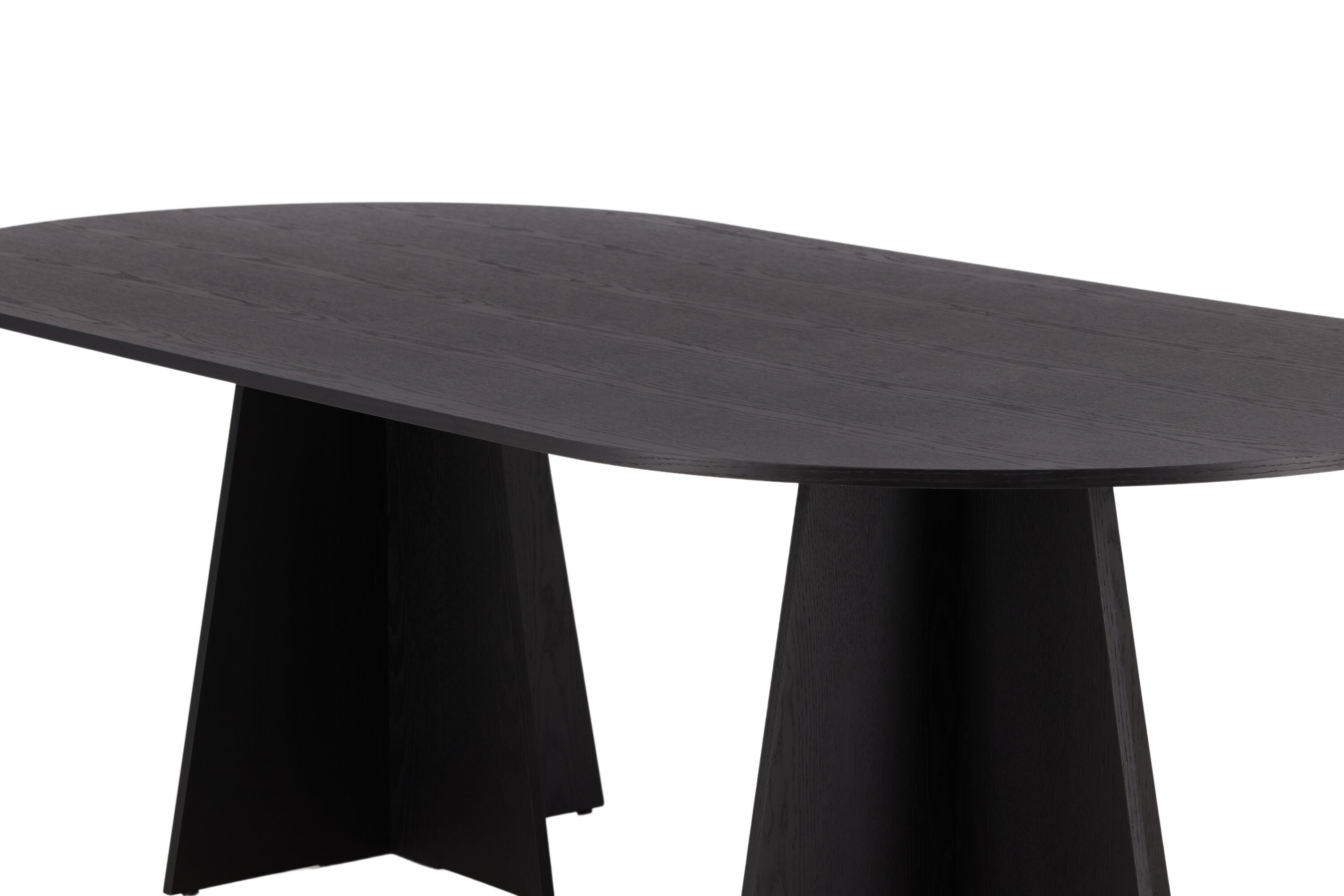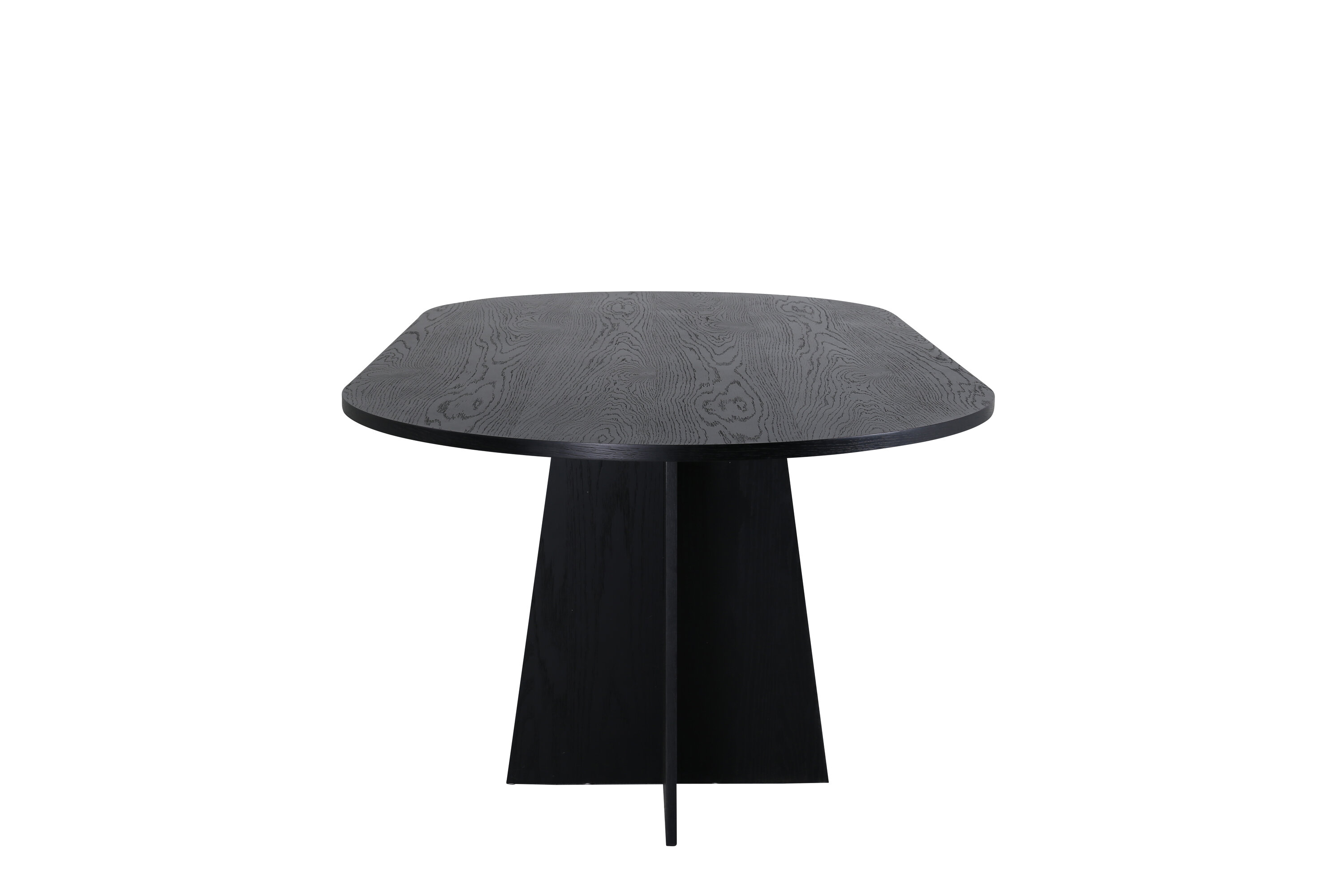 Richt de woning in met een eettafel die indruk maakt! Bootcut heeft een uniek design met een ovaal tafelblad in zwart MDF met fineer en een eigenaardig frame met twee kegelvormige poten in open design. Het dunne tafelblad zorgt voor een minimalistische indruk en vormt een smaakvol contrast met het robuustere frame. Combineer met een paar comfortabele eetkamerstoelen en je krijgt een complete voedselgroep die na verloop van tijd blijft staan!