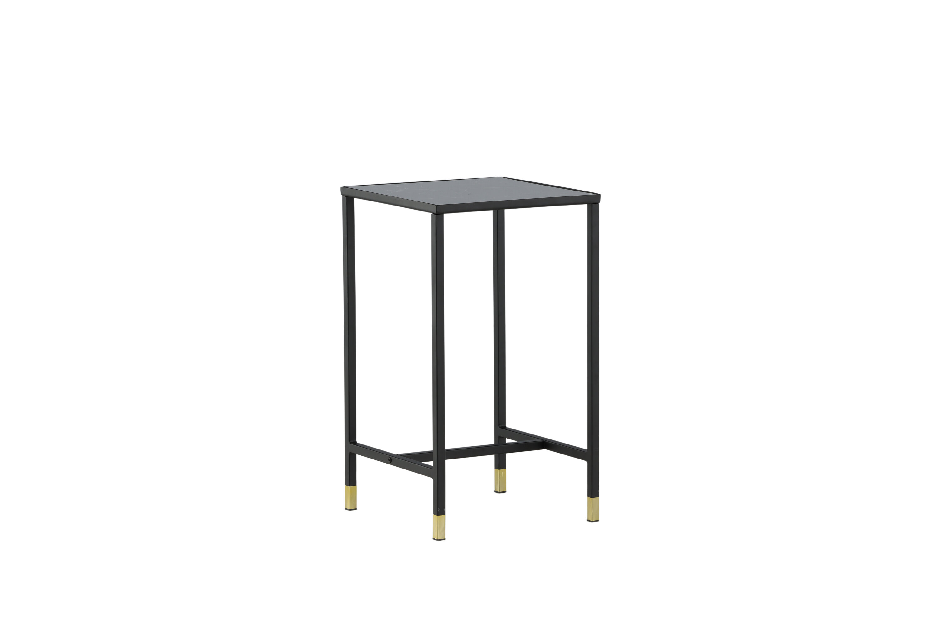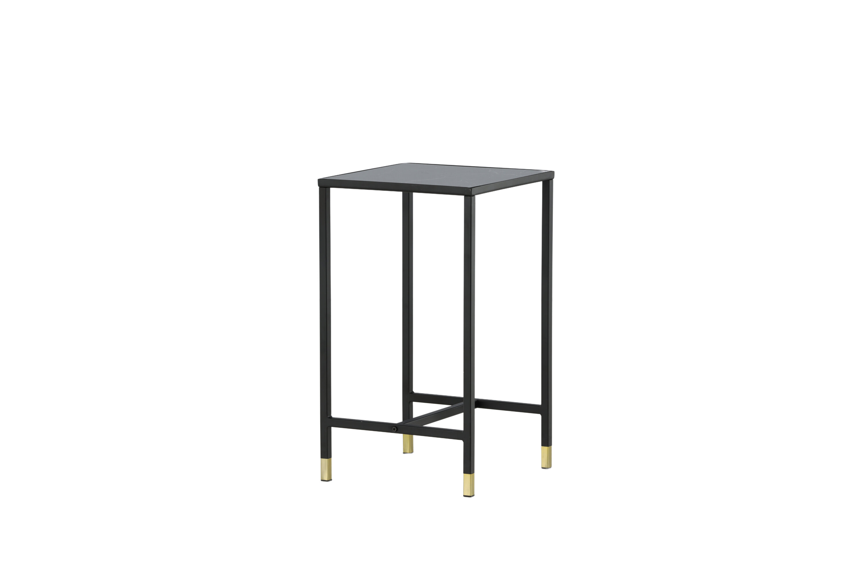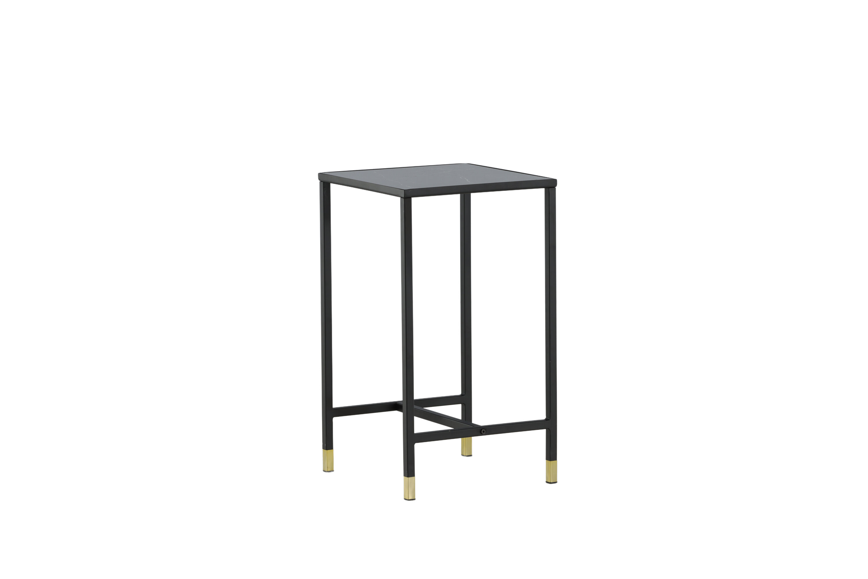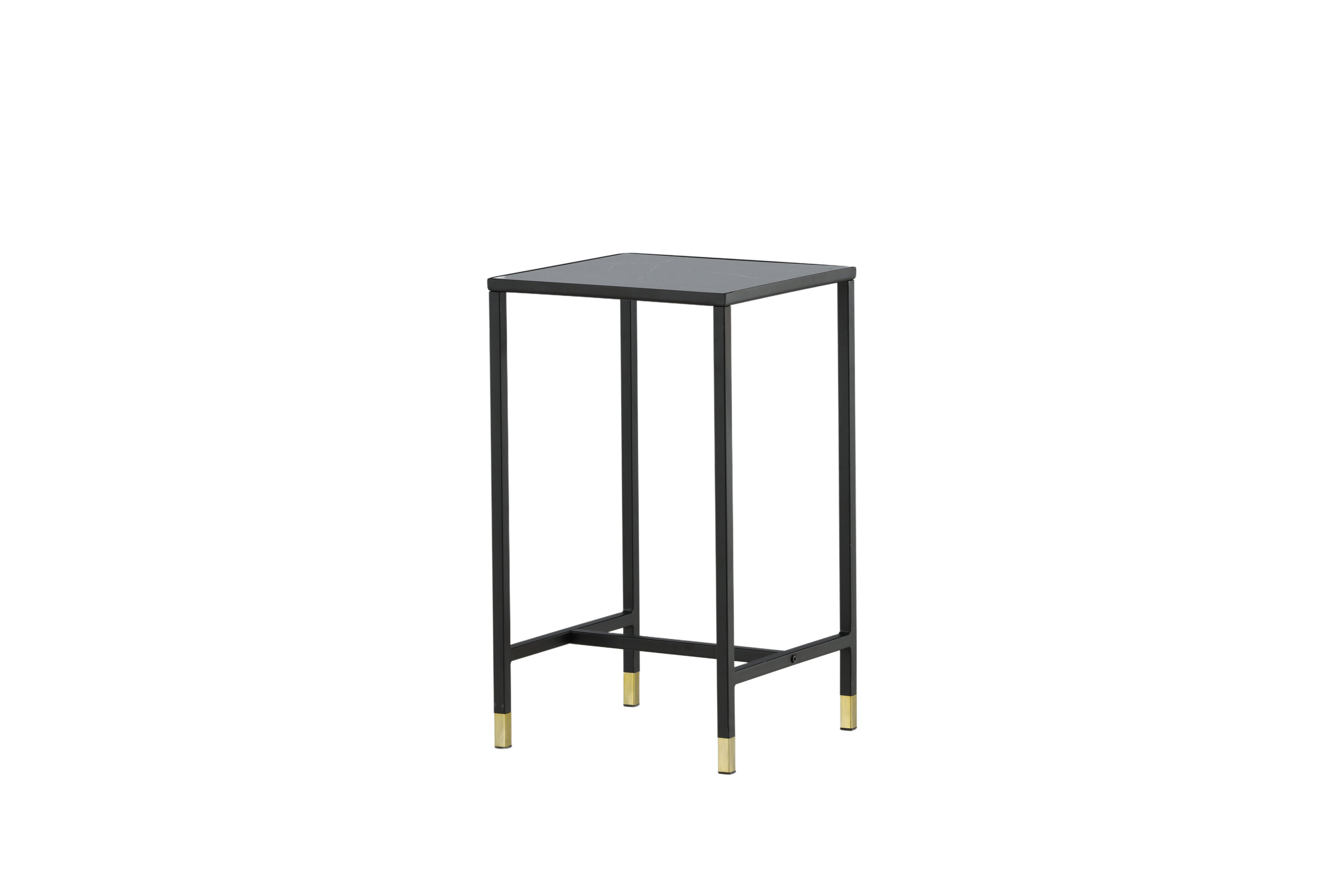 Het zwarte hoge stalen frame zorgt niet alleen voor stabiliteit, maar zorgt ook voor een opvallend contrast tegen de gespikkelde zwarte marmer-look op het vierkante tafelblad. Bovendien wordt er een vleugje exclusiviteit aan de tafel toegevoegd door de vergulde metalen uiteinden.