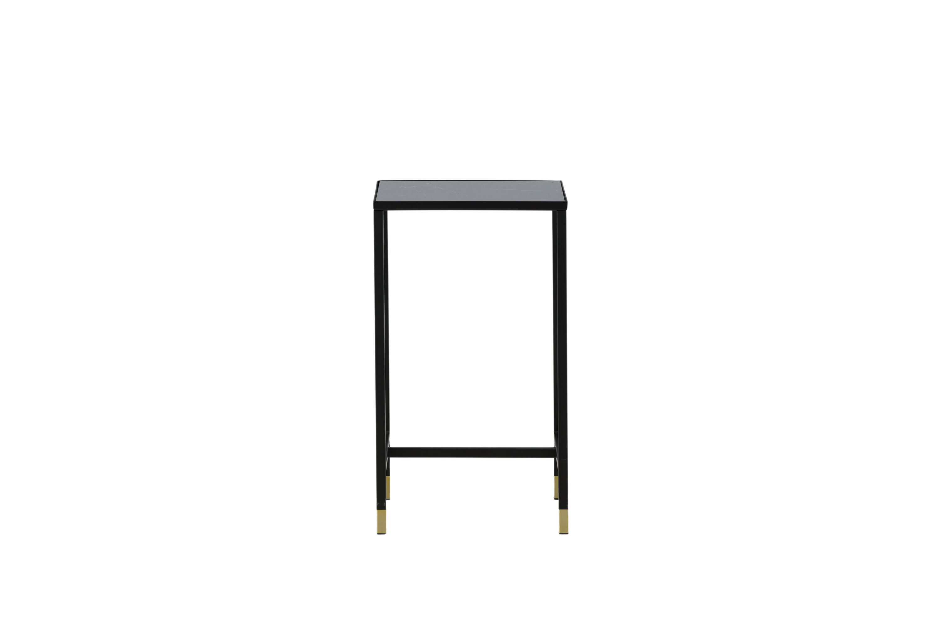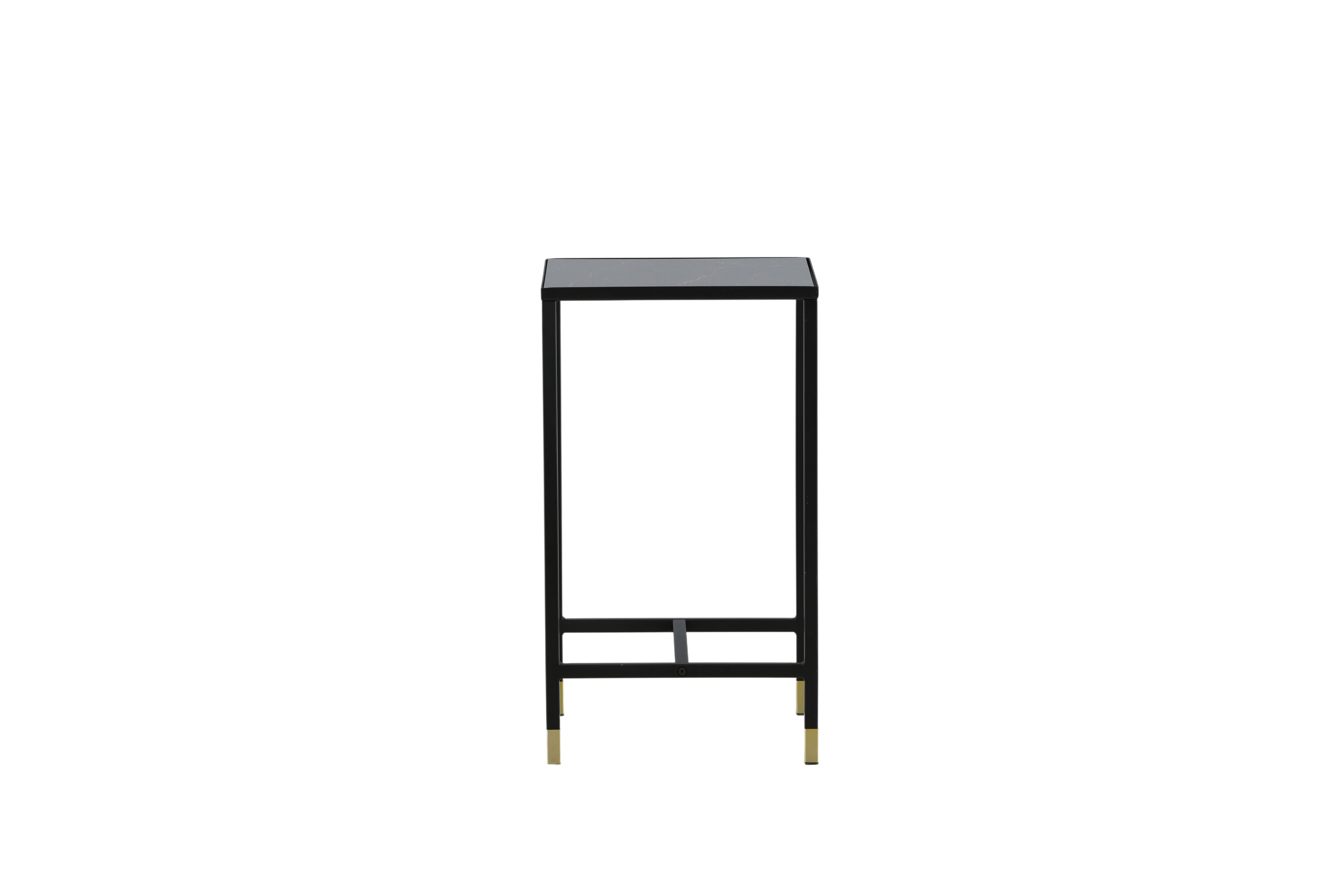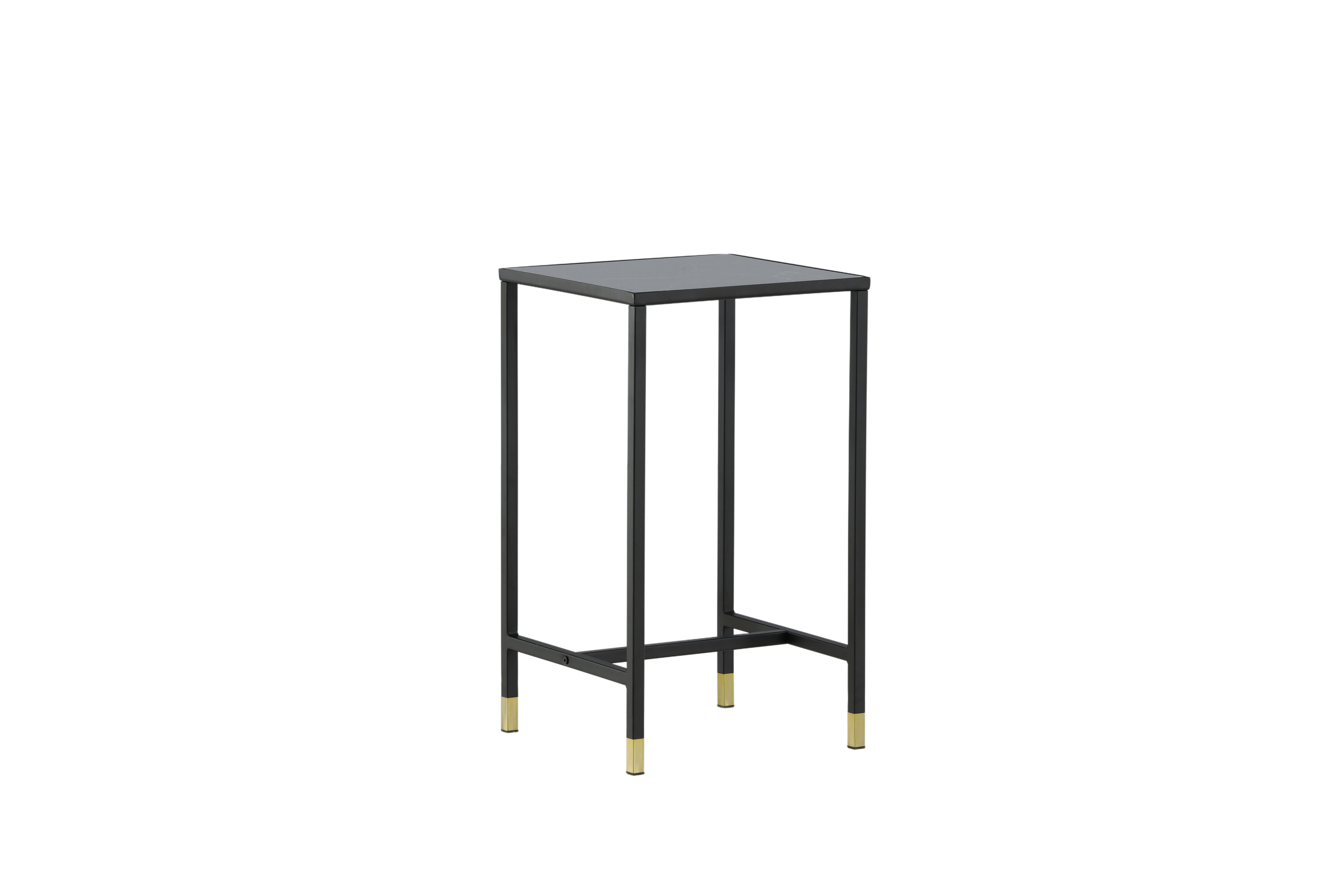 Het zwarte hoge stalen frame zorgt niet alleen voor stabiliteit, maar zorgt ook voor een opvallend contrast tegen de gespikkelde zwarte marmer-look op het vierkante tafelblad. Bovendien wordt er een vleugje exclusiviteit aan de tafel toegevoegd door de vergulde metalen uiteinden.