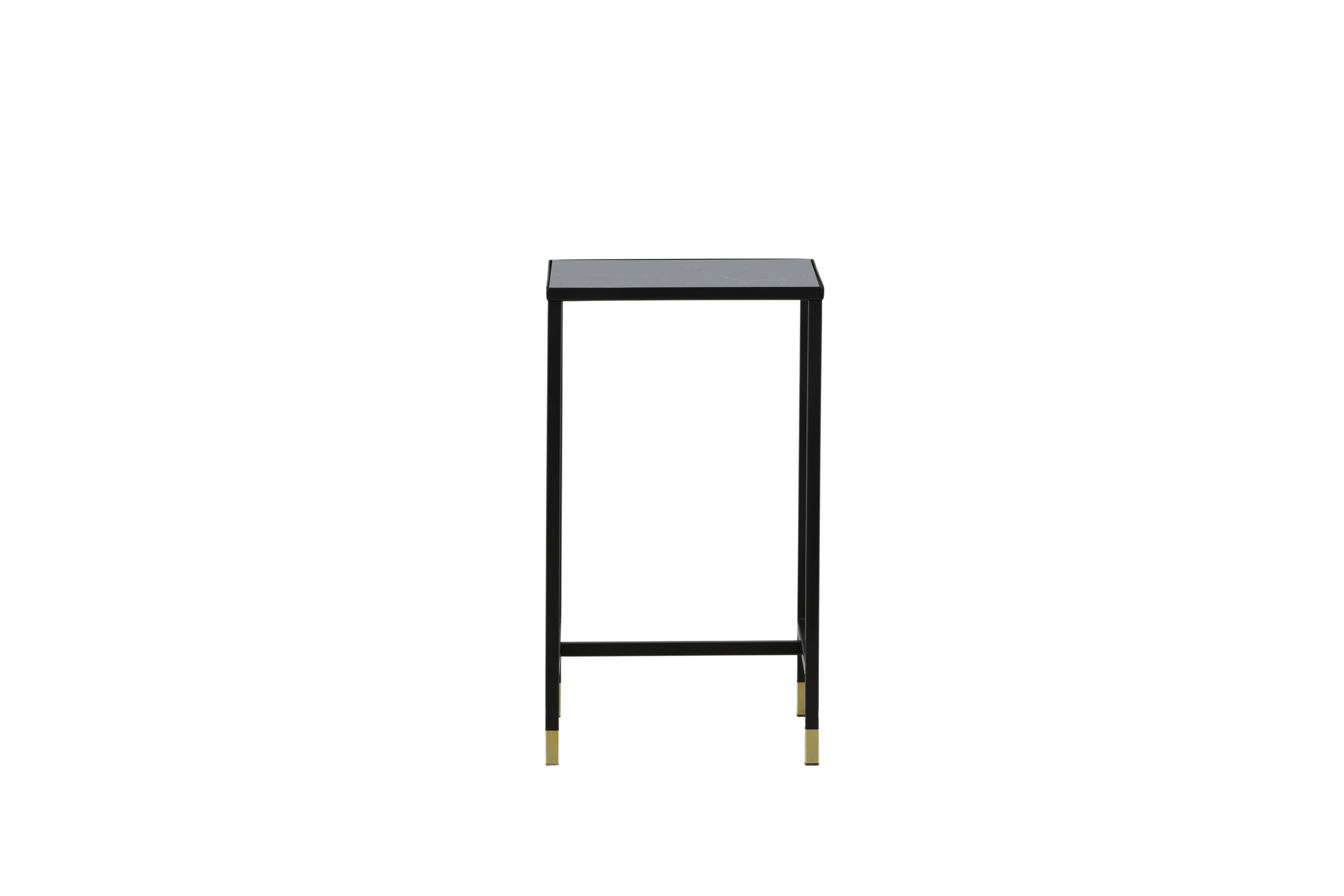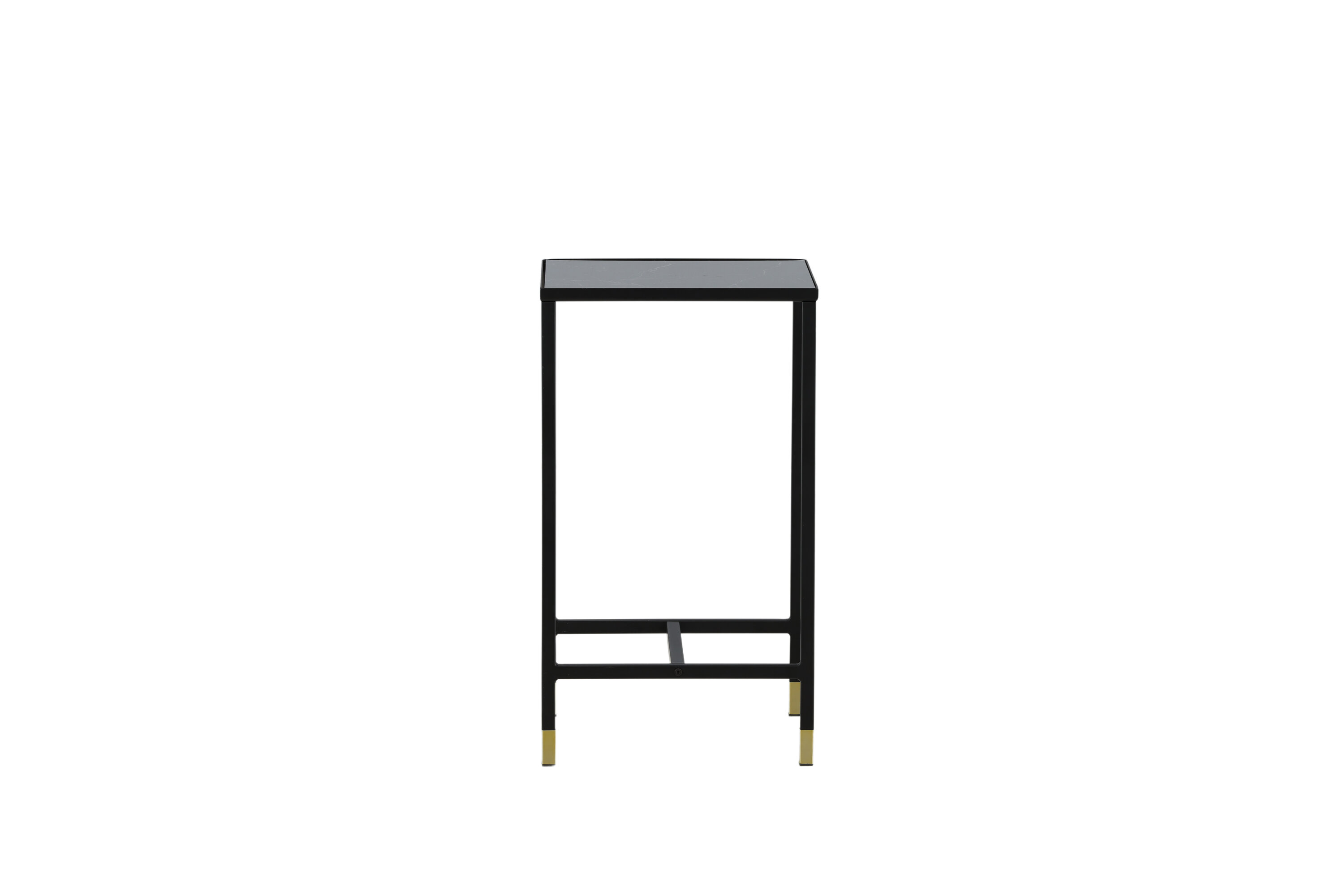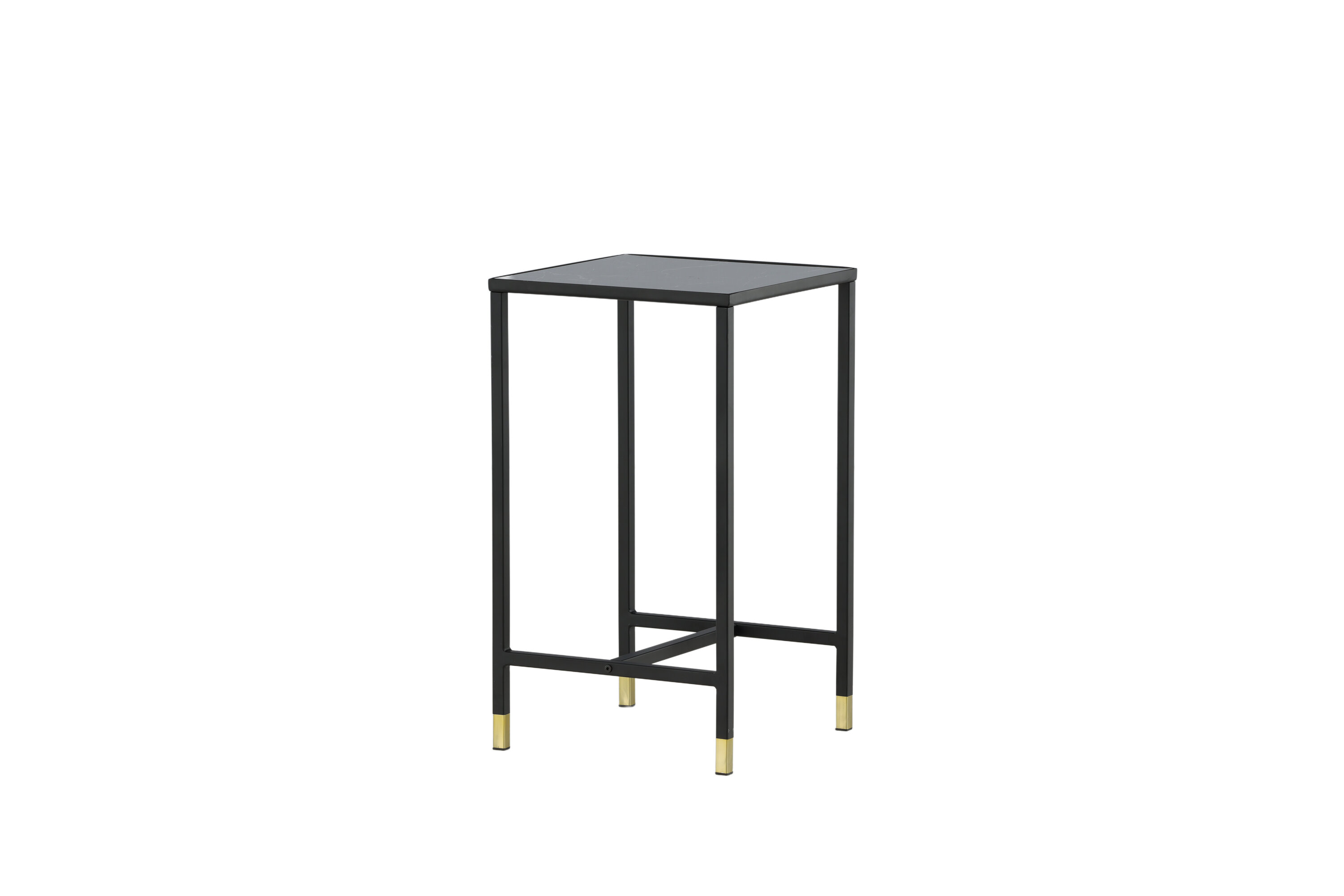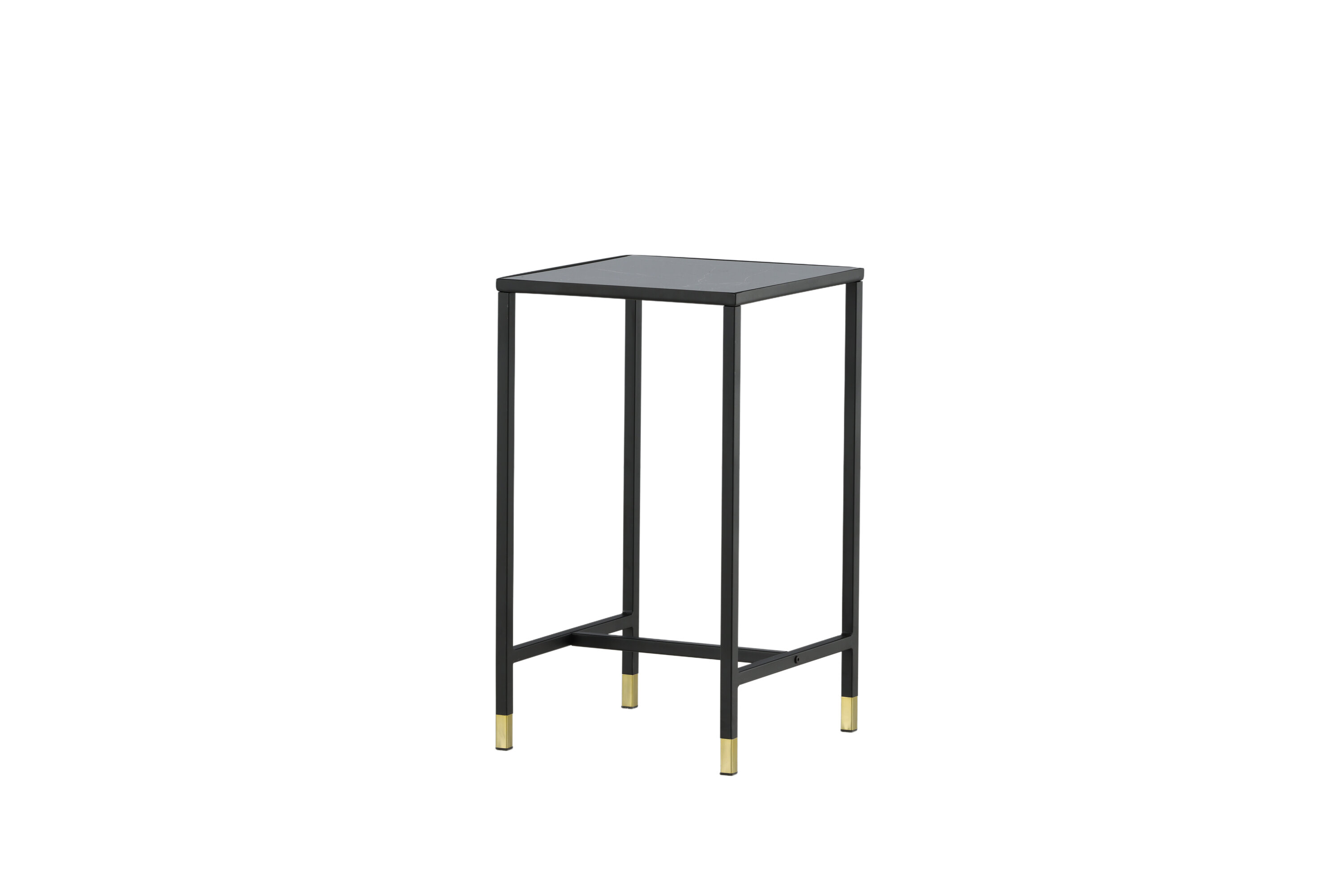 Het zwarte hoge stalen frame zorgt niet alleen voor stabiliteit, maar zorgt ook voor een opvallend contrast tegen de gespikkelde zwarte marmer-look op het vierkante tafelblad. Bovendien wordt er een vleugje exclusiviteit aan de tafel toegevoegd door de vergulde metalen uiteinden.