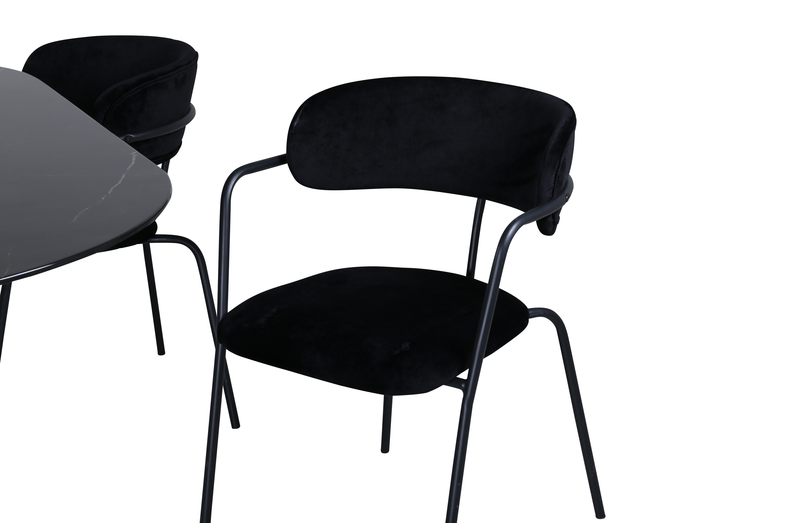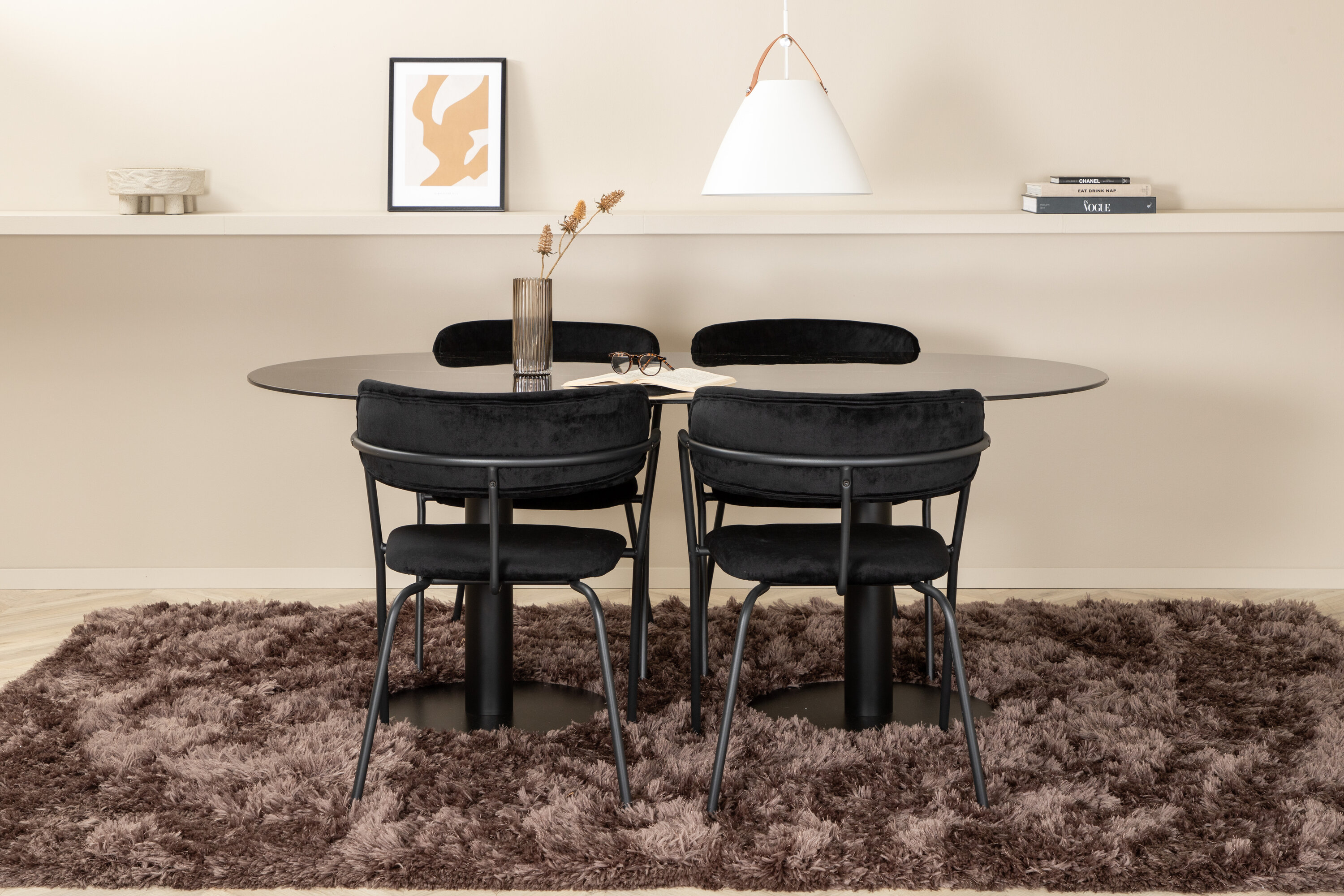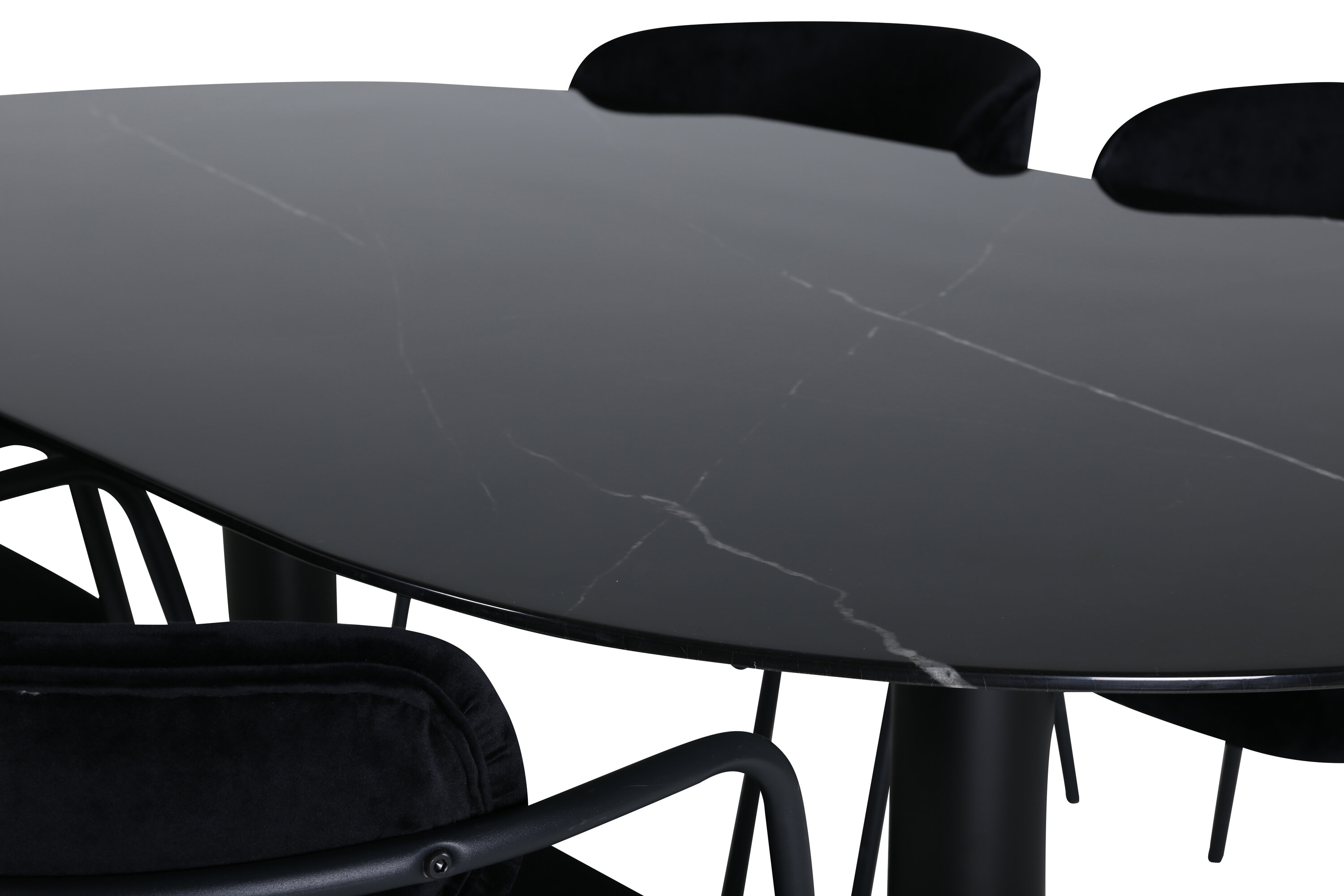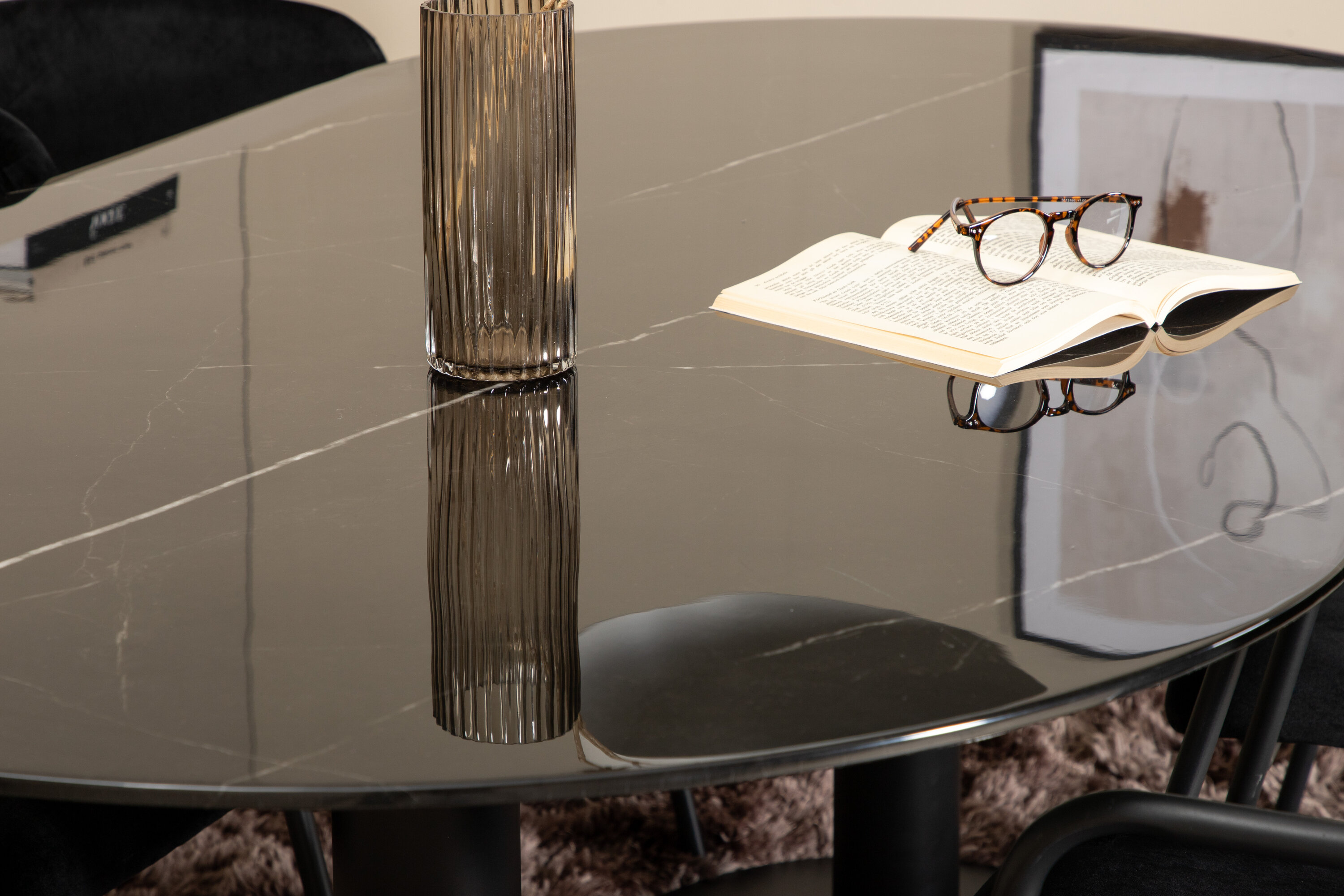 Stijlvol, luxe en uitnodigend - eettafel Pillan zorgt voor een modebewuste indruk en aangename sfeer in huis! Het ovale ontwerp en het algehele ontwerp zijn goed doordacht met een dunne bovenplaat in zwart marmerglas en twee stabiele tafelpoten in zwart metaal. Tafelafmetingen: lengte: 180 cm, breedte: 100 cm, hoogte: 74 cm. Hier samen met 4 Arrow eetkamerstoelen met stoelpoten en geïntegreerde armleuningen in metaal en stoelen in zwart fluwelen stof. Afmetingen stoel: hoogte: 79 cm, zithoogte: 47 cm, breedte: 58 cm, diepte: 61 cm. Meubelen voor een gouden randje in het dagelijks leven - het moet fijn voelen om thuis te komen!
