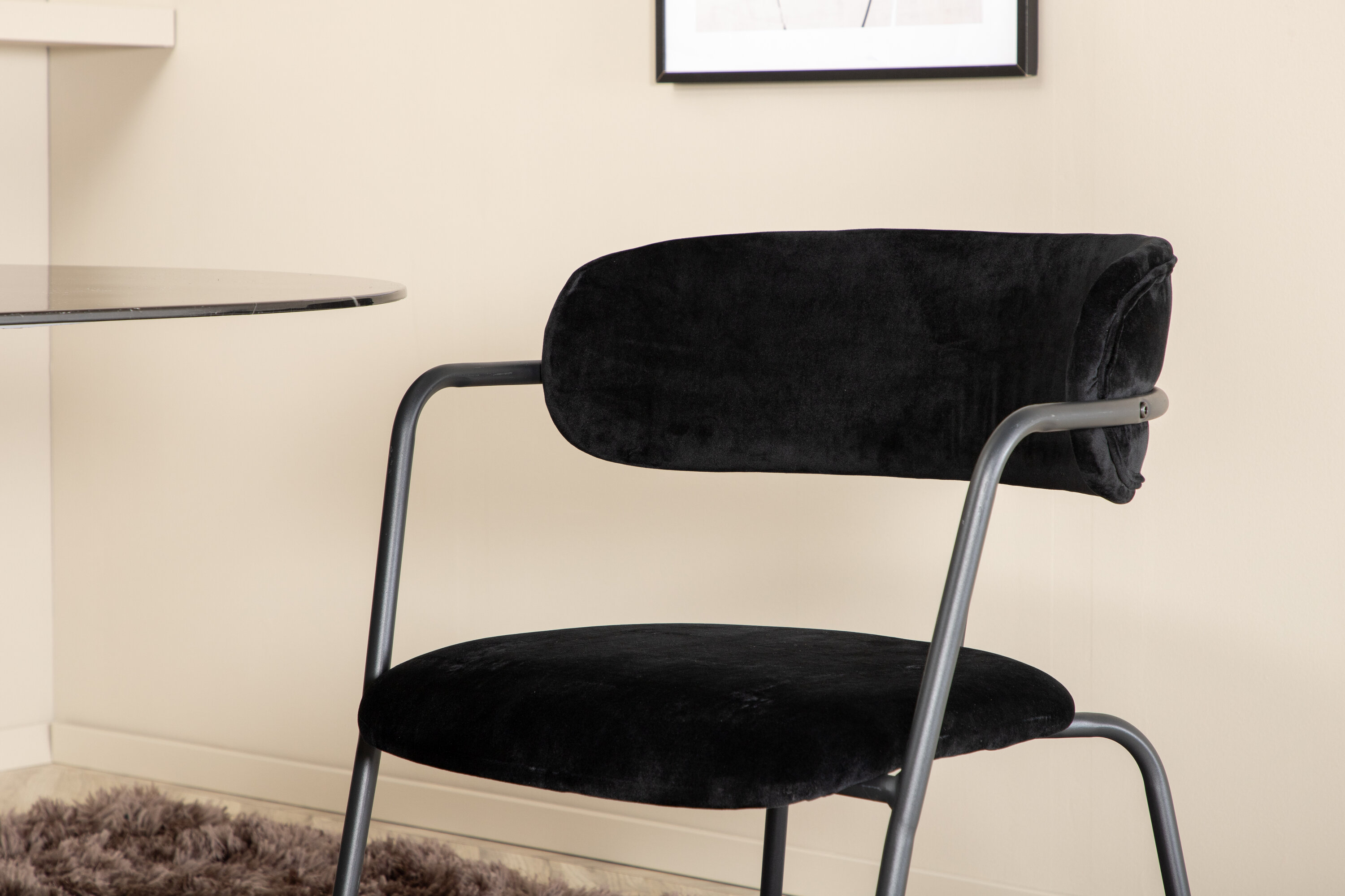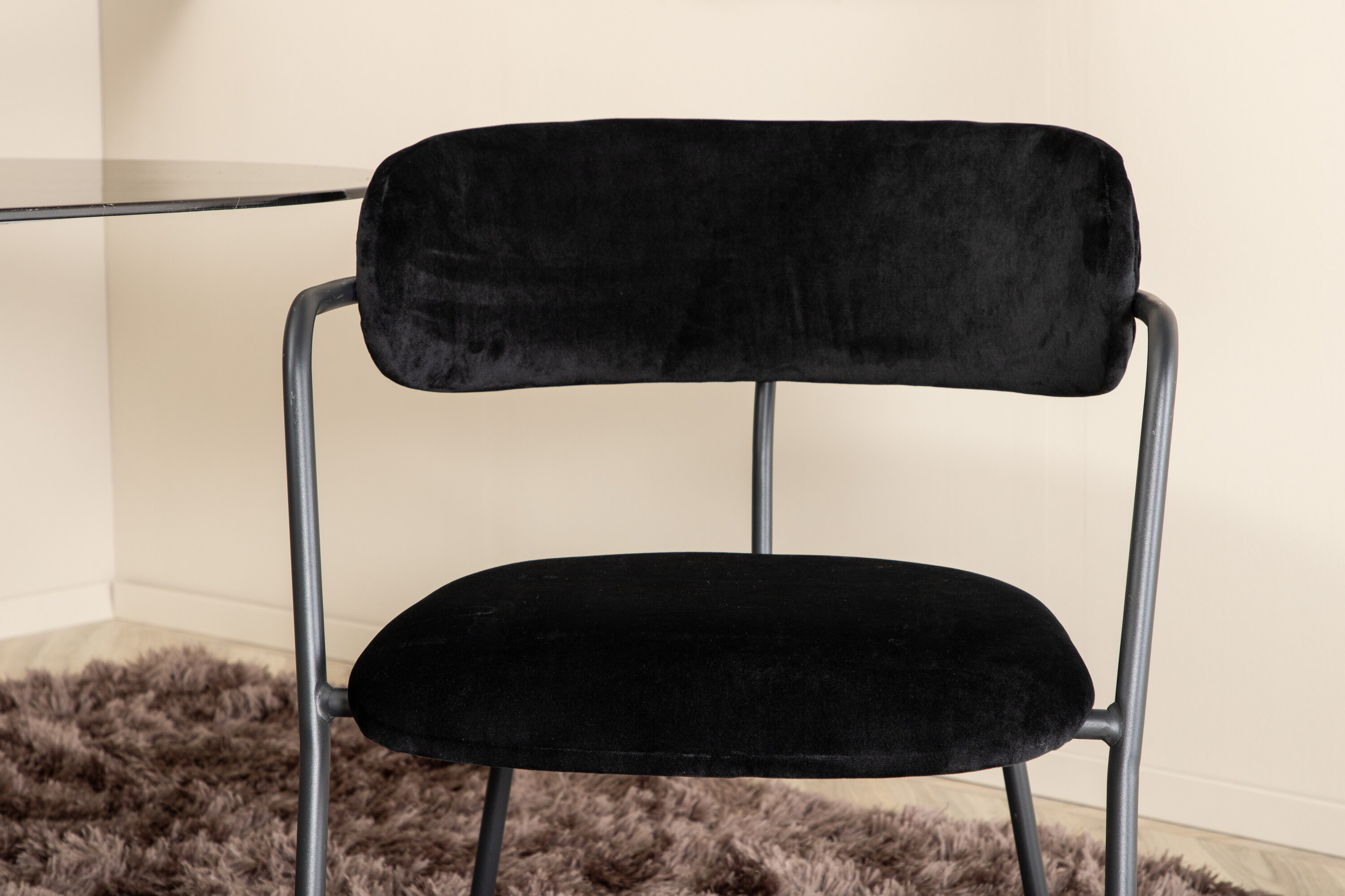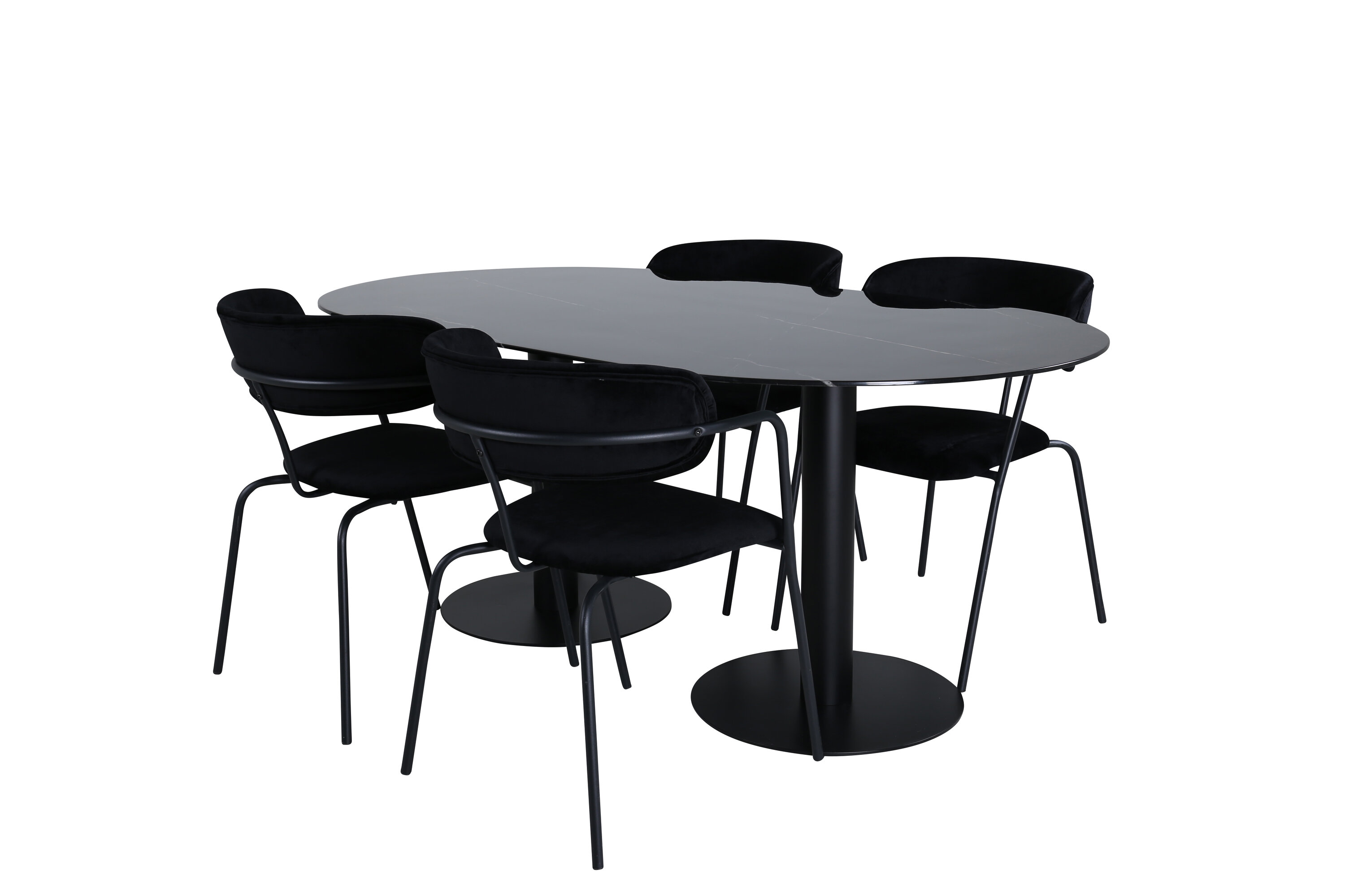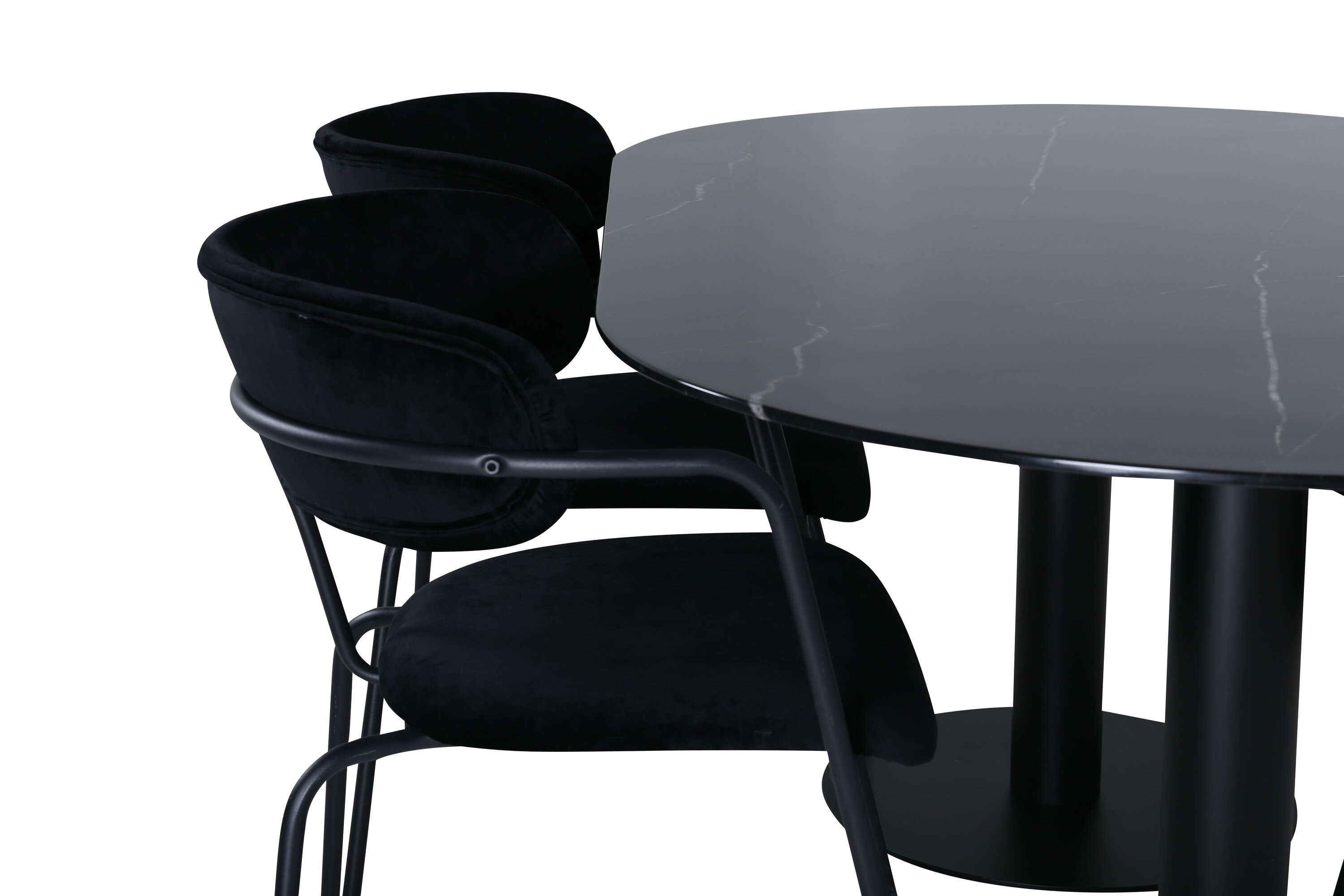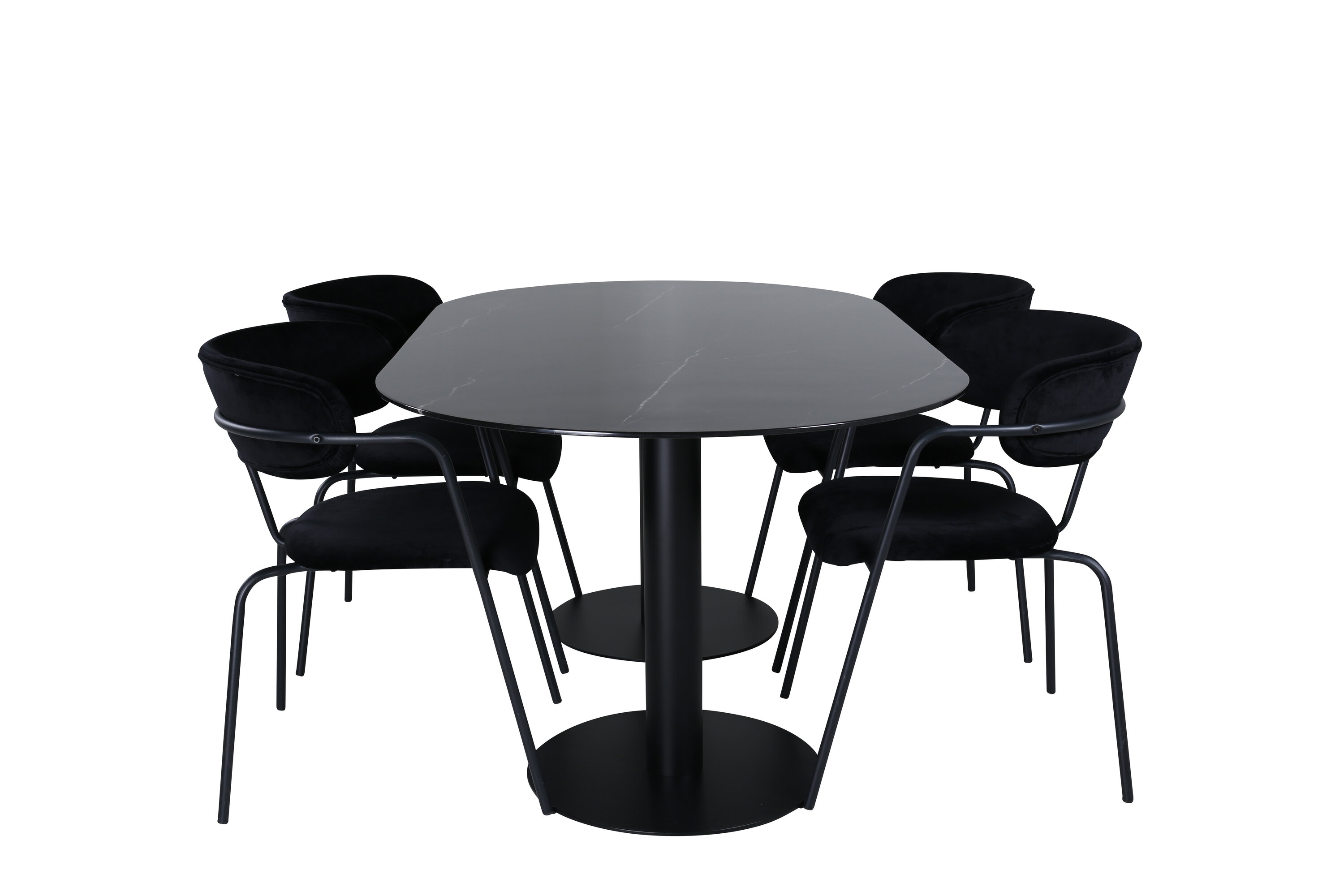 Stijlvol, luxe en uitnodigend - eettafel Pillan zorgt voor een modebewuste indruk en aangename sfeer in huis! Het ovale ontwerp en het algehele ontwerp zijn goed doordacht met een dunne bovenplaat in zwart marmerglas en twee stabiele tafelpoten in zwart metaal. Tafelafmetingen: lengte: 180 cm, breedte: 100 cm, hoogte: 74 cm. Hier samen met 4 Arrow eetkamerstoelen met stoelpoten en geïntegreerde armleuningen in metaal en stoelen in zwart fluwelen stof. Afmetingen stoel: hoogte: 79 cm, zithoogte: 47 cm, breedte: 58 cm, diepte: 61 cm. Meubelen voor een gouden randje in het dagelijks leven - het moet fijn voelen om thuis te komen!