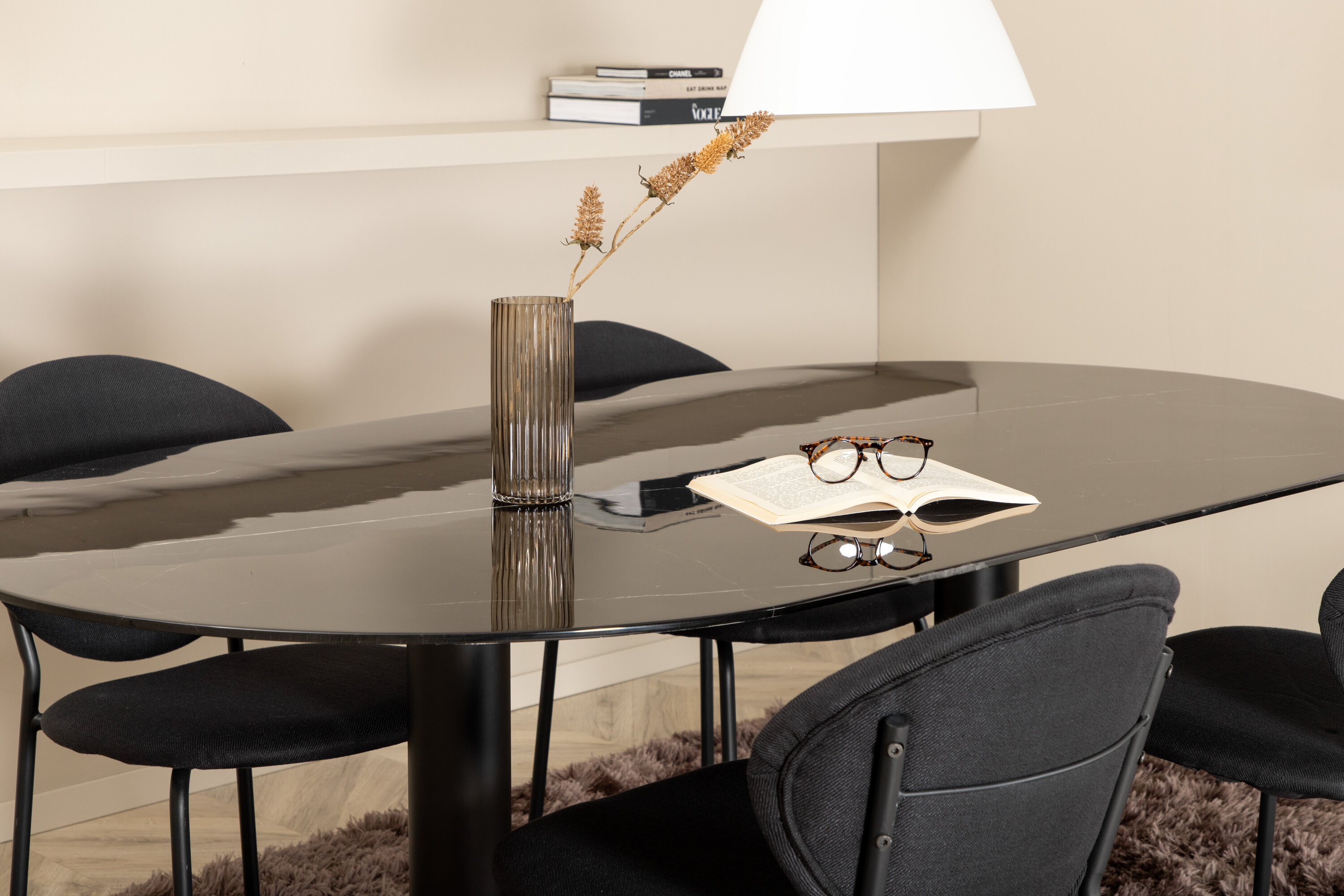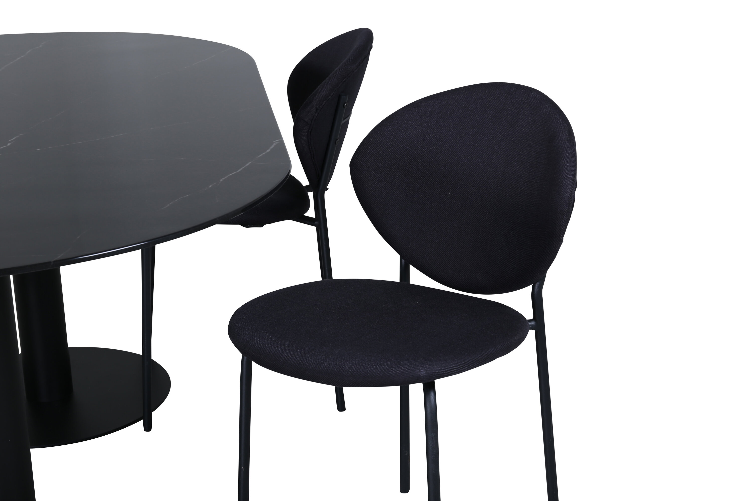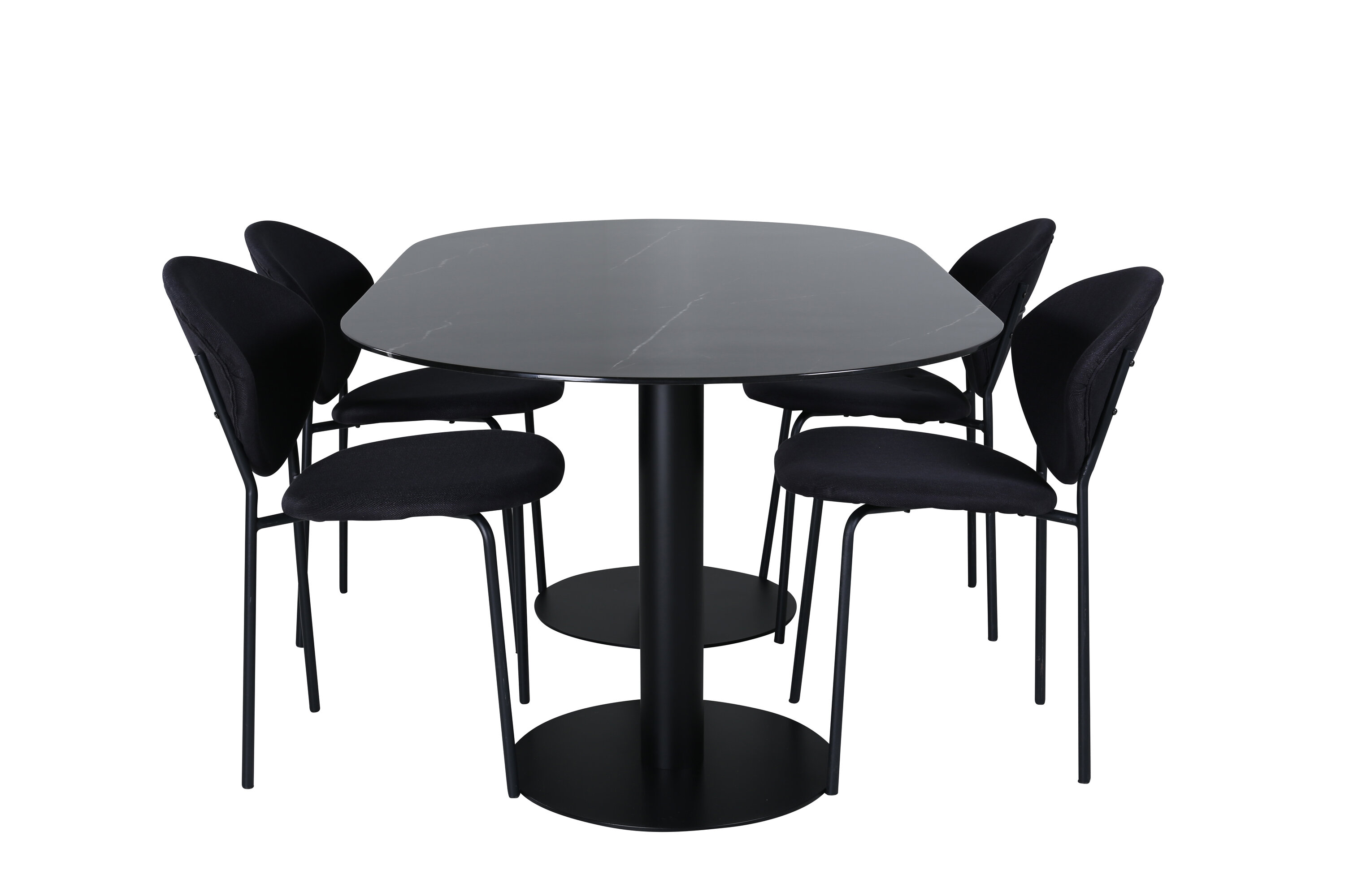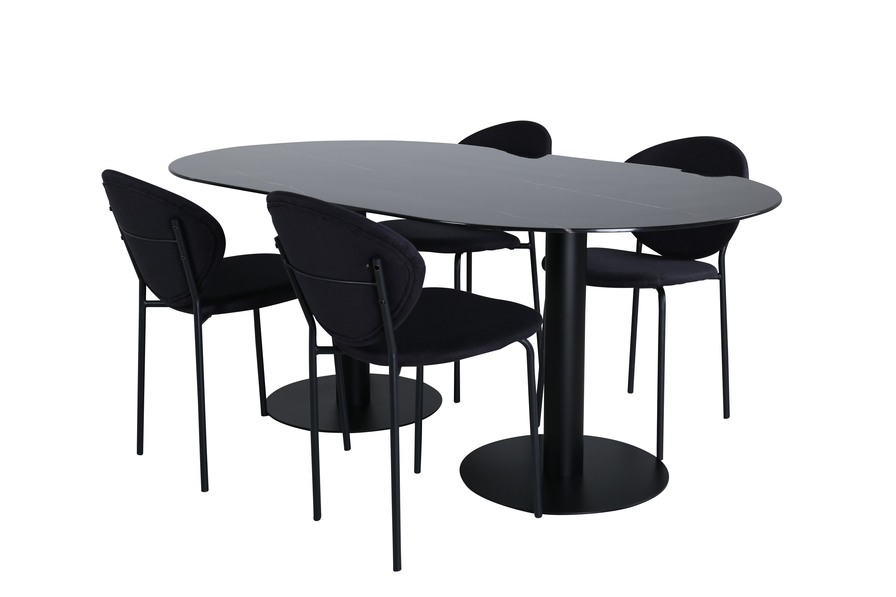 Eettafel Pillan zorgt voor een modebewuste indruk en aangename sfeer in huis! Het ovale ontwerp en het algehele ontwerp zijn goed doordacht met een dunne bovenplaat in zwart marmerglas en twee stabiele tafelpoten in zwart metaal. Tafelafmetingen: lengte: 180 cm, breedte: 100 cm, hoogte: 74 cm. Hier gecombineerd met 4 Vault eetkamerstoelen met zwarte botten in metaal en zwarte stoelen in polyester. Afmetingen stoel: hoogte: 80 cm, zithoogte: 49 cm, breedte: 46 cm, diepte: 61,5 cm. Laat de tijd aan de eettafel een van de hoogtepunten van vandaag worden!