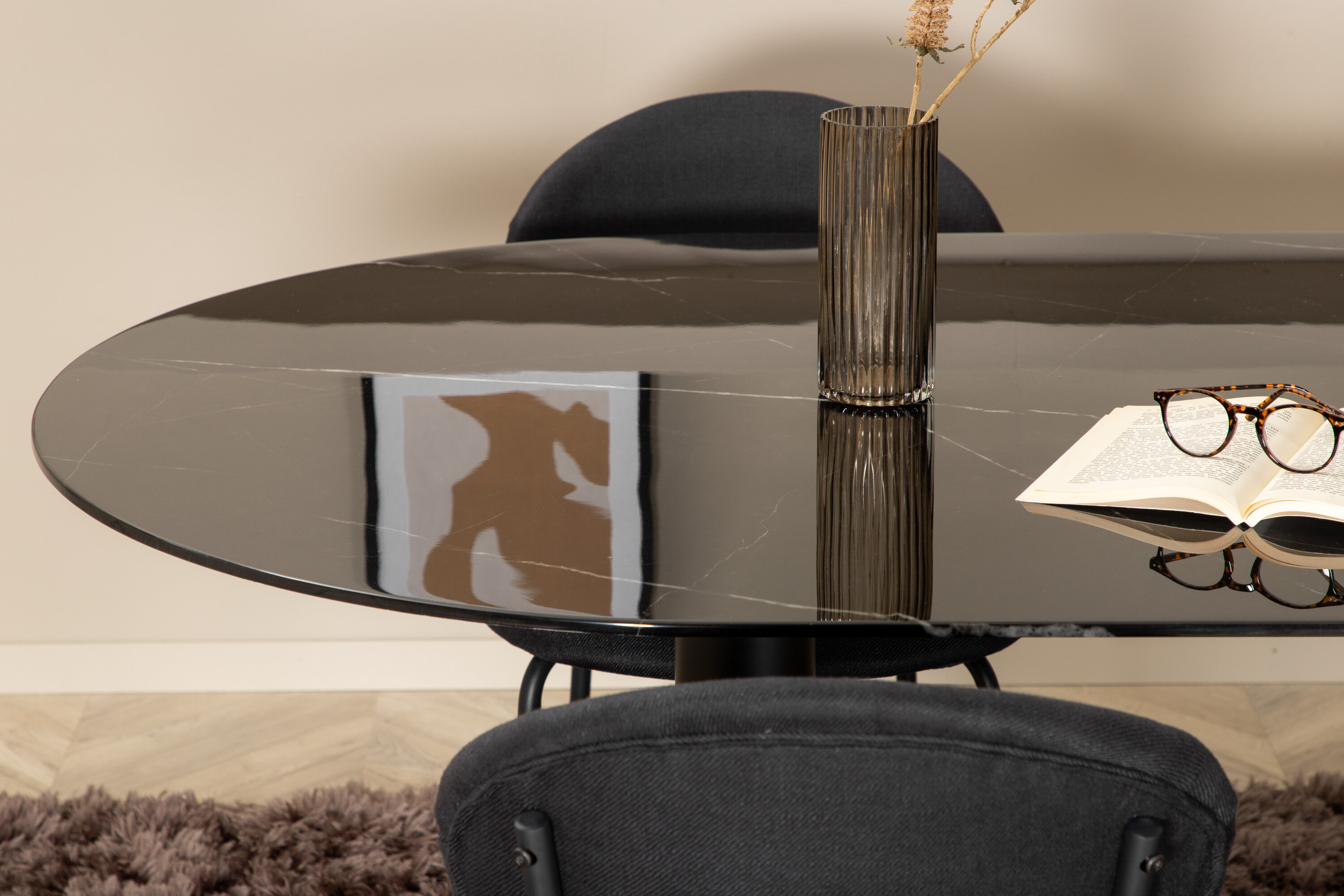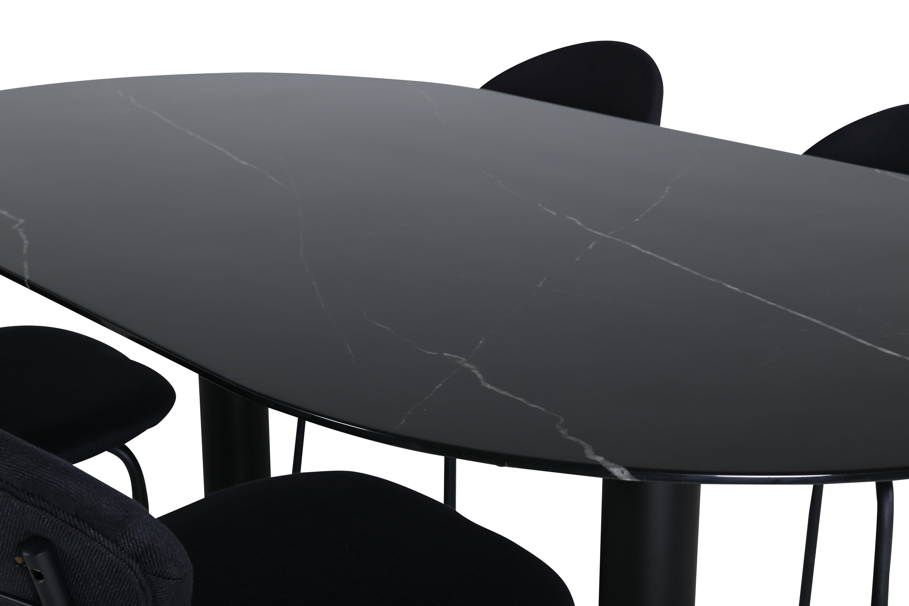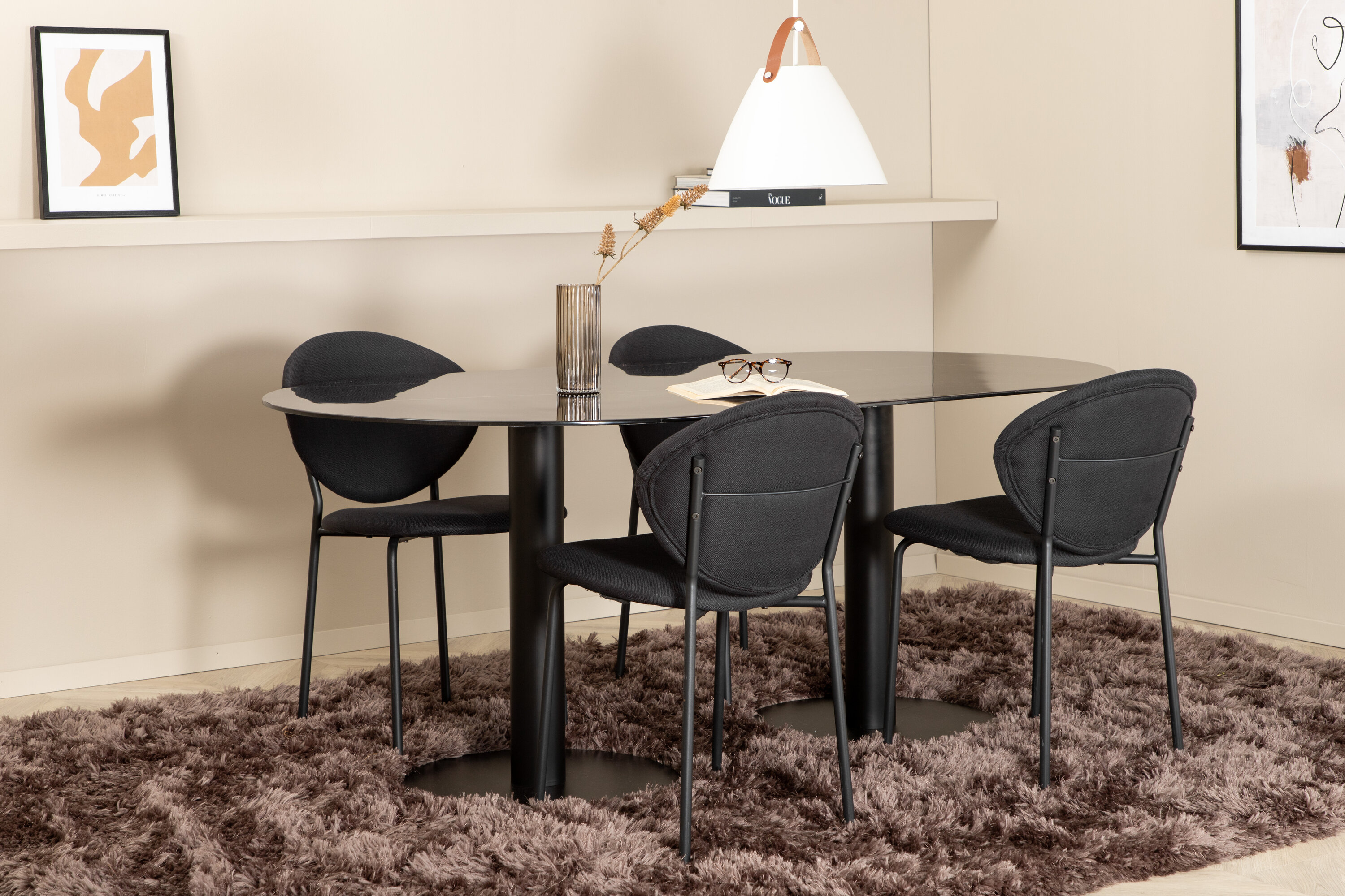 Eettafel Pillan zorgt voor een modebewuste indruk en aangename sfeer in huis! Het ovale ontwerp en het algehele ontwerp zijn goed doordacht met een dunne bovenplaat in zwart marmerglas en twee stabiele tafelpoten in zwart metaal. Tafelafmetingen: lengte: 180 cm, breedte: 100 cm, hoogte: 74 cm. Hier gecombineerd met 4 Vault eetkamerstoelen met zwarte botten in metaal en zwarte stoelen in polyester. Afmetingen stoel: hoogte: 80 cm, zithoogte: 49 cm, breedte: 46 cm, diepte: 61,5 cm. Laat de tijd aan de eettafel een van de hoogtepunten van vandaag worden!
