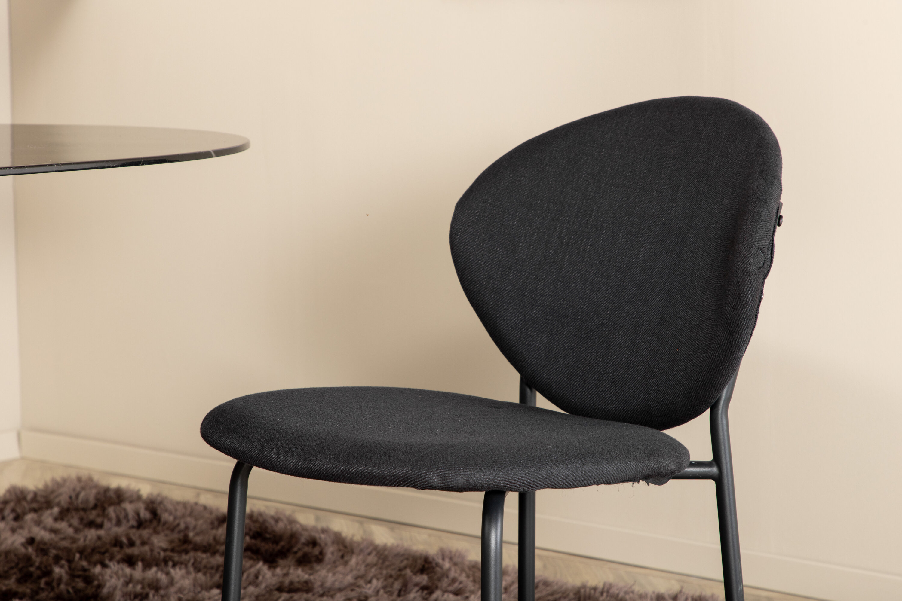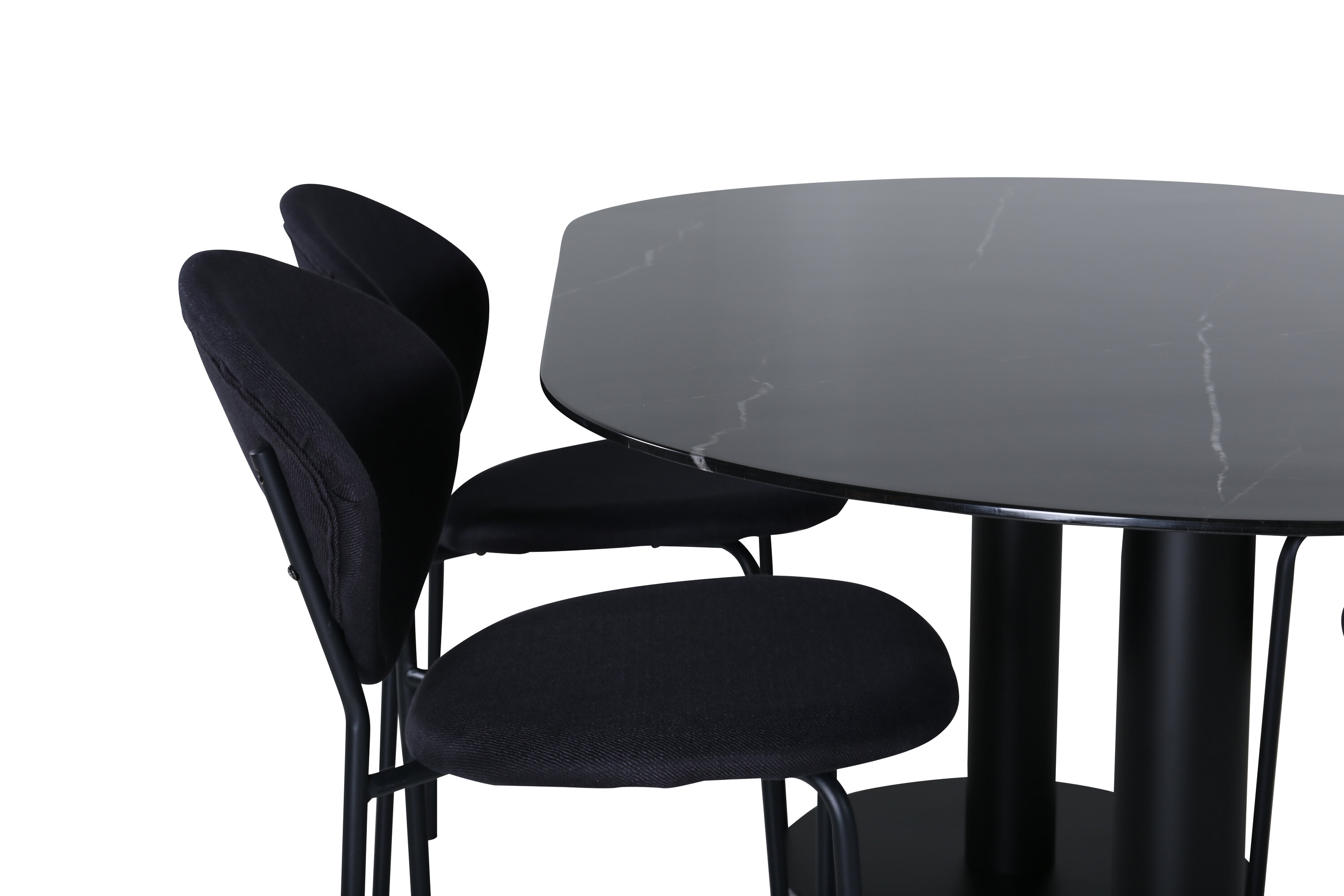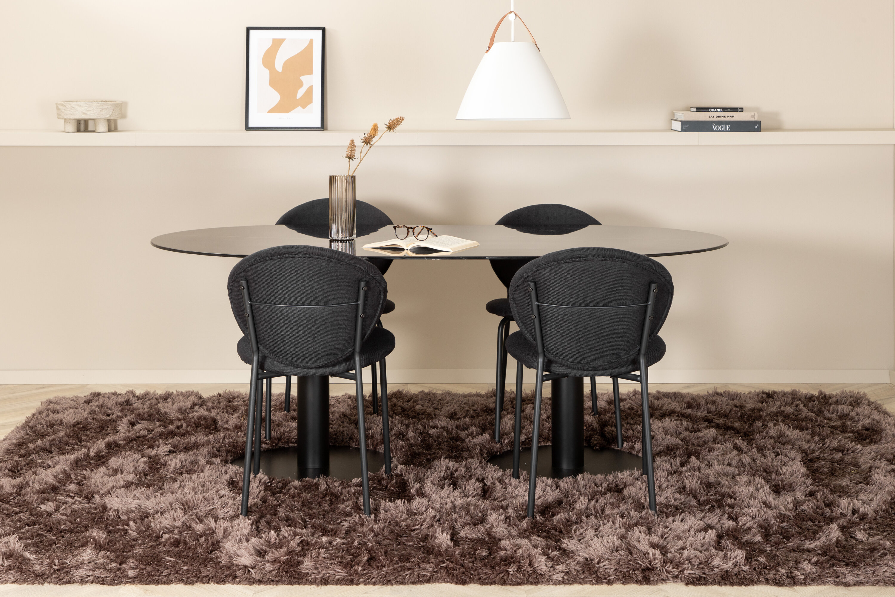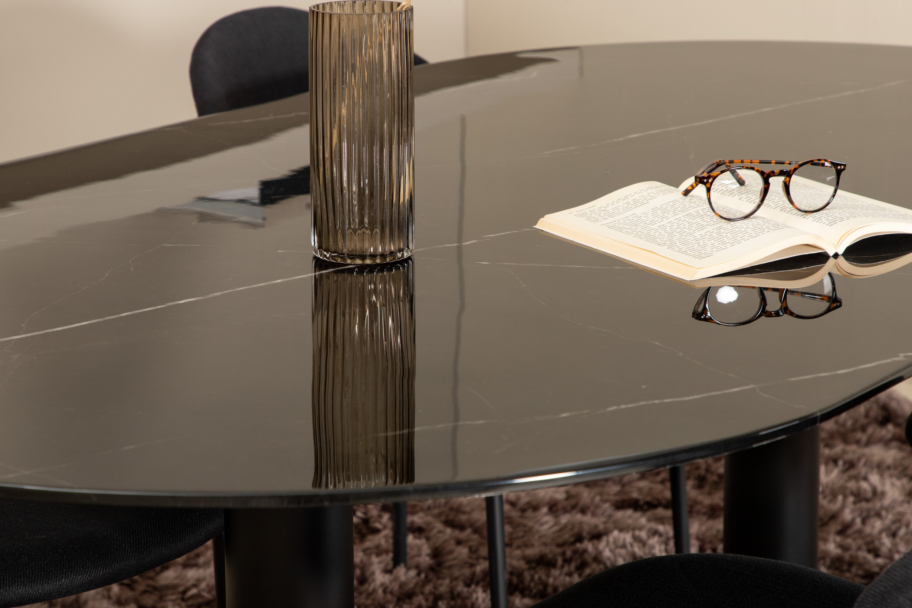 Eettafel Pillan zorgt voor een modebewuste indruk en aangename sfeer in huis! Het ovale ontwerp en het algehele ontwerp zijn goed doordacht met een dunne bovenplaat in zwart marmerglas en twee stabiele tafelpoten in zwart metaal. Tafelafmetingen: lengte: 180 cm, breedte: 100 cm, hoogte: 74 cm. Hier gecombineerd met 4 Vault eetkamerstoelen met zwarte botten in metaal en zwarte stoelen in polyester. Afmetingen stoel: hoogte: 80 cm, zithoogte: 49 cm, breedte: 46 cm, diepte: 61,5 cm. Laat de tijd aan de eettafel een van de hoogtepunten van vandaag worden!