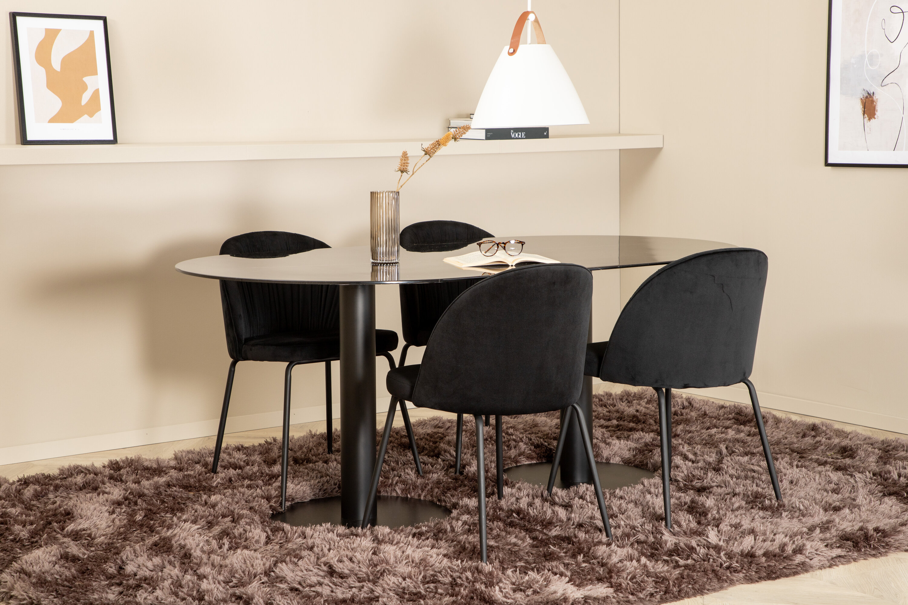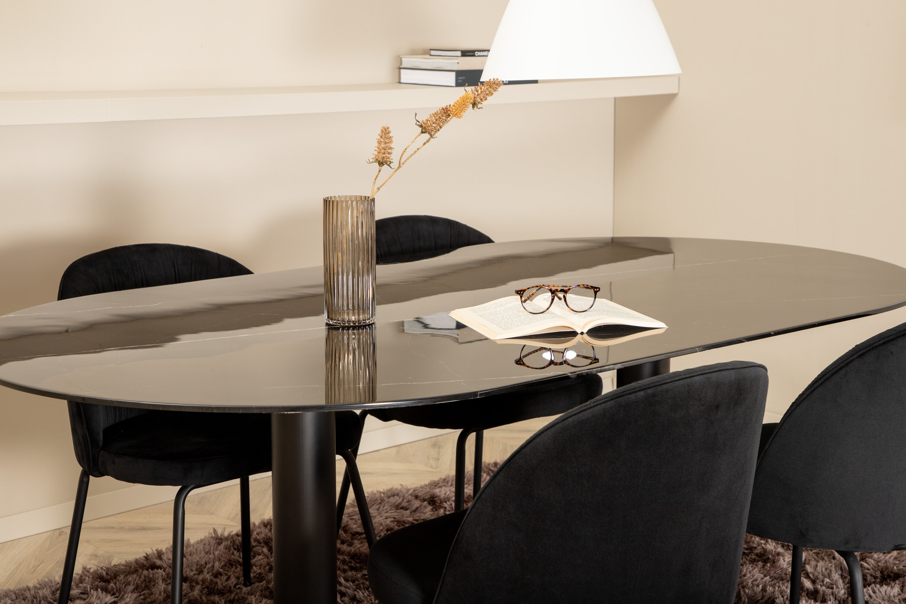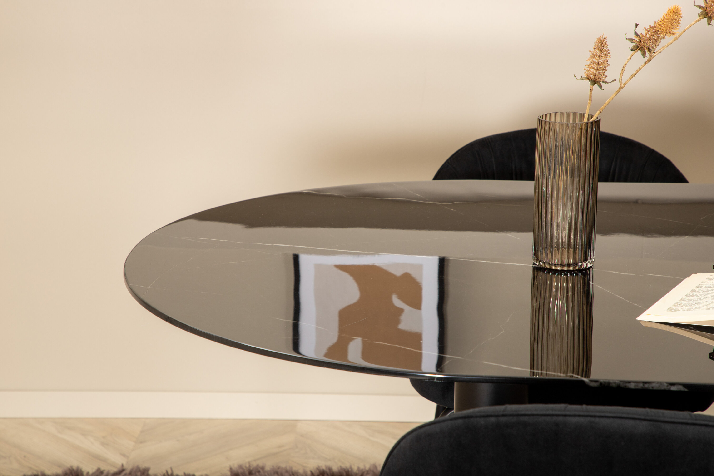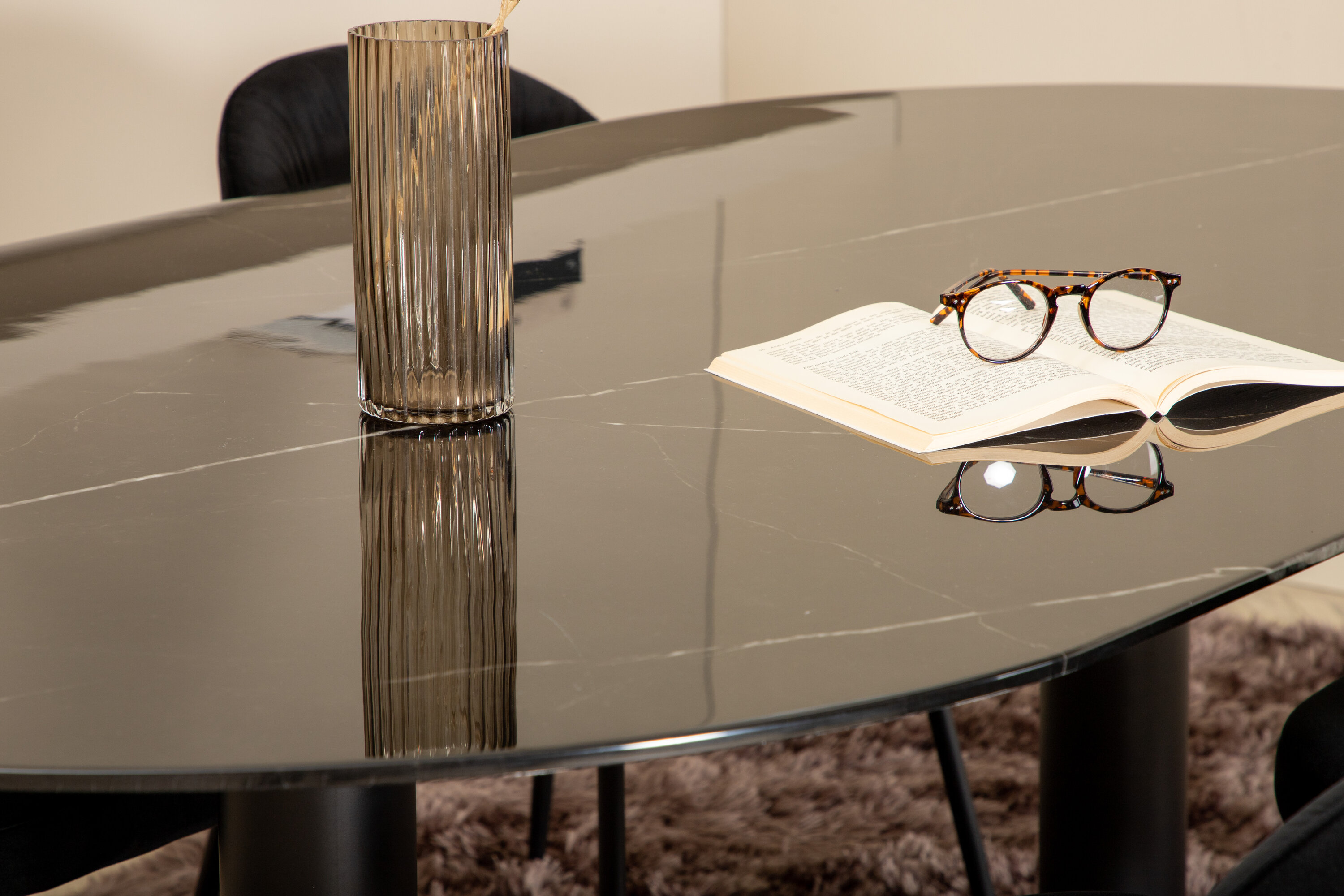 Eettafel Pillan maakt indruk met zijn elegante design en uitnodigende, ovale design! Het totale ontwerp is zeer goed doordacht met een dunne bovenplaat in zwart marmerglas en twee stabiele tafelpoten in zwart metaal. Tafelafmetingen: lengte: 180 cm, breedte: 100 cm, hoogte: 74 cm. Hier in perfecte combinatie met onze populaire eetkamerstoelen Rimpels in luxe design. De stoelpoten zijn van zwart metaal en de licht gekreukelde zitting van zachte fluwelen stof. Afmetingen stoel: hoogte: 79,5 cm, zithoogte: 49,5 cm, breedte: 49 cm, diepte: 50 cm. Richt de woonkamer in met een modern gevoel!