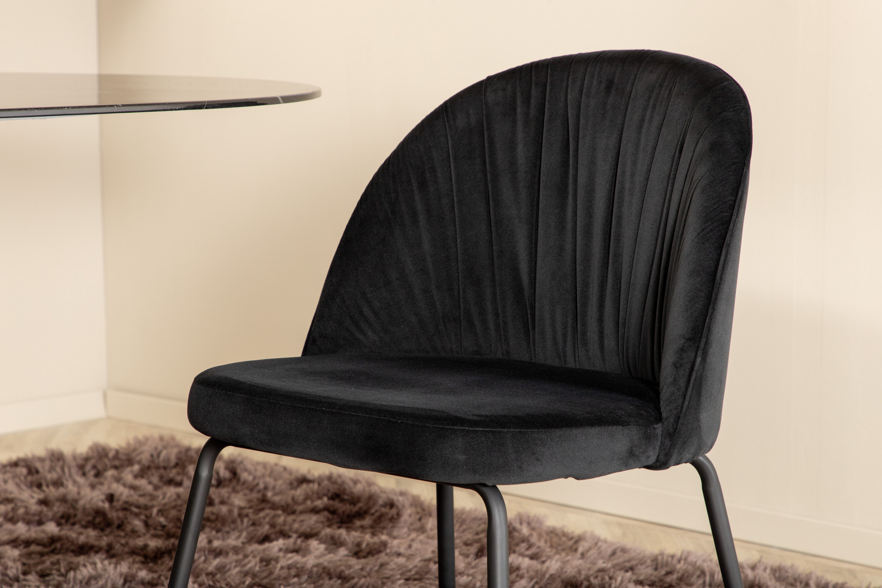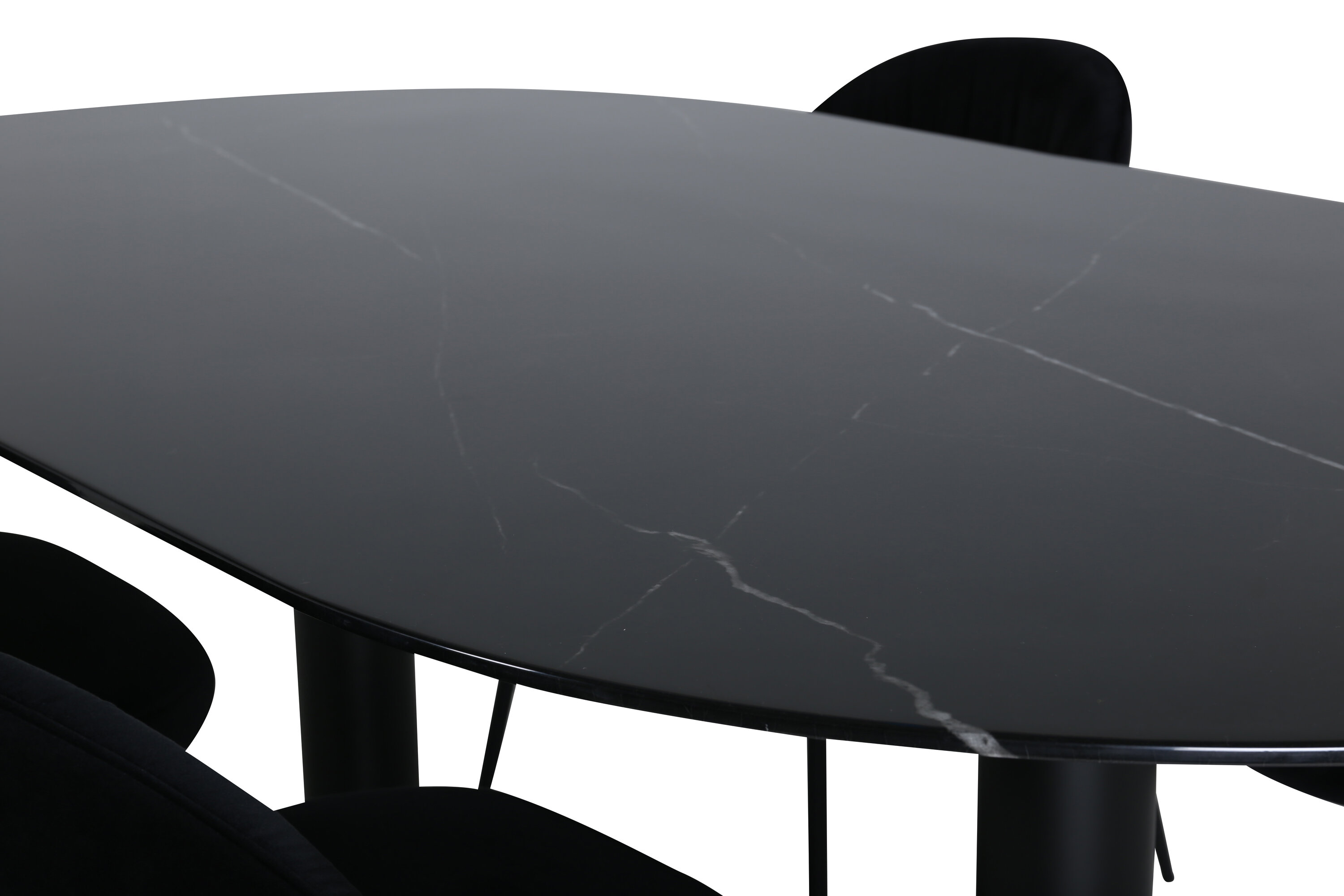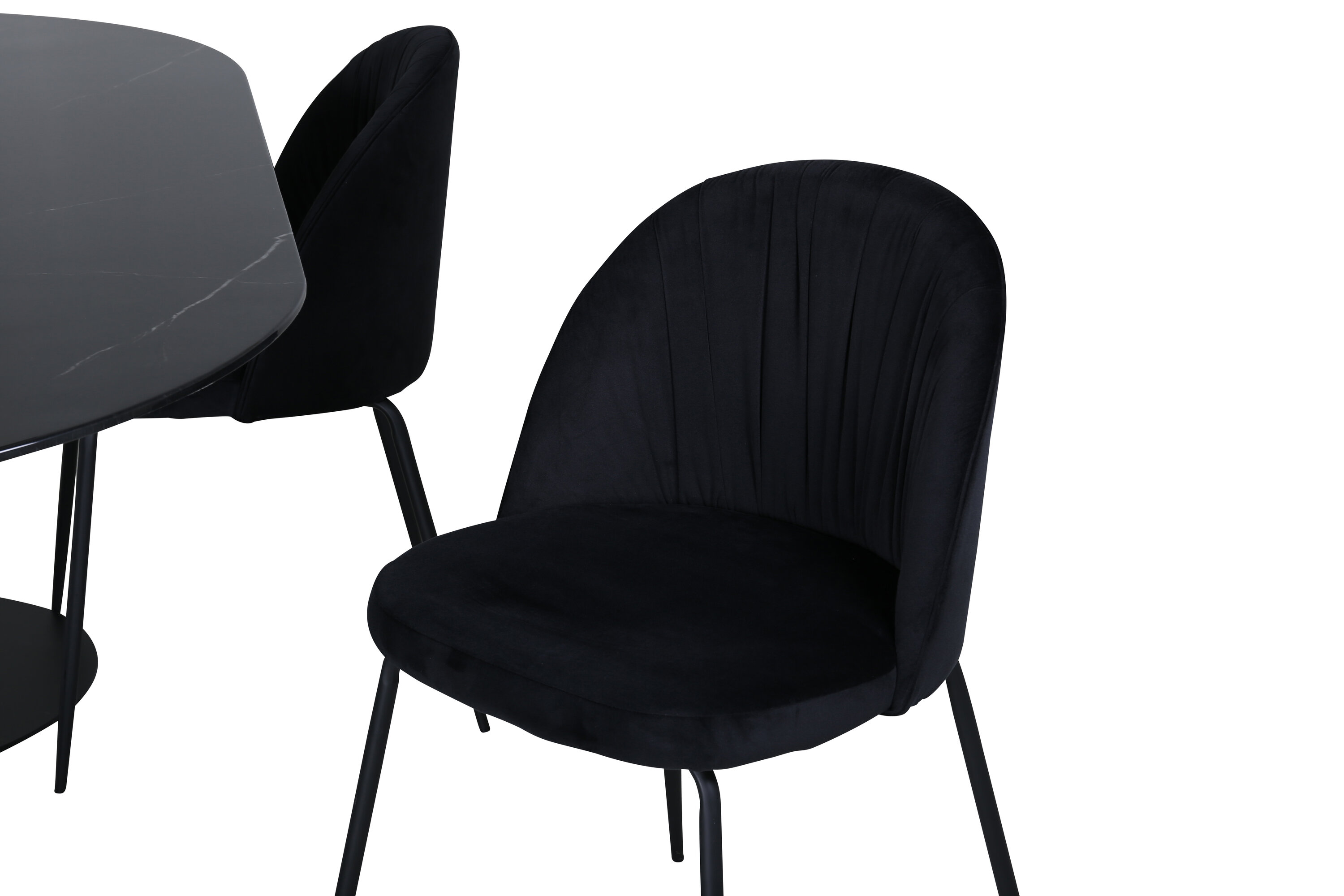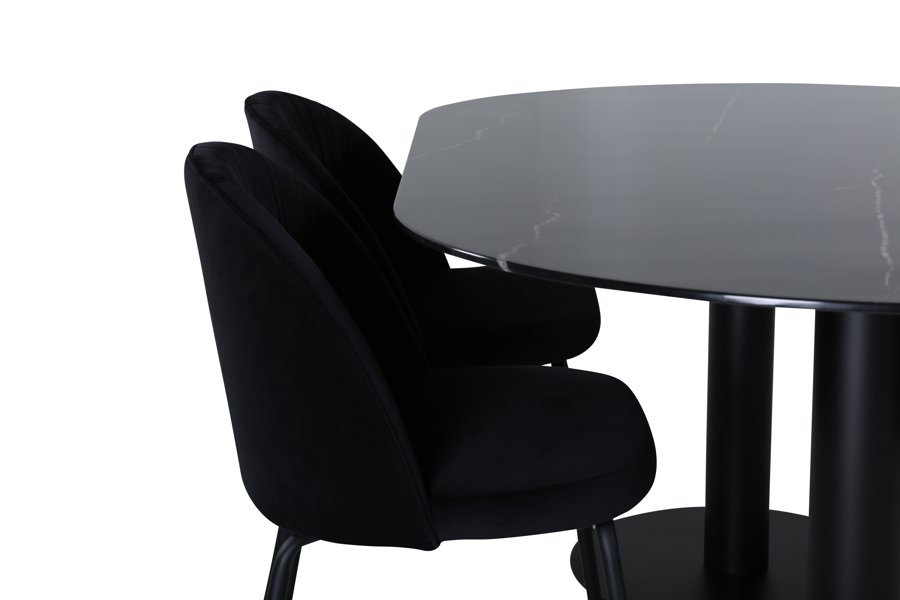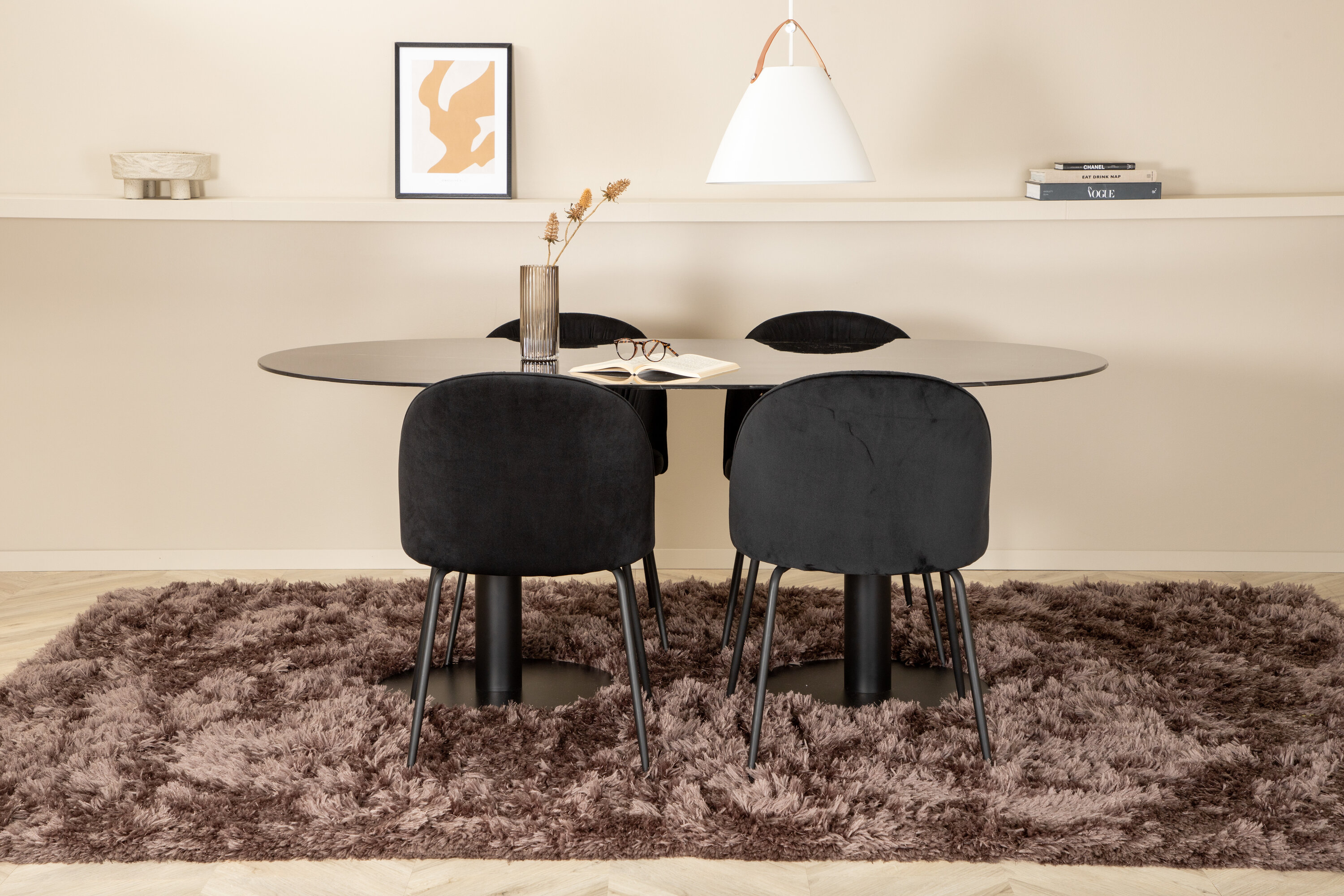 Eettafel Pillan maakt indruk met zijn elegante design en uitnodigende, ovale design! Het totale ontwerp is zeer goed doordacht met een dunne bovenplaat in zwart marmerglas en twee stabiele tafelpoten in zwart metaal. Tafelafmetingen: lengte: 180 cm, breedte: 100 cm, hoogte: 74 cm. Hier in perfecte combinatie met onze populaire eetkamerstoelen Rimpels in luxe design. De stoelpoten zijn van zwart metaal en de licht gekreukelde zitting van zachte fluwelen stof. Afmetingen stoel: hoogte: 79,5 cm, zithoogte: 49,5 cm, breedte: 49 cm, diepte: 50 cm. Richt de woonkamer in met een modern gevoel!