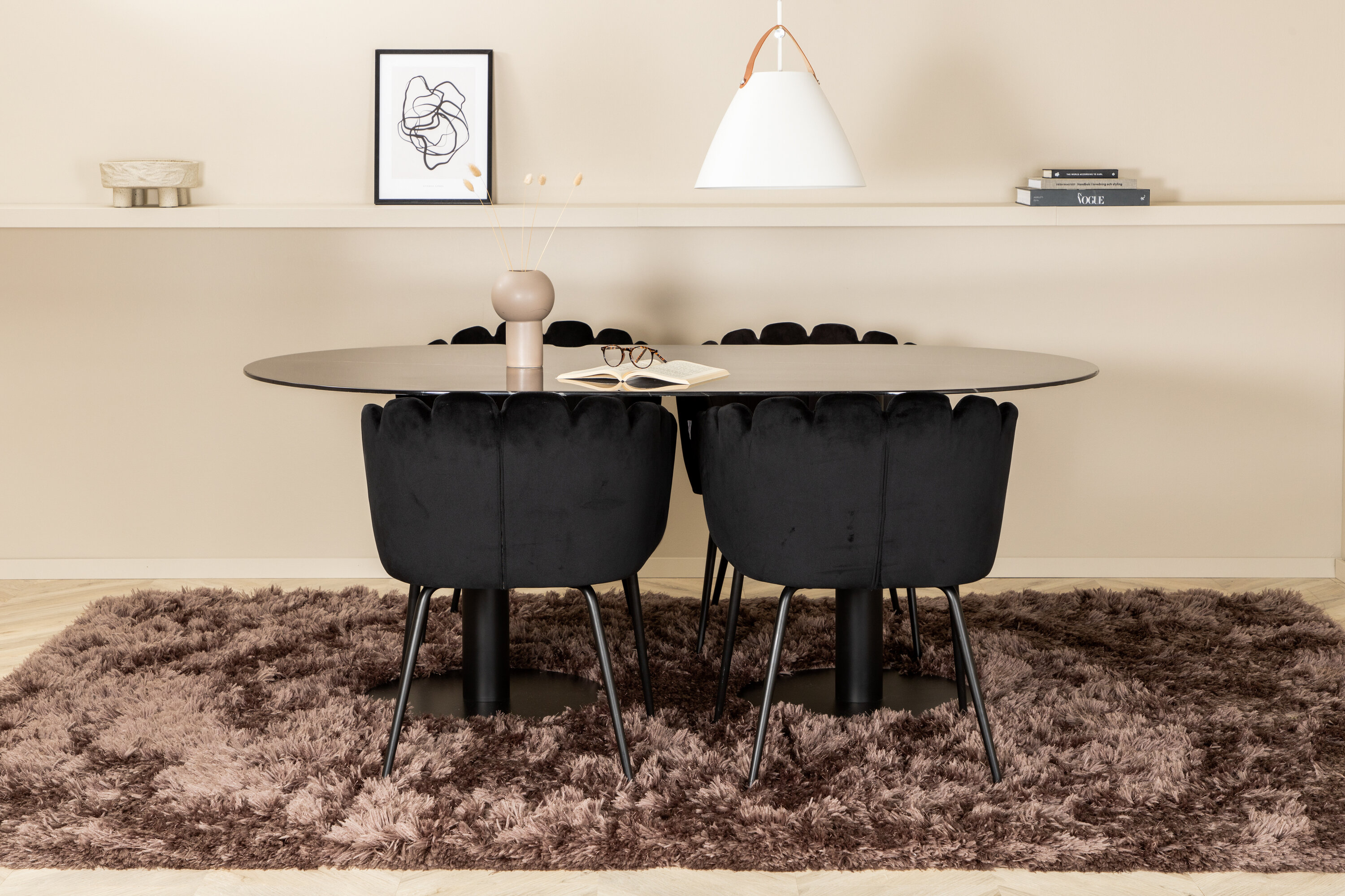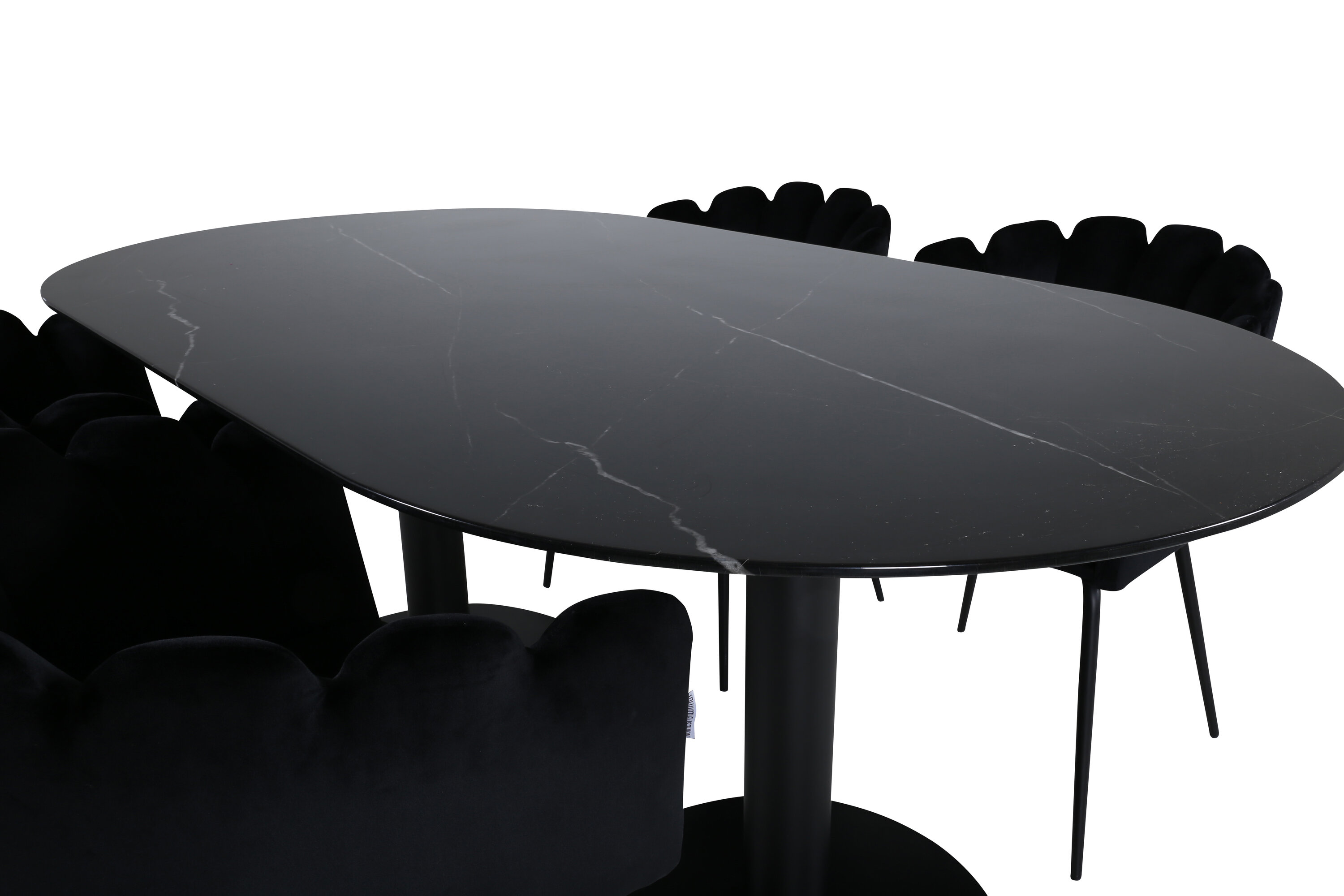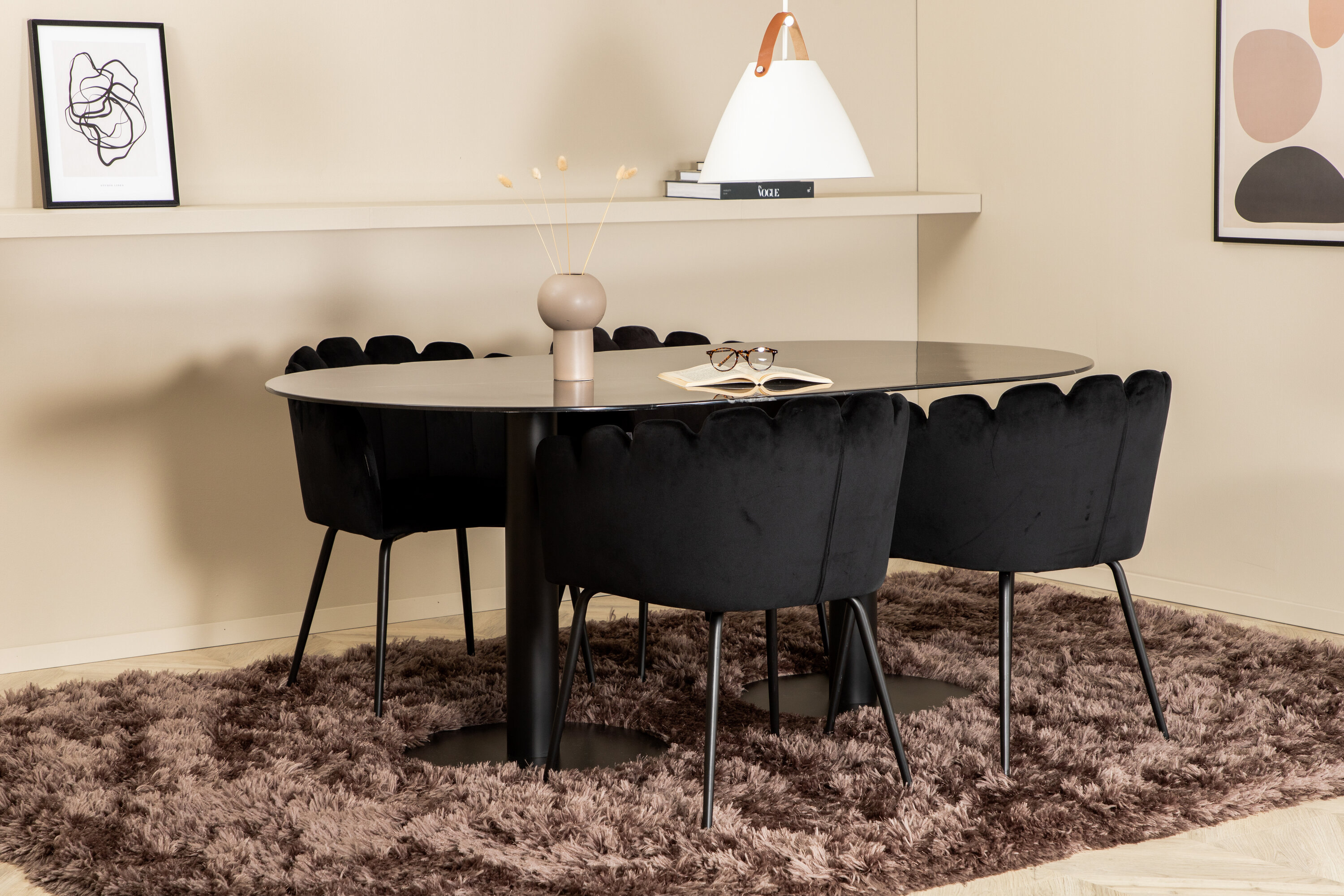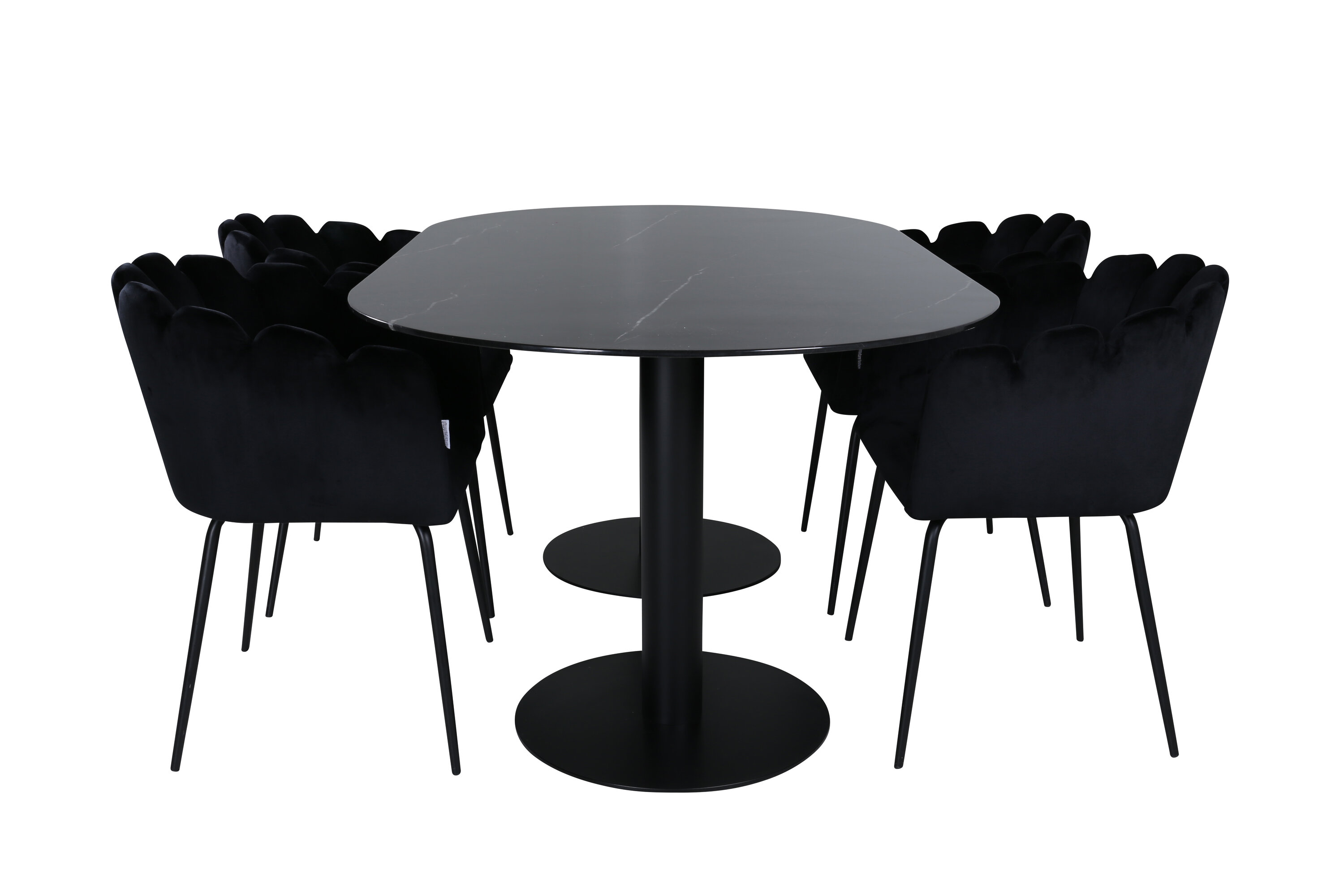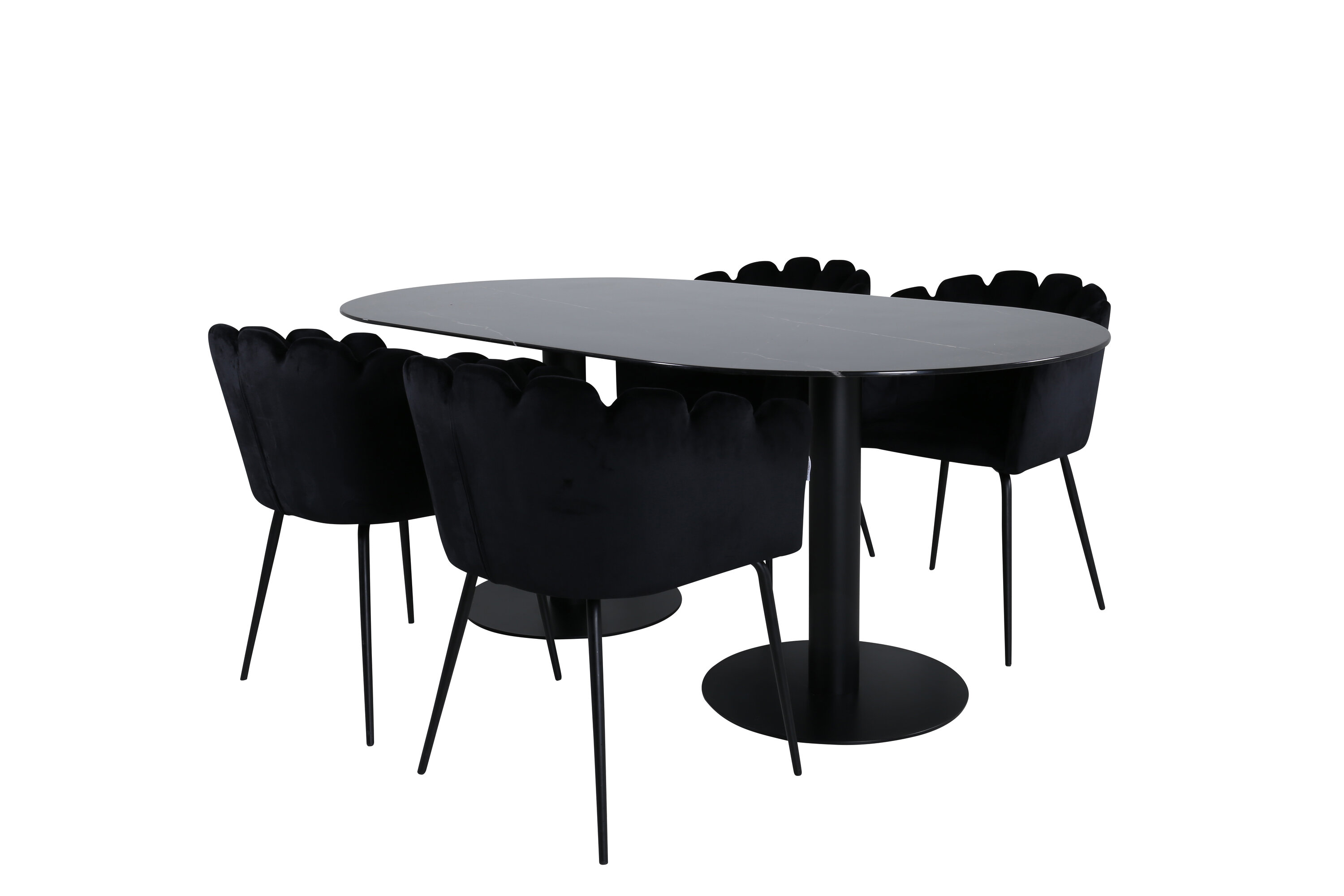 Creëer een aangename sfeer in de woonkamer en til de interieurstijl naar een hoger niveau! Eettafel Pillan maakt indruk met zijn elegante design en uitnodigende, ovale design. Het totale ontwerp is zeer goed doordacht met een dunne bovenplaat in zwart marmerglas en twee stabiele tafelpoten in zwart metaal. Tafelafmetingen: lengte: 180 cm, breedte: 100 cm, hoogte: 74 cm. Hier samen met 4 Limhamn eetkamerstoelen die minstens zo comfortabel zijn als er goed uitzien! De zitting en de rugleuning van de stoel zijn gemaakt van slanke zwarte fluwelen stof en de poten van de stoel zijn gemaakt van gepoedercoat metaal. Afmetingen stoel: hoogte: 76,56cm, zithoogte: 48 cm, breedte: 61 cm, diepte: 54 cm.