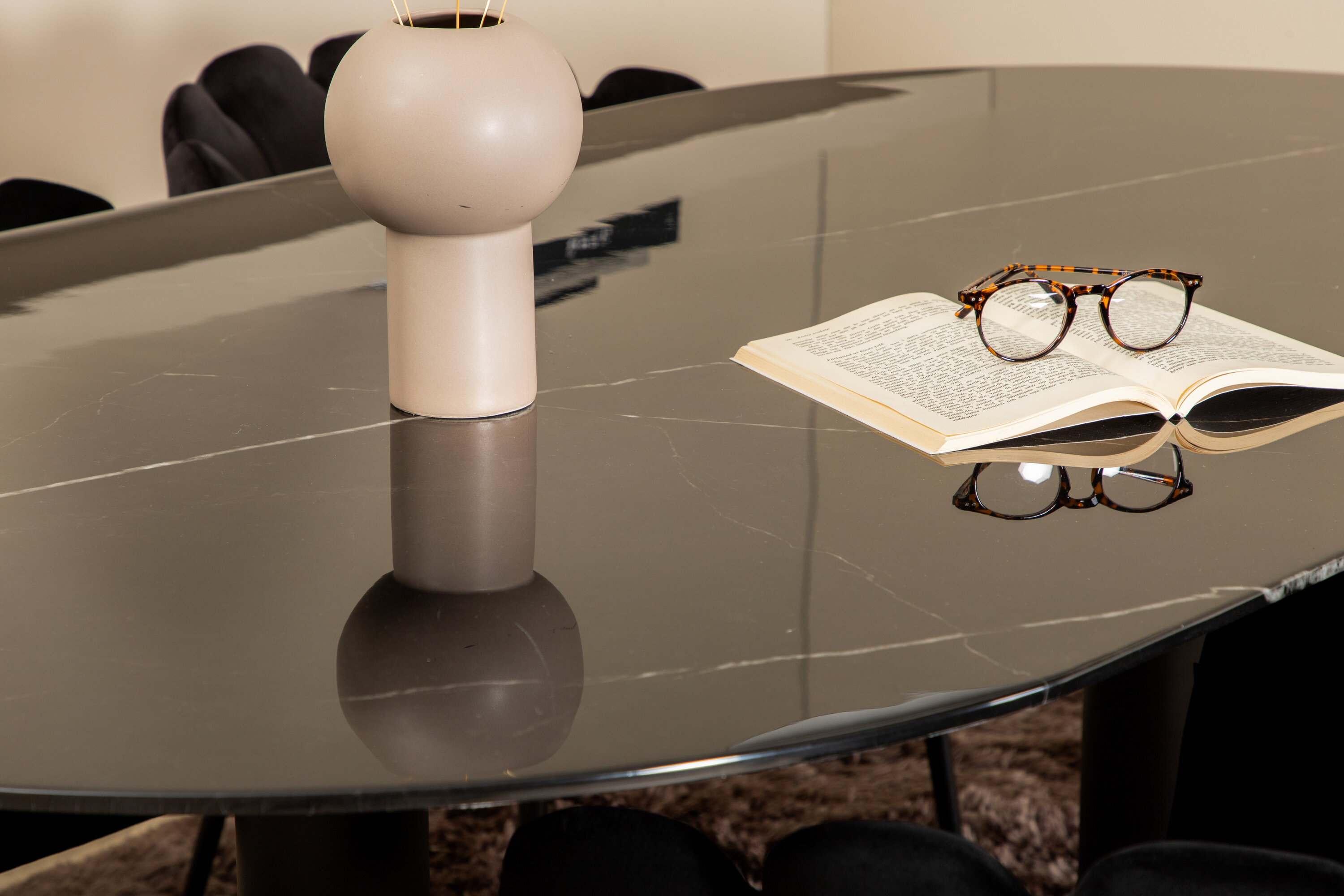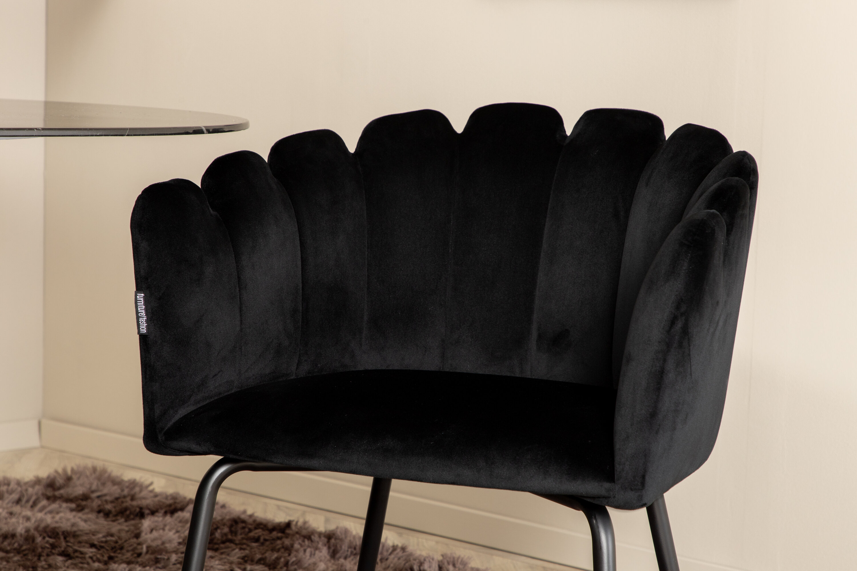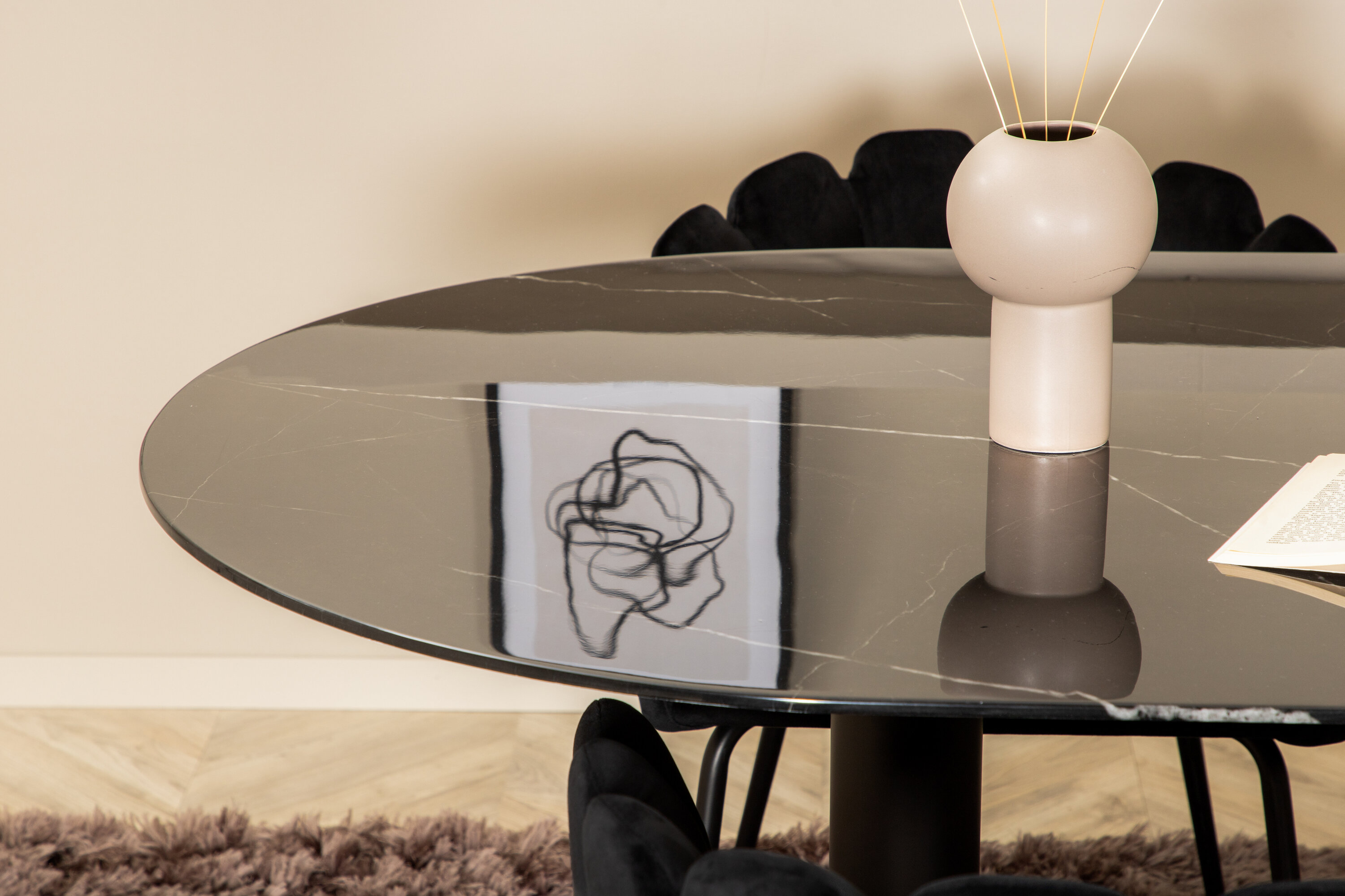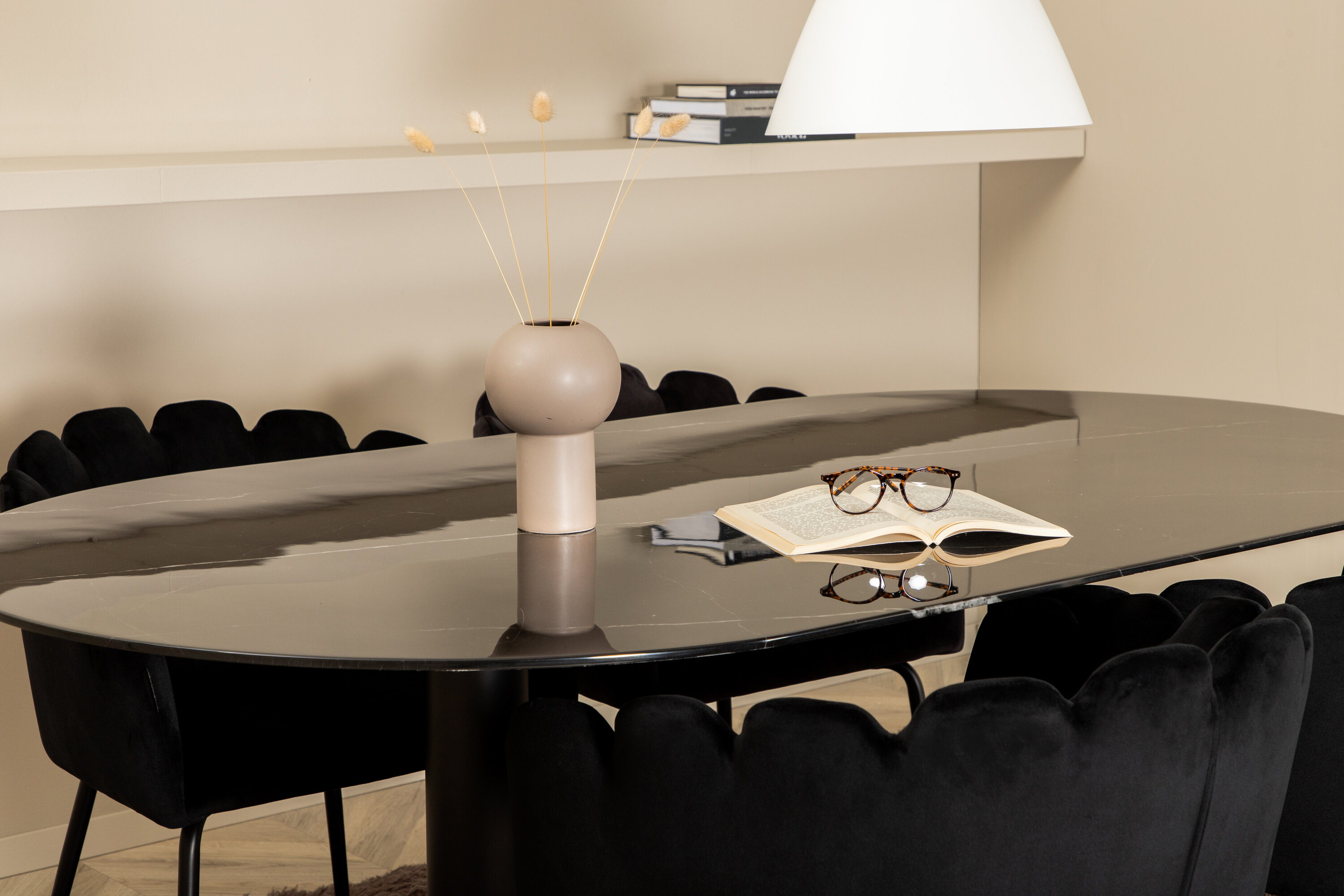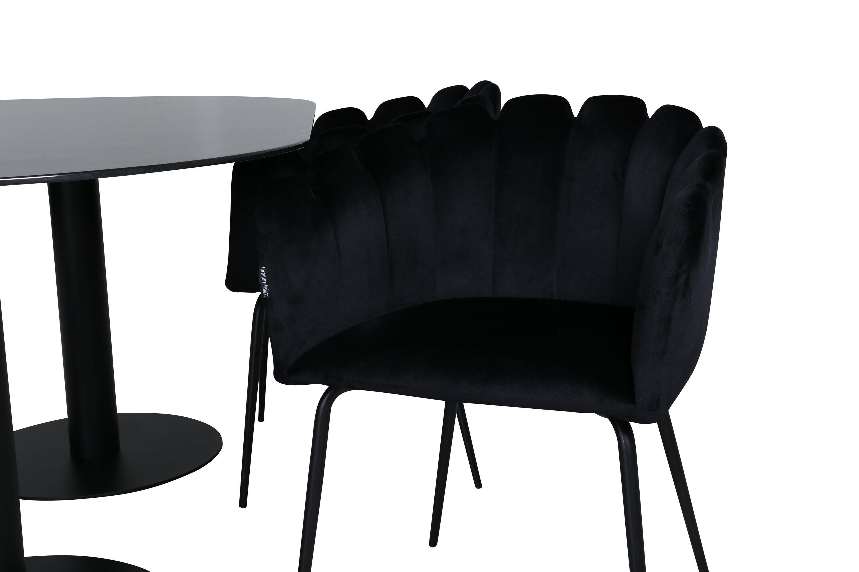 Creëer een aangename sfeer in de woonkamer en til de interieurstijl naar een hoger niveau! Eettafel Pillan maakt indruk met zijn elegante design en uitnodigende, ovale design. Het totale ontwerp is zeer goed doordacht met een dunne bovenplaat in zwart marmerglas en twee stabiele tafelpoten in zwart metaal. Tafelafmetingen: lengte: 180 cm, breedte: 100 cm, hoogte: 74 cm. Hier samen met 4 Limhamn eetkamerstoelen die minstens zo comfortabel zijn als er goed uitzien! De zitting en de rugleuning van de stoel zijn gemaakt van slanke zwarte fluwelen stof en de poten van de stoel zijn gemaakt van gepoedercoat metaal. Afmetingen stoel: hoogte: 76,56cm, zithoogte: 48 cm, breedte: 61 cm, diepte: 54 cm.