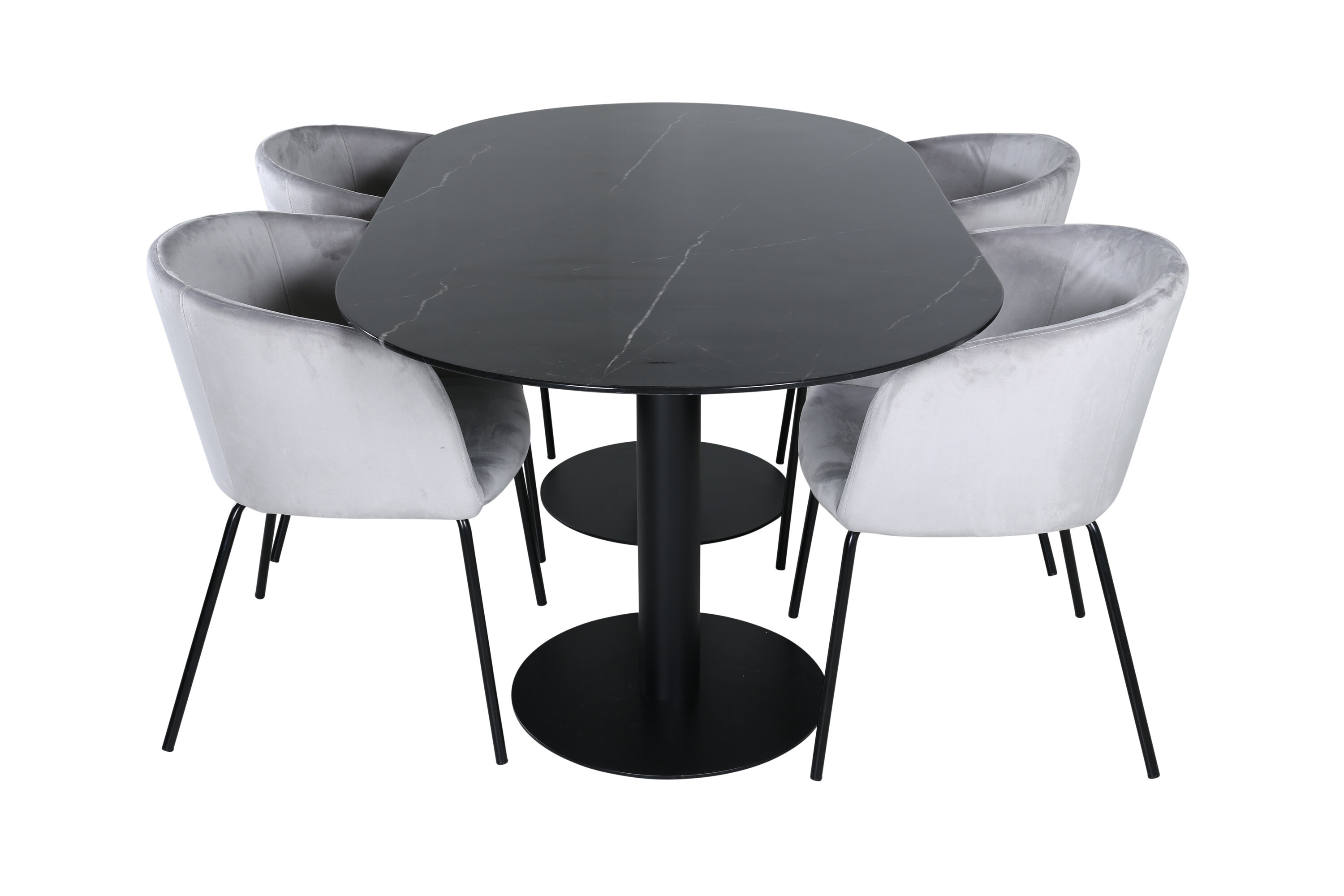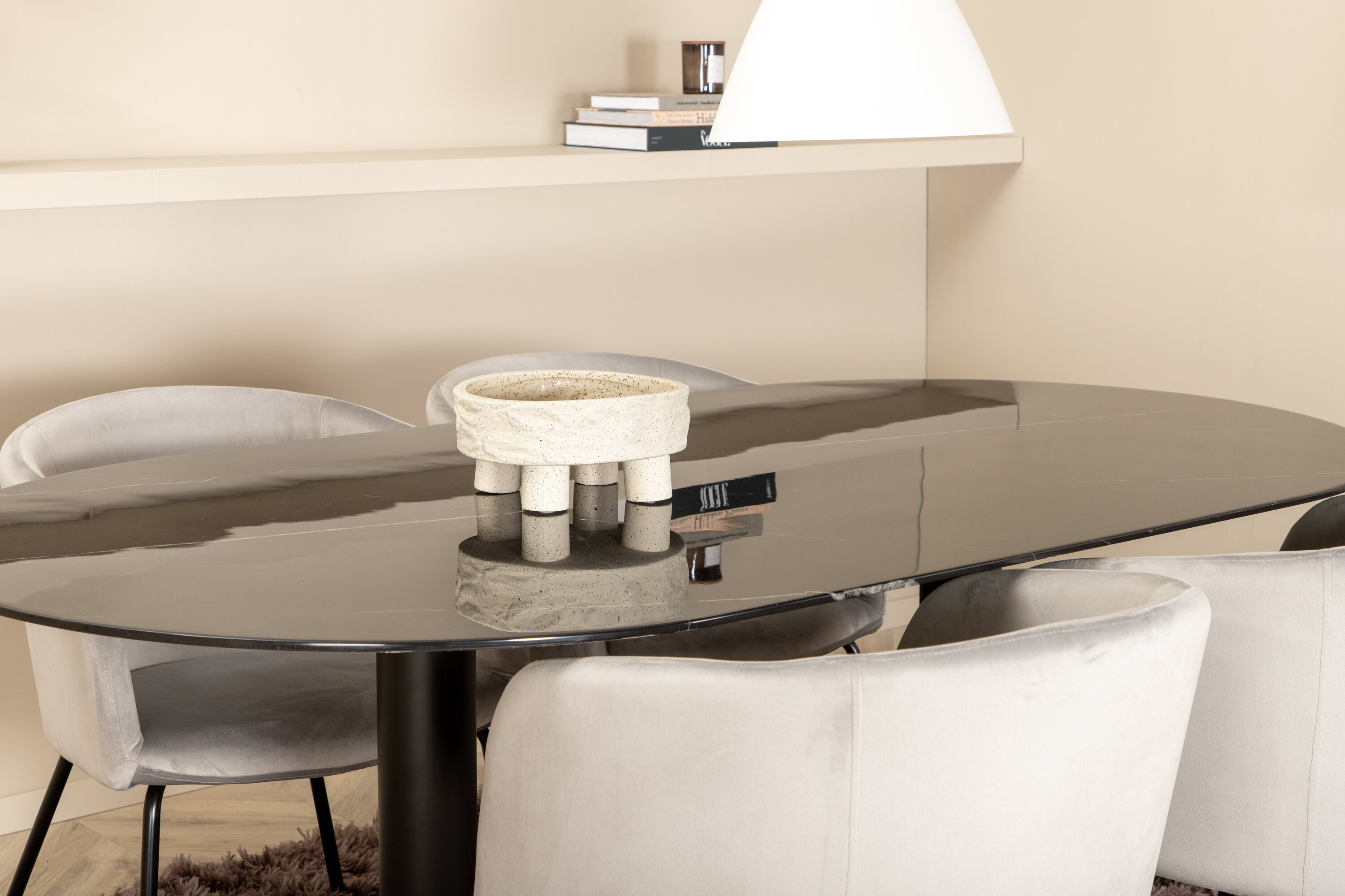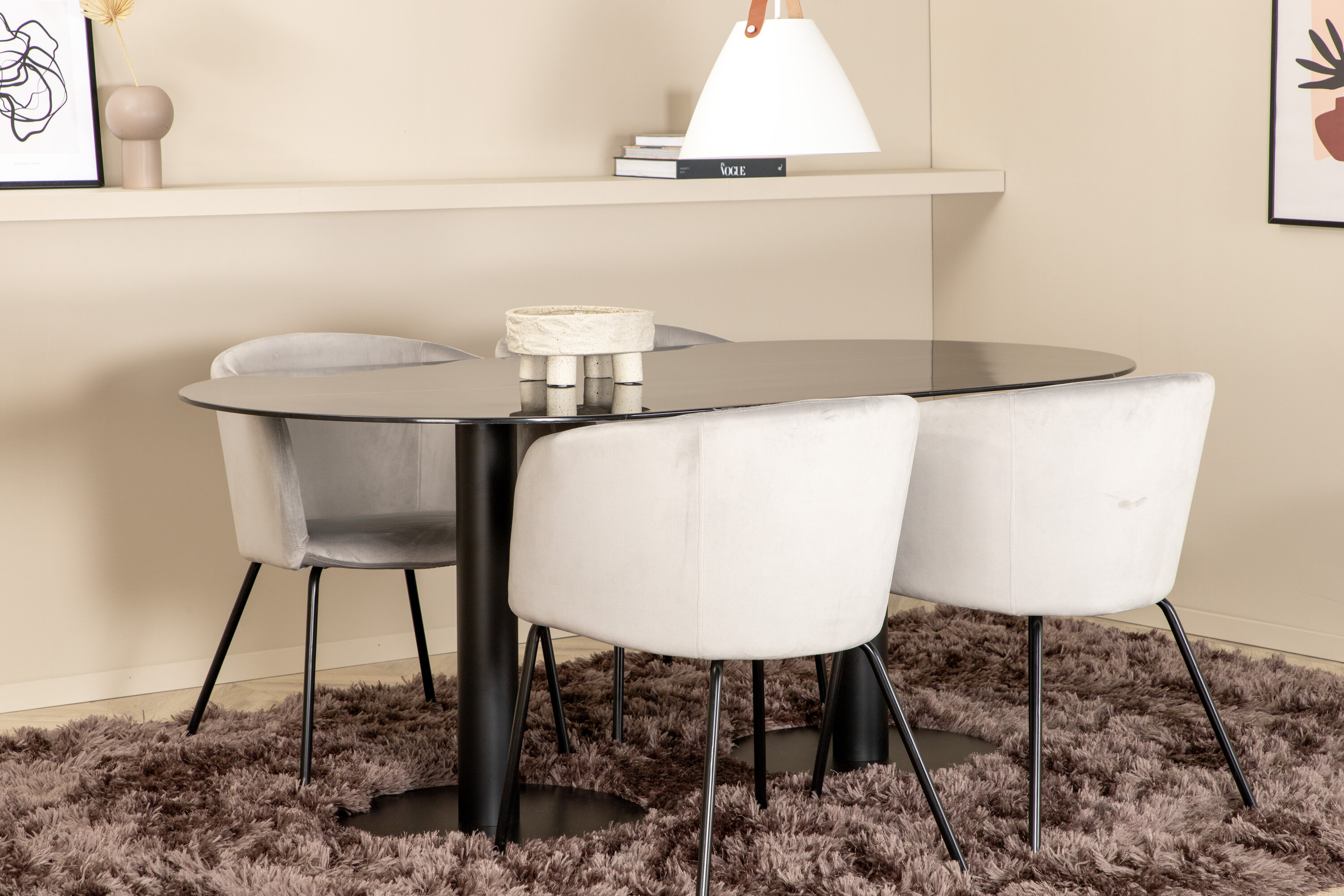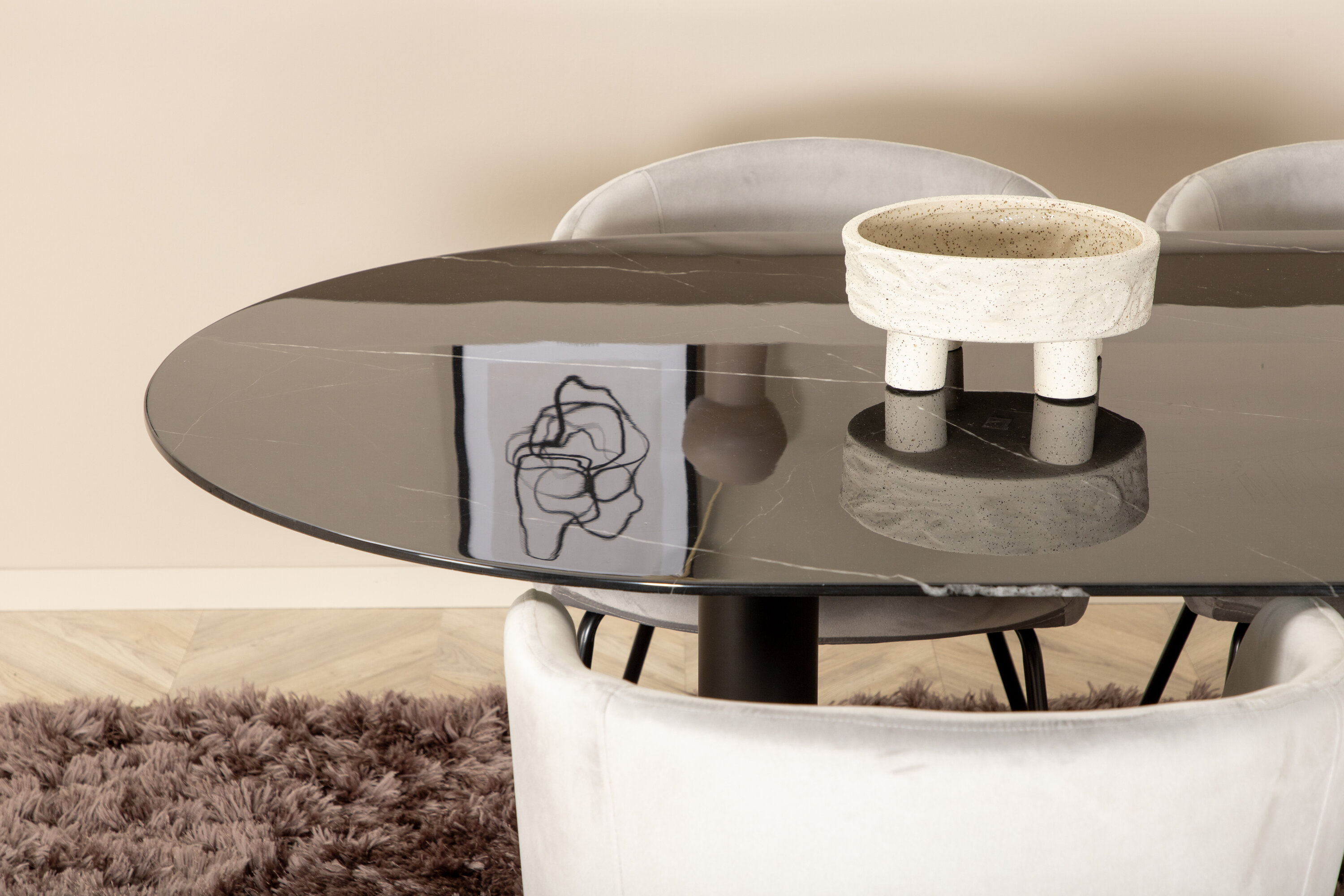 Zo stijlvol als uitnodigend - eettafel Pillan creëert een modebewuste indruk en aangename sfeer in je huis! Het ovale ontwerp en het algehele ontwerp zijn goed doordacht met een dunne bovenplaat in zwart marmerglas en twee stabiele tafelpoten in zwart metaal. Tafelafmetingen: lengte: 180 cm, breedte: 100 cm, hoogte: 74 cm. Hier samen met 4 van onze grote eetkamerstoelen Berit in lichtgrijs fluweel en smalle stoelpoten in ijzer. Afmetingen stoel: hoogte: 78 cm, zithoogte: 49 cm, breedte: 55 cm, diepte: 55 cm. Het hoge zitcomfort van de stoelen nodigt je uit voor lange en prachtige momenten om te socializen!