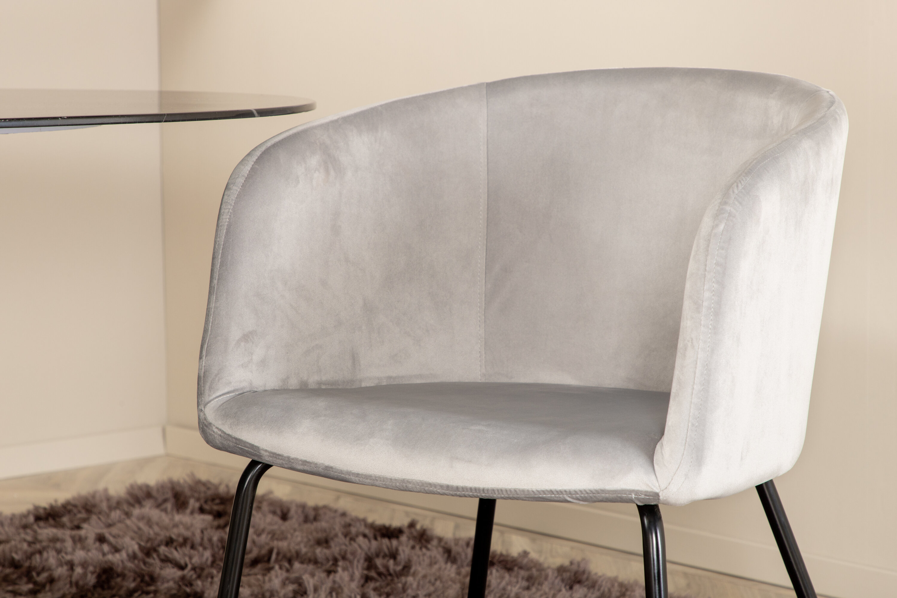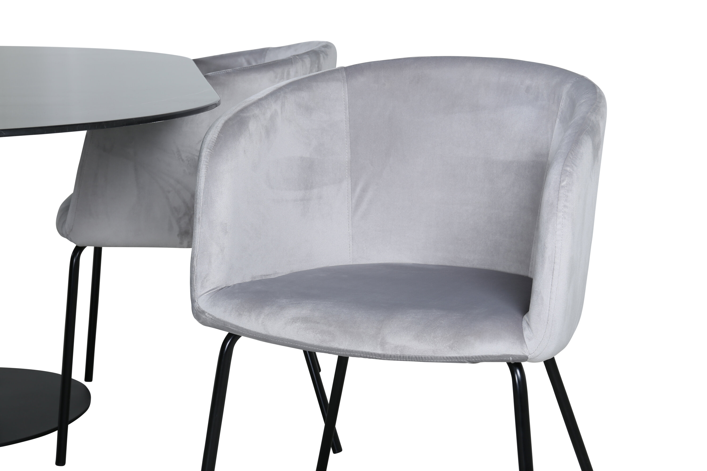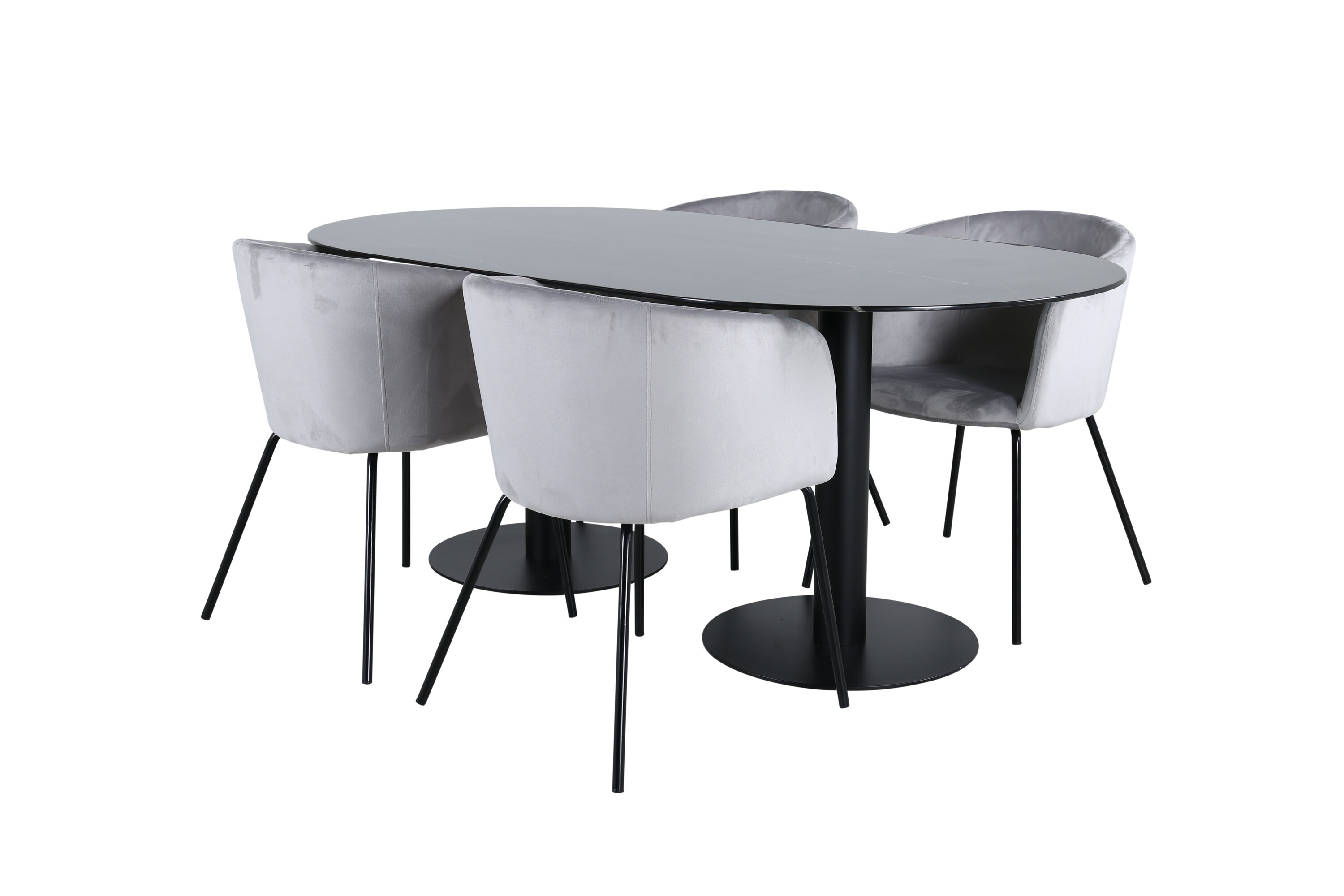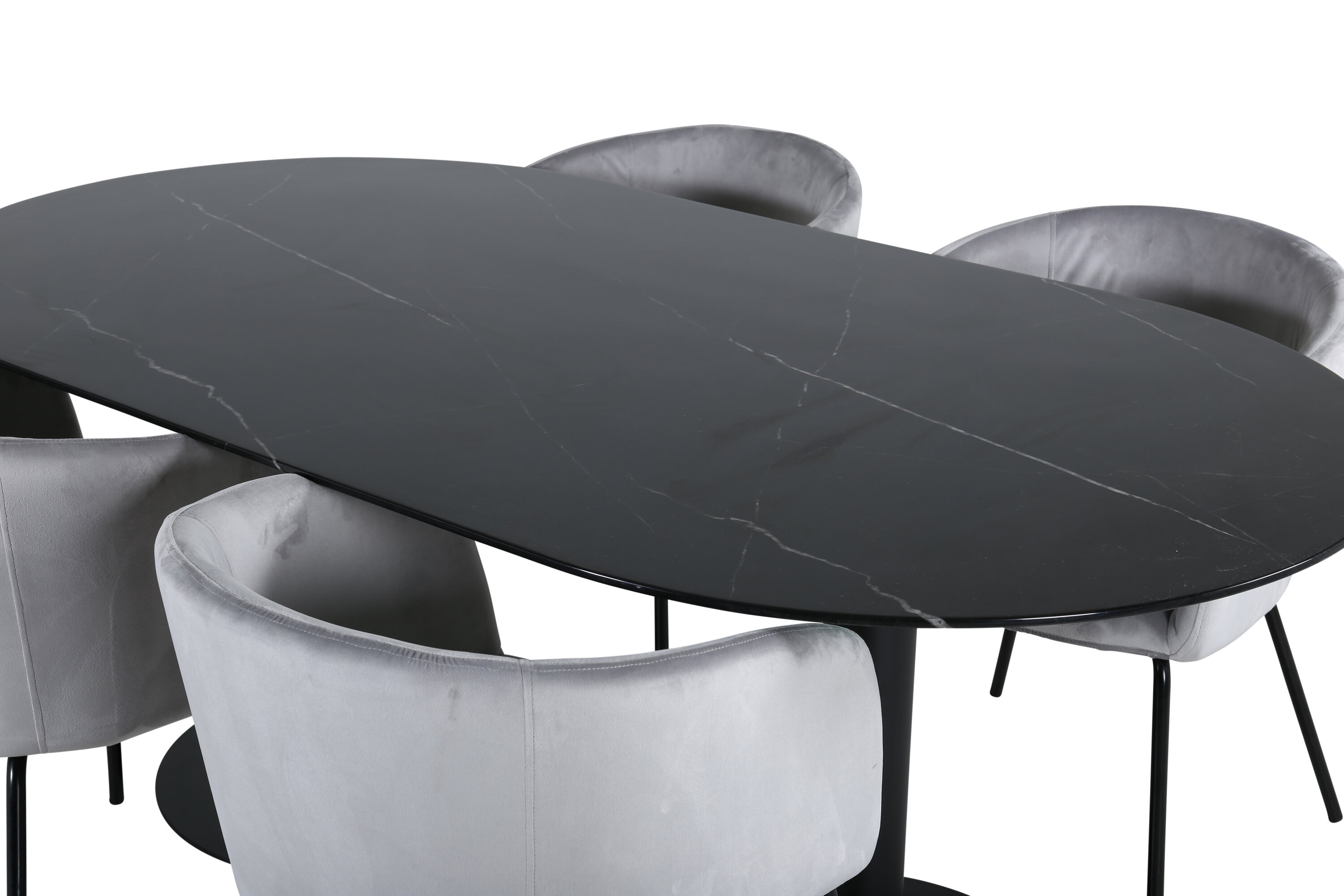 Zo stijlvol als uitnodigend - eettafel Pillan creëert een modebewuste indruk en aangename sfeer in je huis! Het ovale ontwerp en het algehele ontwerp zijn goed doordacht met een dunne bovenplaat in zwart marmerglas en twee stabiele tafelpoten in zwart metaal. Tafelafmetingen: lengte: 180 cm, breedte: 100 cm, hoogte: 74 cm. Hier samen met 4 van onze grote eetkamerstoelen Berit in lichtgrijs fluweel en smalle stoelpoten in ijzer. Afmetingen stoel: hoogte: 78 cm, zithoogte: 49 cm, breedte: 55 cm, diepte: 55 cm. Het hoge zitcomfort van de stoelen nodigt je uit voor lange en prachtige momenten om te socializen!