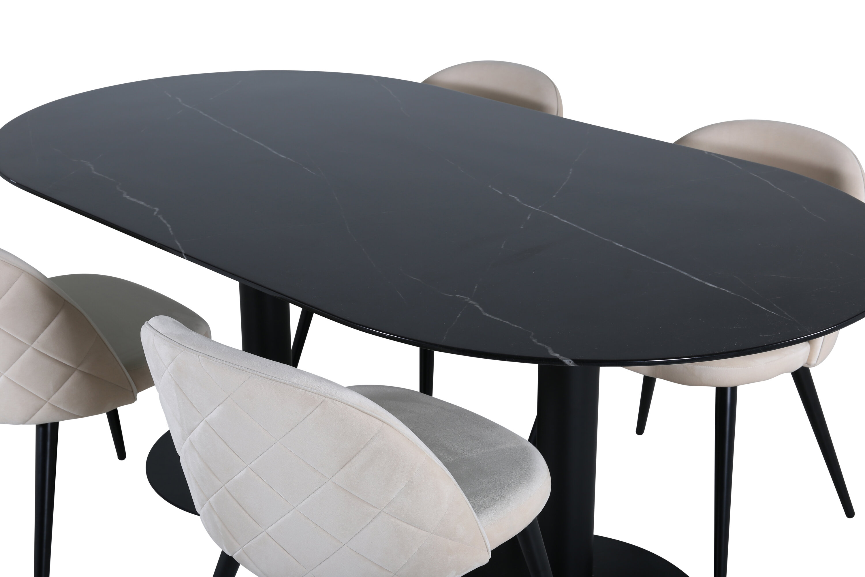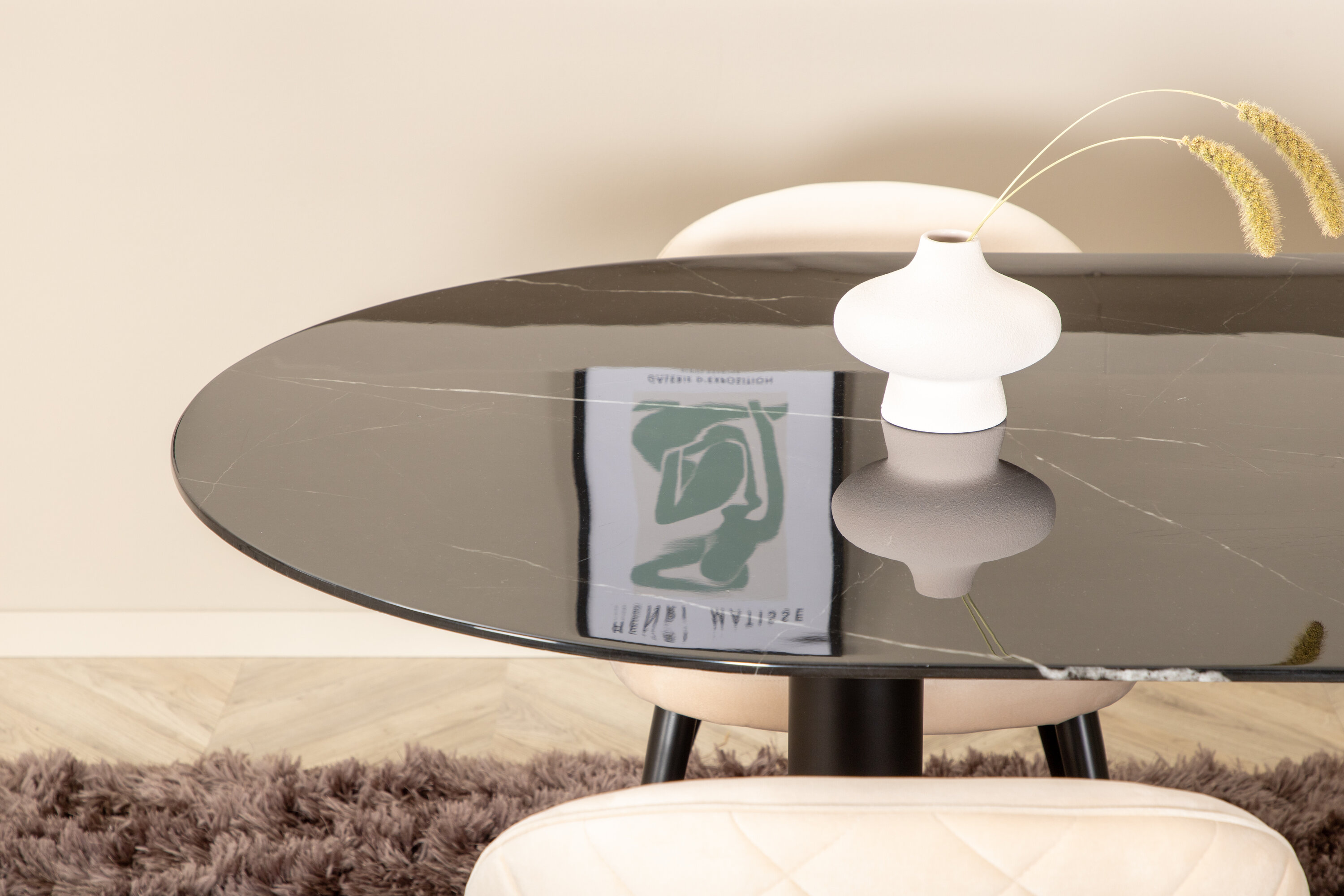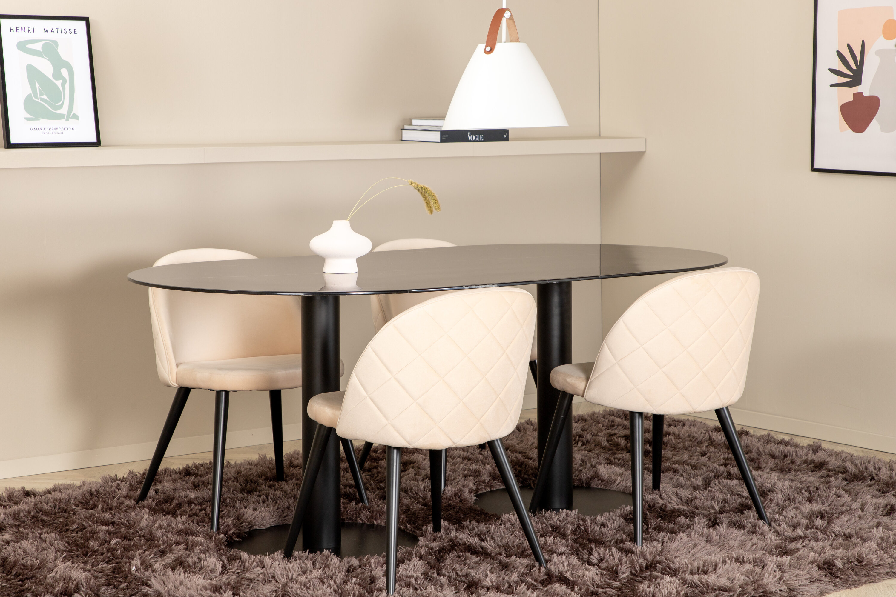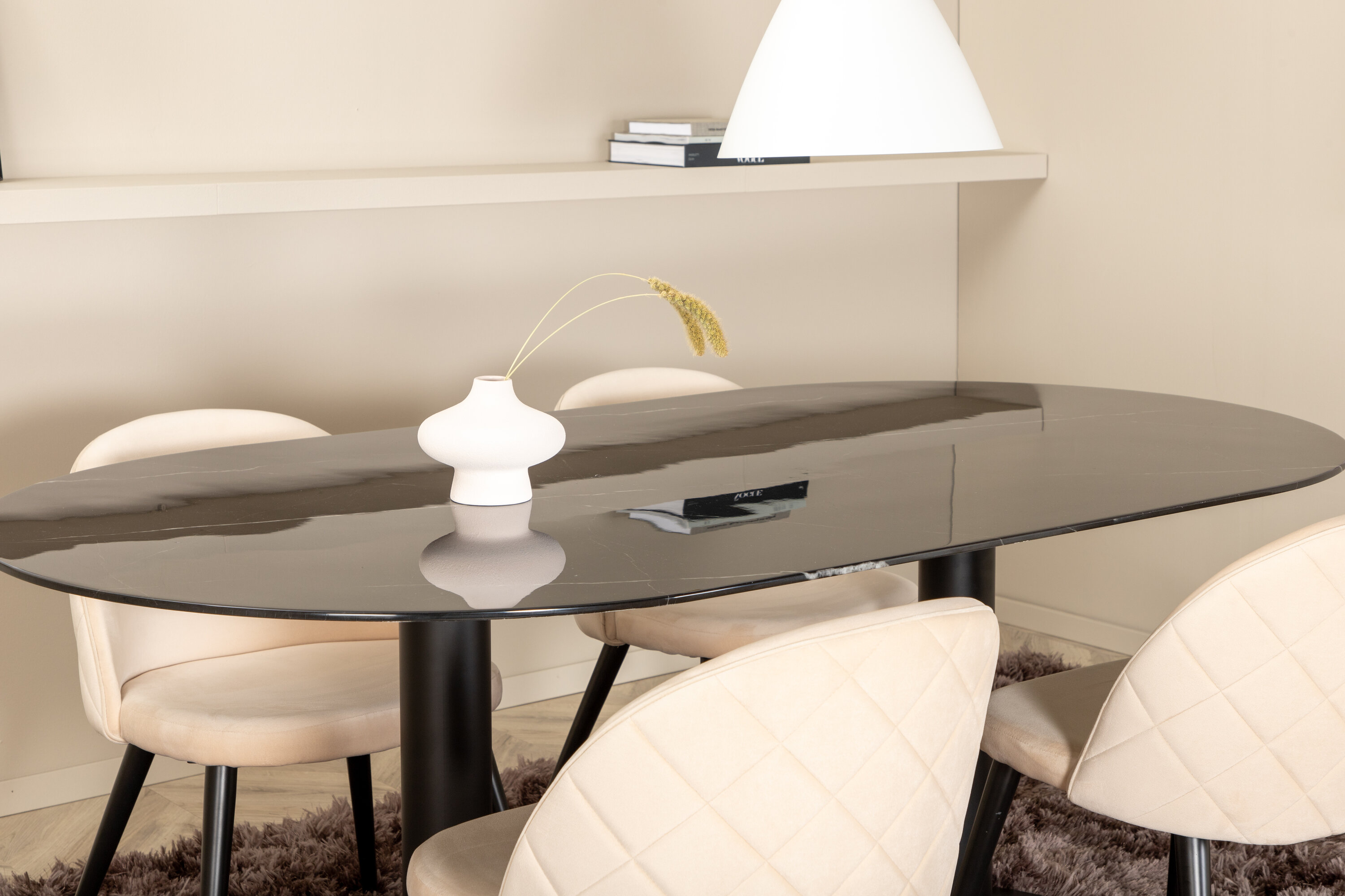 Zo stijlvol als uitnodigend - eettafel Pillan creëert een modebewuste indruk en aangename sfeer in je huis! Het ovale ontwerp en het algehele ontwerp zijn goed doordacht met een dunne bovenplaat in zwart marmerglas en twee stabiele tafelpoten in zwart metaal. Tafelafmetingen: lengte: 180 cm, breedte: 100 cm, hoogte: 74 cm. Hier samen met 4 van onze chique eetkamerstoelen Velvet in beige fluweel en smalle stoelpoten in ijzer. Afmetingen stoel: hoogte: 76,5 cm, zithoogte: 46,5 cm, breedte: 50 cm, diepte: 57 cm. Het hoge zitcomfort van de stoelen nodigt je uit voor lange en prachtige momenten om te socializen!
