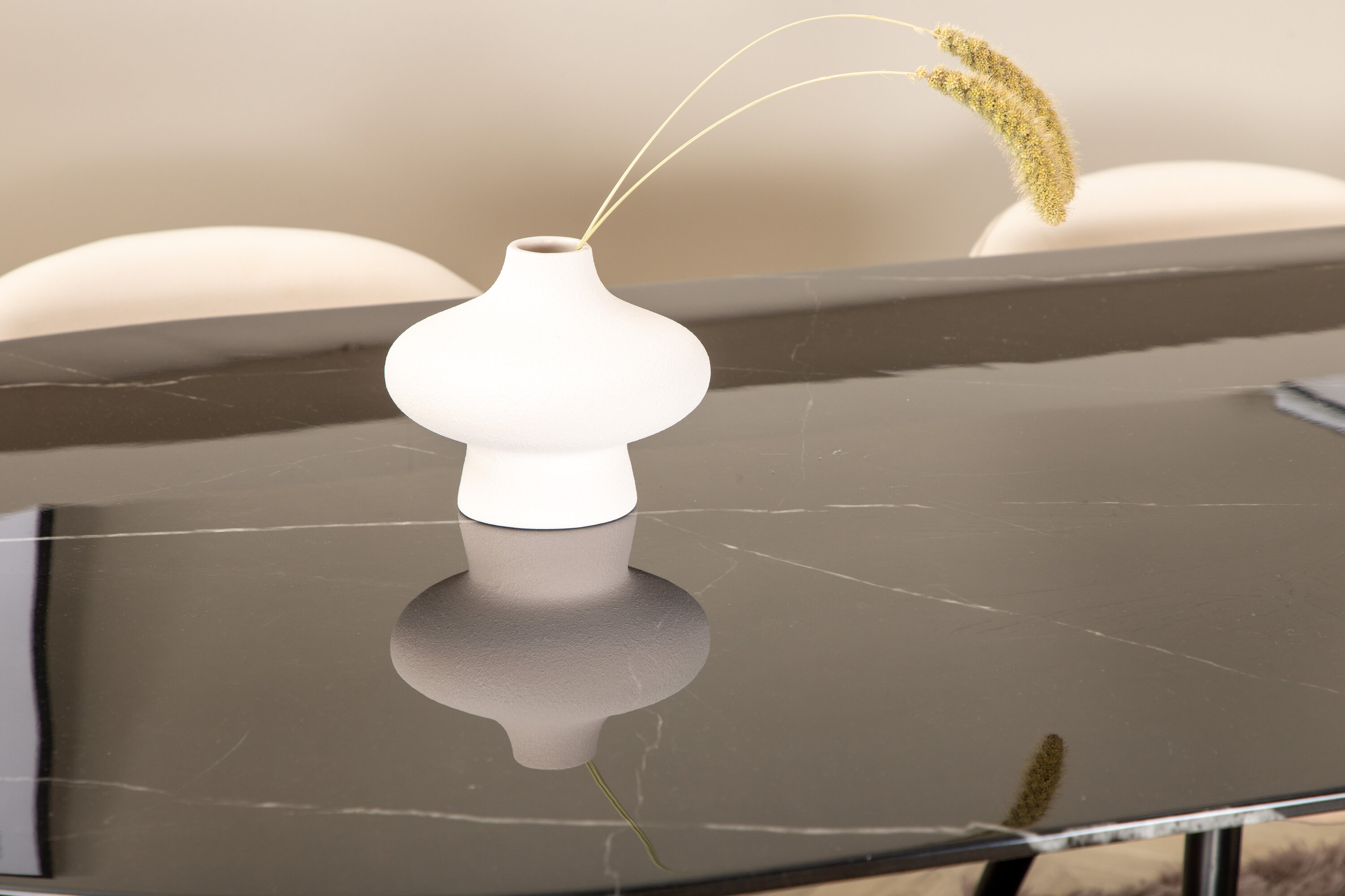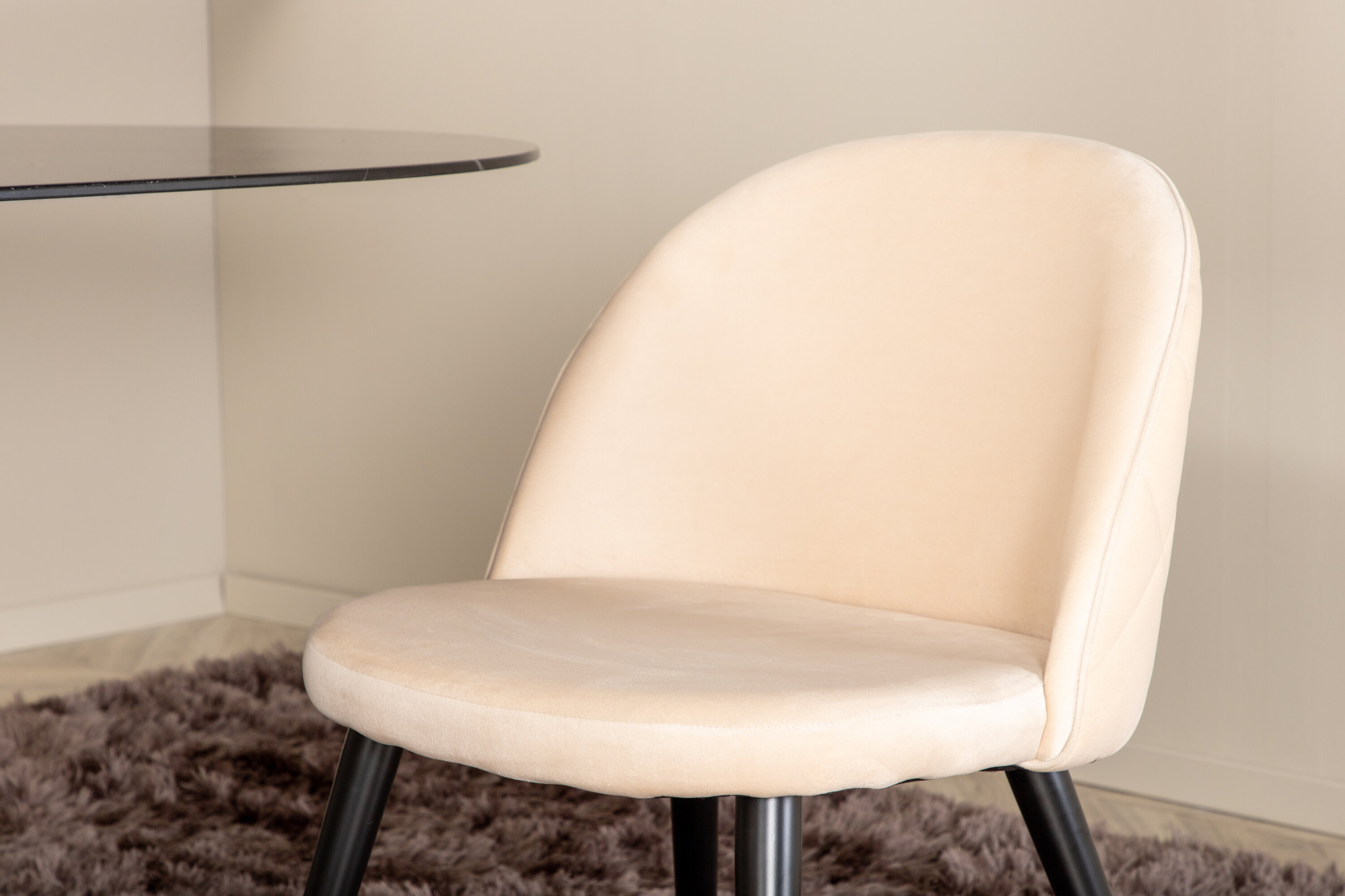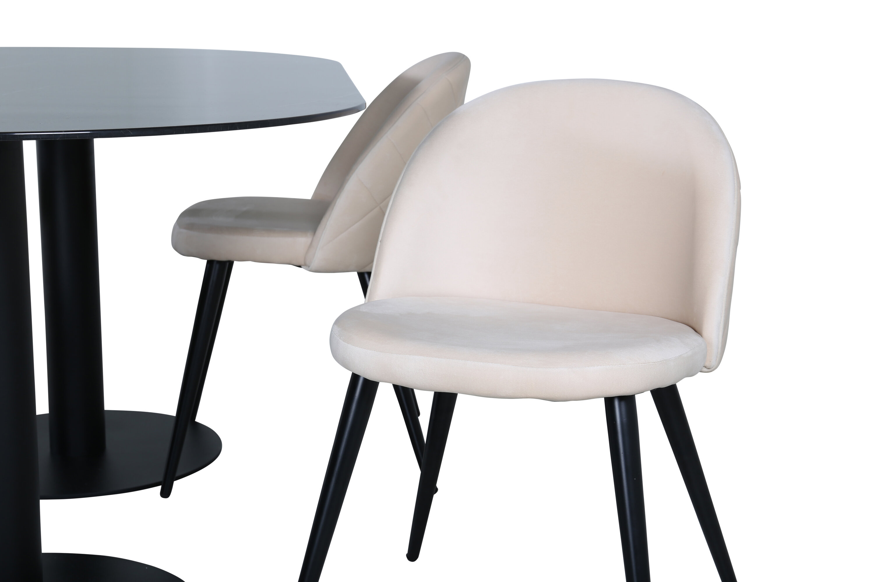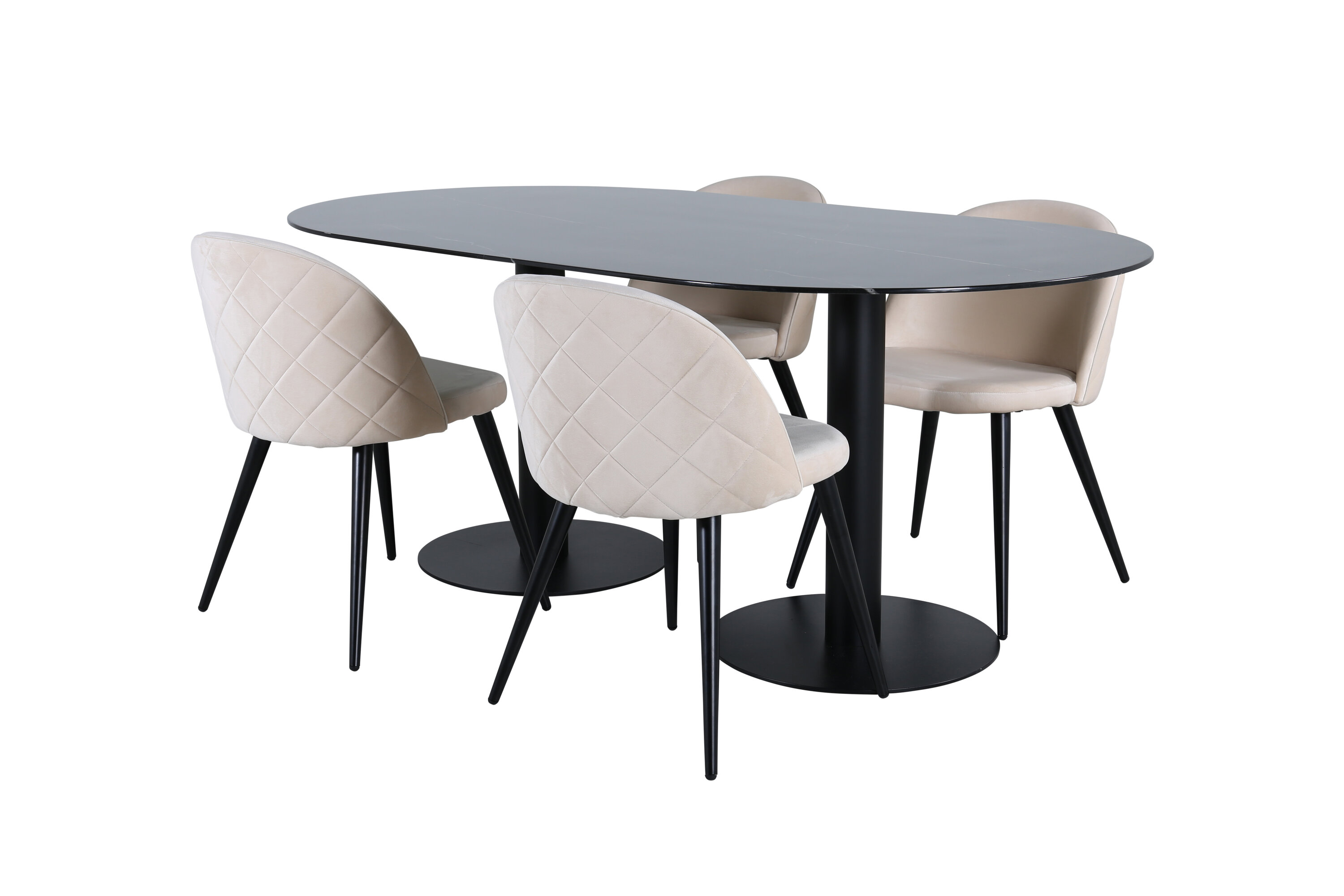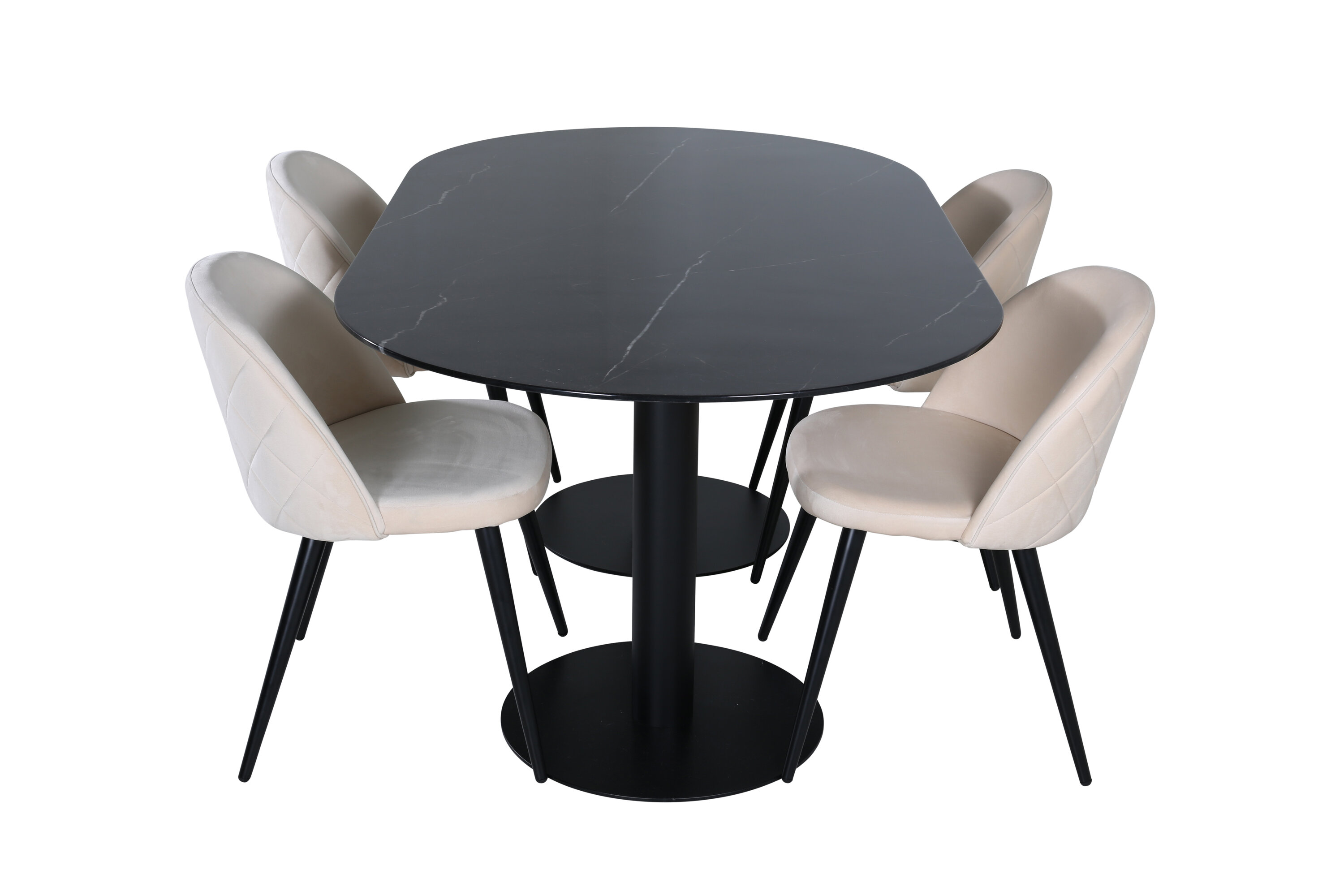 Zo stijlvol als uitnodigend - eettafel Pillan creëert een modebewuste indruk en aangename sfeer in je huis! Het ovale ontwerp en het algehele ontwerp zijn goed doordacht met een dunne bovenplaat in zwart marmerglas en twee stabiele tafelpoten in zwart metaal. Tafelafmetingen: lengte: 180 cm, breedte: 100 cm, hoogte: 74 cm. Hier samen met 4 van onze chique eetkamerstoelen Velvet in beige fluweel en smalle stoelpoten in ijzer. Afmetingen stoel: hoogte: 76,5 cm, zithoogte: 46,5 cm, breedte: 50 cm, diepte: 57 cm. Het hoge zitcomfort van de stoelen nodigt je uit voor lange en prachtige momenten om te socializen!