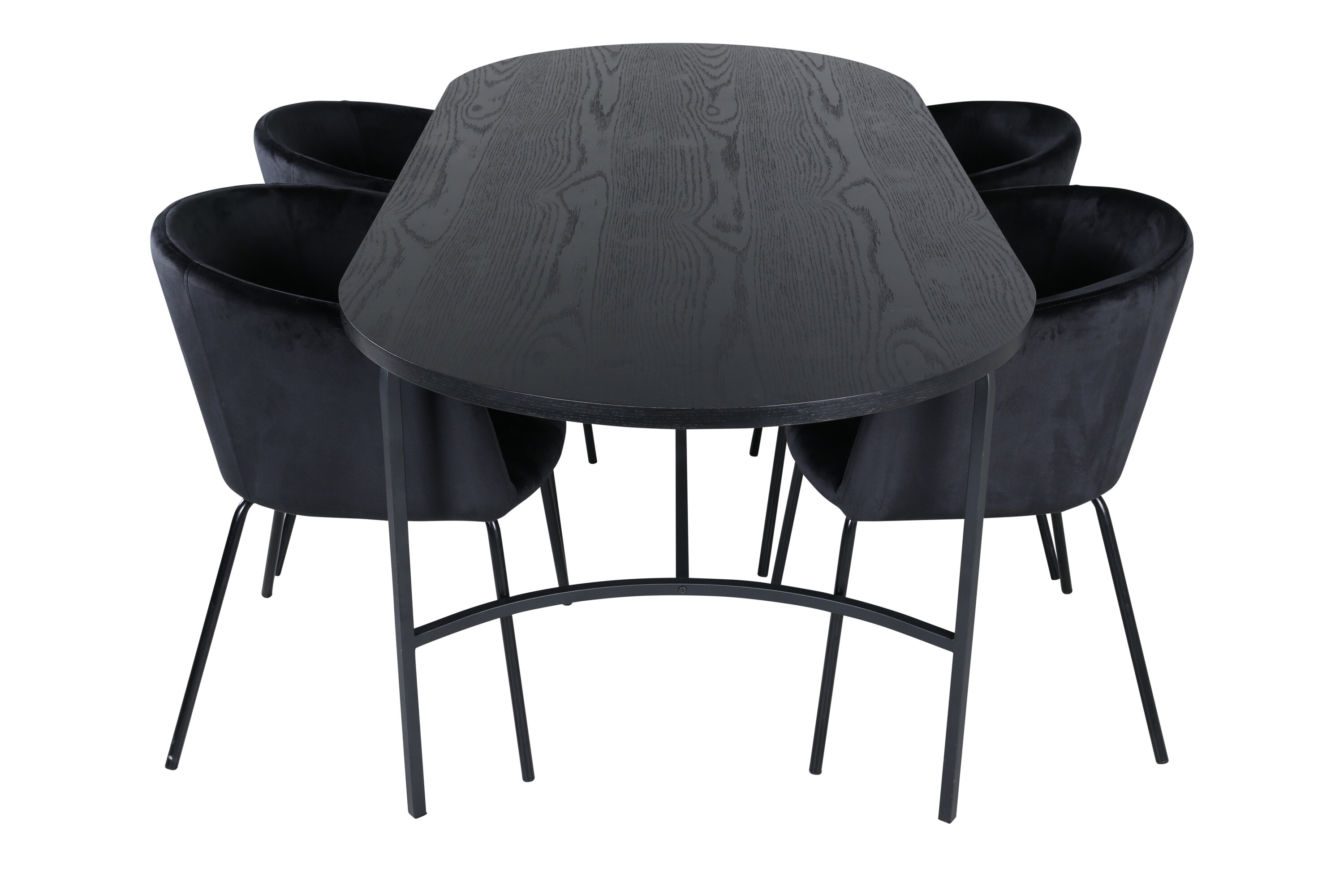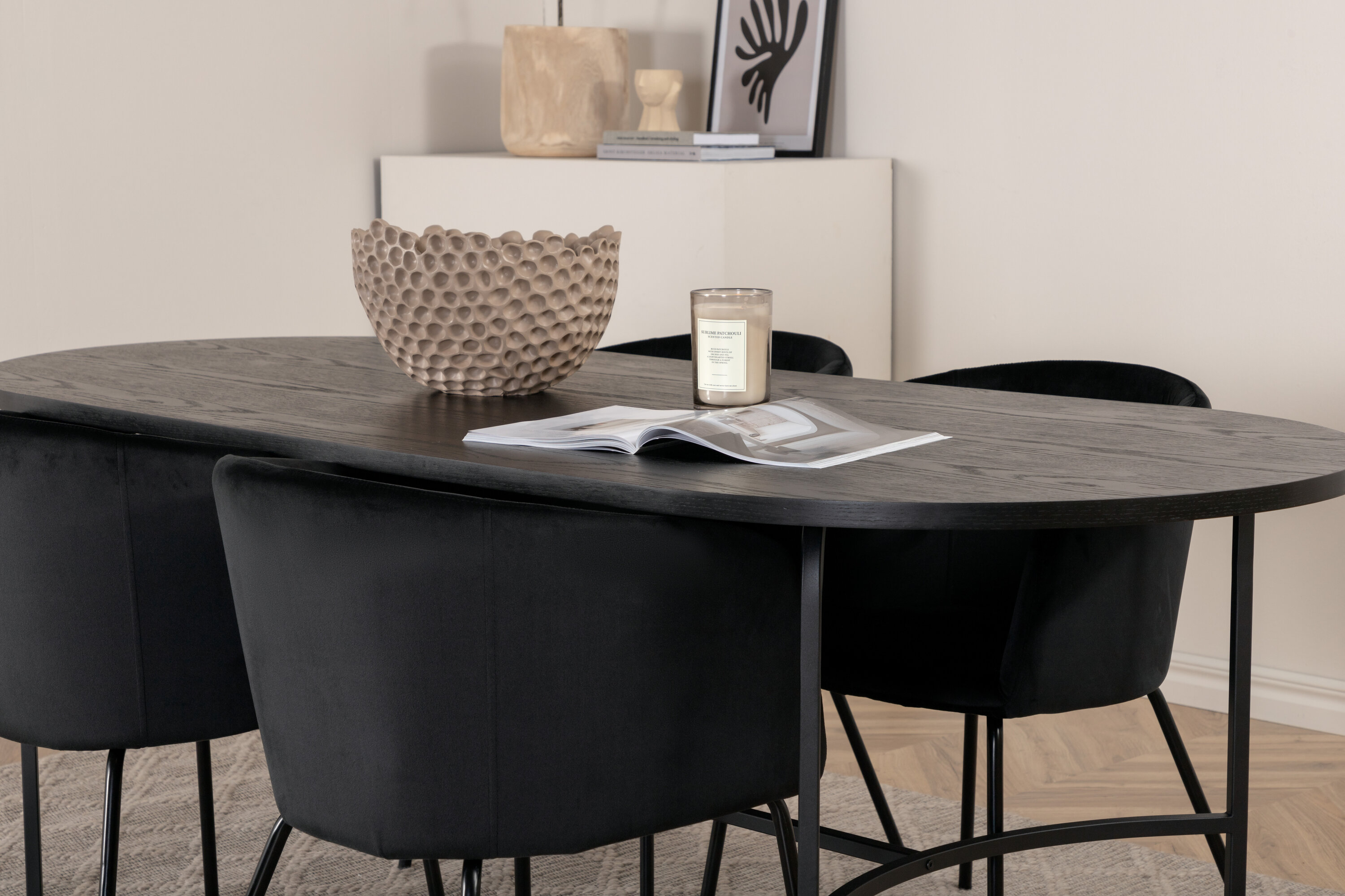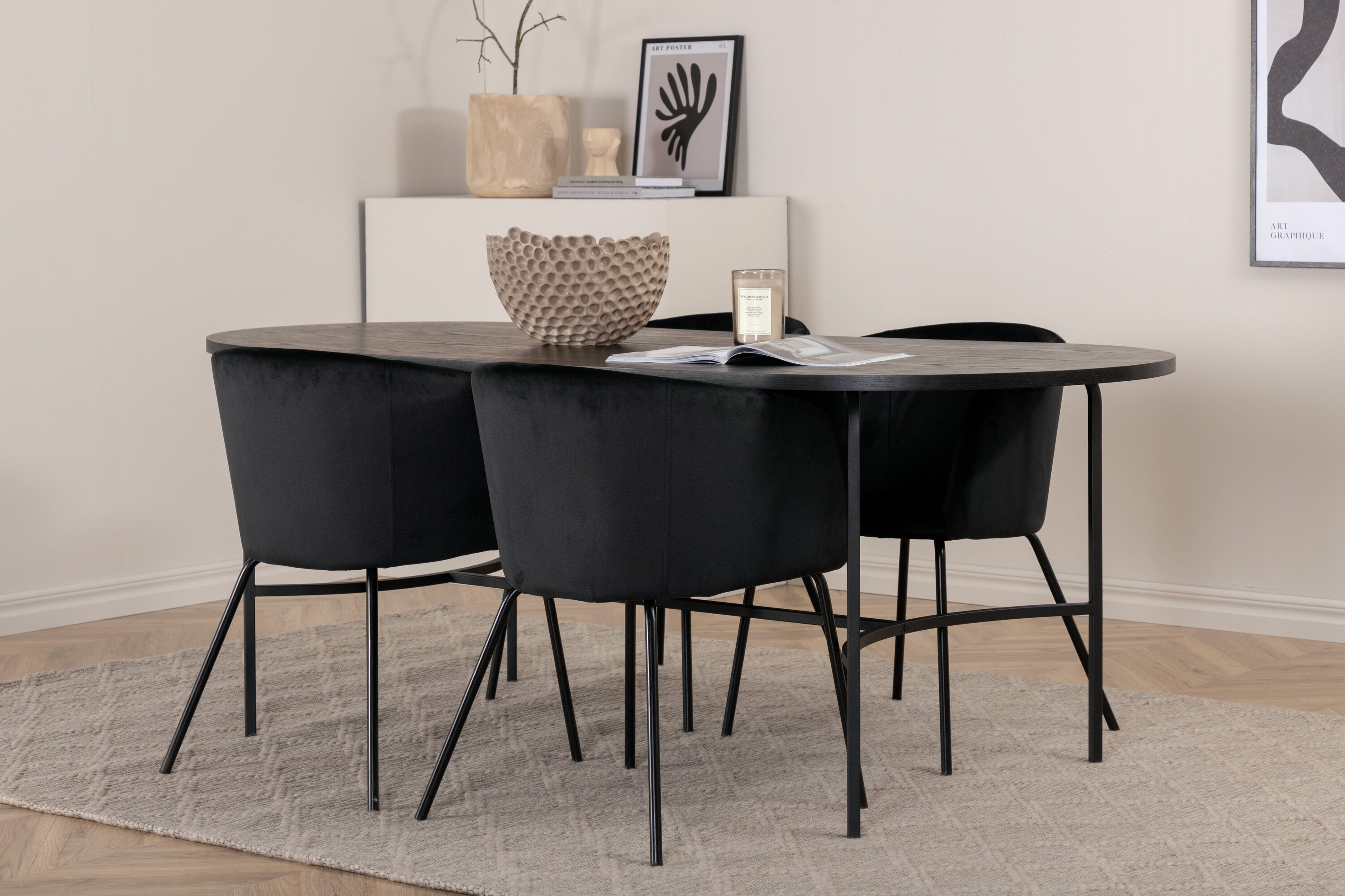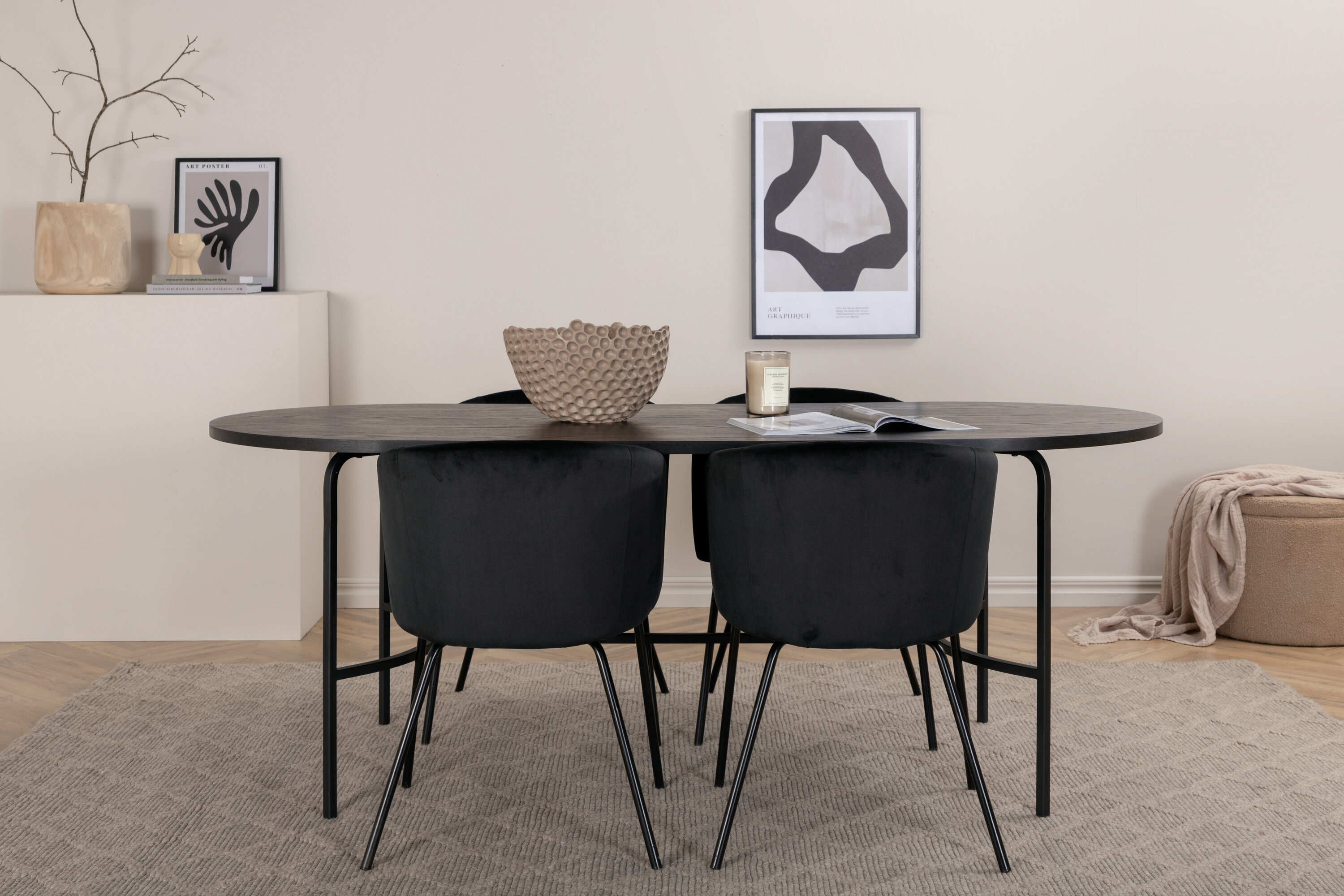 Pompous en elegant - een voedingsgroep die zich richt op comfort en minimalisme! Onze populaire eetkamerstoelen Berit is een favoriet in veel huishoudens. Ze hebben een uitnodigend ontwerp en een tijdloze zwarte kleur die ongelooflijk aantrekkelijk is. De zitting is in fluwelen stof en de stoelpoten stijlvol smal in zwart ijzer. Afmetingen stoel: hoogte: 78 cm, zithoogte: 49 cm, breedte: 55 cm, diepte: 55 cm. Hier worden 4 eetkamerstoelen gecombineerd met onze ovale eettafelschaats. Het totale ontwerp van de tafel is zeer goed doordacht met een dunne bovenplaat in zwart MDF met fineer en zwarte tafelpoten in metaal. Tafelafmetingen: lengte: 200 cm, breedte: 90 cm, hoogte: 75 cm.