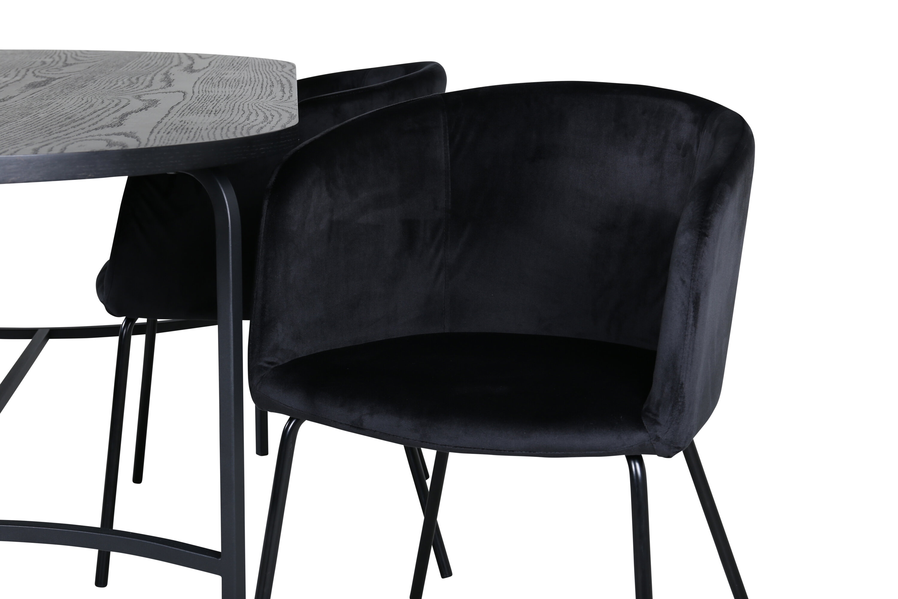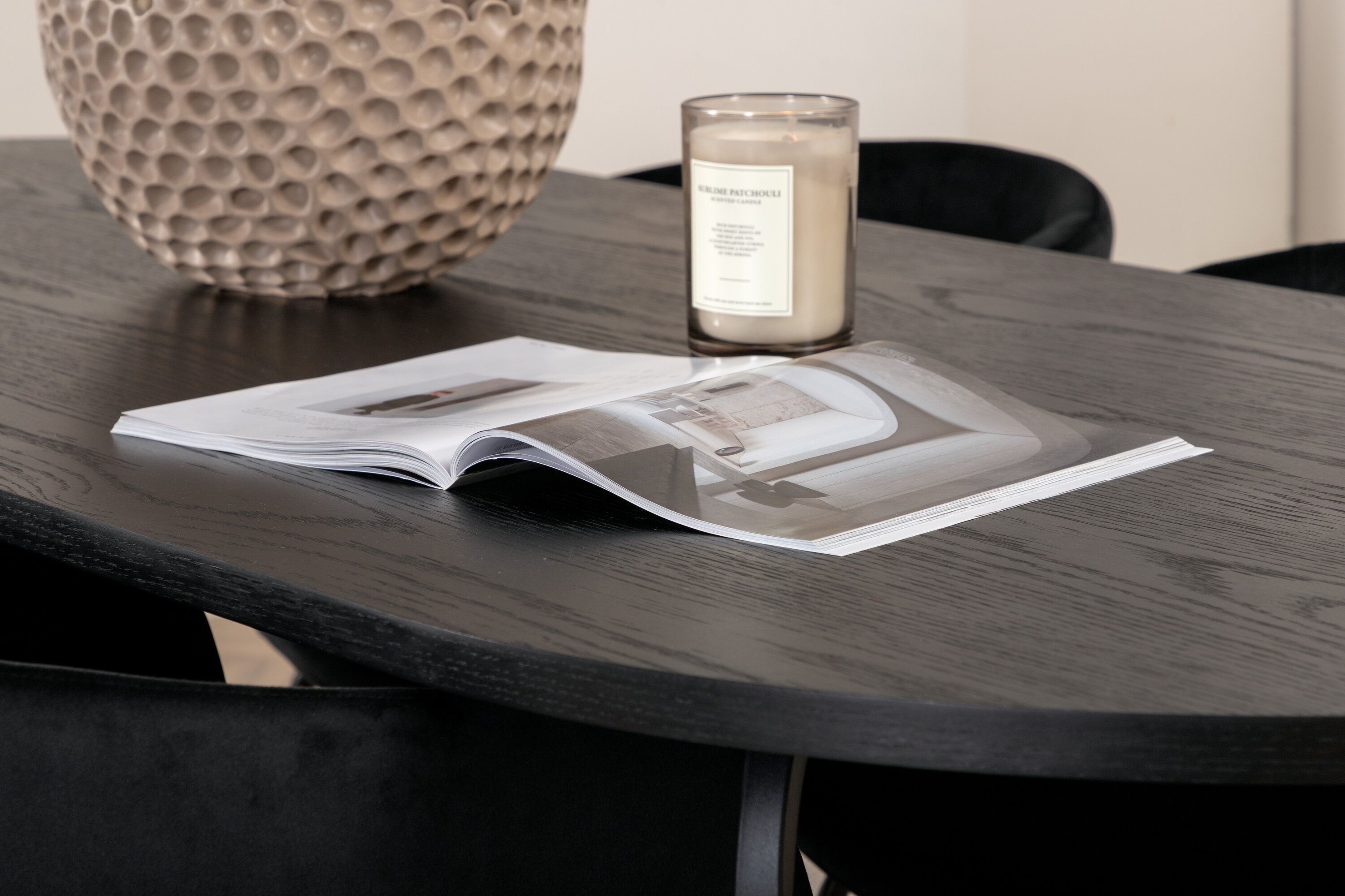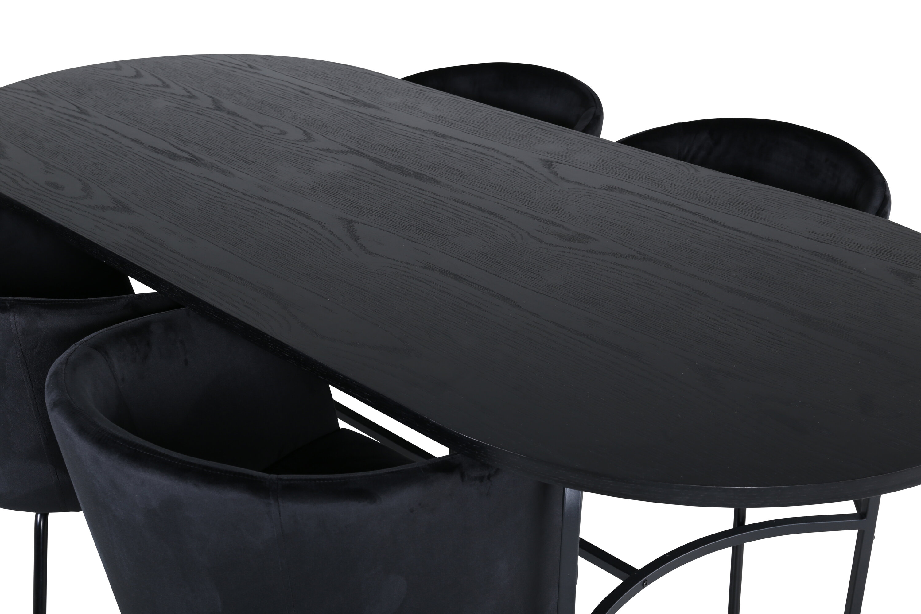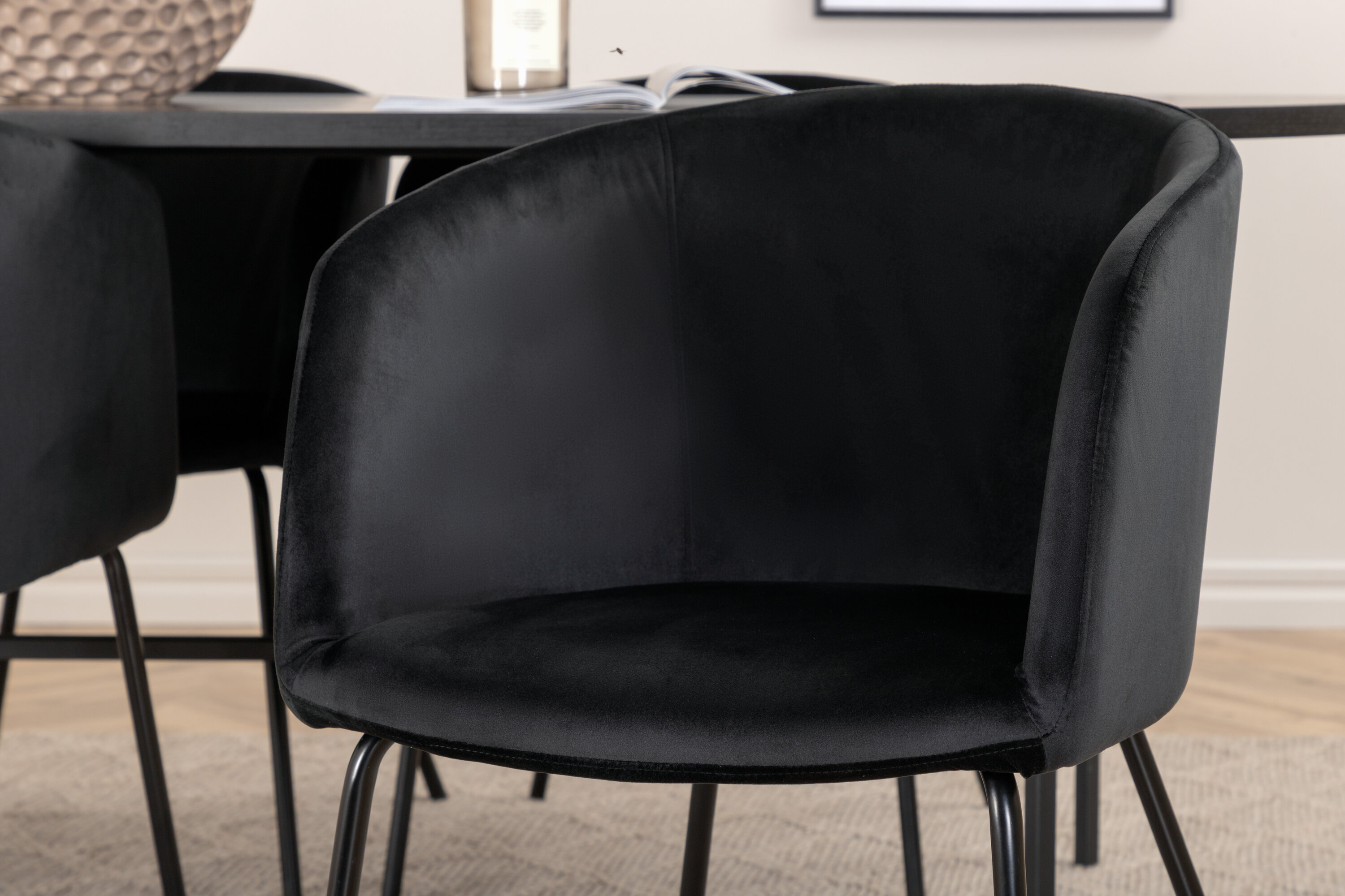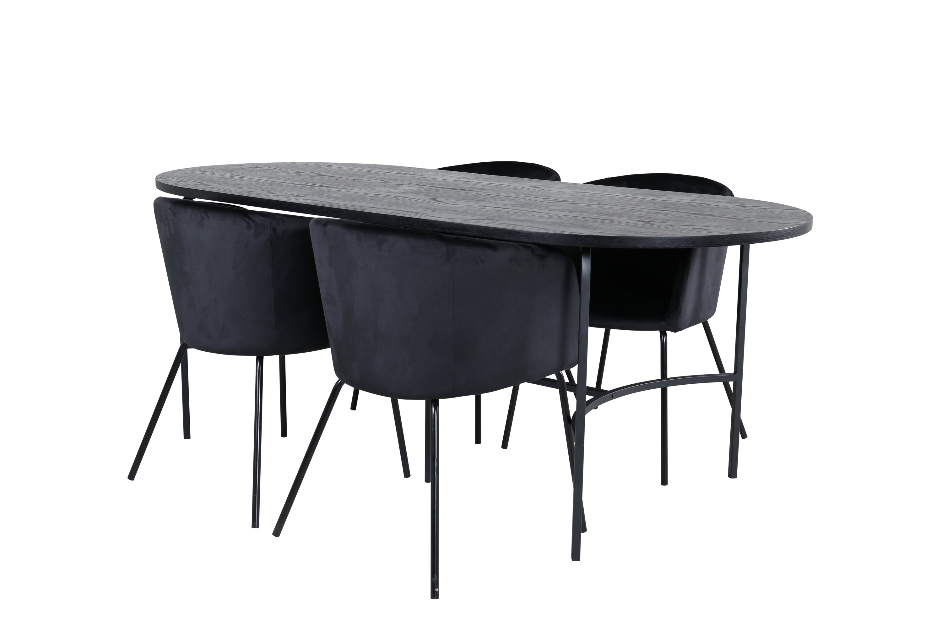 Pompous en elegant - een voedingsgroep die zich richt op comfort en minimalisme! Onze populaire eetkamerstoelen Berit is een favoriet in veel huishoudens. Ze hebben een uitnodigend ontwerp en een tijdloze zwarte kleur die ongelooflijk aantrekkelijk is. De zitting is in fluwelen stof en de stoelpoten stijlvol smal in zwart ijzer. Afmetingen stoel: hoogte: 78 cm, zithoogte: 49 cm, breedte: 55 cm, diepte: 55 cm. Hier worden 4 eetkamerstoelen gecombineerd met onze ovale eettafelschaats. Het totale ontwerp van de tafel is zeer goed doordacht met een dunne bovenplaat in zwart MDF met fineer en zwarte tafelpoten in metaal. Tafelafmetingen: lengte: 200 cm, breedte: 90 cm, hoogte: 75 cm.