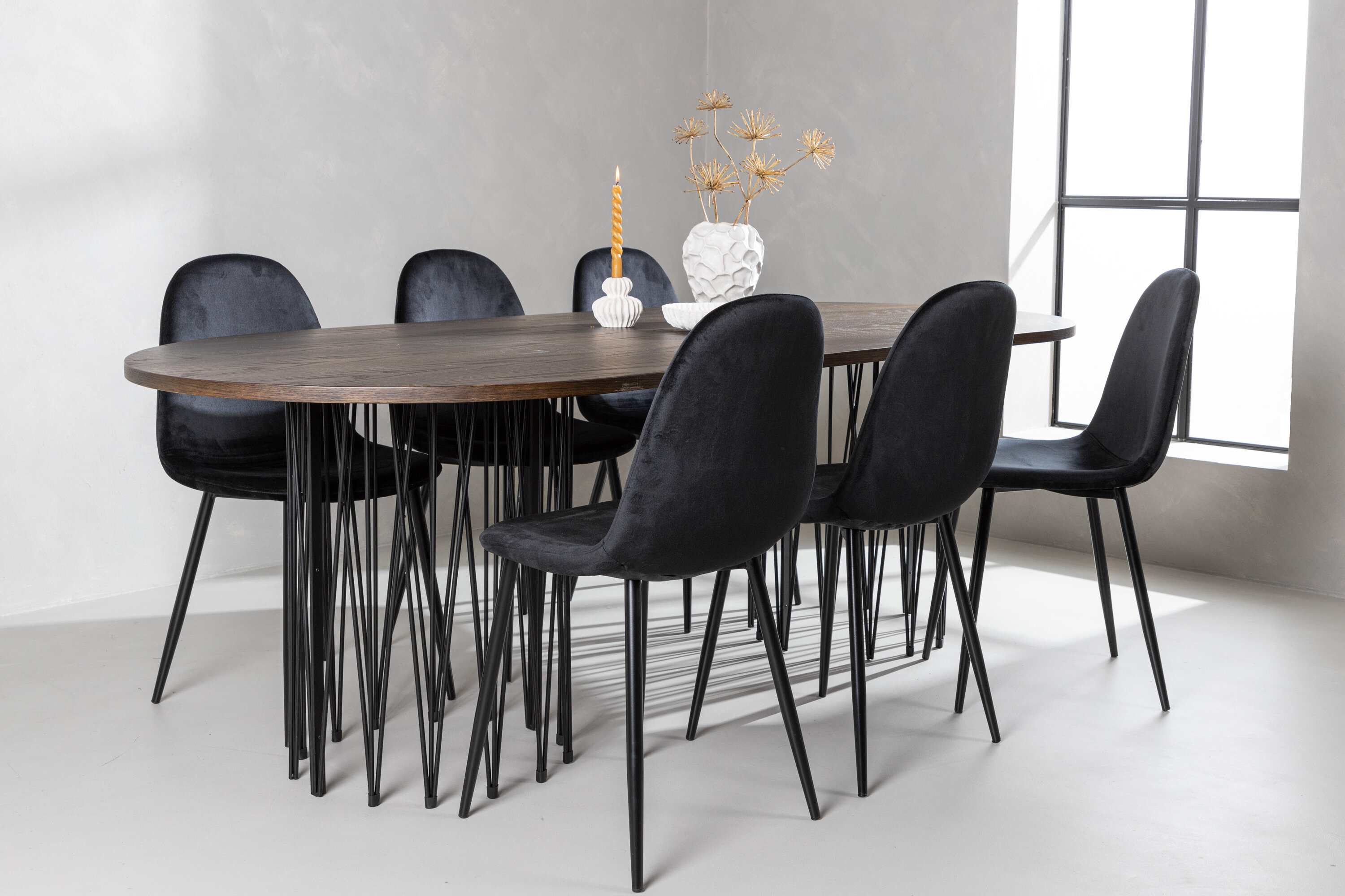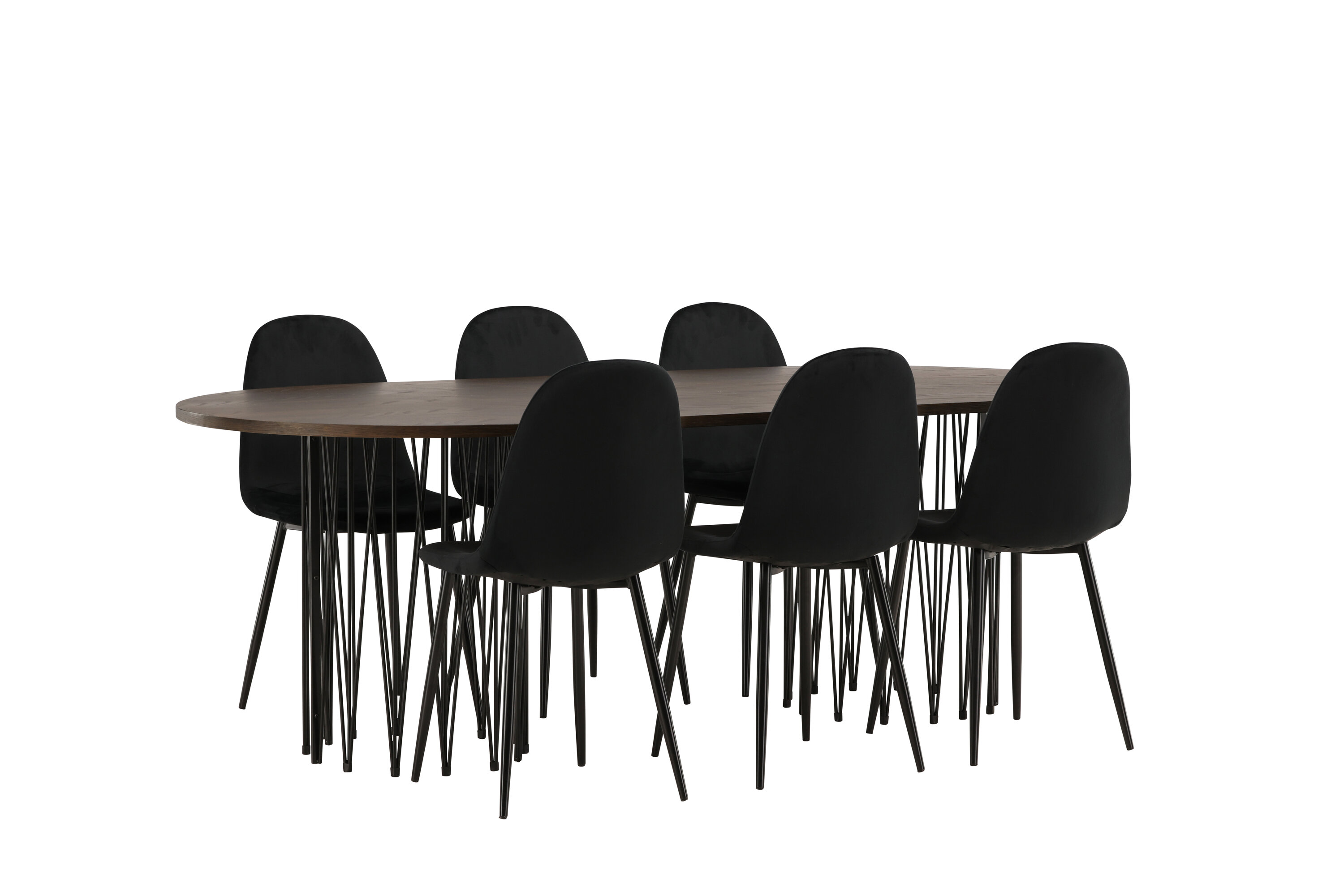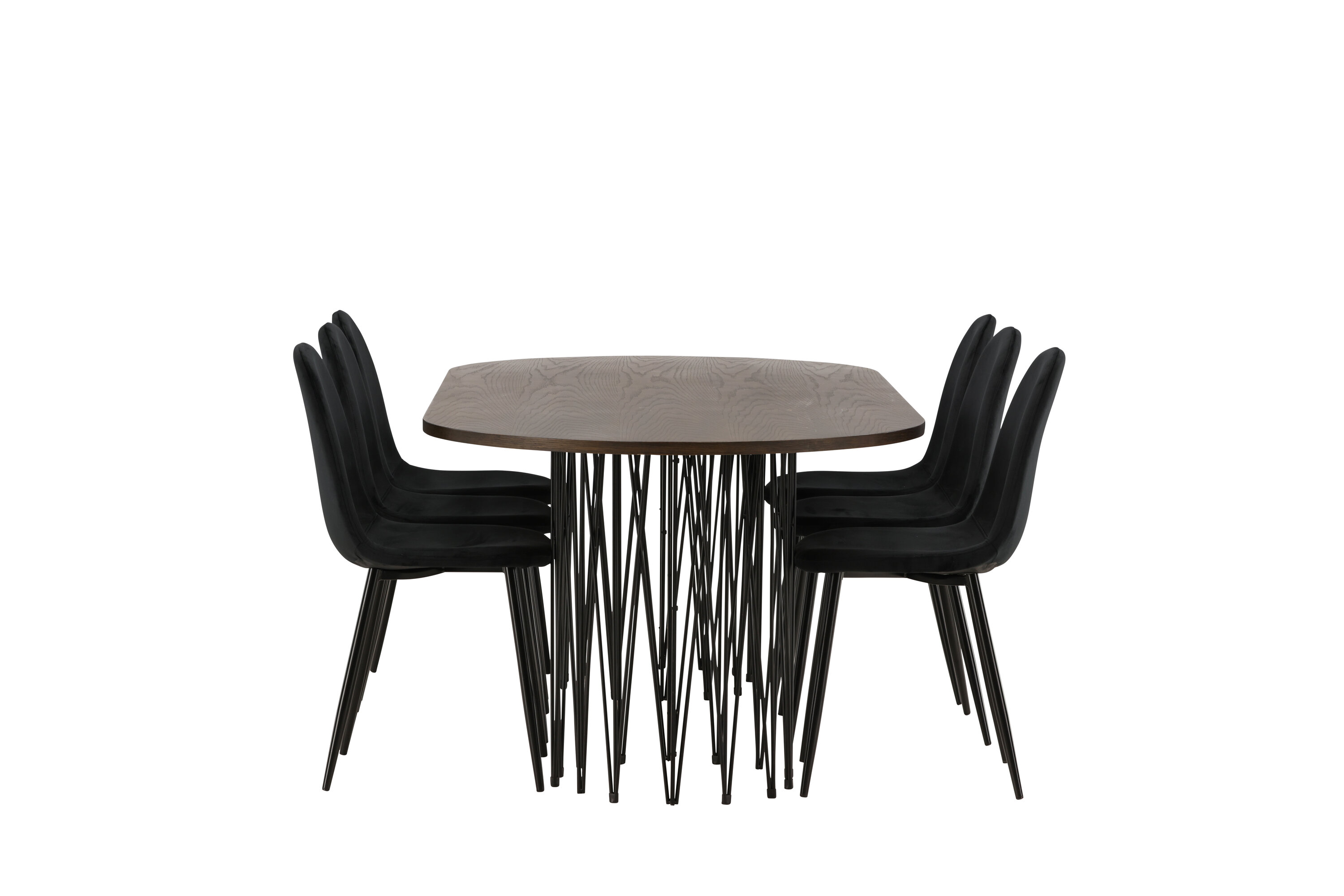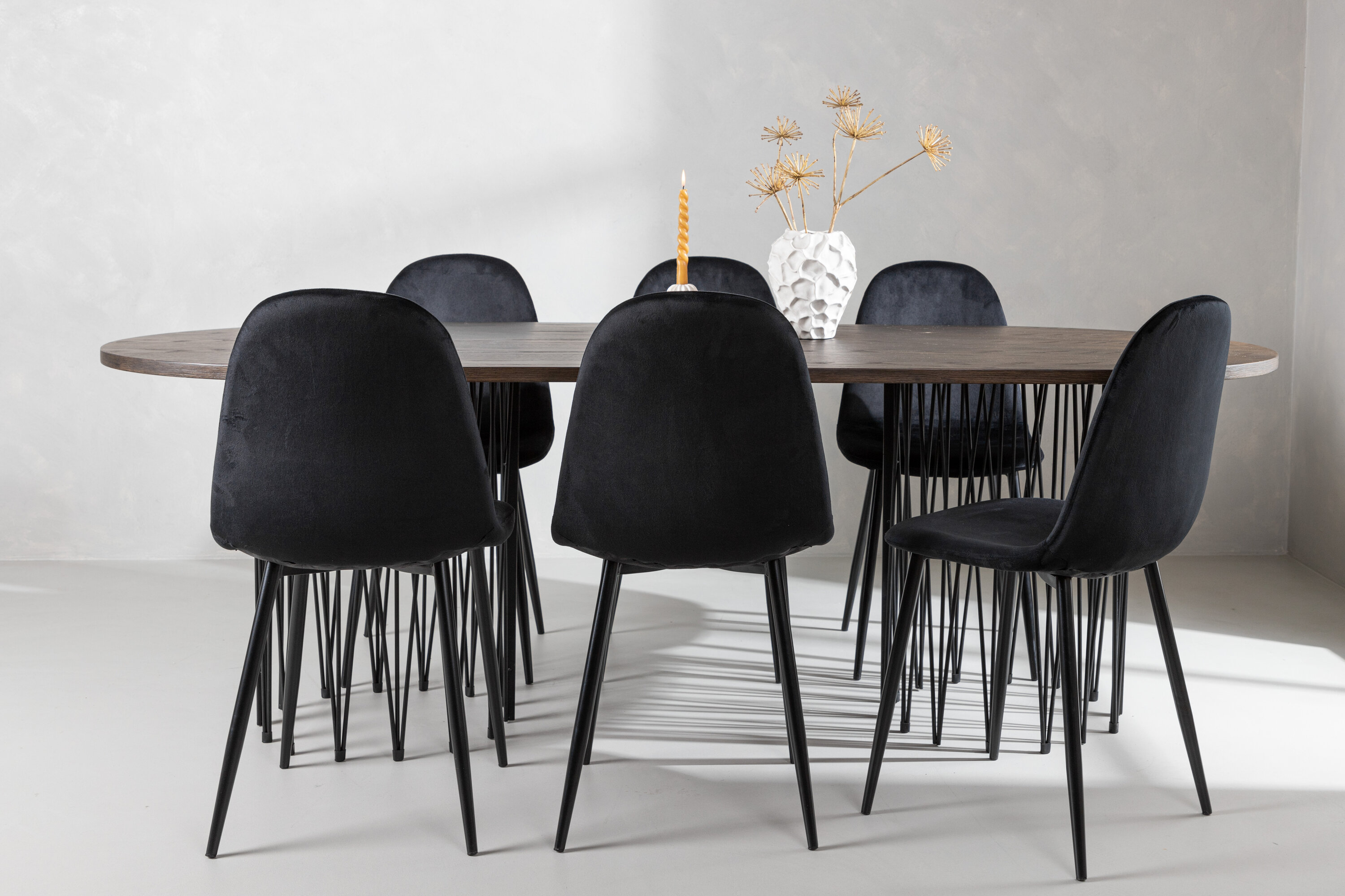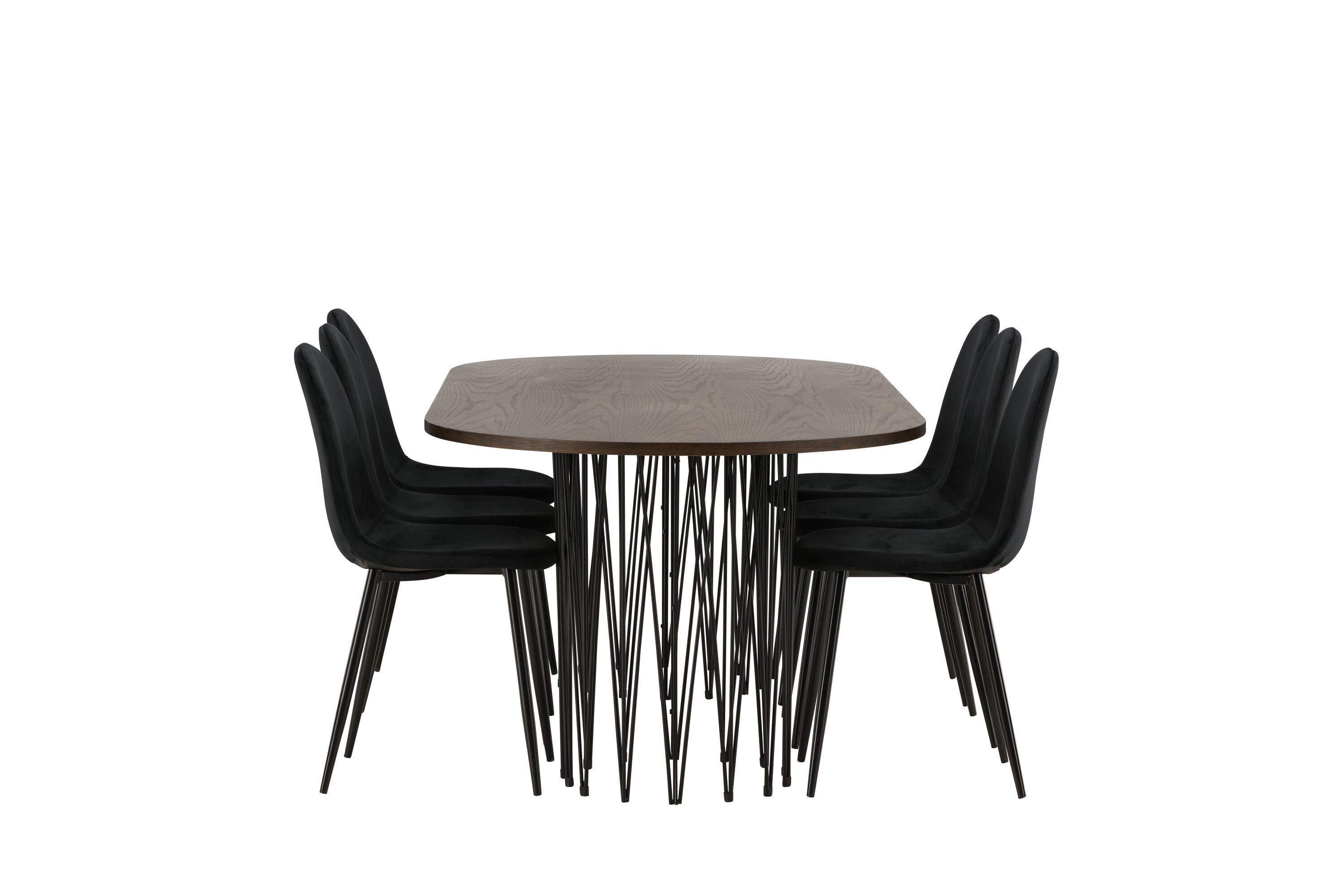 Een bijpassende eetgroep die snel een uitnodigende en moderne sfeer creëert! De Stone eettafel maakt indruk met zijn modebewuste design. Het behoort tot de Furniture Fashion collectie en heeft een prachtig bruin gekleurd tafelblad in MDF met fineer en twee decoratieve cilindervormige lijsten in zwart metaal. Hier samen met comfortabele stoelen uit de Polar serie. De stoel heeft een volledig gestoffeerd ontwerp met een afgeronde rugleuning en zitting in zwart fluwelen stof met zachte vulling en poten in zwart gepoedercoat metaal. Voorkom compromissen tussen comfort en design!