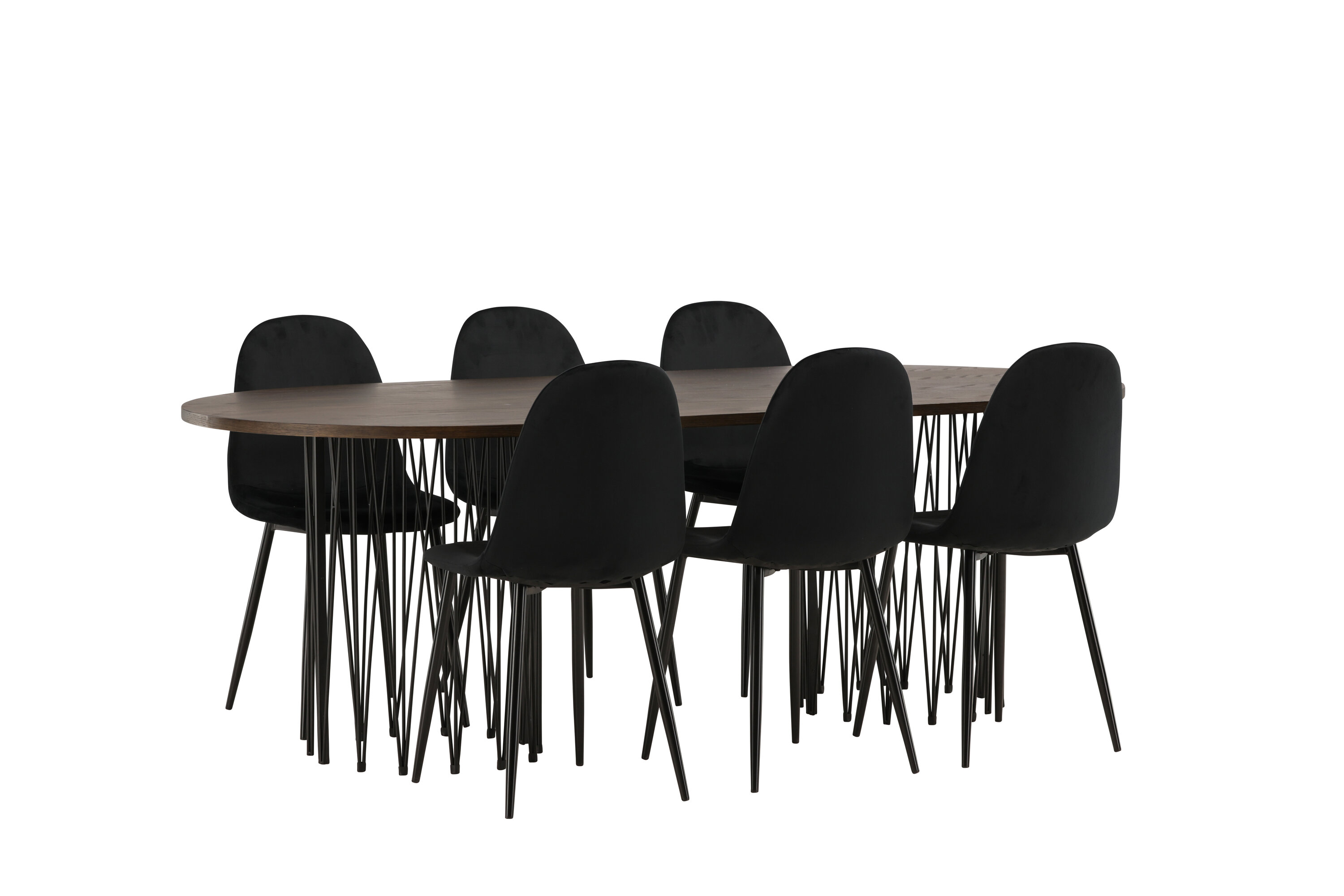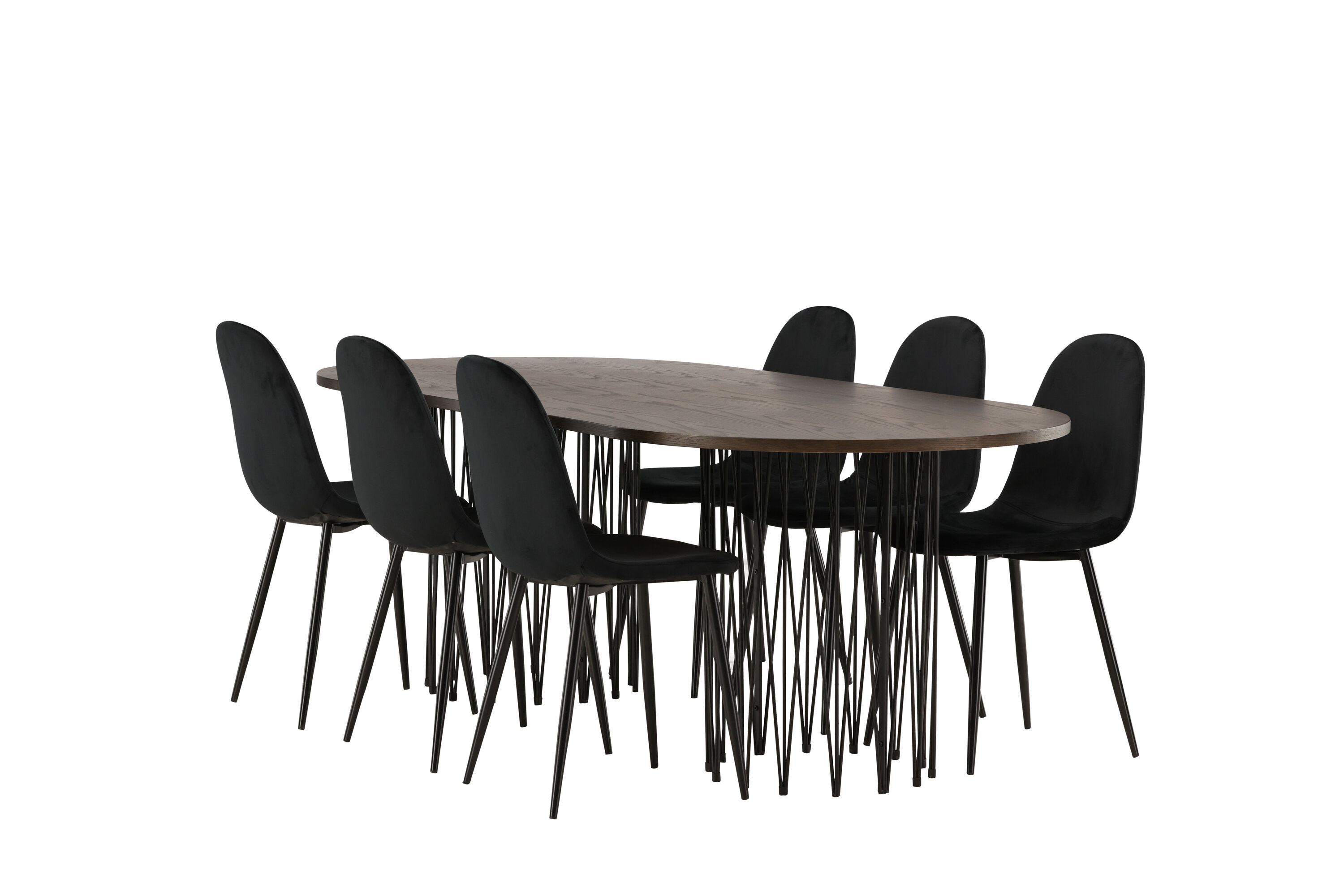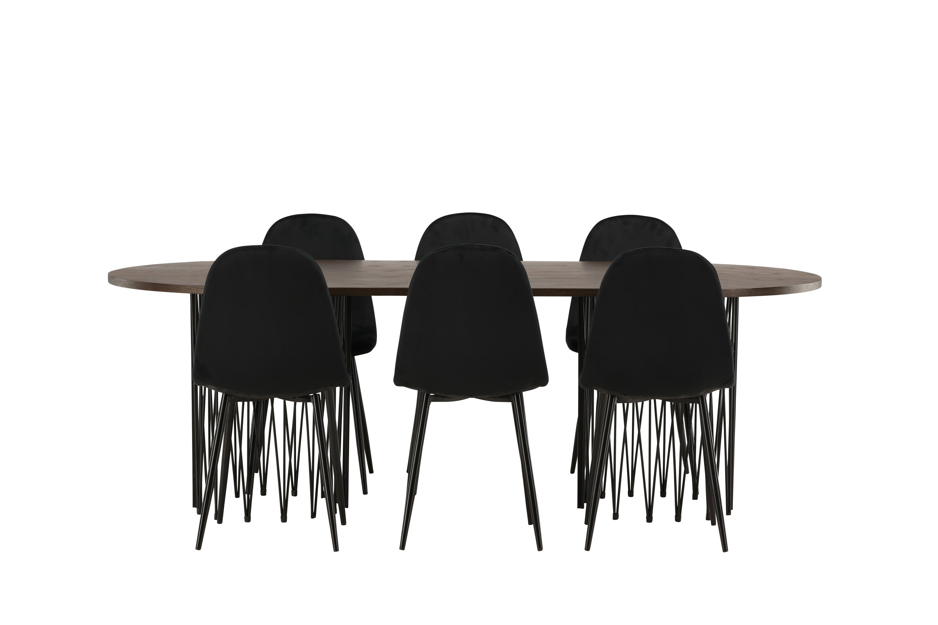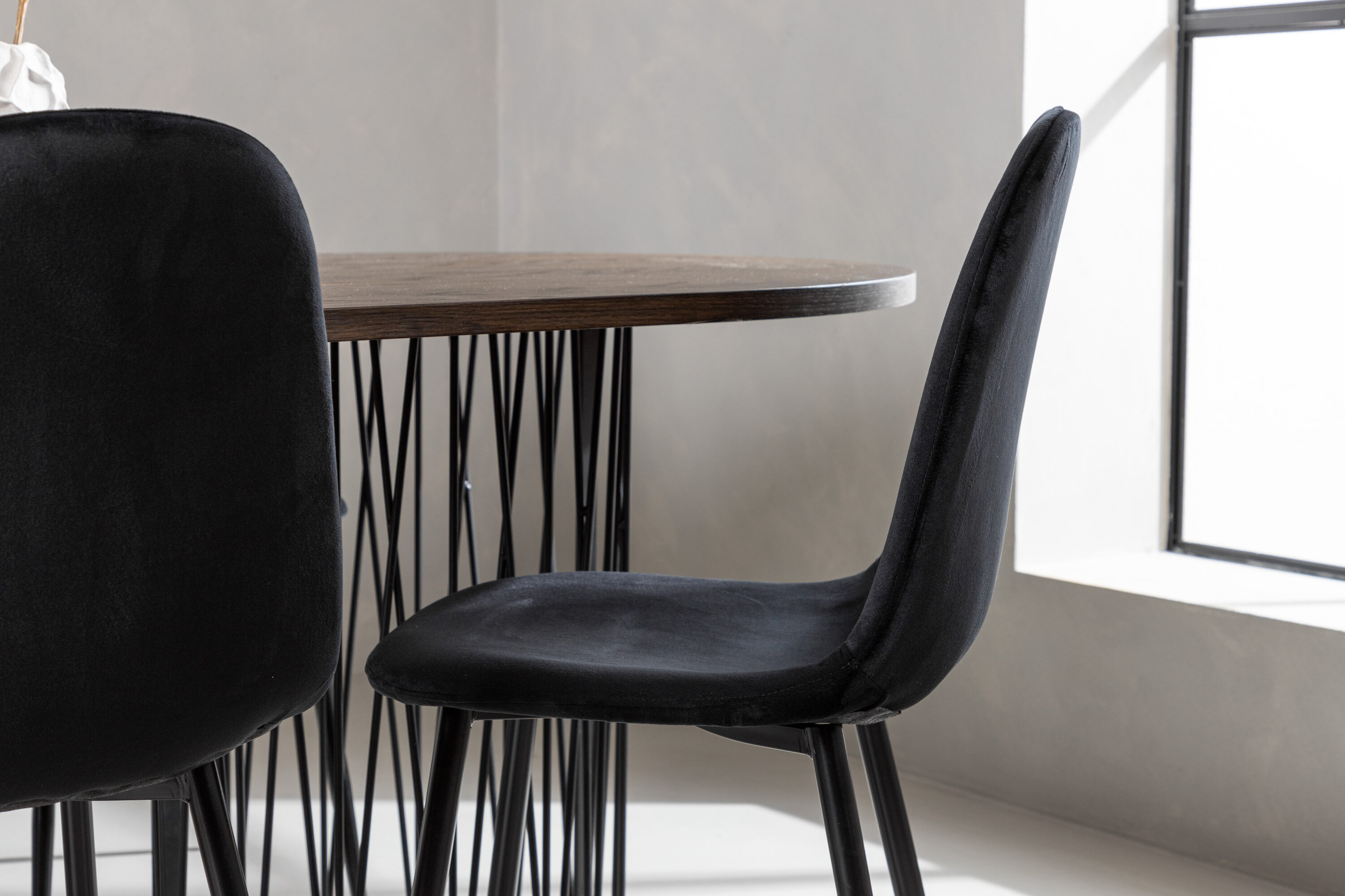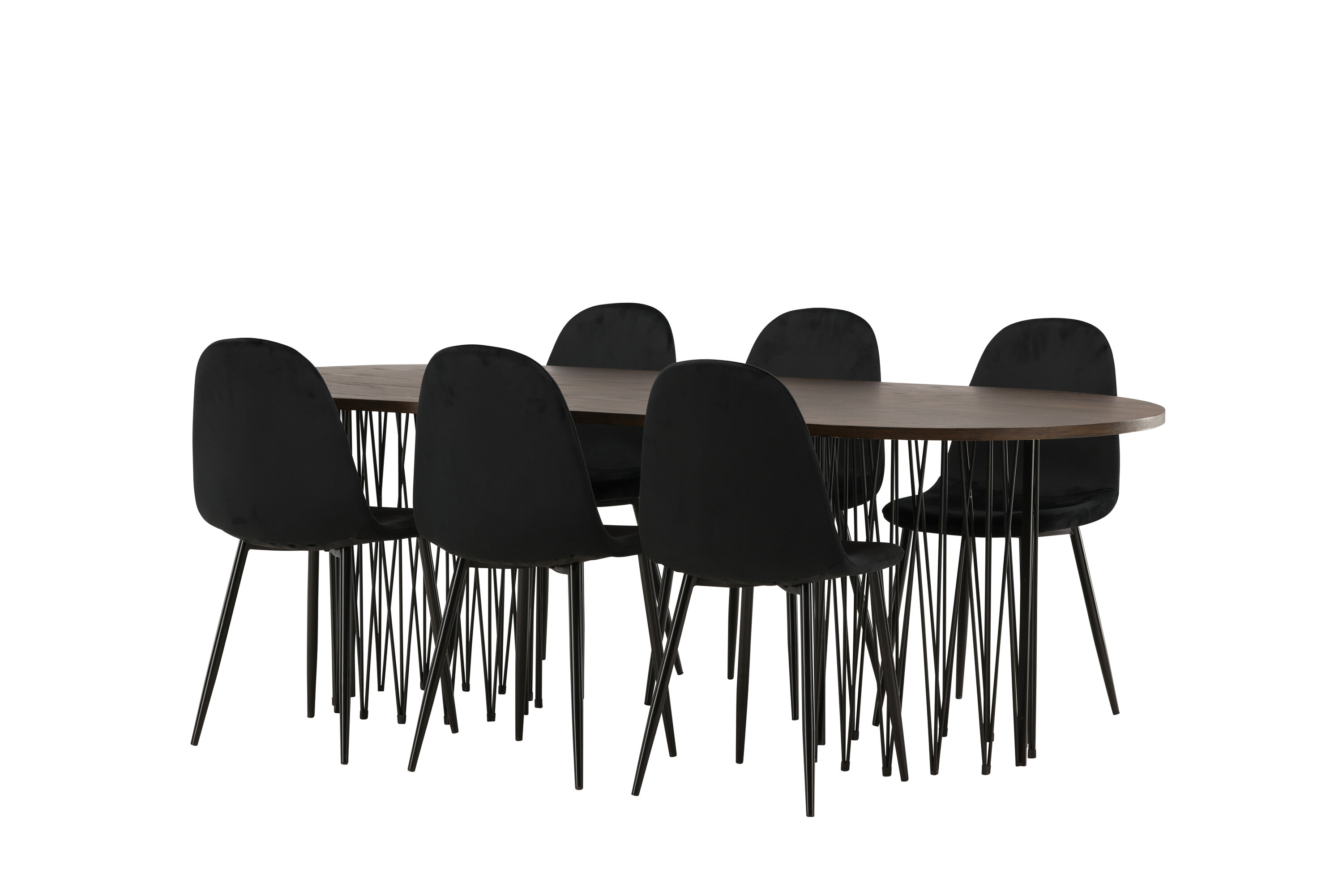 Een bijpassende eetgroep die snel een uitnodigende en moderne sfeer creëert! De Stone eettafel maakt indruk met zijn modebewuste design. Het behoort tot de Furniture Fashion collectie en heeft een prachtig bruin gekleurd tafelblad in MDF met fineer en twee decoratieve cilindervormige lijsten in zwart metaal. Hier samen met comfortabele stoelen uit de Polar serie. De stoel heeft een volledig gestoffeerd ontwerp met een afgeronde rugleuning en zitting in zwart fluwelen stof met zachte vulling en poten in zwart gepoedercoat metaal. Voorkom compromissen tussen comfort en design!